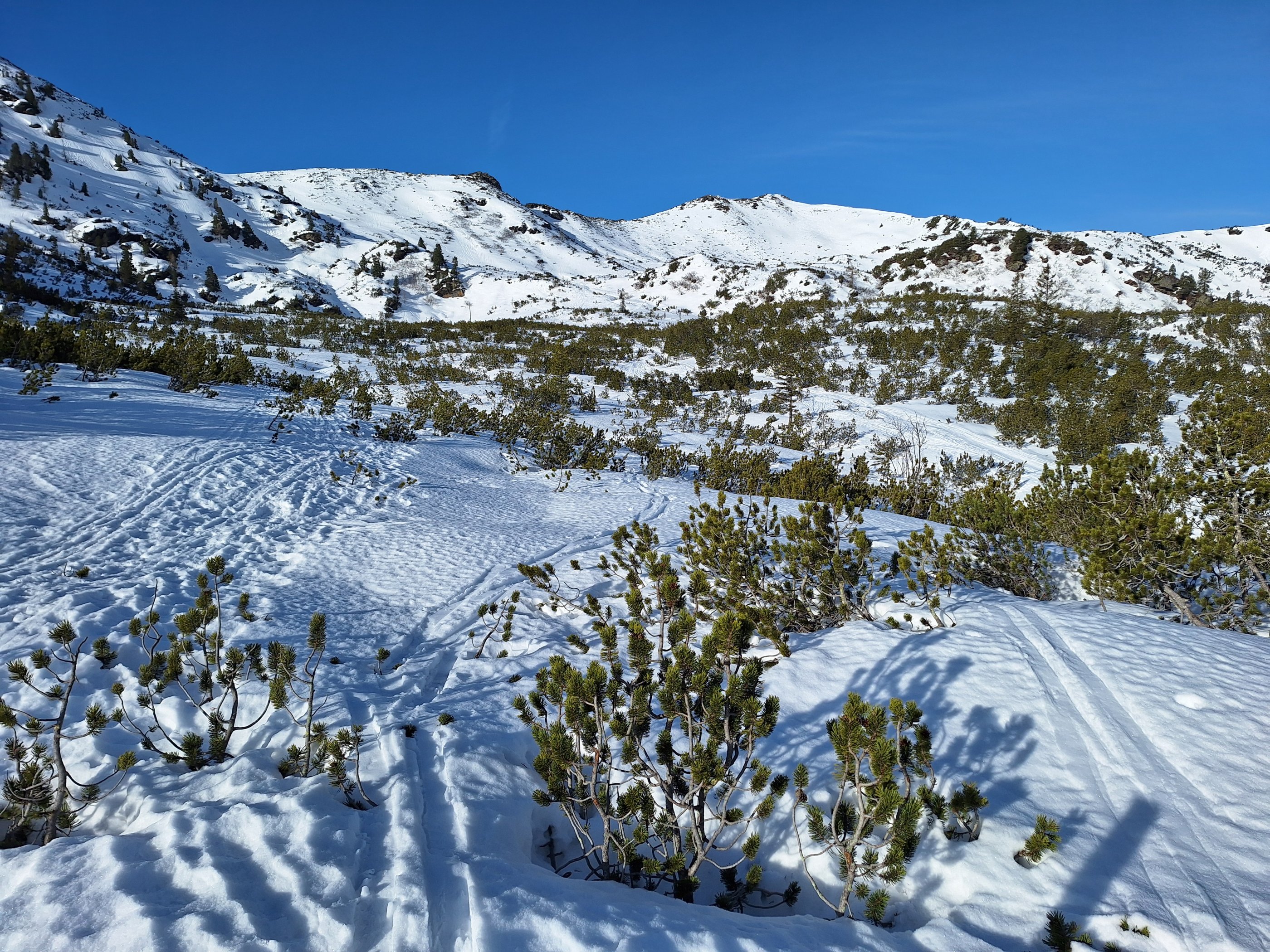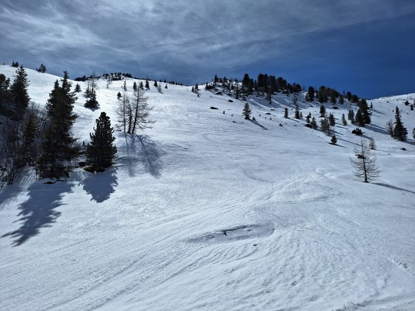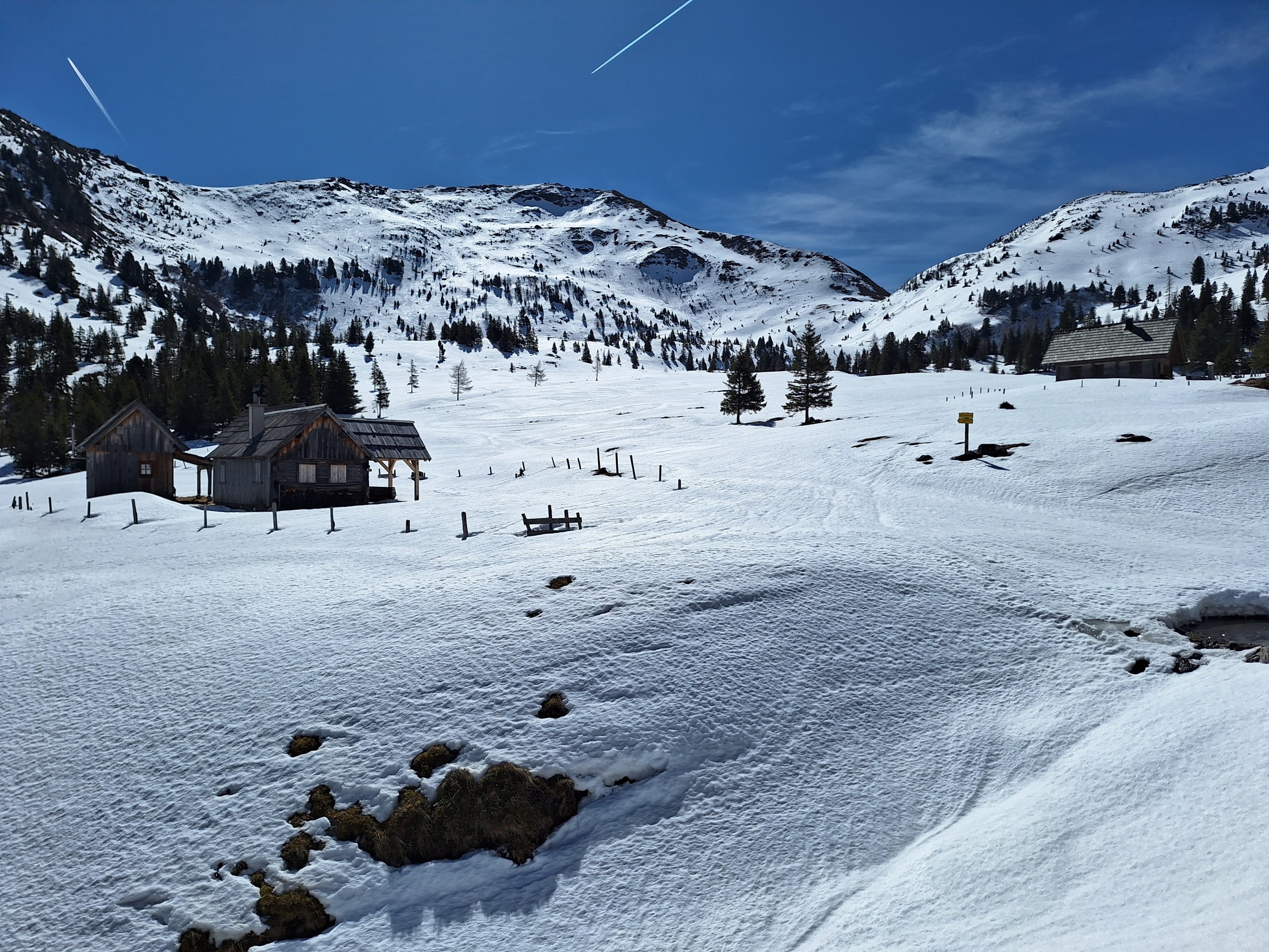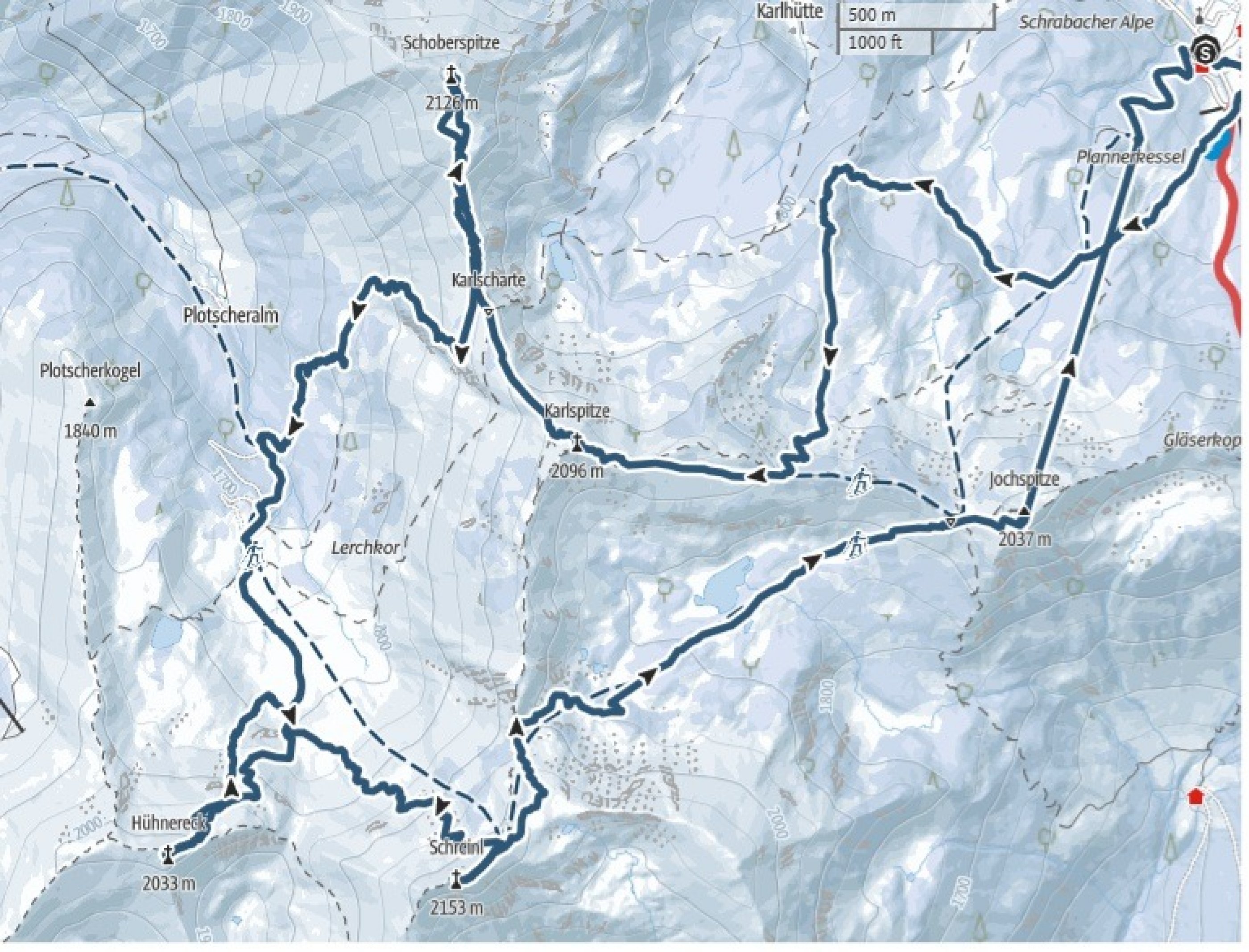 Ausgedehnte Tour von der Planneralm über Karlspitze, Schoberspitze, Hühnereck, Schreinl und Jochspitze zurück zur Planneralm mit vier Mal Auffellen. Noch sehr gute Schneelage. Ausnahme: Latschenfeld im Aufstieg zur Schoberspitze, Abfahrt von dieser westseitig Richtung Michelirlingalm problematisch wegen Abbrüchen und schwierig zu findendem Durchschlupf bei gerade noch ausreichend Schnee.