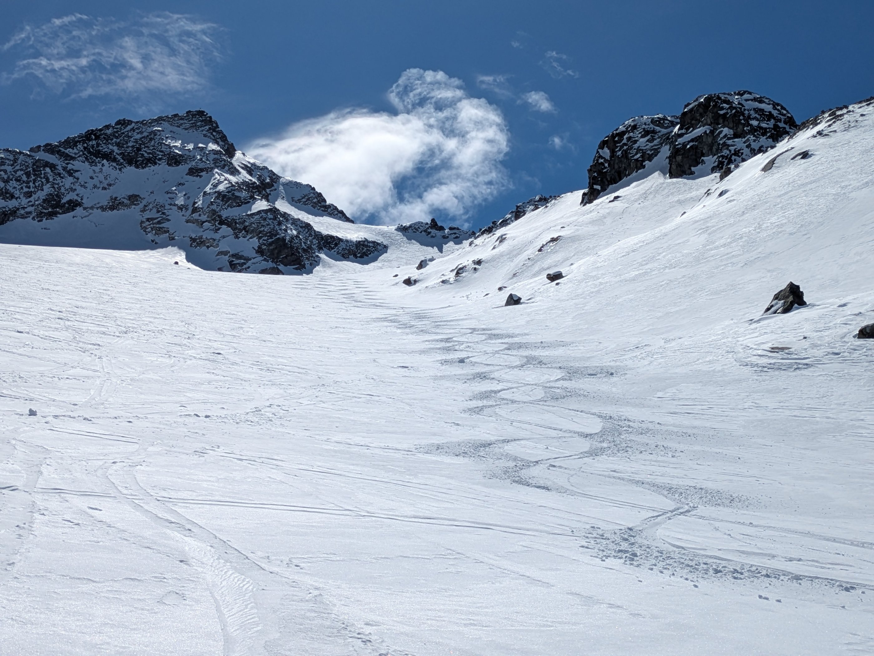 Schneequalität von Pulver über gepressten Pulver, Windgangeln und am Nachmittag bester Firn- alles dabei. Einige große Nassschneelawinen nachmittags.