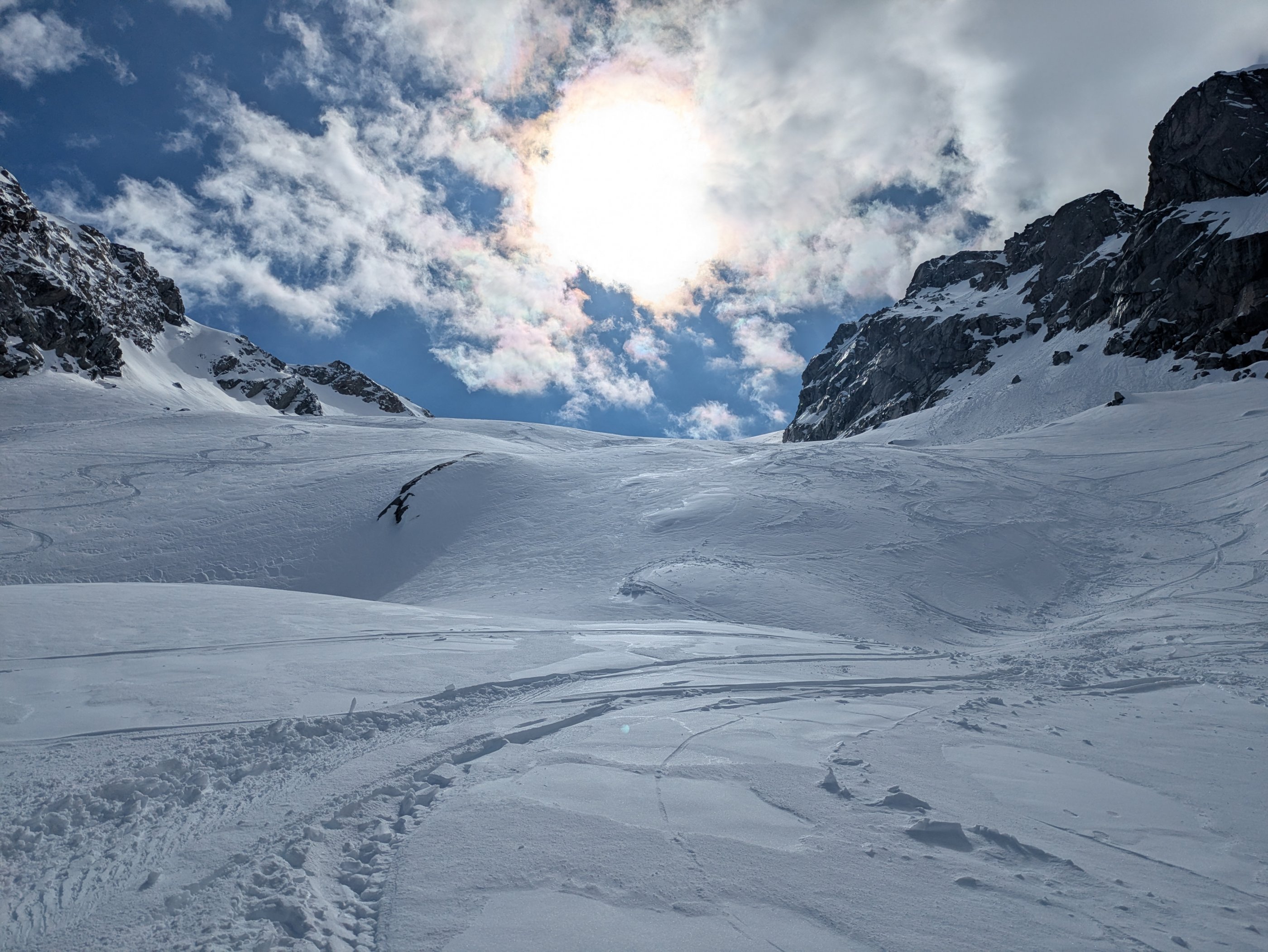 Schneequalität von Pulver über gepressten Pulver, Windgangeln und am Nachmittag bester Firn- alles dabei. Einige große Nassschneelawinen nachmittags.