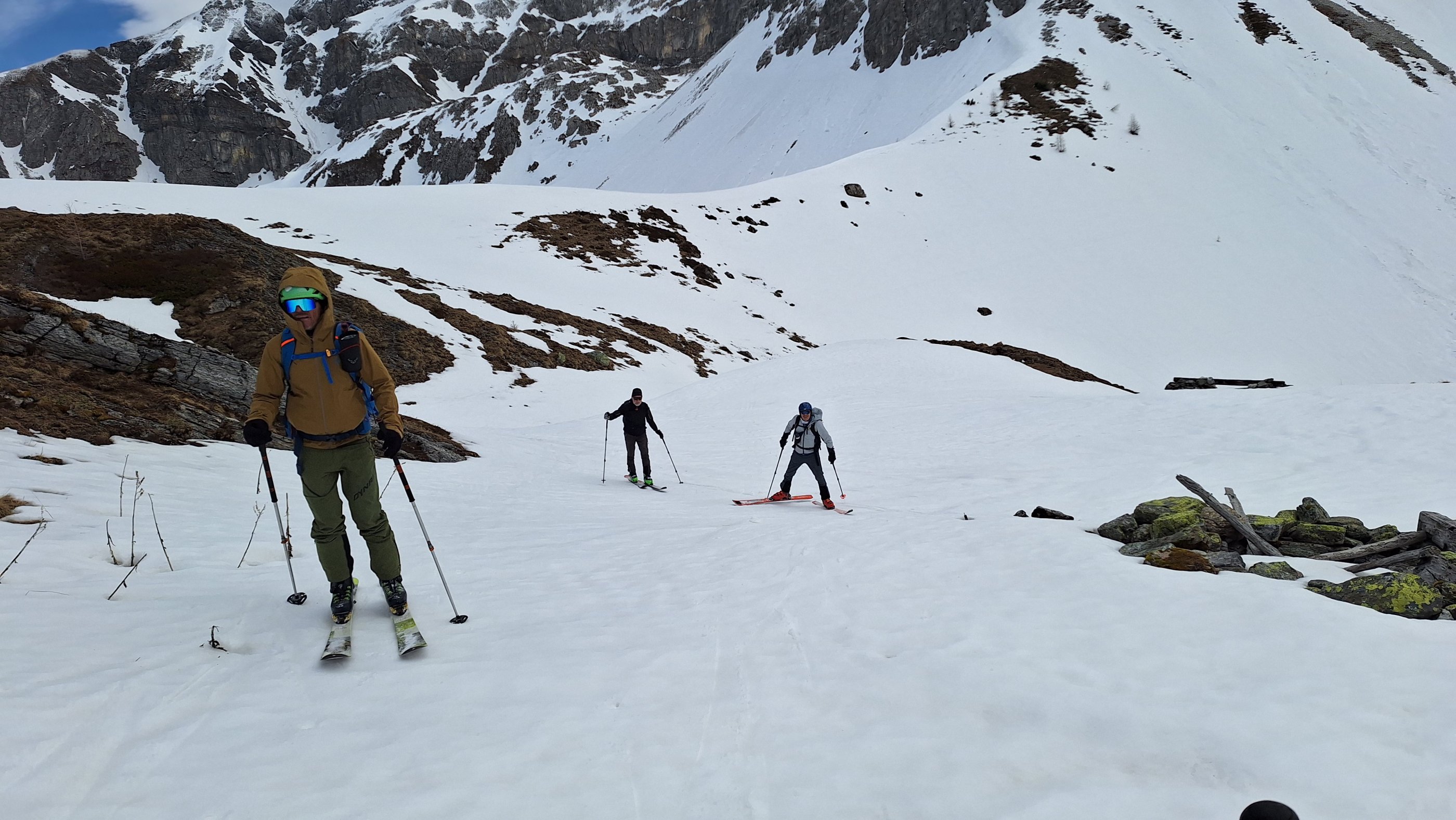Wir machten beider Abfahrt an dem kleinen Wildseehüttchen eine längere Pause und fuhren gegen 14 Uhr die inzwischen leicht aufgefirnten Hänge hinter.