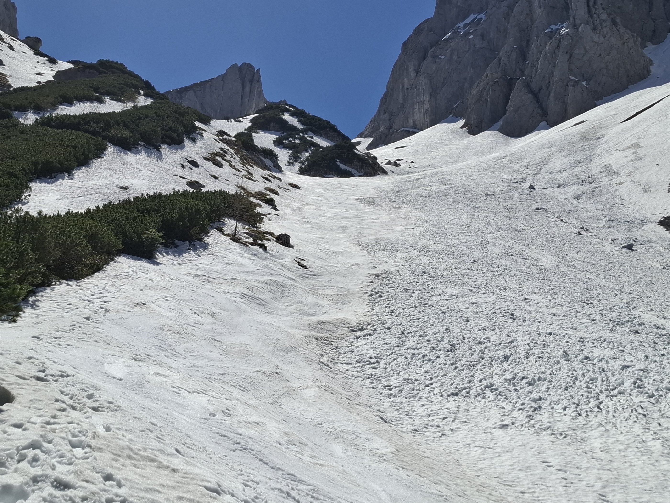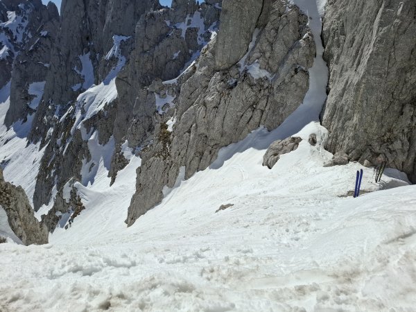 Ab Griesner Alm muß man die Ski 400hm zum Schnee tragen. Ab 1400m durchgehend gute Schneelage. Solange das Kar im Schatten ist sind Harscheisen zu empfehlen. Im sonnigen Bereich zur Goinger Scharte schon firnig und ohne Harscheisen im oberen Teil rechts zum höchsten Punkt bei den Felsen. Bei der Abfahrt um ca. 11 Uhr butterweicher Firn bis zum Ende auf 1400m. Schöne Tour bei bestem Wetter und Schnee. Wird die nächsten Tage auch noch gut gehen. Im Grienerkar muß jeder seine Ski zum Schnee tragen, da wird man von keinem e-biker überholt.