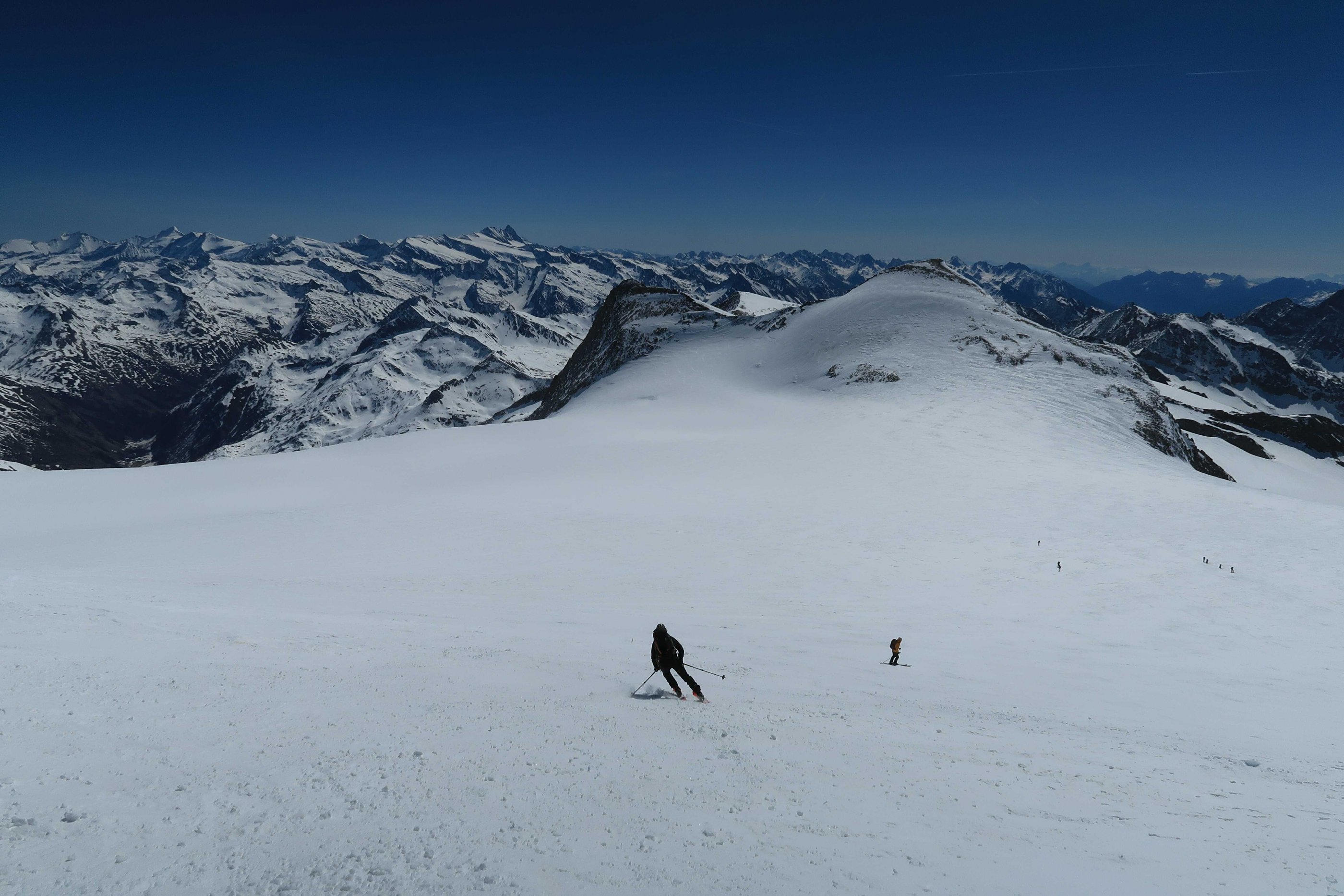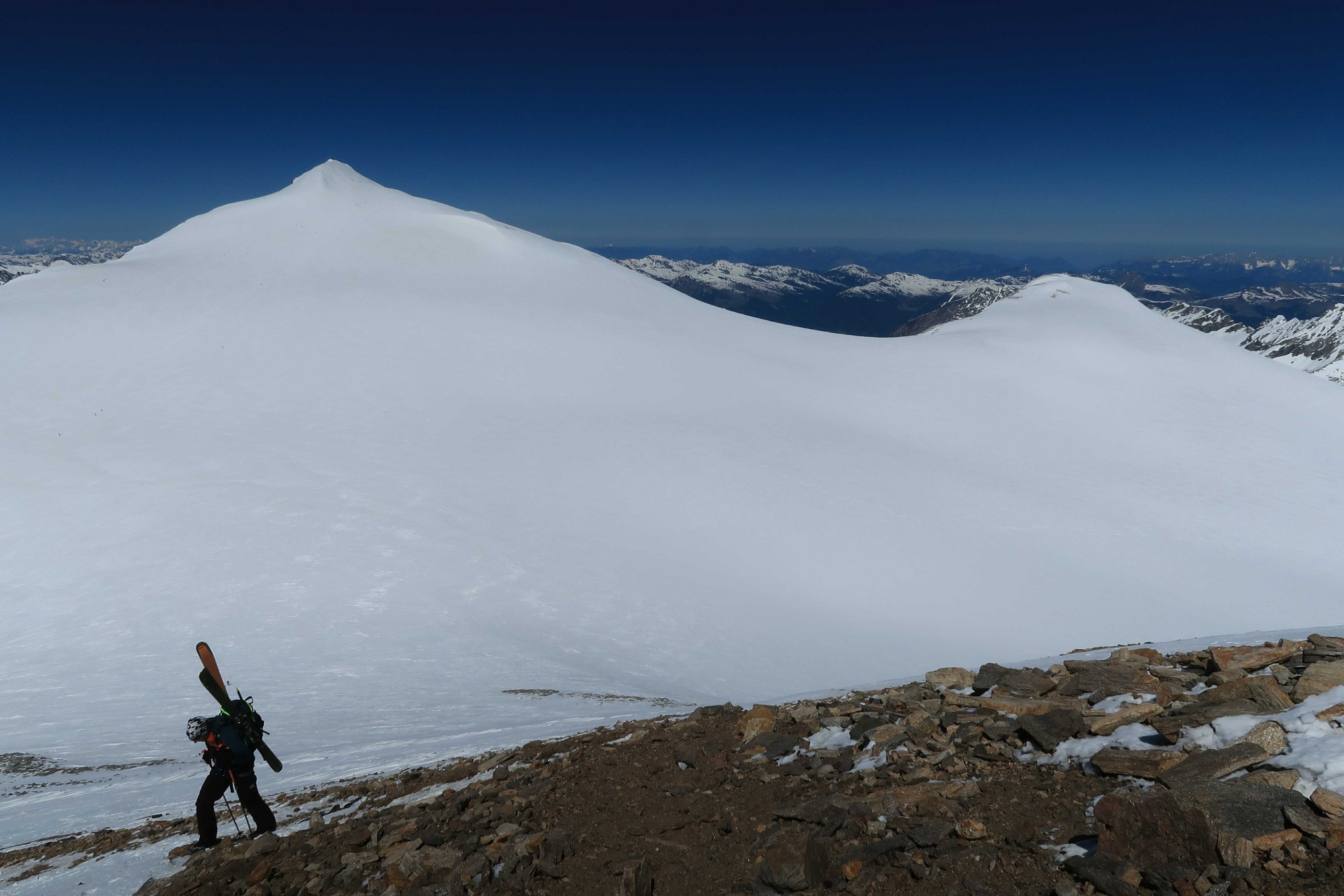 Nach ausgiebiger Gipfelrast hatte ich keine Lust auf eine Abfahrt über Windgangerl und fasste den Entschluss das Rainerhorn (3560) zu überschreiten. Ich nahm nicht die alte, sehr steile Spur durch den Nordhang, sondern querte nach rechts in wenigen Kehren auf den oben schottrigen Westgrat, der deutlich flacher ist. Die obersten ca. 50Hm mussten die Ski auf Schotter getragen werden. Die Inspektion der anderen Seite stimmte mich für die Abfahrt optimistisch: glatte Schneeoberfläche, fast ohne Windgangeln. Also stieg ich zu Fuß mit Steigeisen in die Scharte (ca. 3460) zwischen Schwarzer Wand und Rainerhorn ab und weil ich schon mal da war, nahm ich die Schwarze Wand (3511) noch mit (Aufstieg zuerst rechts vom Felsgrat übern Schnee bis ganz auf den Grat und kurz über den Grat zum Gipfel). Abfahrt kurz unterm Gipfel über Firnschnee auf den flachen Gletscher (3407). Wieder angefellt und noch in 10 Minuten auf den flachen Hohen Zaun (3451). Abfahrt um ca. 13:30, in flachen Bereichen oben noch nicht ganz aufgefirnt, in steileren Bereichen schöner Firnschnee, links unterm Mullwitzaderl entlang zum Defereggerhaus. Ab hier bei durchgehendem Frühjahrsfirn hinab bis auf ca. 2170m, kurz oberhalb der Johannishütte.
