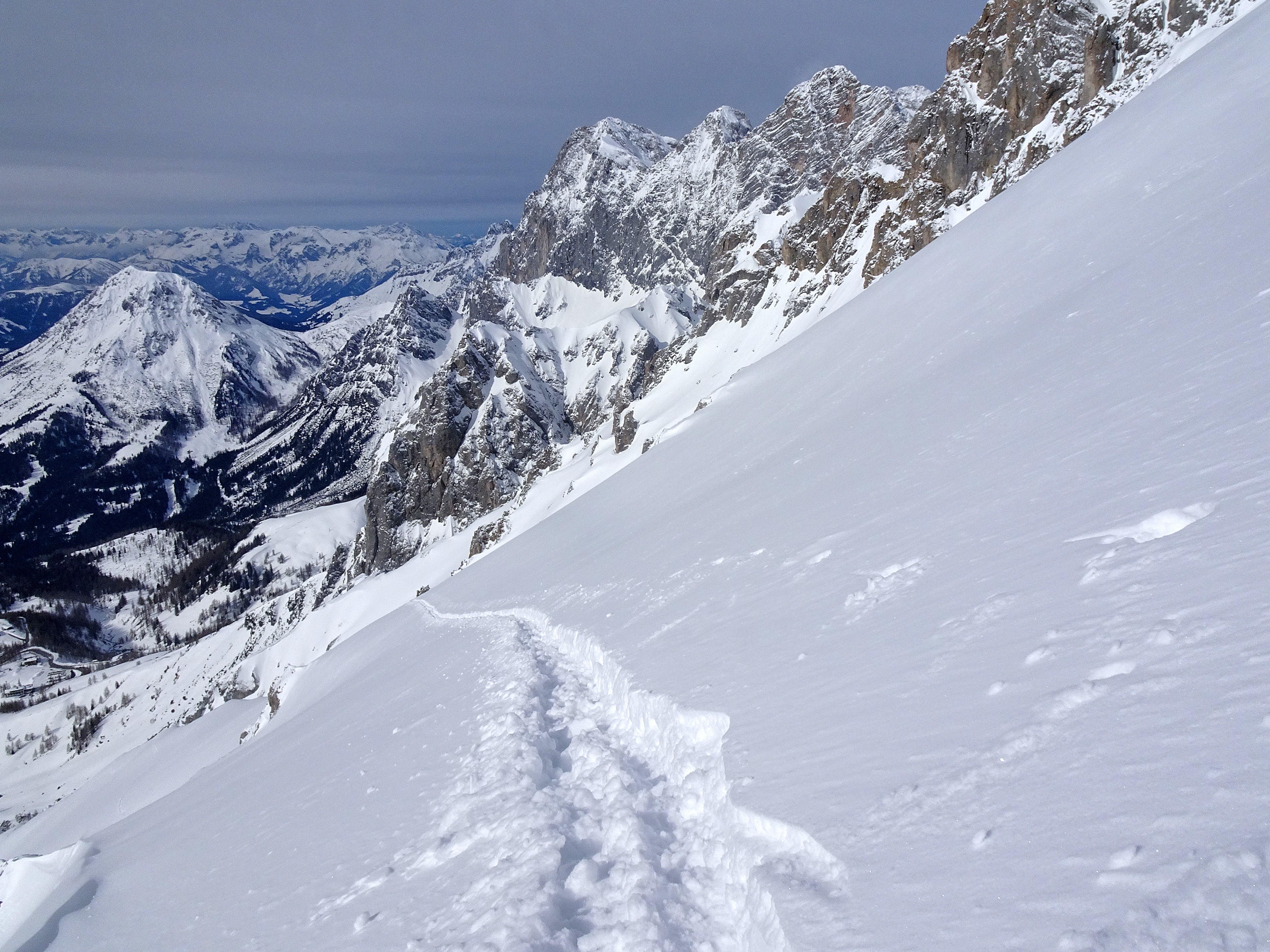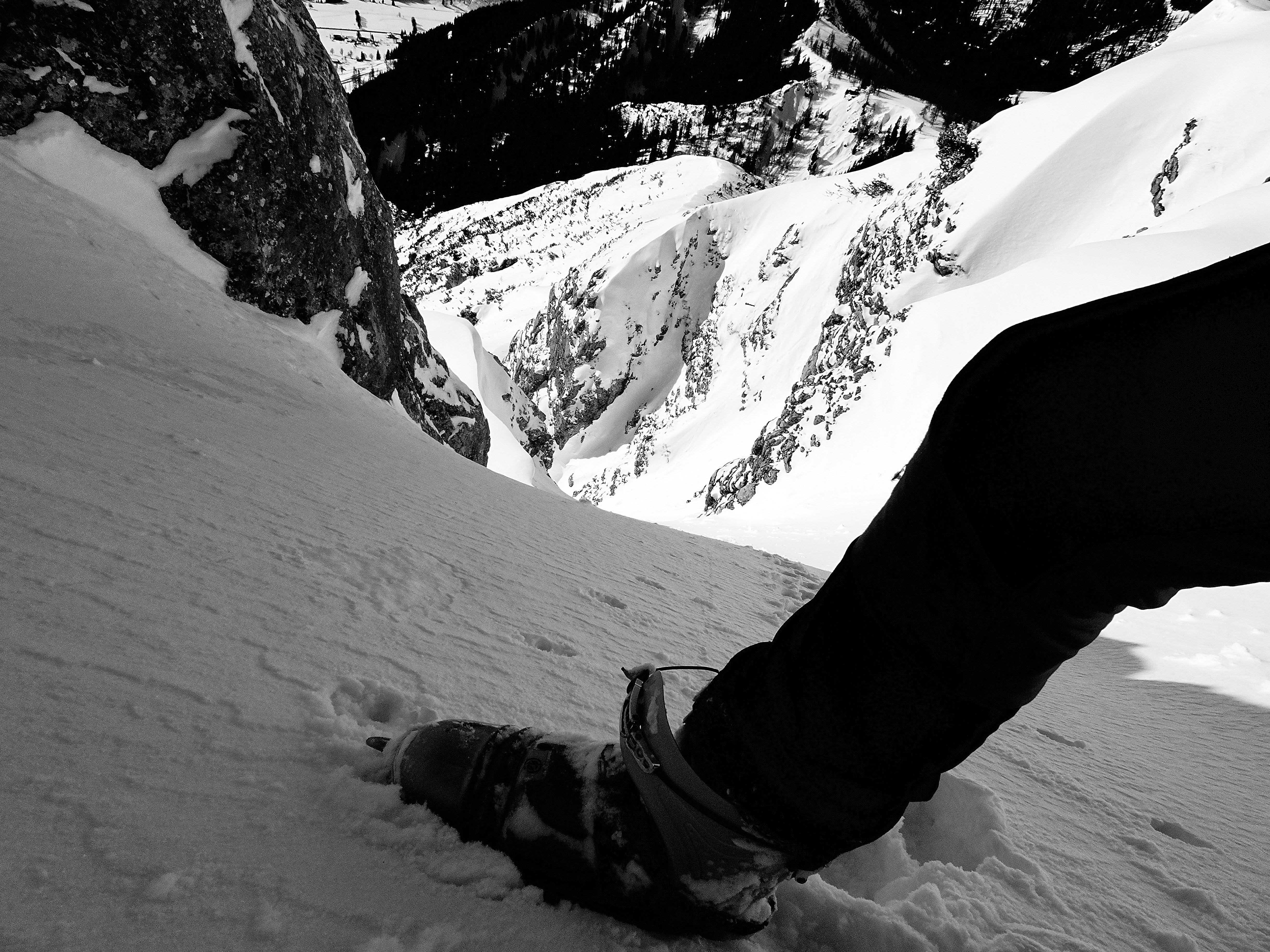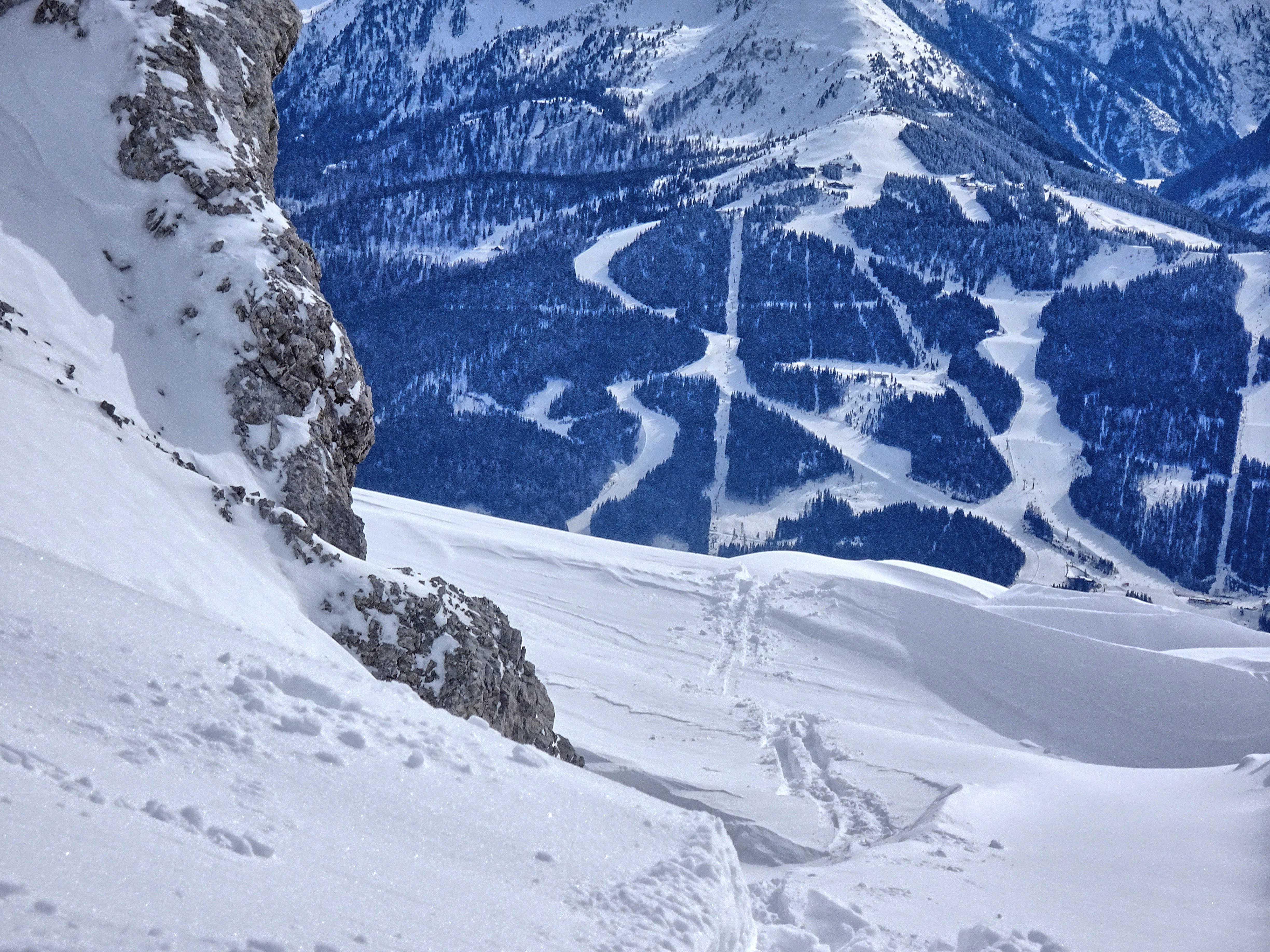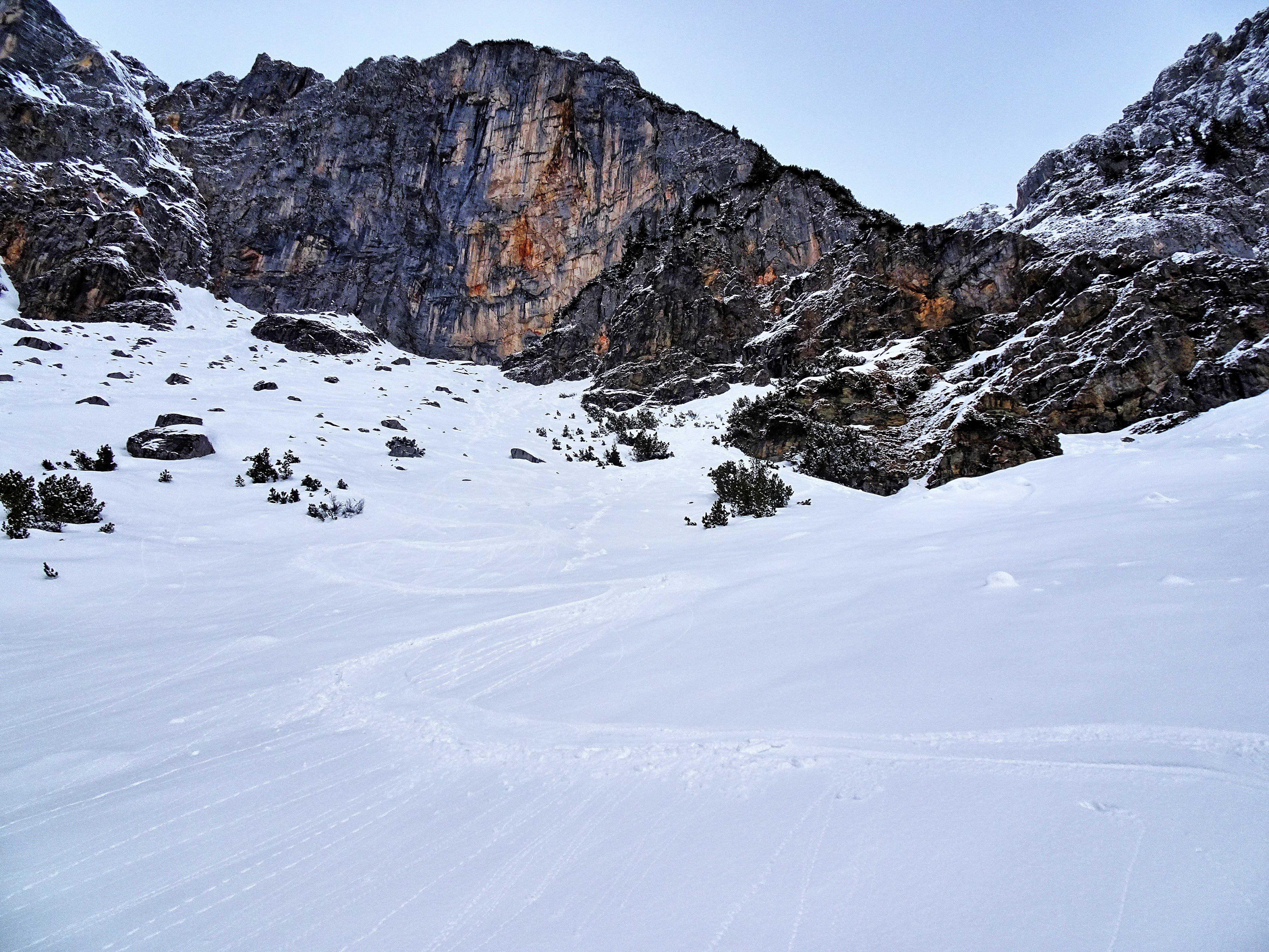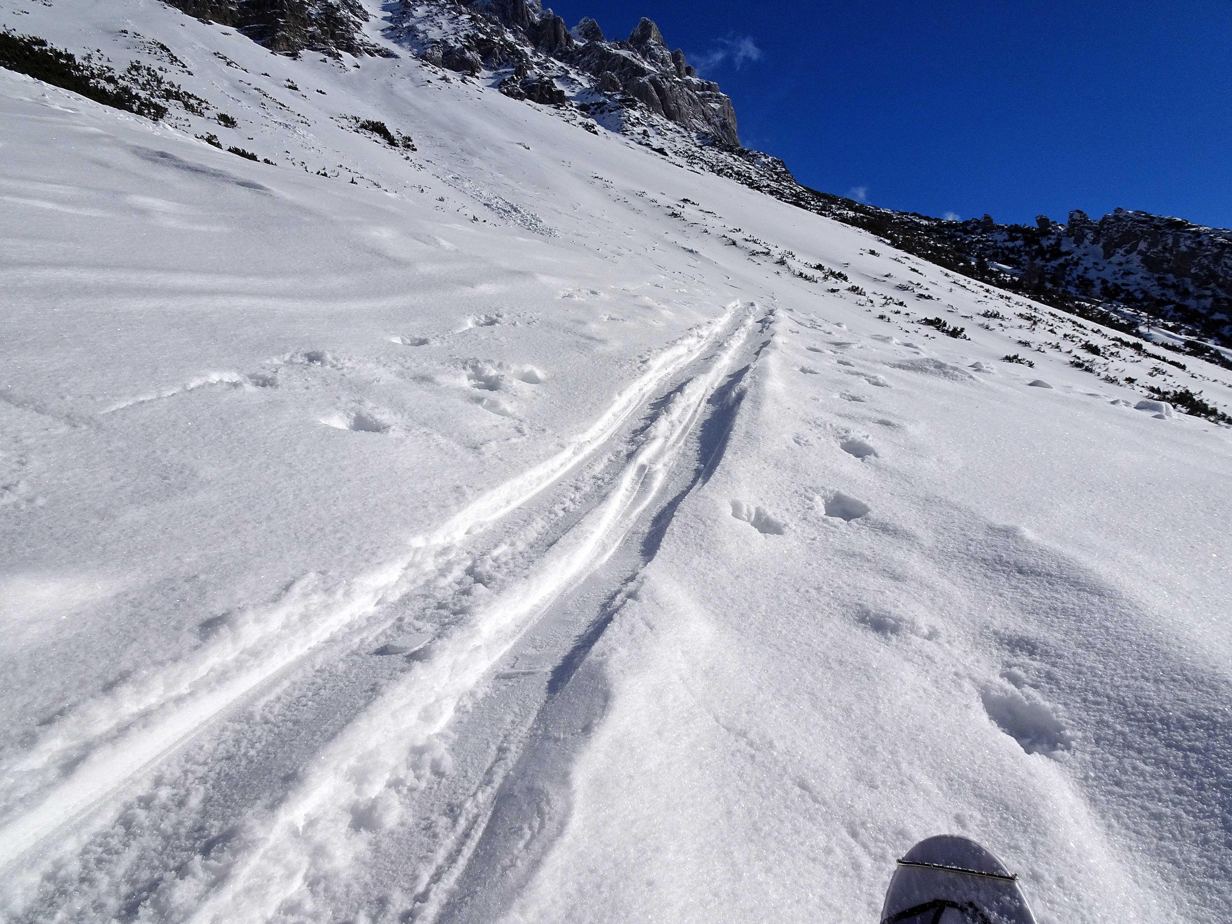 Südostseitig heute sichere Bedingungen. beim Aufstieg fallweise zarter Harschdeckel. Darüber bis 15cm zumeist lockerer Pulver. Kompakter, in allen Höhenlagen nahezu identer Untergrund, der sowohl meinen Steigeisen als auch den Hufen der Gemsen standhaltet. Fallweise böiger Wind. Selten gute Abfahrtsbedingungen in der Fluder ;-)