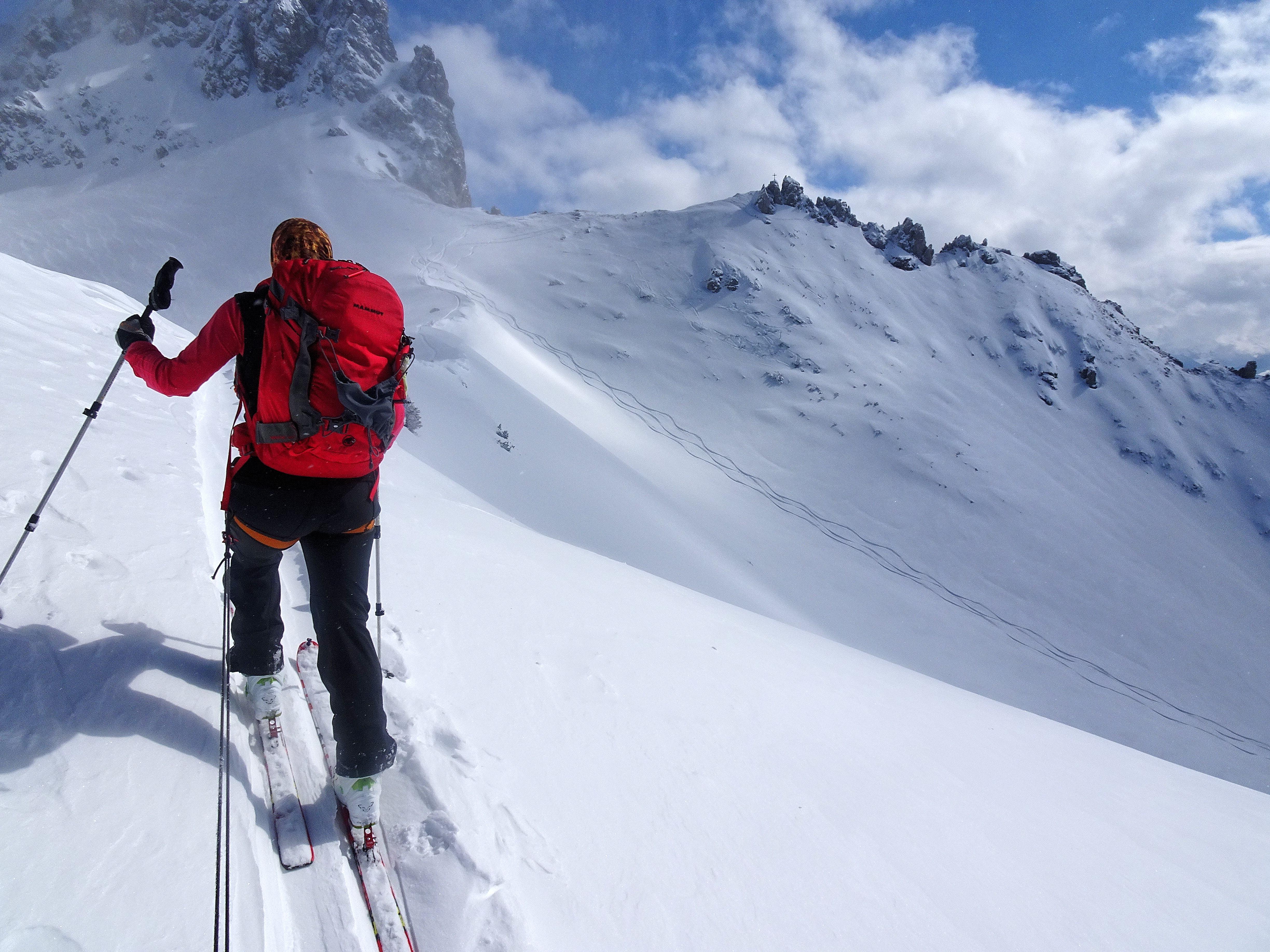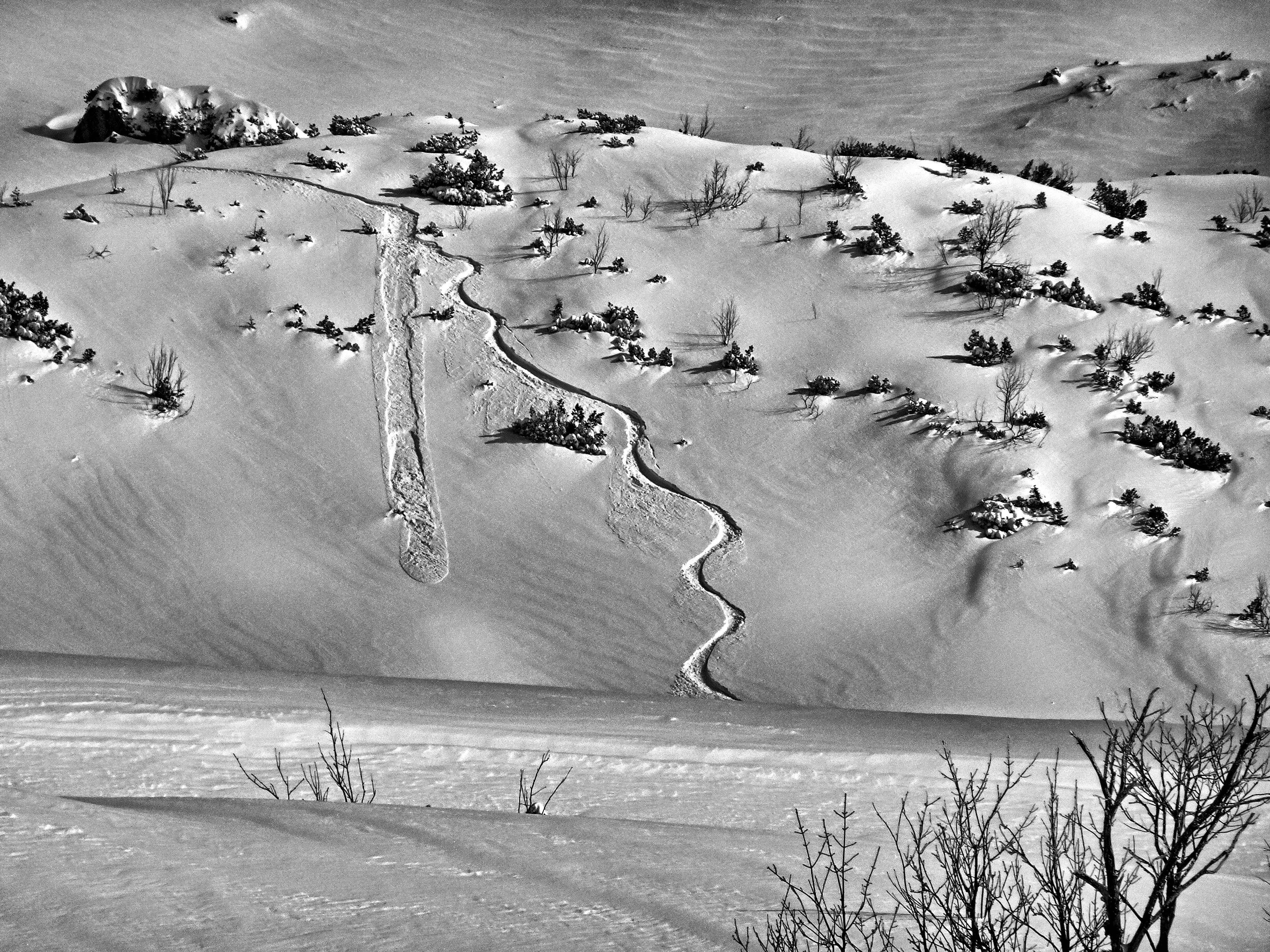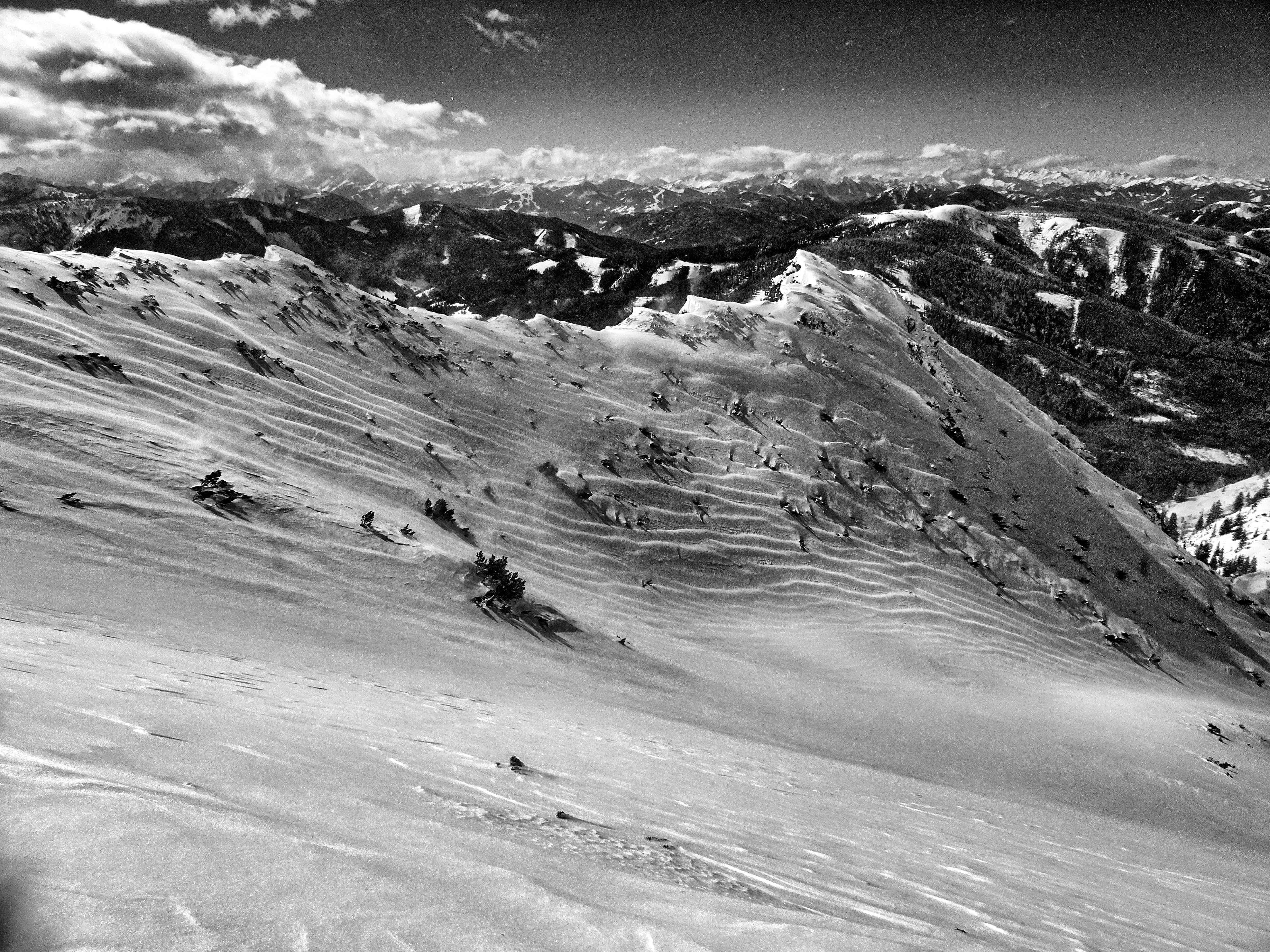Bei windstillen märchenhaften Bedingungen, entlang der Forststraße von Neuberg über die Arzbergalm, Sulzkaralm Richtung Langtal. Hier erwischte uns und viele andere ein stürmischer Gegenwind. Die Aufstiegsspur war innerhalb von Minuten mit betonartigem Triebschnee zugeweht. Wir überlegten umzukehren. Doch das Wetter wurde wie prognostiziert allmählich besser. Abfahrt übers Sulzkar bei schon etwas stichigem Pulver.