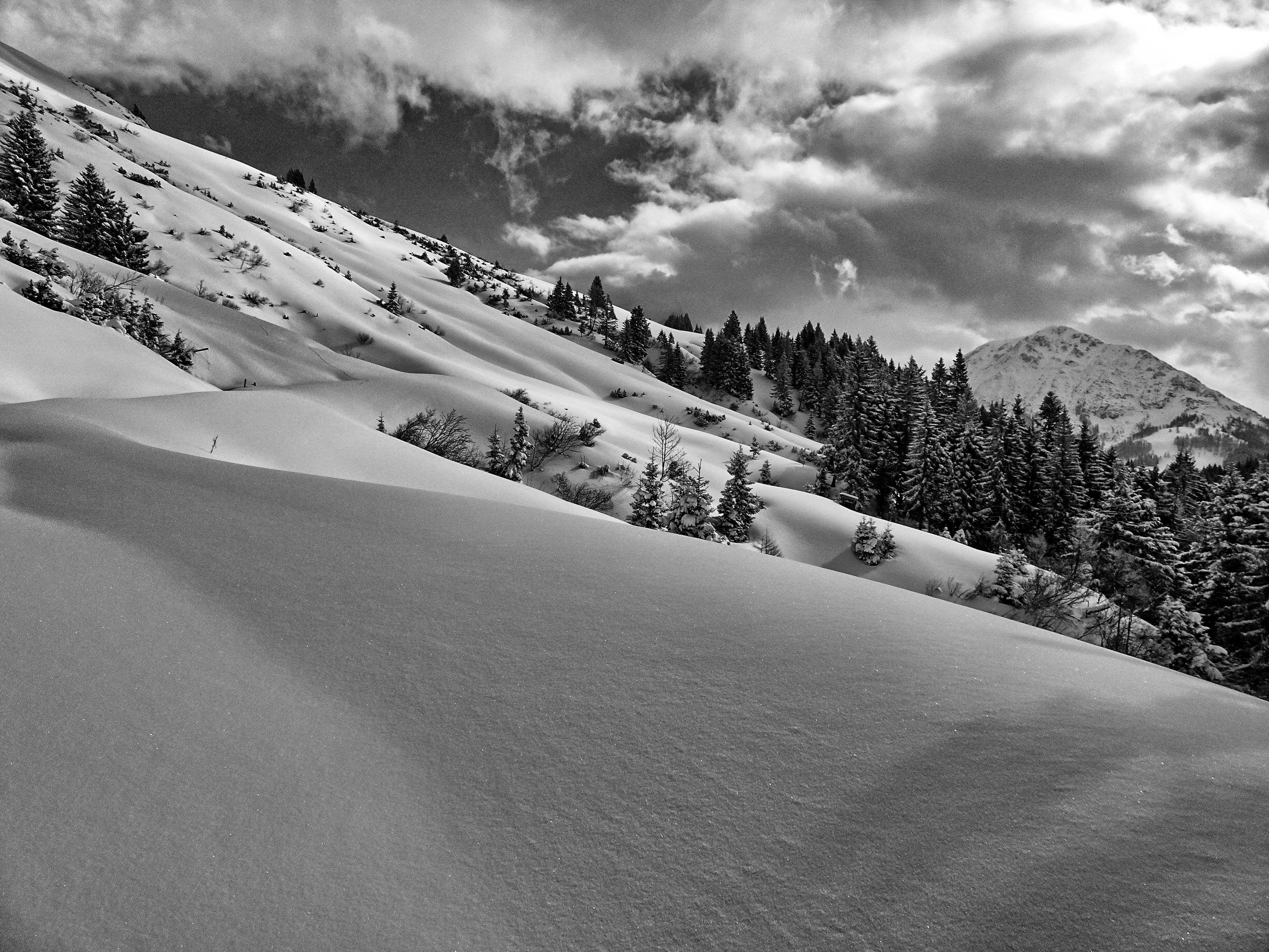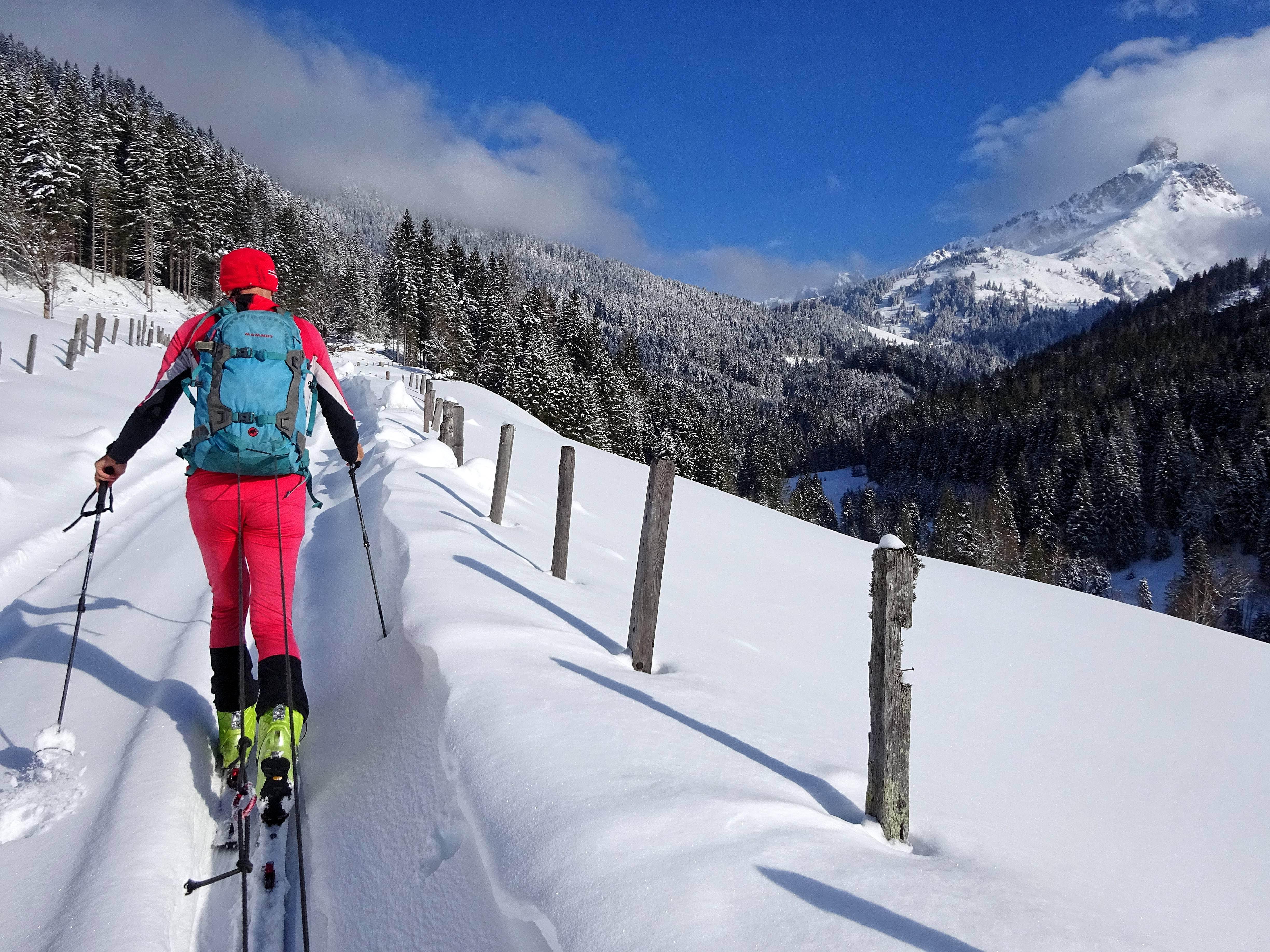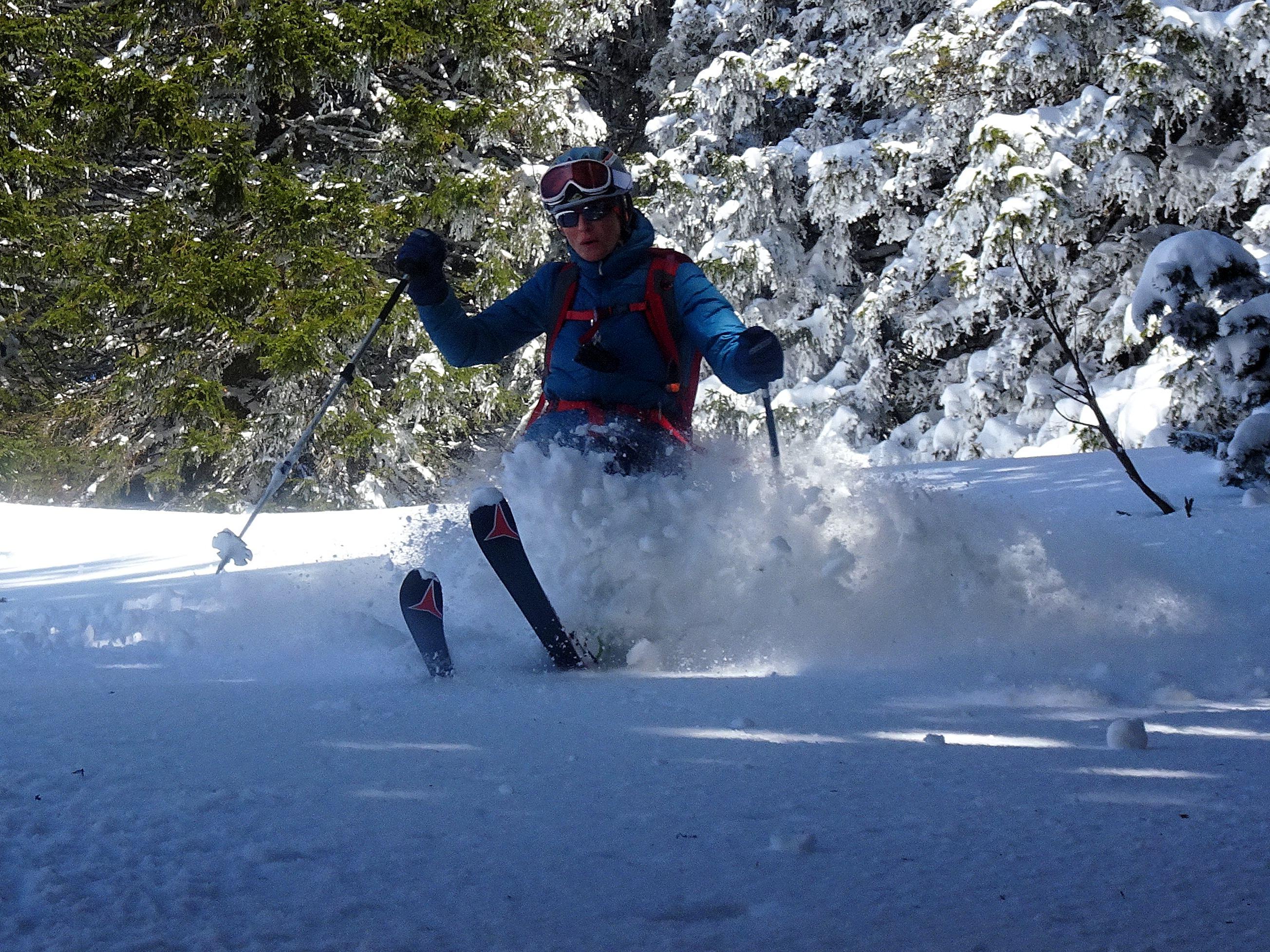 Bei windstillen märchenhaften Bedingungen, entlang der Forststraße von Neuberg über die Arzbergalm, Sulzkaralm Richtung Langtal. Hier erwischte uns und viele andere ein stürmischer Gegenwind. Die Aufstiegsspur war innerhalb von Minuten mit betonartigem Triebschnee zugeweht. Wir überlegten umzukehren. Doch das Wetter wurde wie prognostiziert allmählich besser. Abfahrt übers Sulzkar bei schon etwas stichigem Pulver.