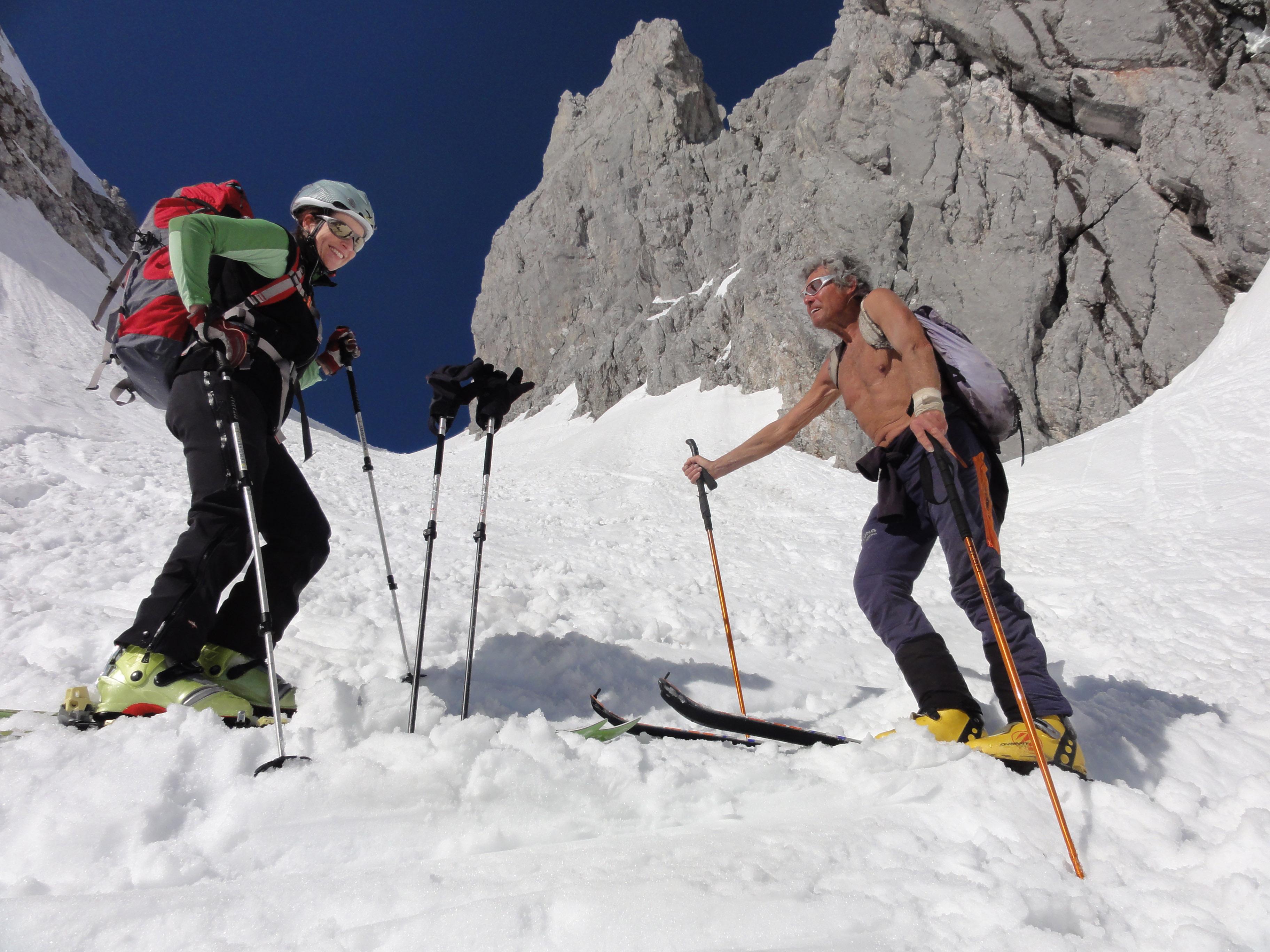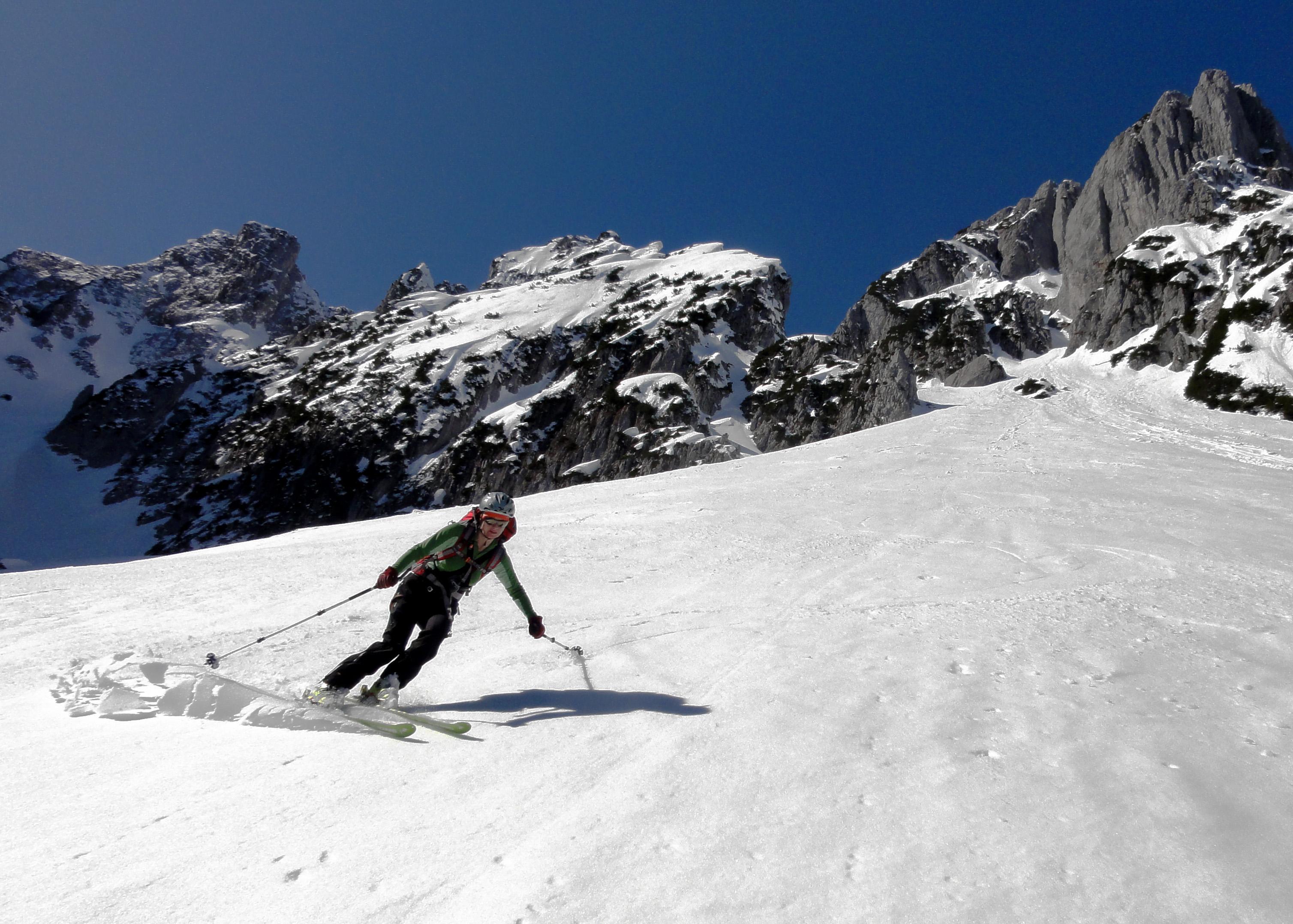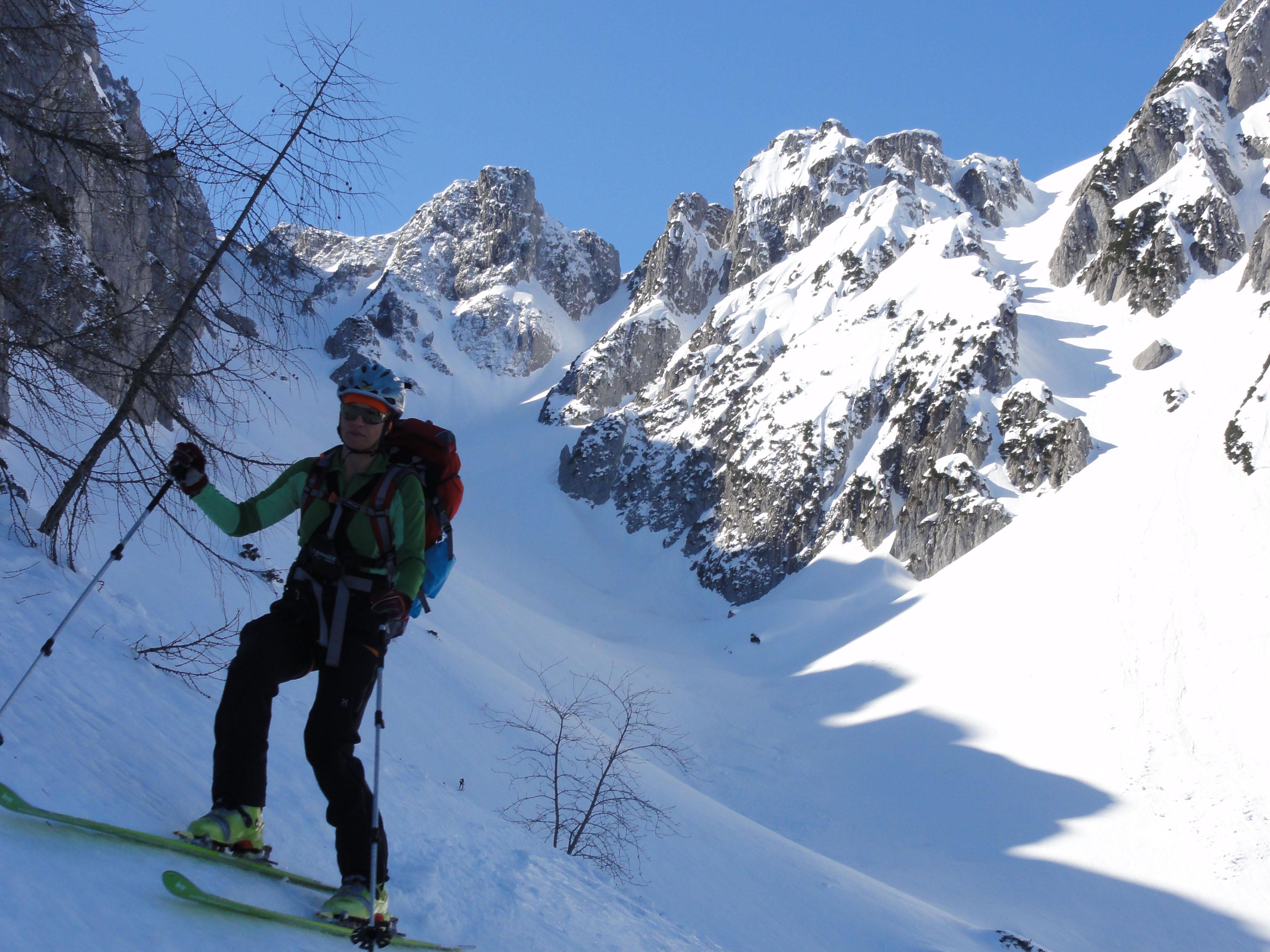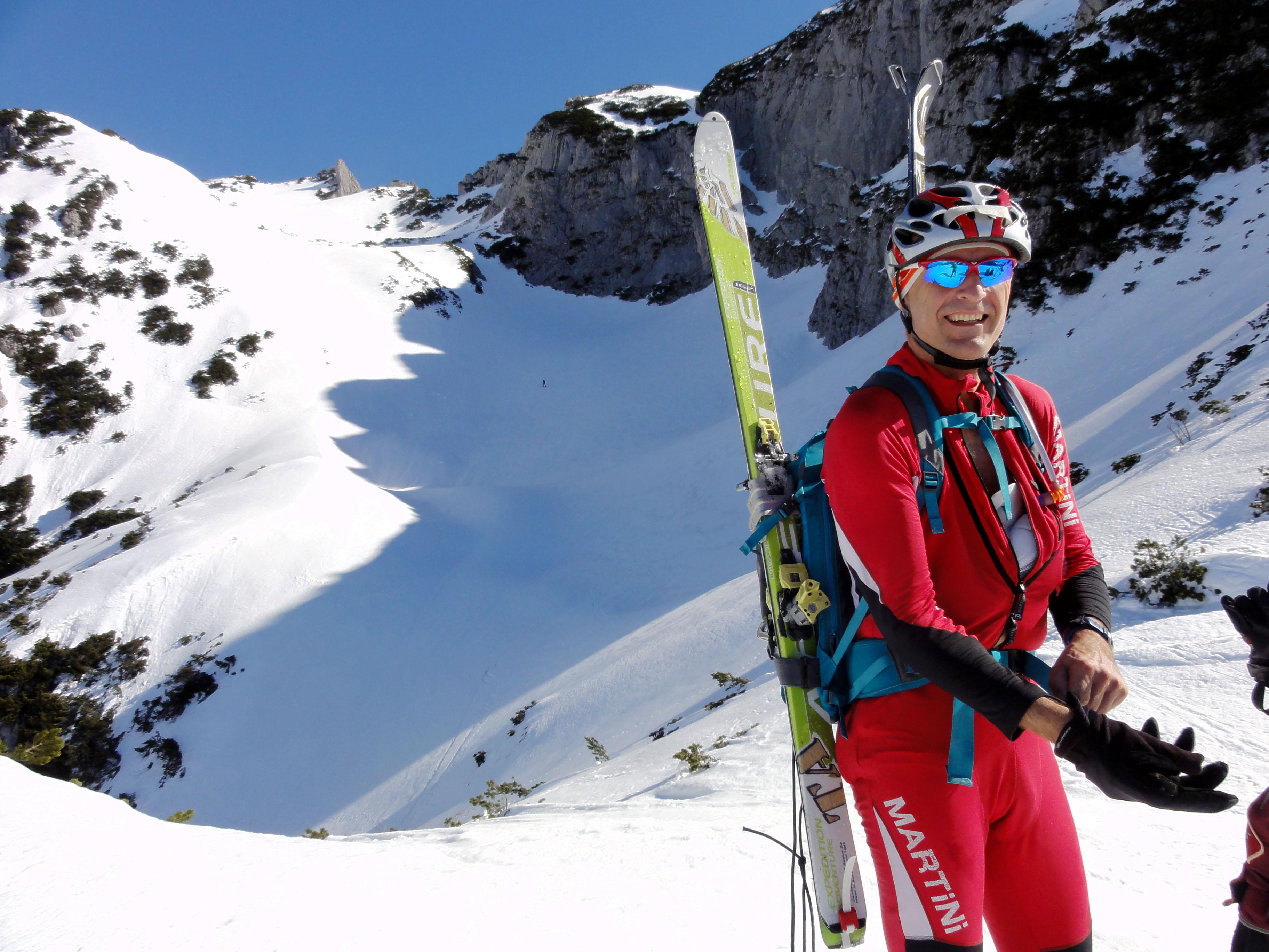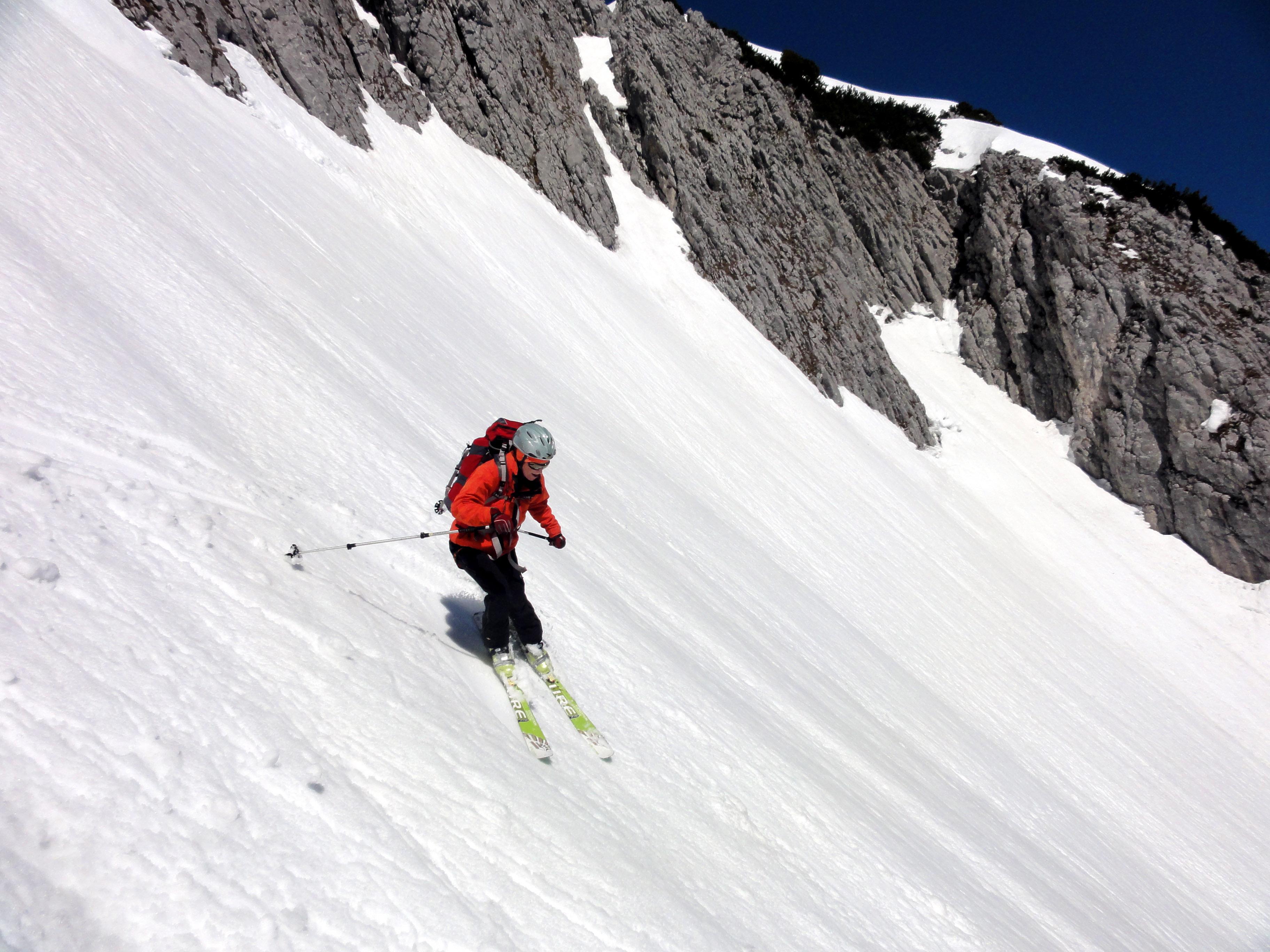 Von Süd nach Nord und wieder retour führte uns unsere heutige Tour vom Pommer ausgehend über die östliche Strichkogelrinne zur Scharwandhütte, Mandlscharte zurück zum Pommer. Die Verhältnisse hätten abwechslungsreicher nicht sein können. Die komplette Ausrüstung inclusive Steigeisen kam zum Einsatz. Nur einen Schraubenzieher hatten wir nicht mit. Daher war zum Tourabschluß ab der Stuhlalm auch noch Monoschifahren im Sulz angesagt....