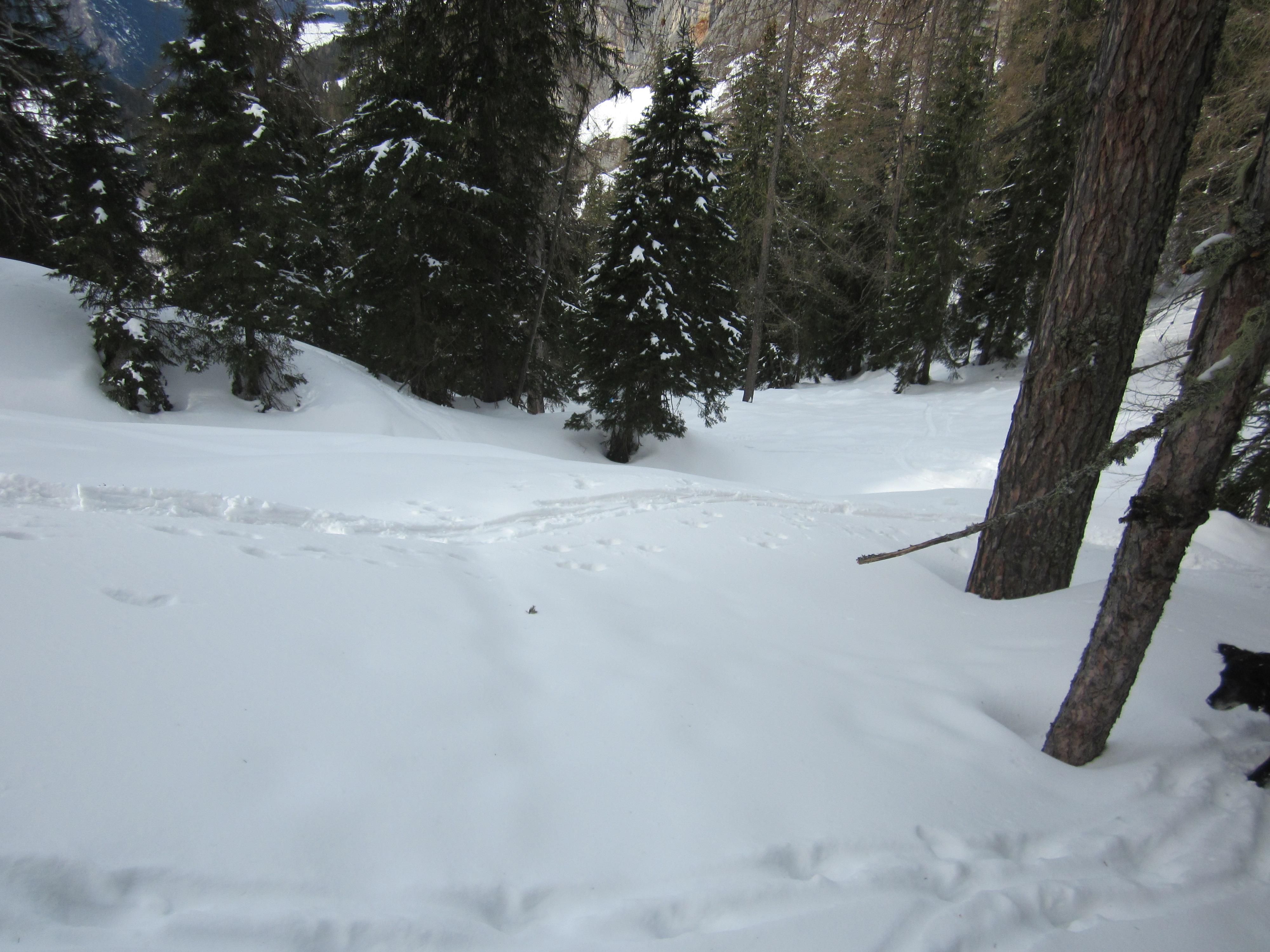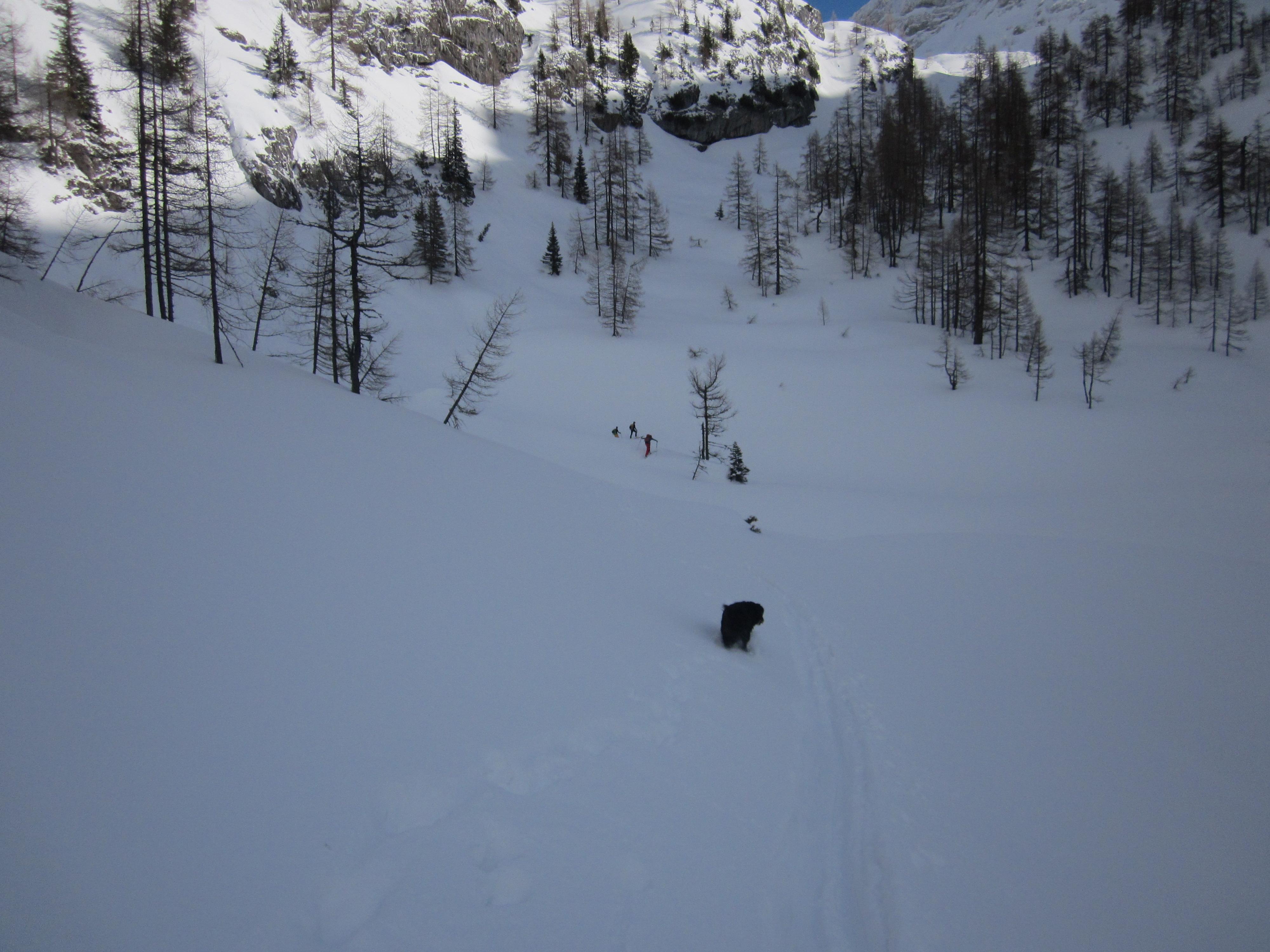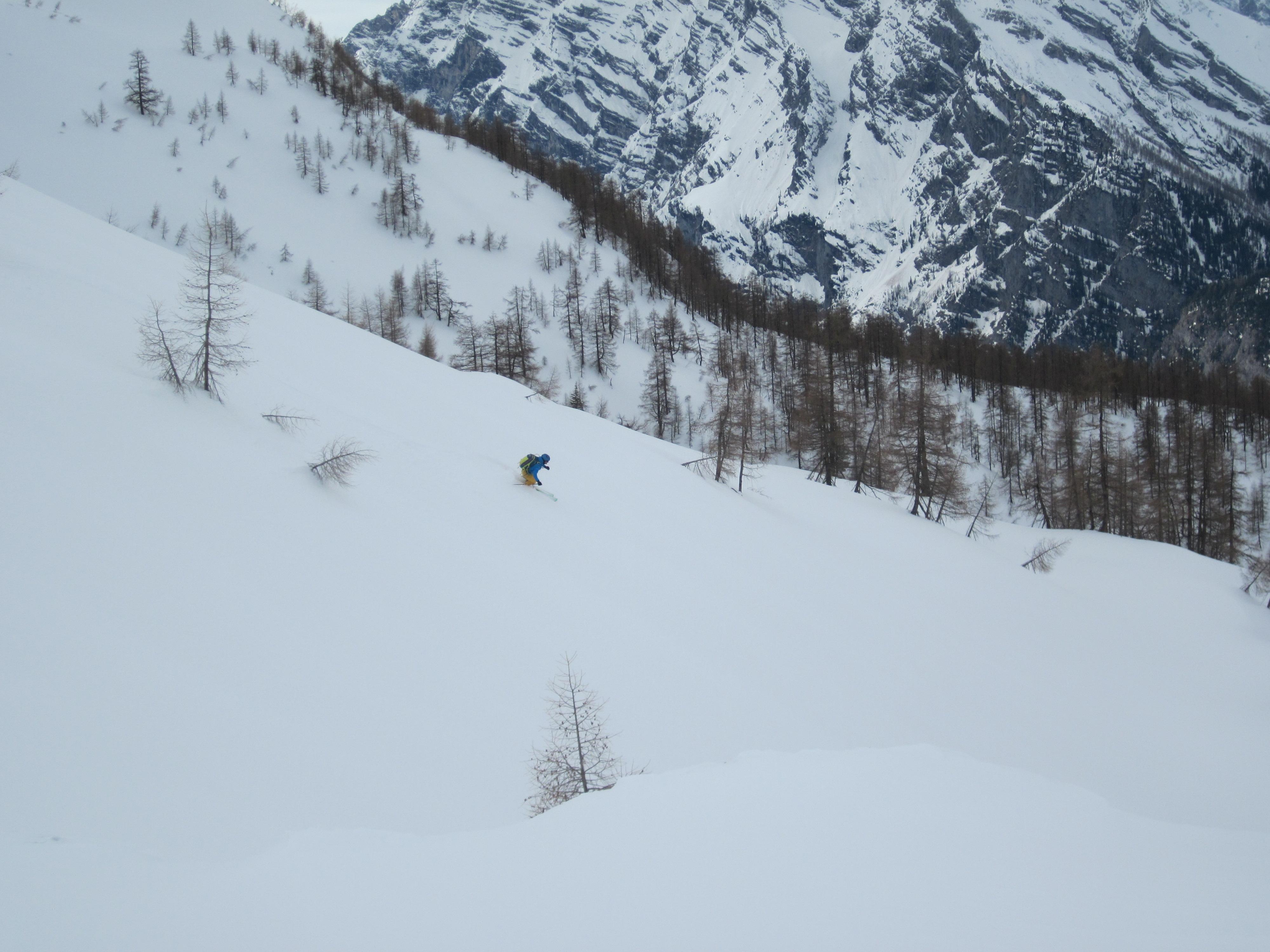 Früher Start um 9:45 Uhr. Alles Pulver zum Spuren - jetzt ists zerpflügt :-) - daher Planänderung und die Aufstiegsrunter wieder runter. Leider nicht mehr ganz so fluffig, wie rauf aber nach knapp 900 Hm freie Hänge is des nebensächlich.