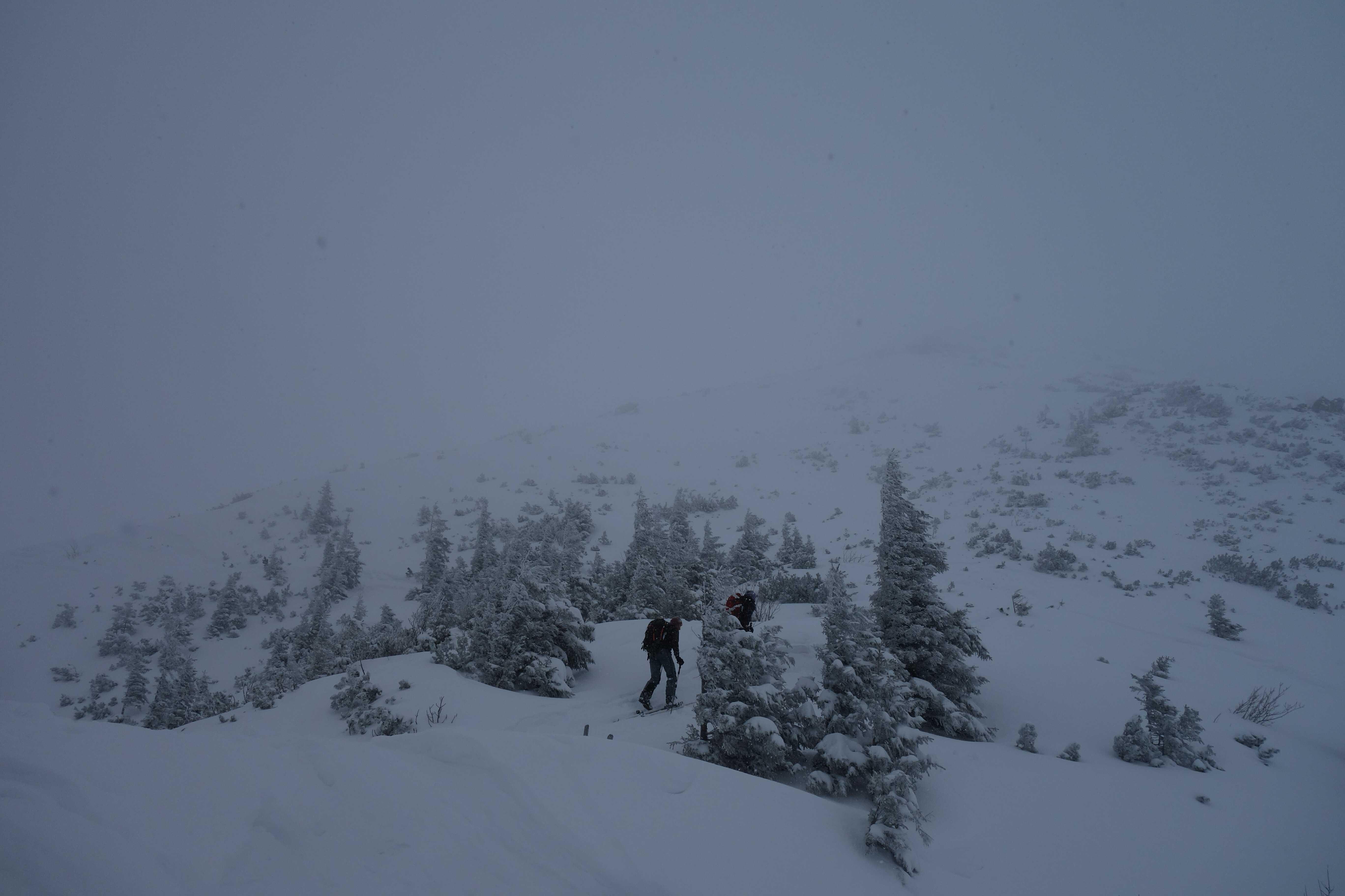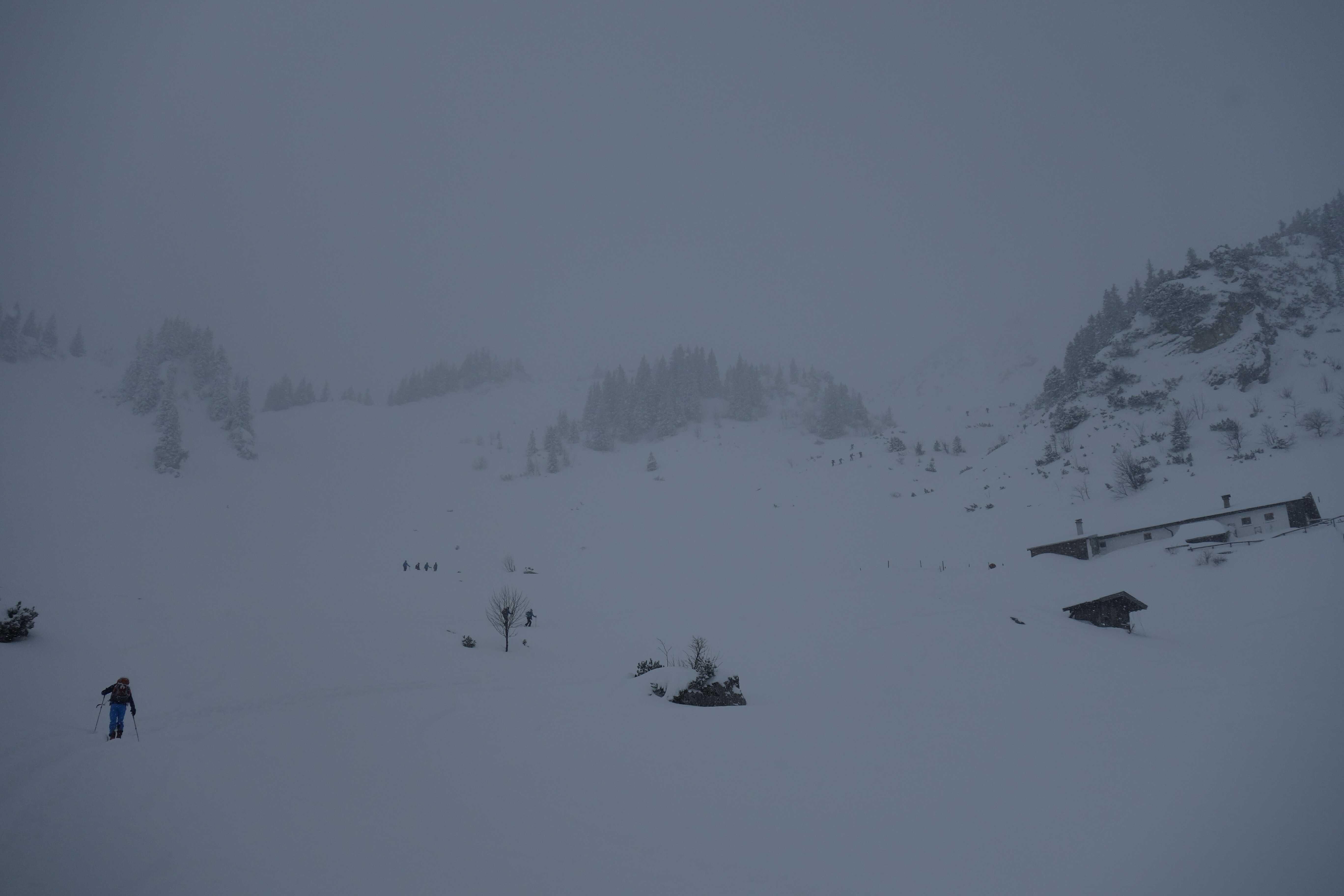 Wetter: Stark bewölkt, zeitweiser Schneefall, diffuse Sicht, oben leichter, zeitweise böiger Wind aus westl. Richtungen mit Verfrachtungsstärke.