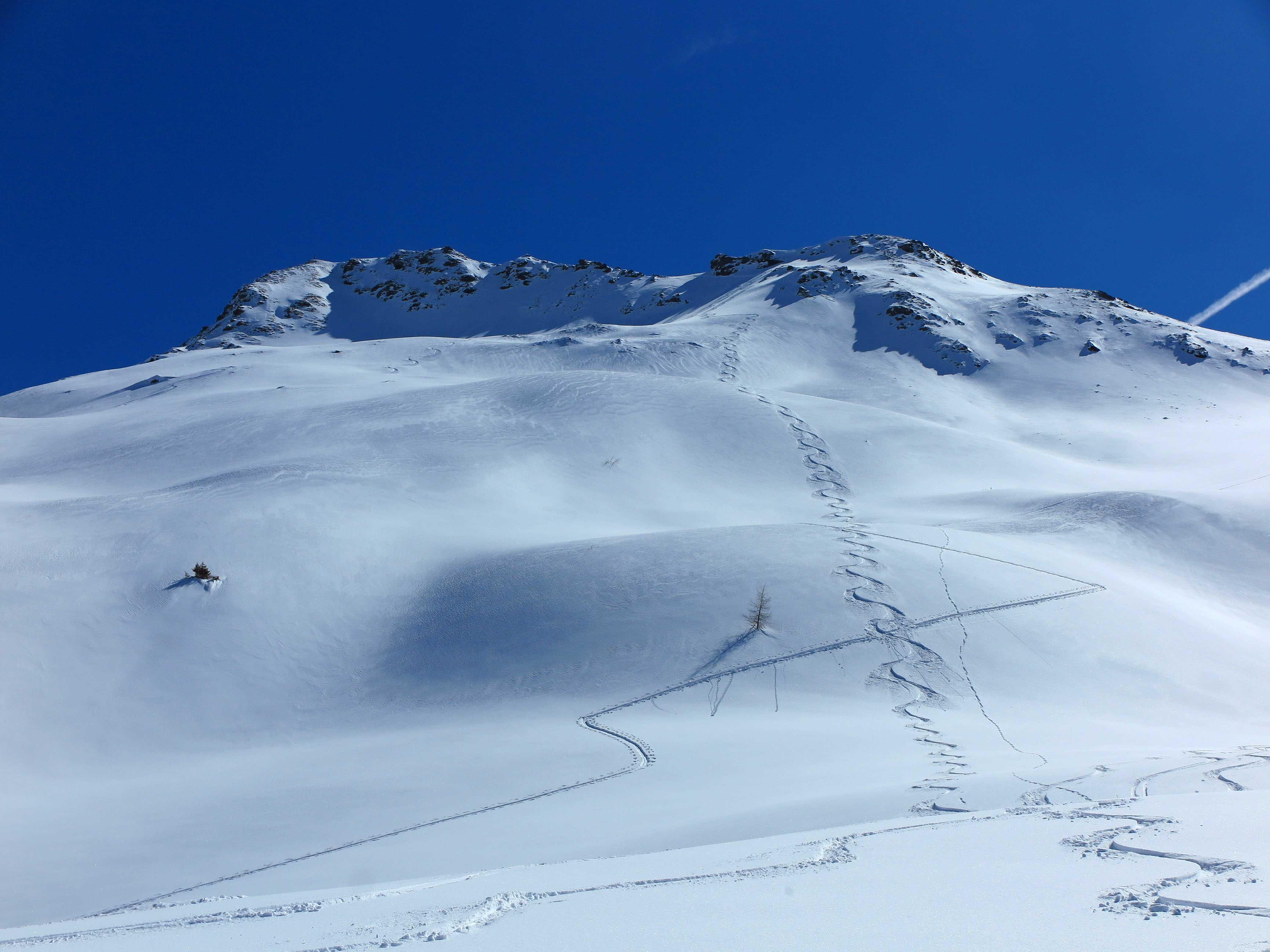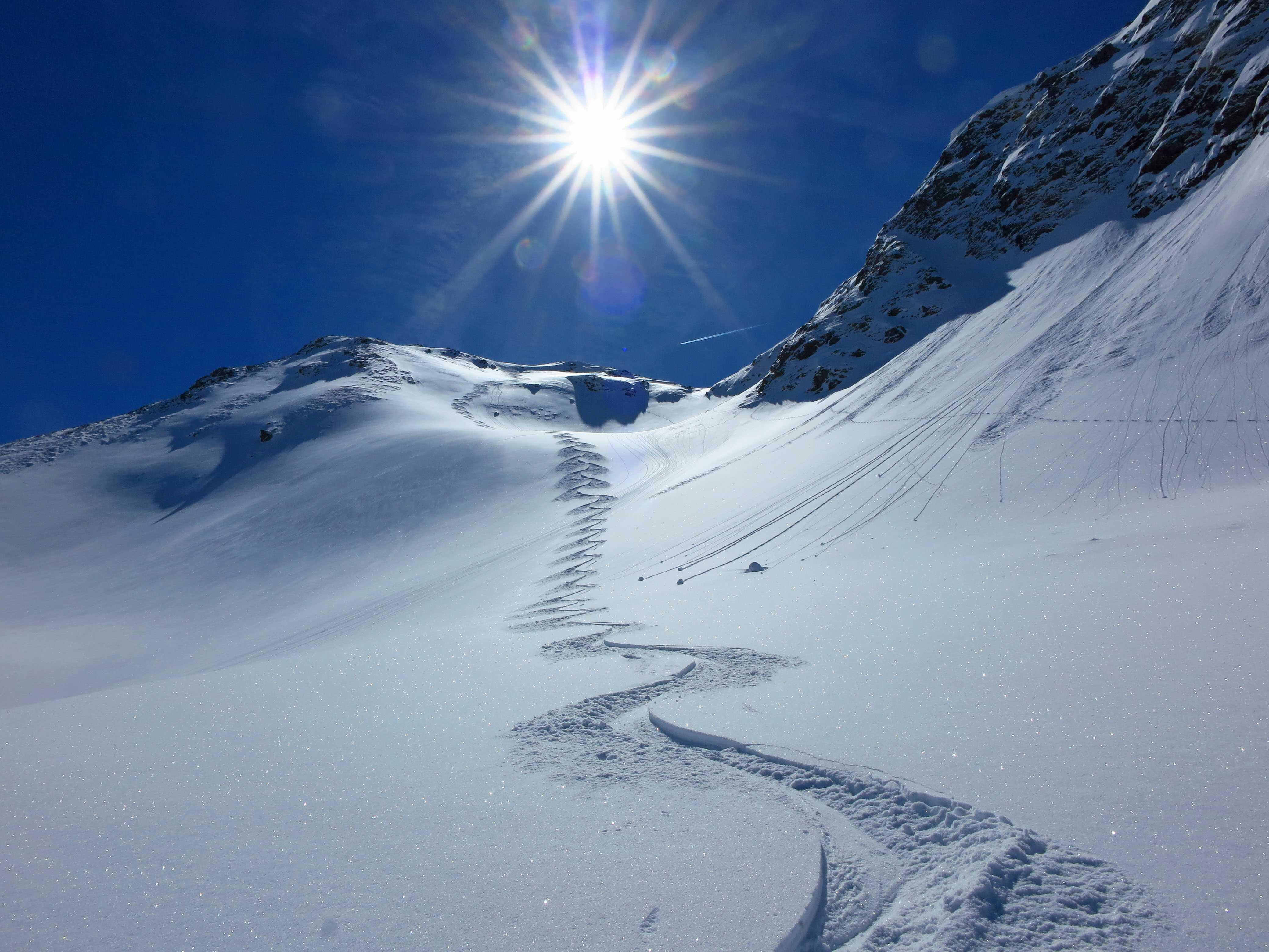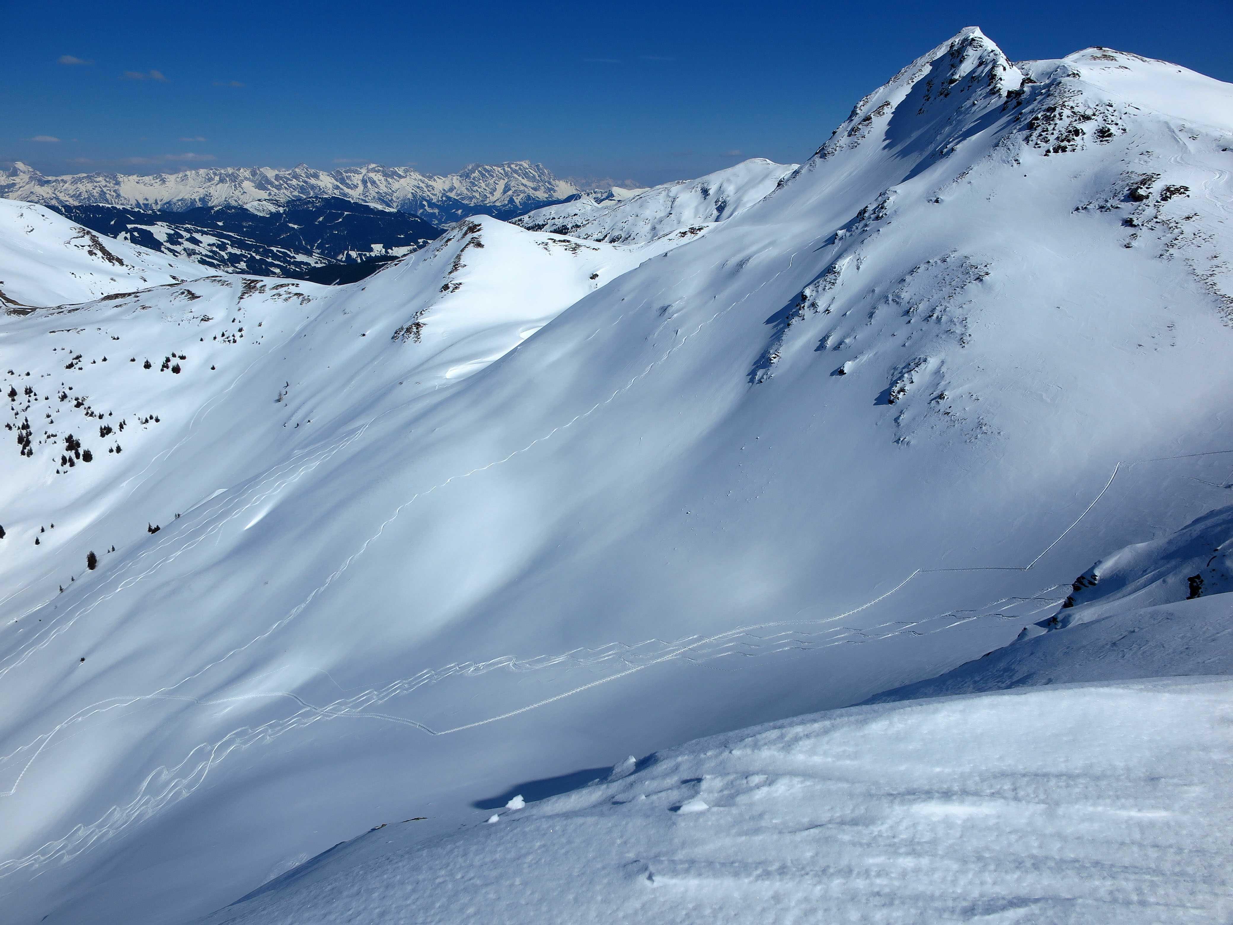 Schneelage: In den Nordkaren sehr schöner Pulver (ca. 10-20cm) auf durchwegs tragfähigem Untergrund, ideal zu fahren. In den steileren reinen Südhängen schon schöner Firn.