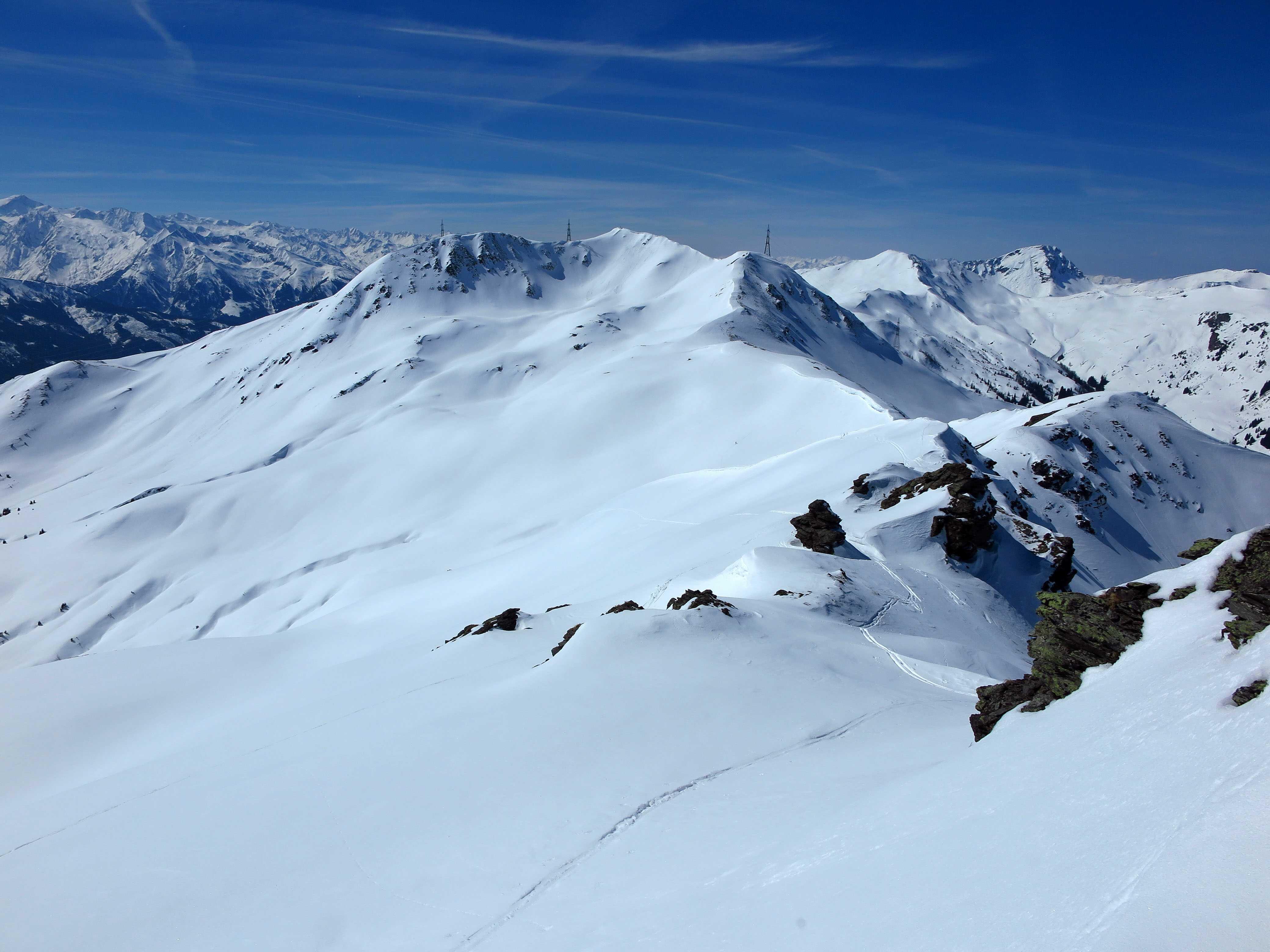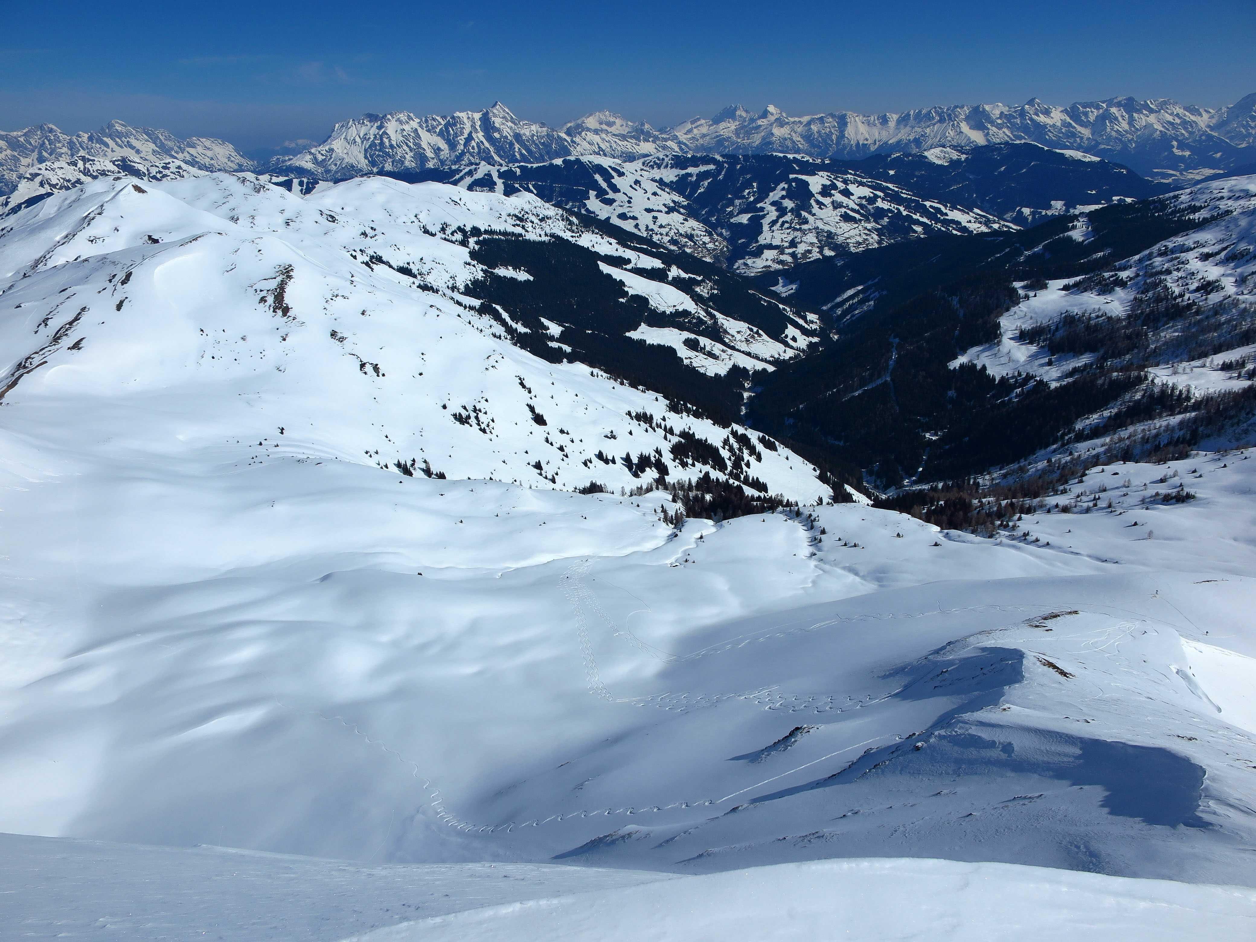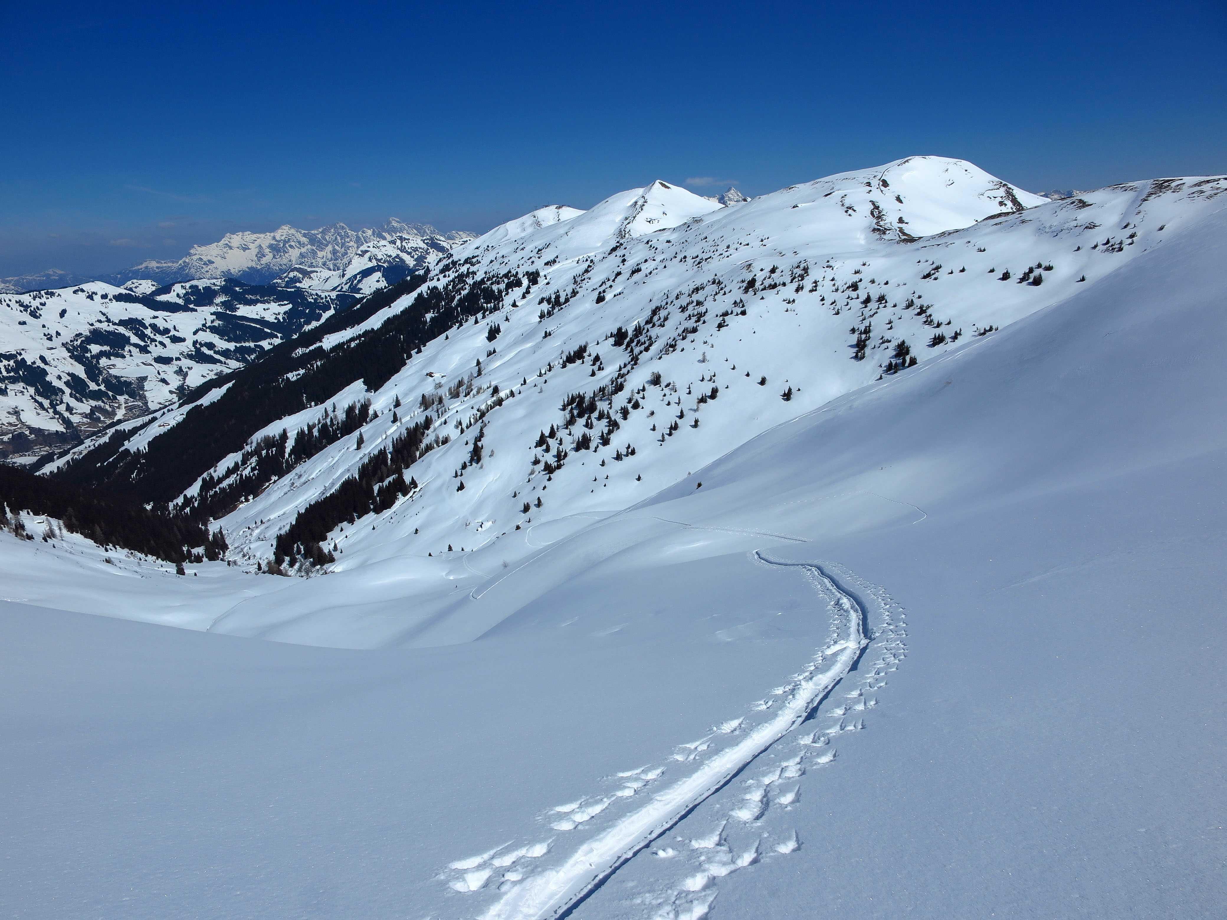 Von Hinterglemm/Schwarzachengraben (1260) über die Huberhochalm (1734) und die Kegerlalm (1600) zum Hochkogel (2249). Abfahrt N-Hang ins Polzkar (ca. 1700), Wiederanstieg Hochsaalbachkogel (bis Drahtseile, 2180), Abfahrt wieder nordseitig ins Polzkar. Wiederanstieg Medalkogel (2123) und Abfahrt übers Medalkar und Huberhochalm zurück zum PP.
