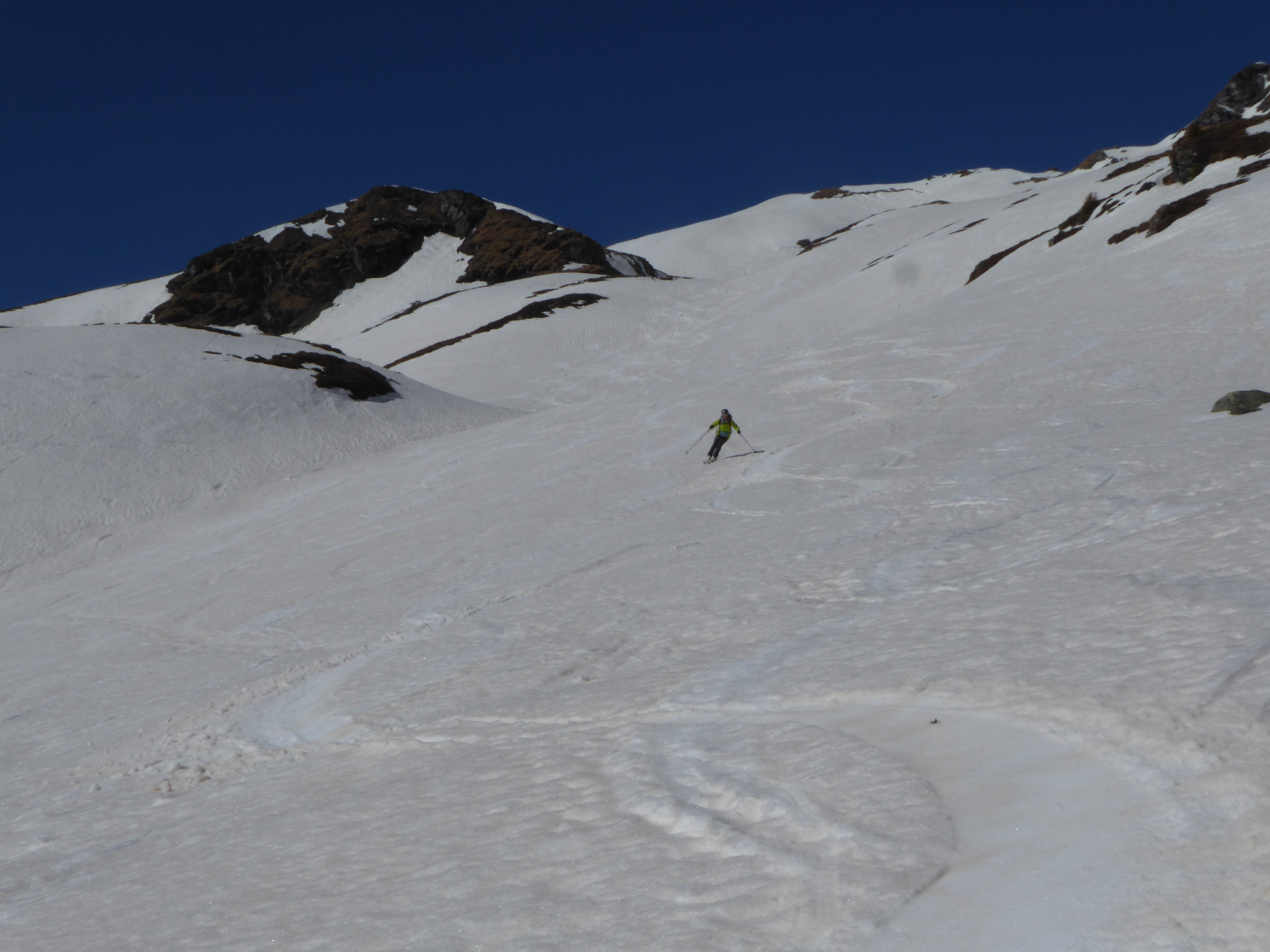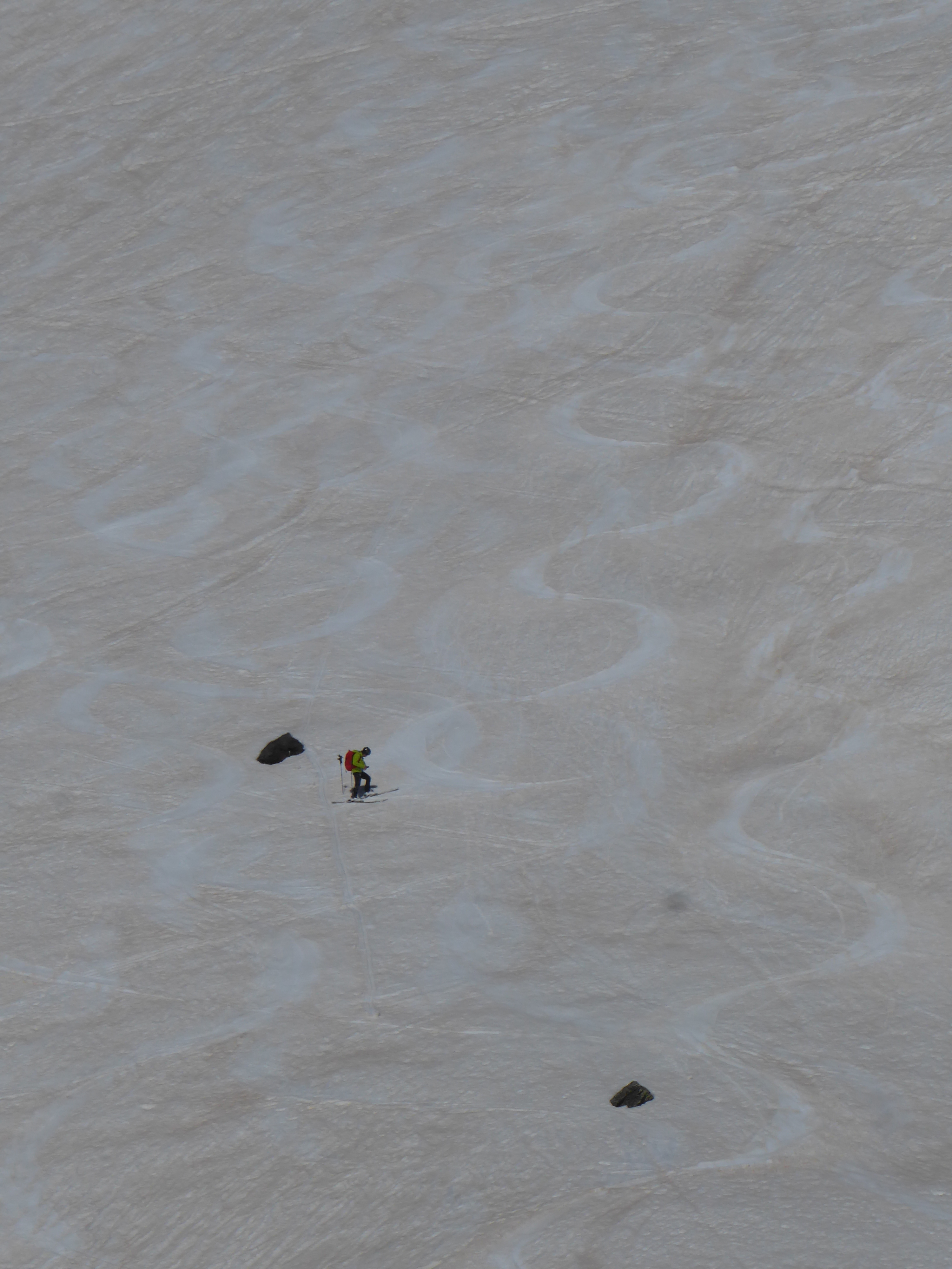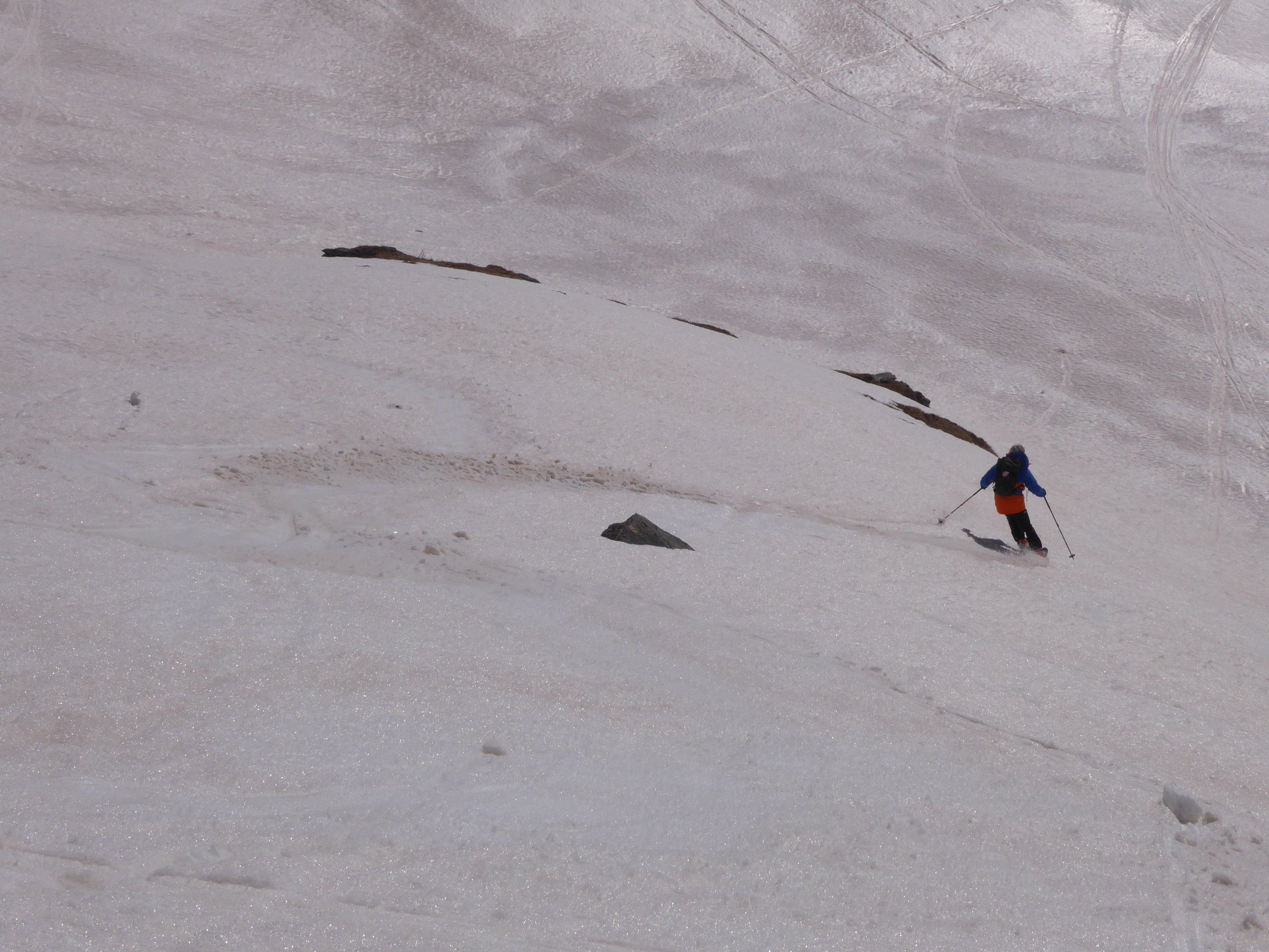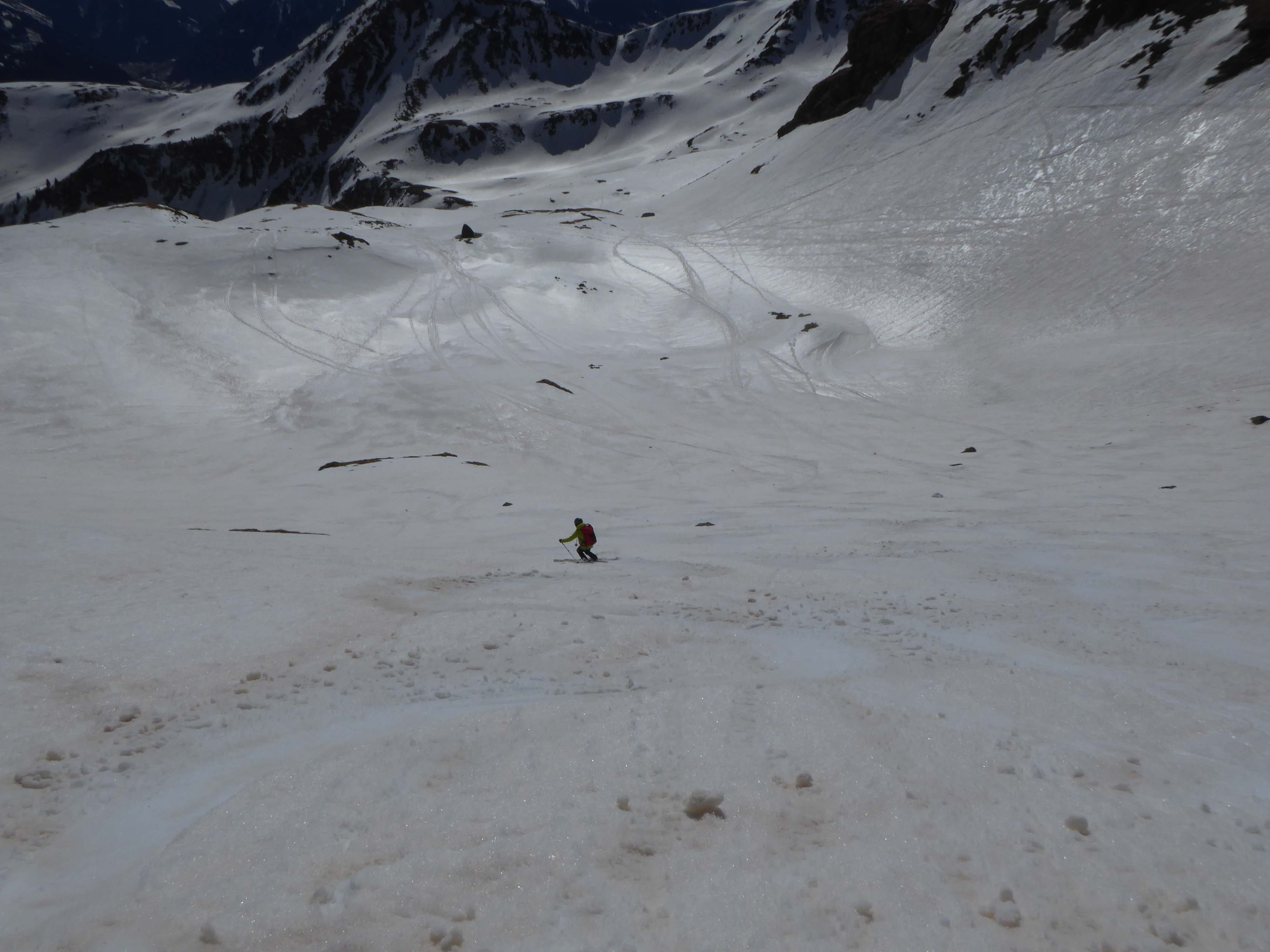 Wie gestern bester Firn mit großzügigem Zeitfenster. Der steile Ausstiegshang in recht gutmütigem Zustand, kein Eis, sehr gute Spur. Gipfelgrat aper und problemlos.