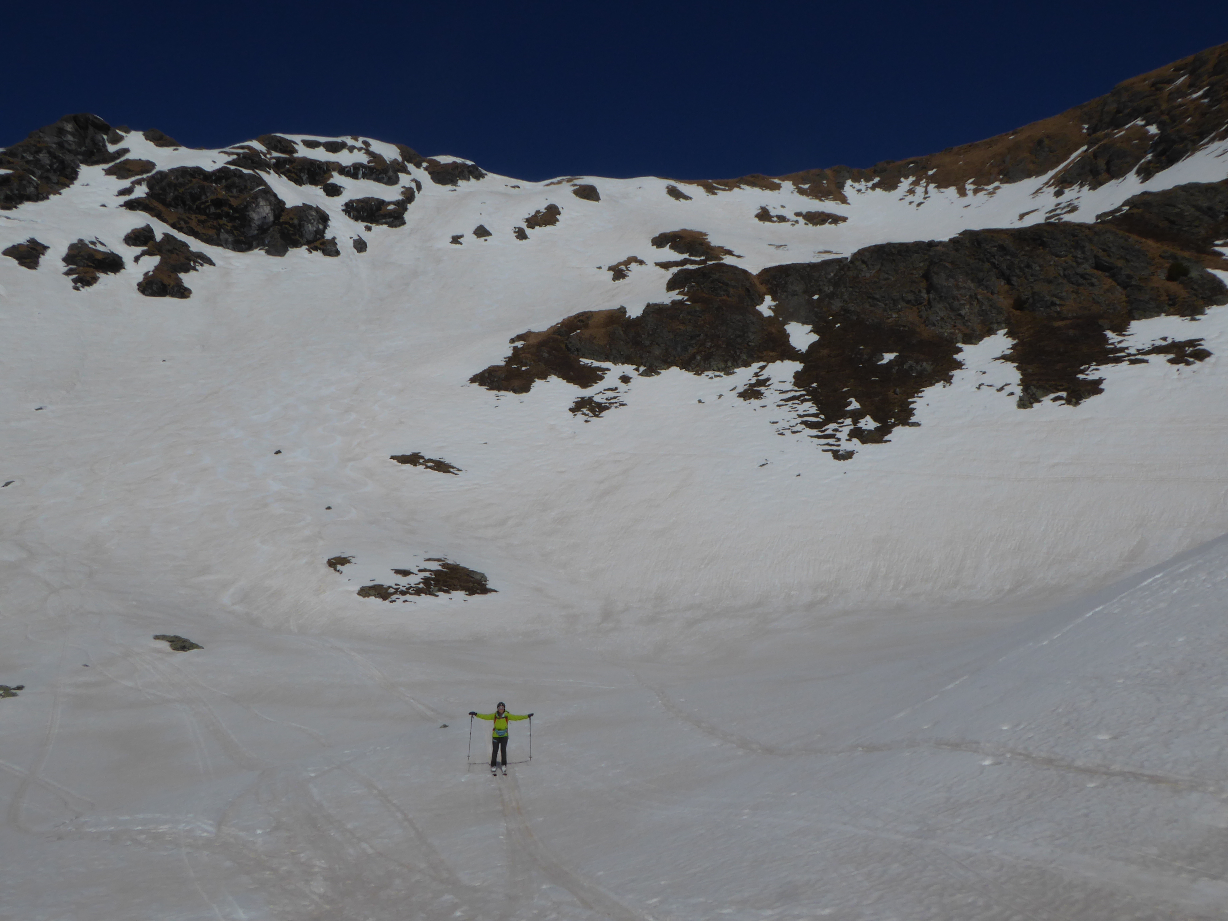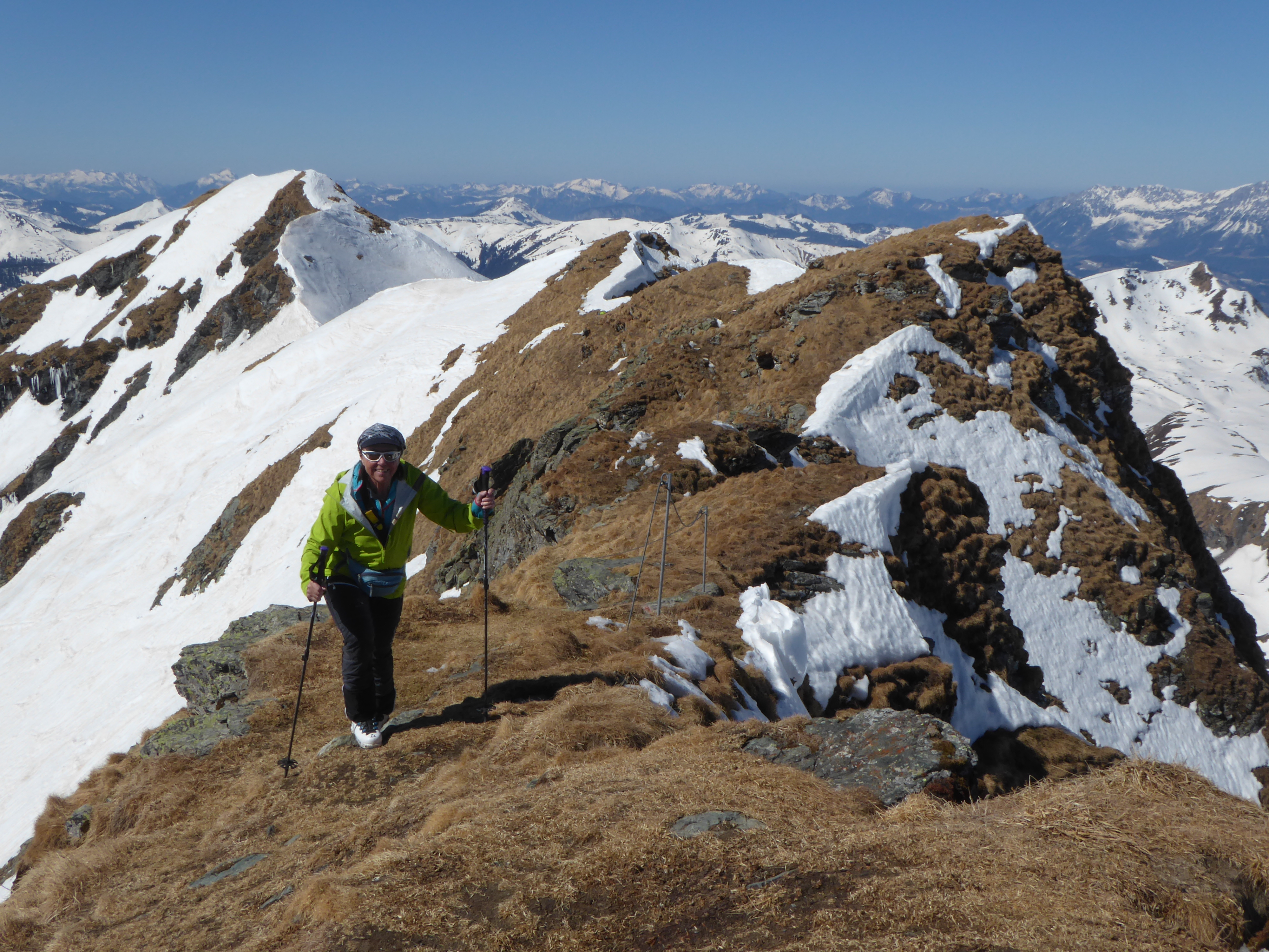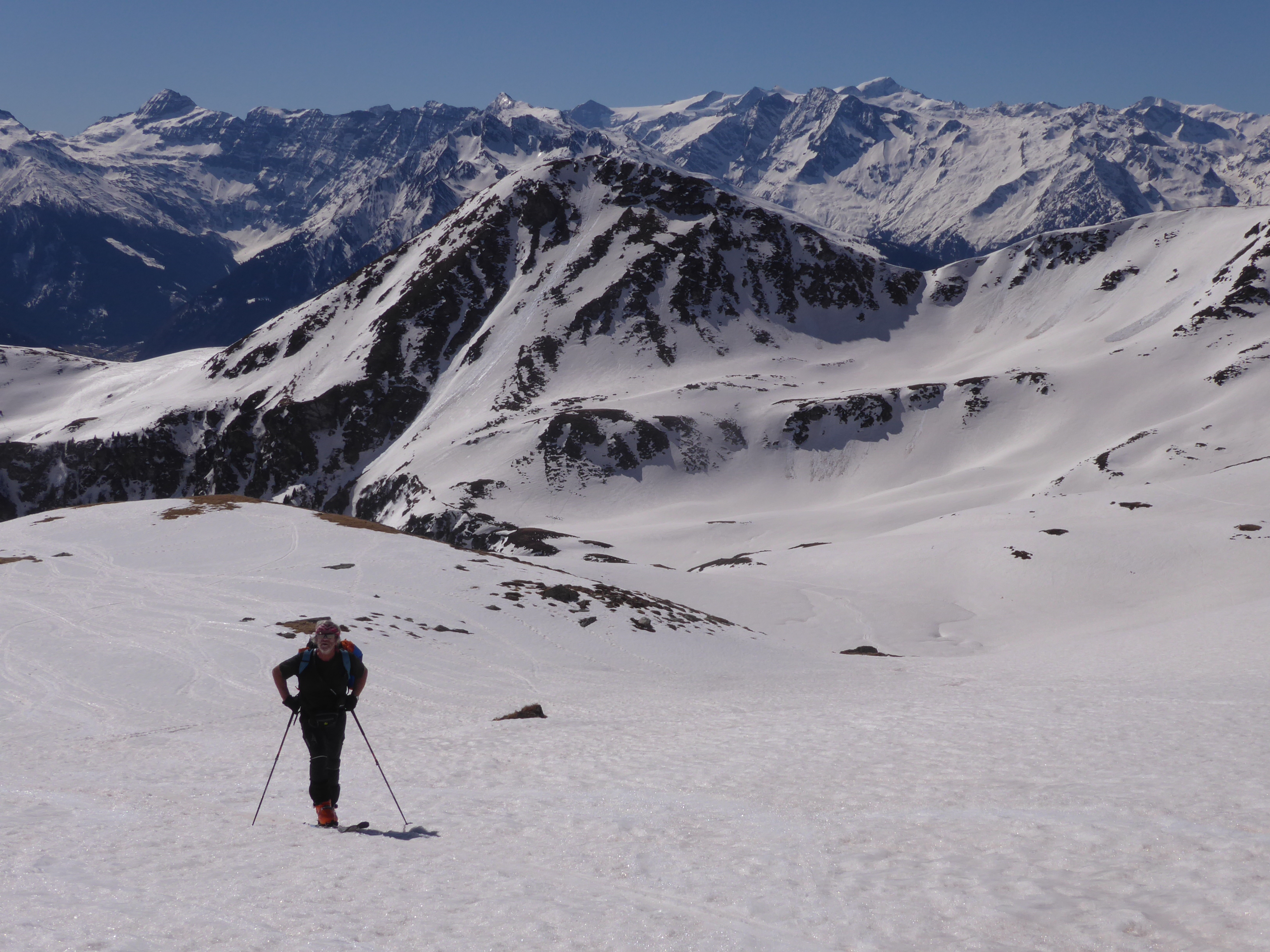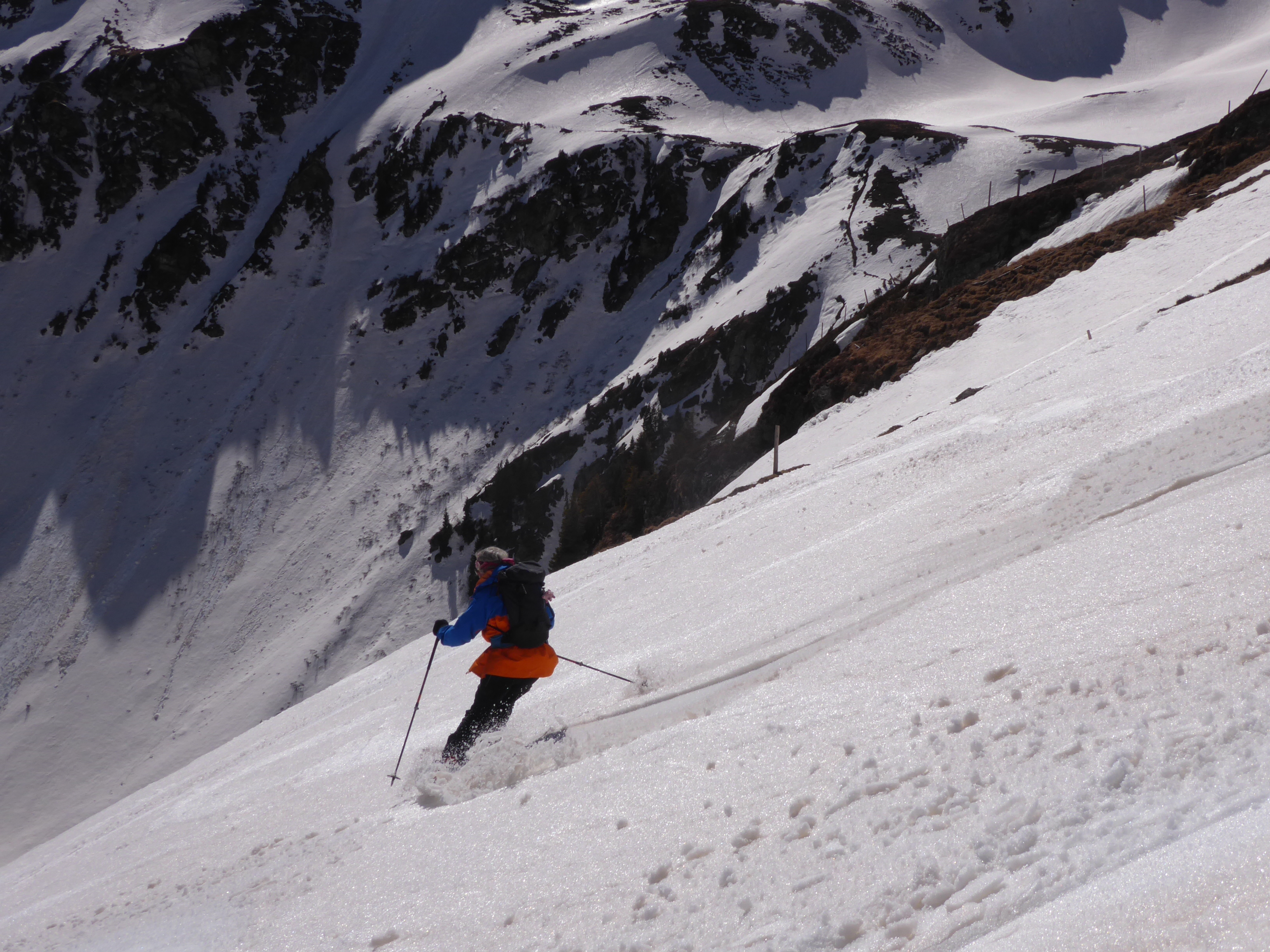 Wie gestern bester Firn mit großzügigem Zeitfenster. Der steile Ausstiegshang in recht gutmütigem Zustand, kein Eis, sehr gute Spur. Gipfelgrat aper und problemlos.