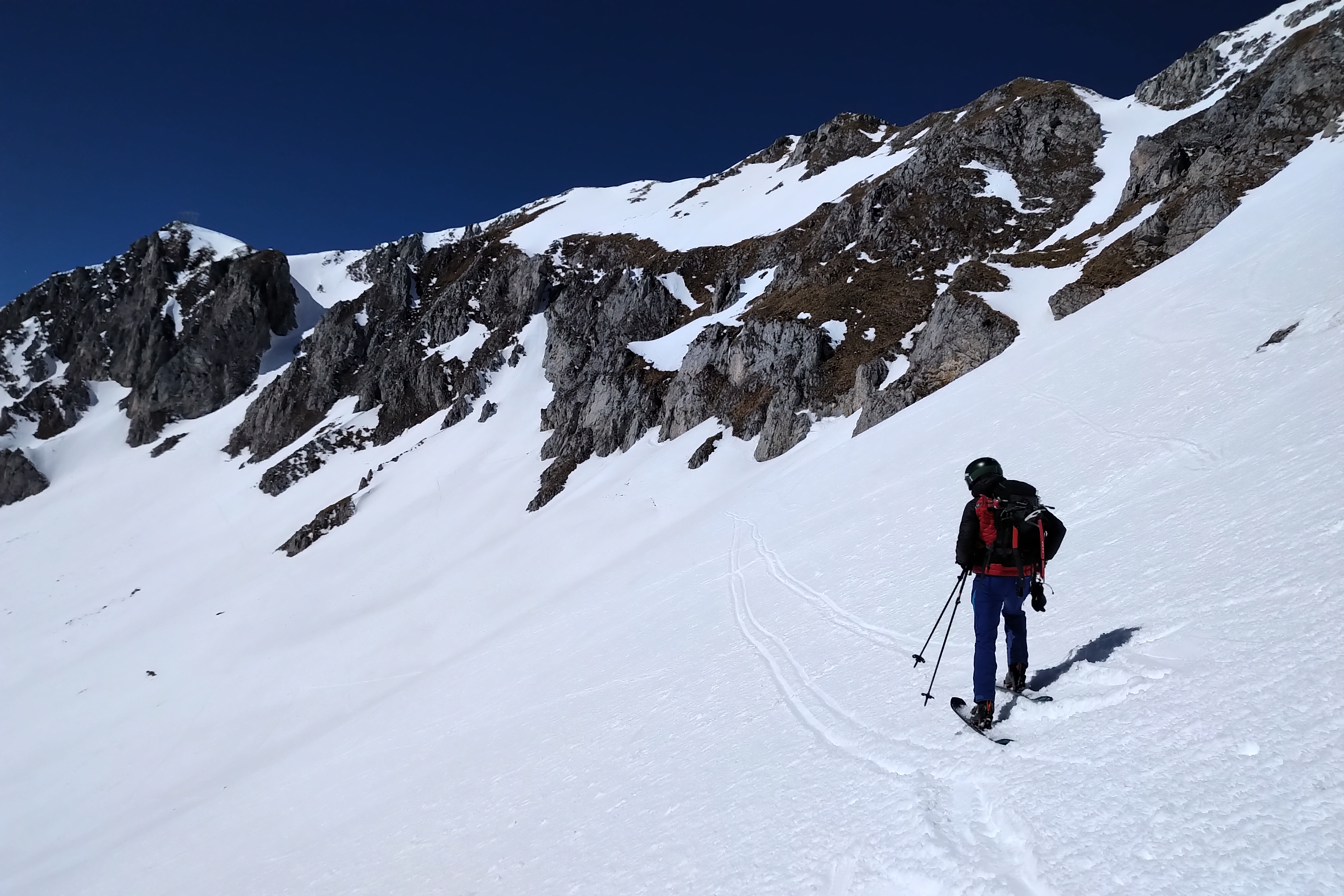 Von Parkplatz beim Lift ins Kar links vom Breitriegel und über die Hundsschupfenrinne aufs Plateau. Es gibt eine Engstelle im unteren Teil, die aber kein grosses Problem darstellt. Herrliche Abfahrt bis zum Parkplatz. Viele Tourengeher in der Schallerrinne und am Gipfel.