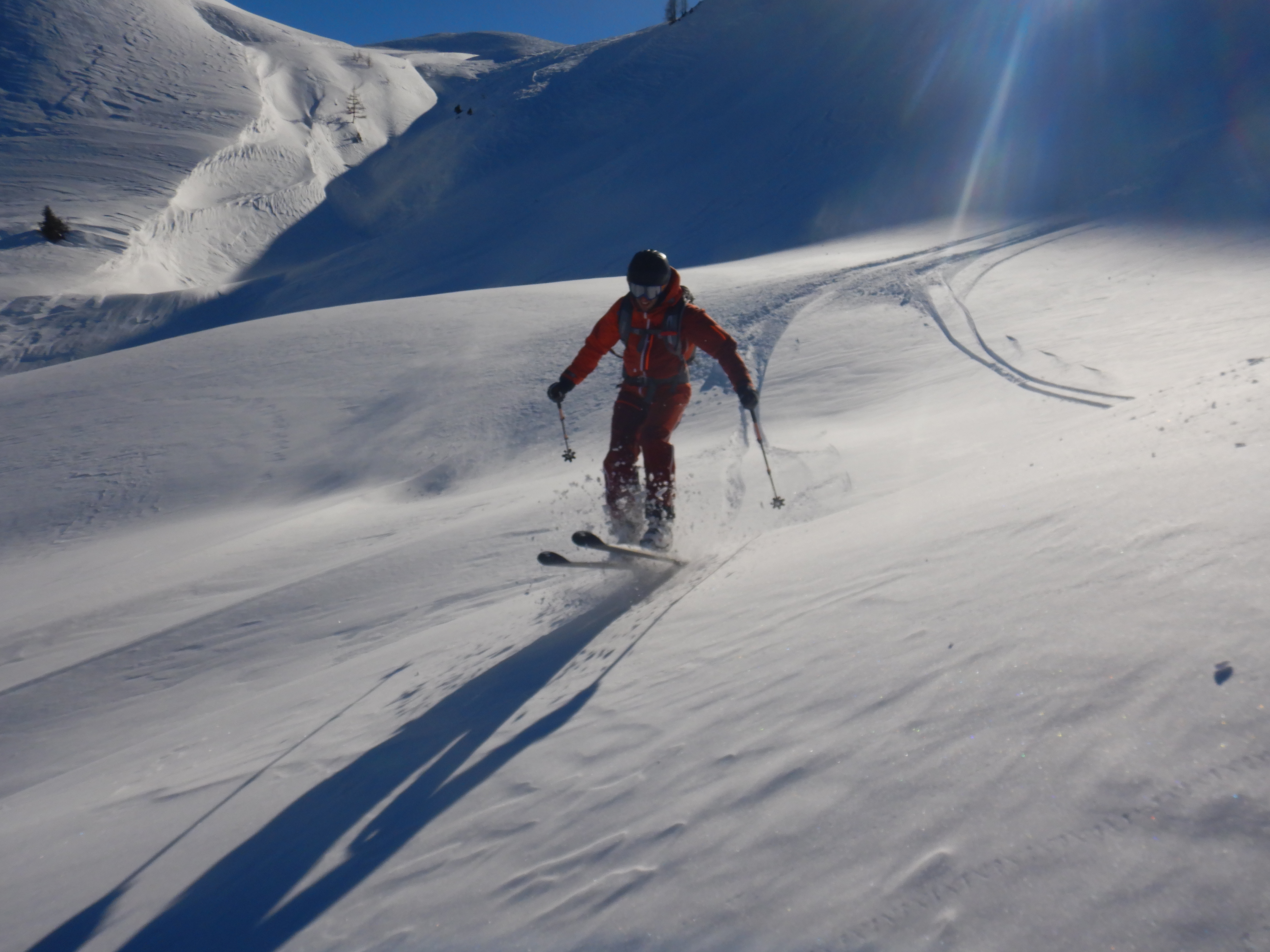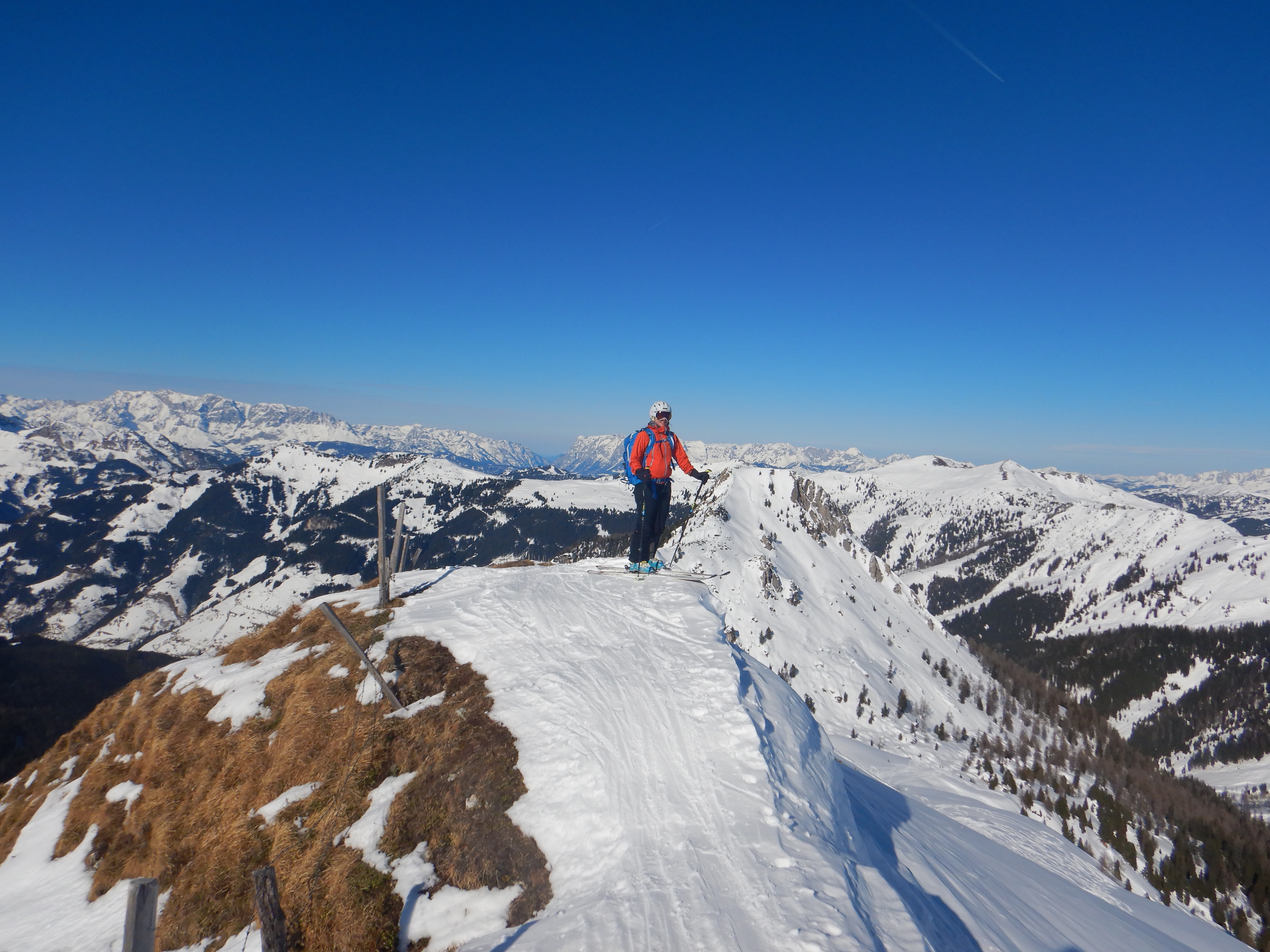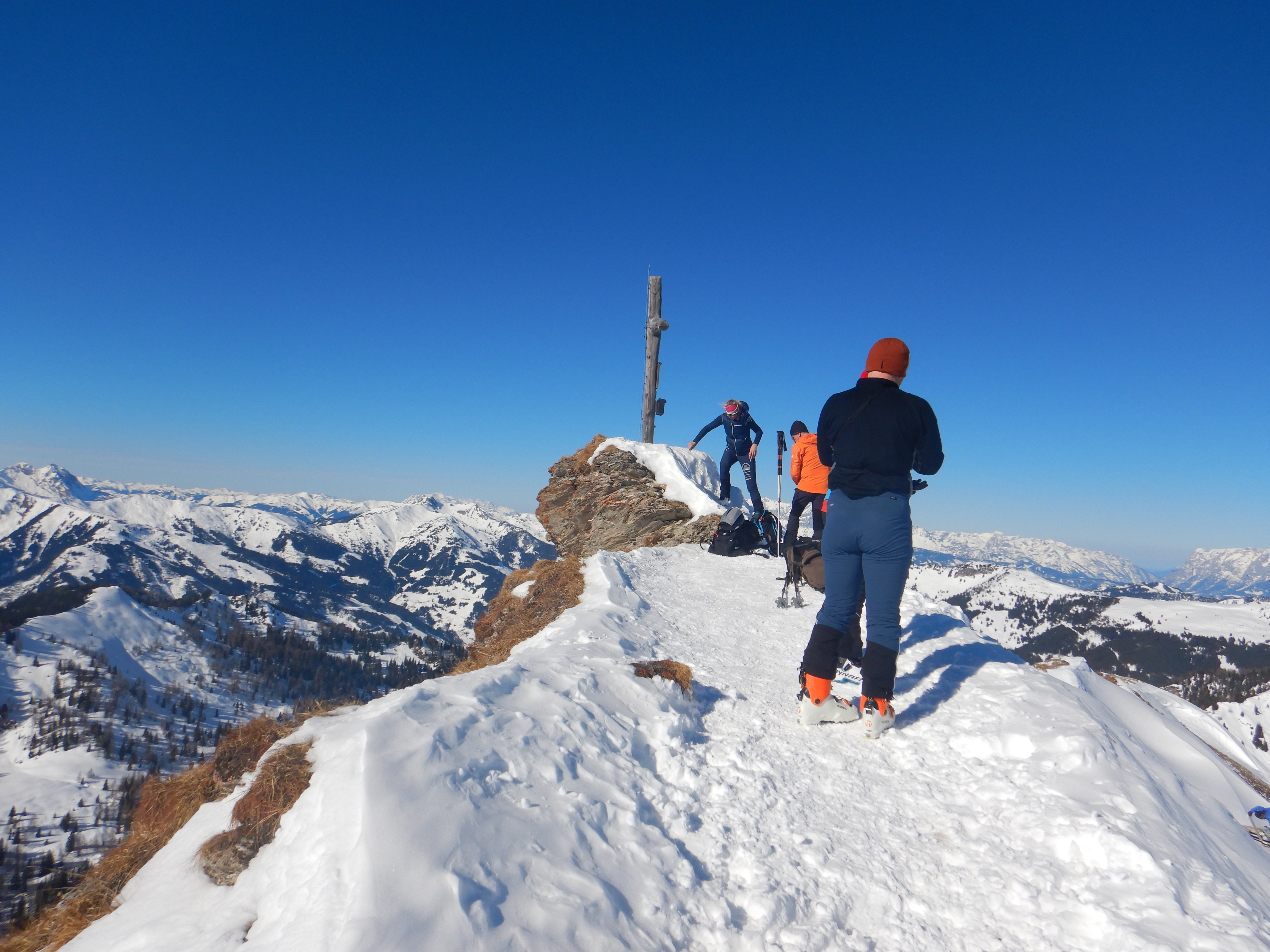 Viel Betrieb am Filzmooshörndl, aber gut verteilt, nur am Gipfelspitz etwas eng. Im Graben und schattseitig nach wie vor Pulver, die Hochfläche windgepresster Schnee oder hart gefroren. Aufstieg trotzdem ohne Harscheisen gut machbar. Abfahrt nordostseitig wunderbar, auch noch genug Fläche für eigene Schwünge vorhanden, nicht alles ist aber Pulver.
