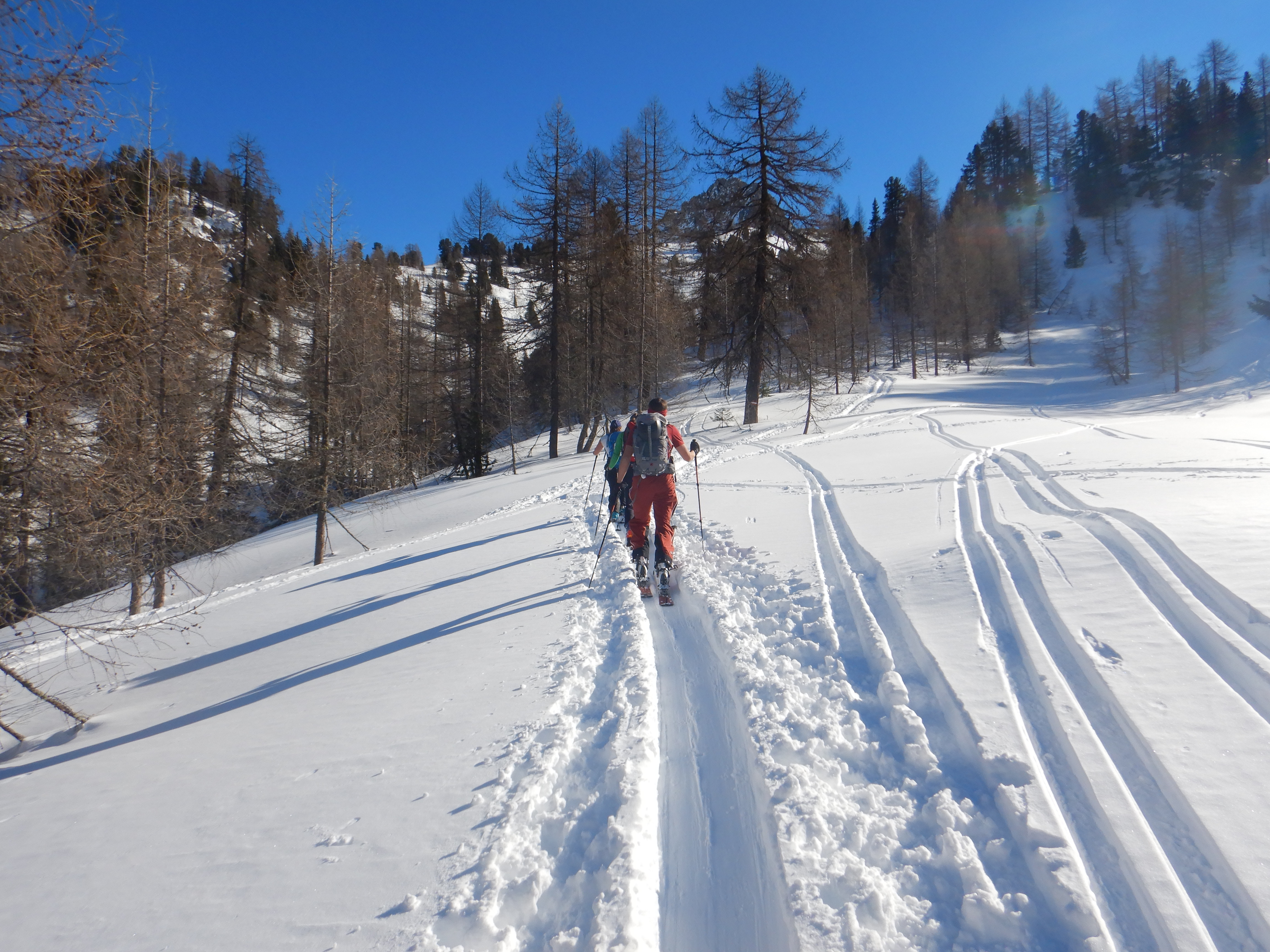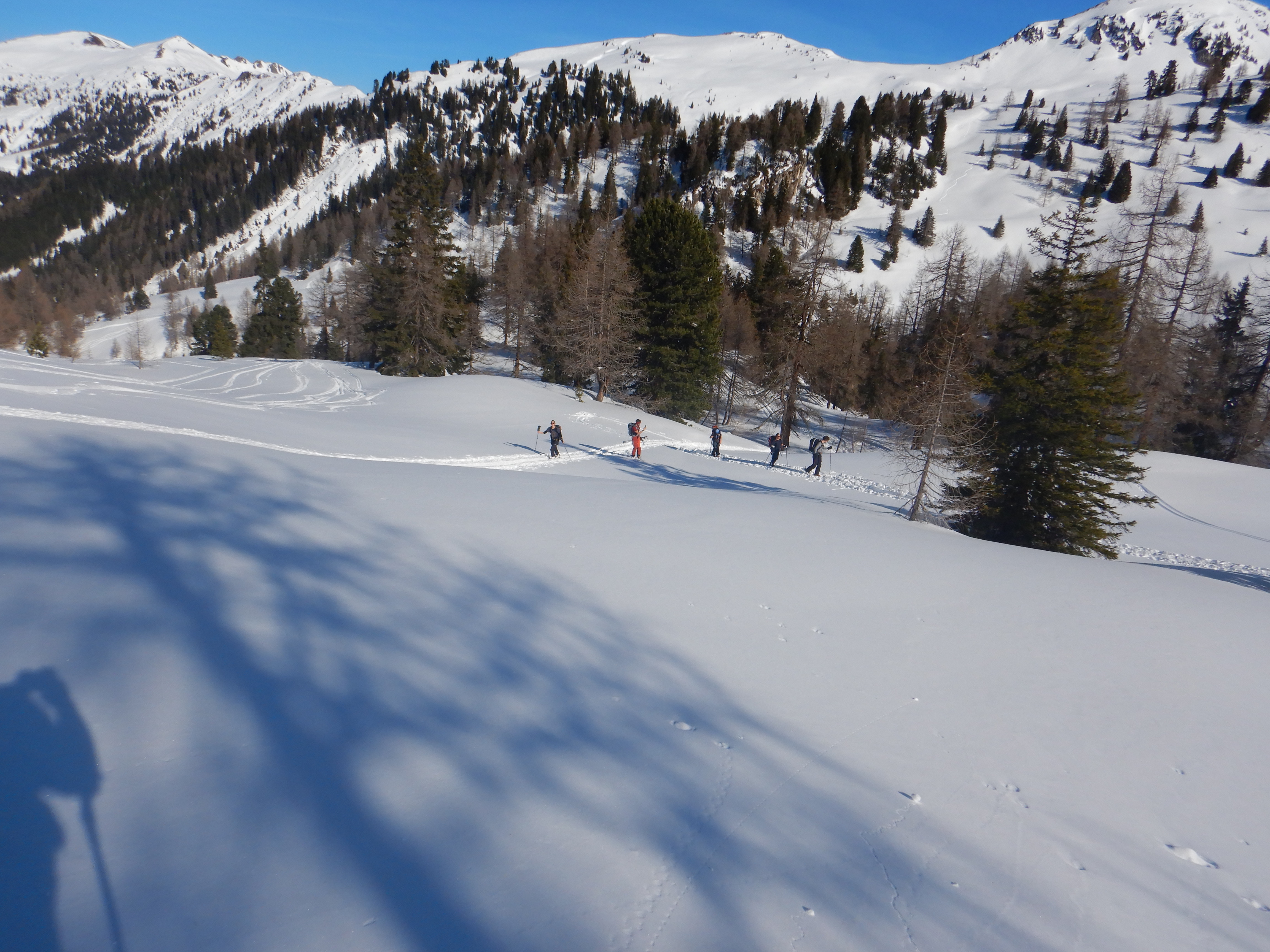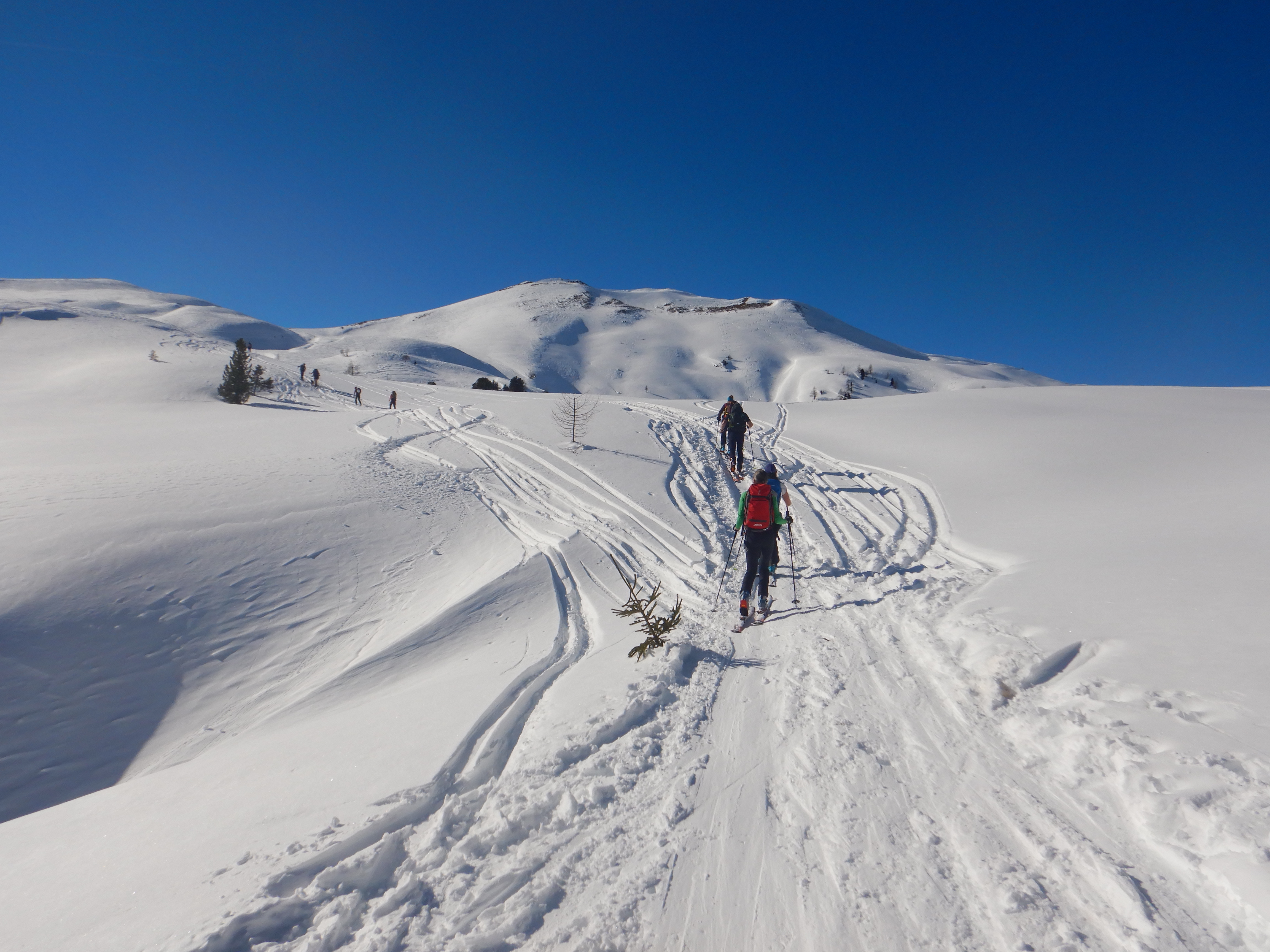 Viel Betrieb am Filzmooshörndl, aber gut verteilt, nur am Gipfelspitz etwas eng. Im Graben und schattseitig nach wie vor Pulver, die Hochfläche windgepresster Schnee oder hart gefroren. Aufstieg trotzdem ohne Harscheisen gut machbar. Abfahrt nordostseitig wunderbar, auch noch genug Fläche für eigene Schwünge vorhanden, nicht alles ist aber Pulver.