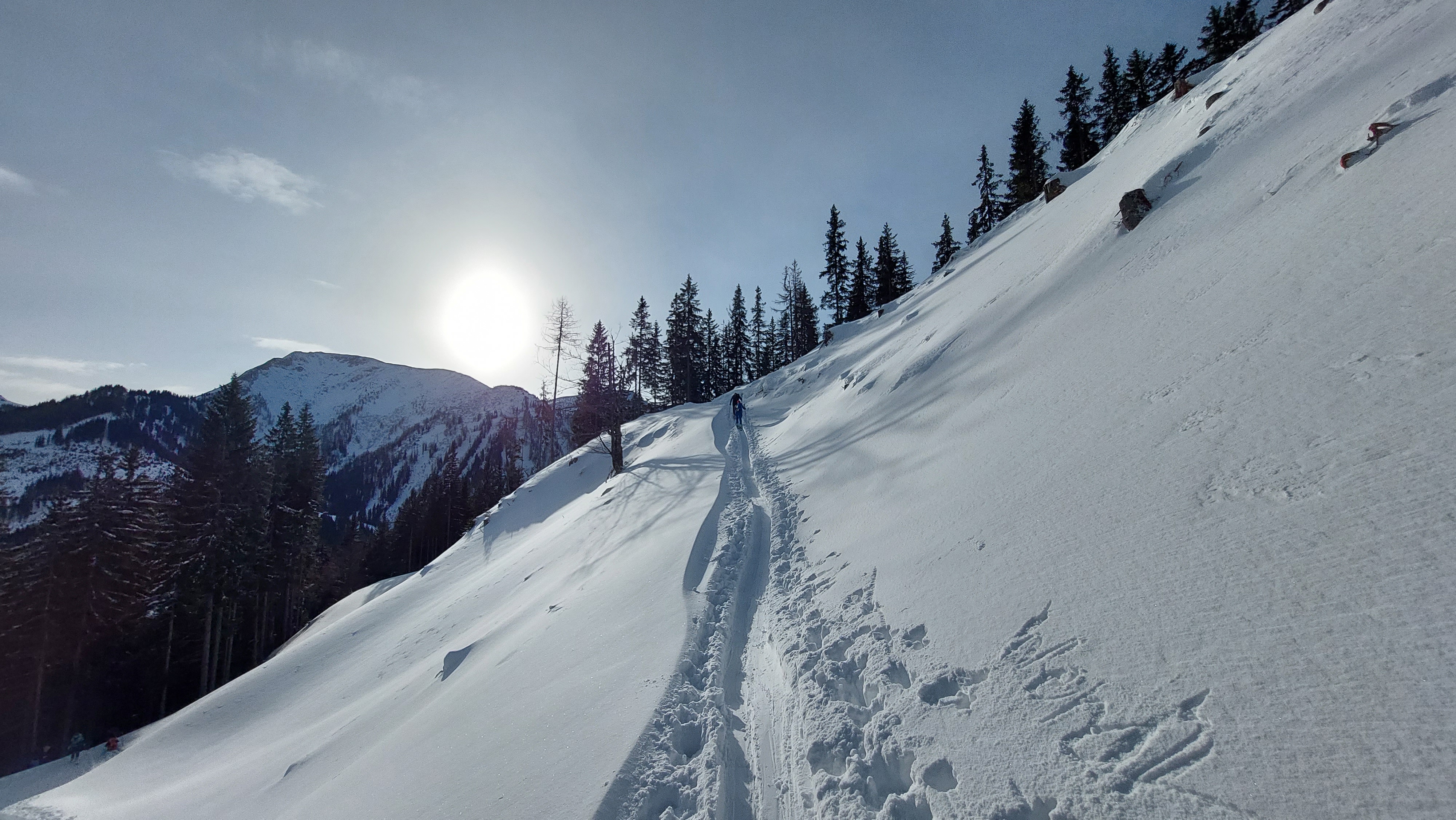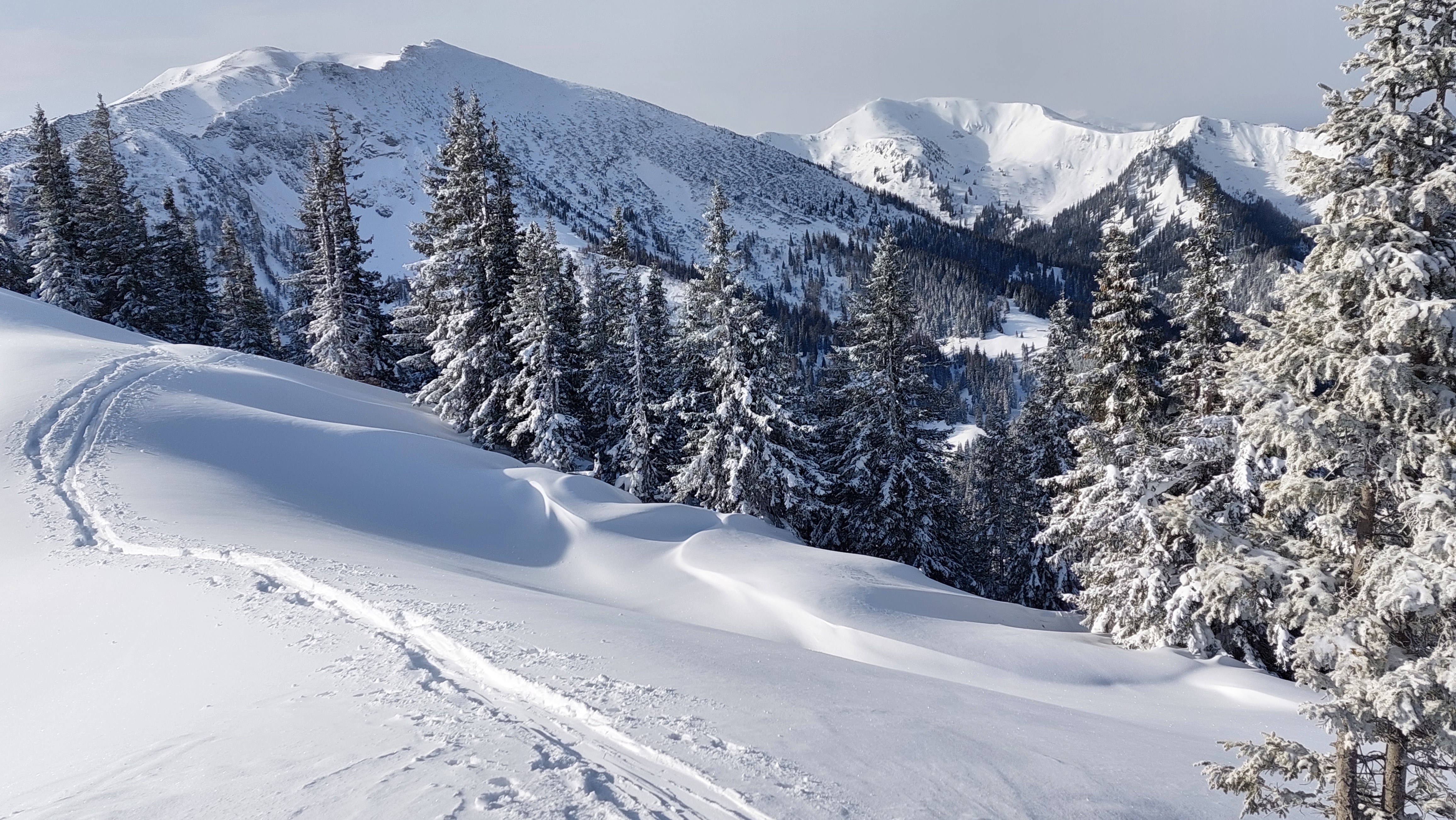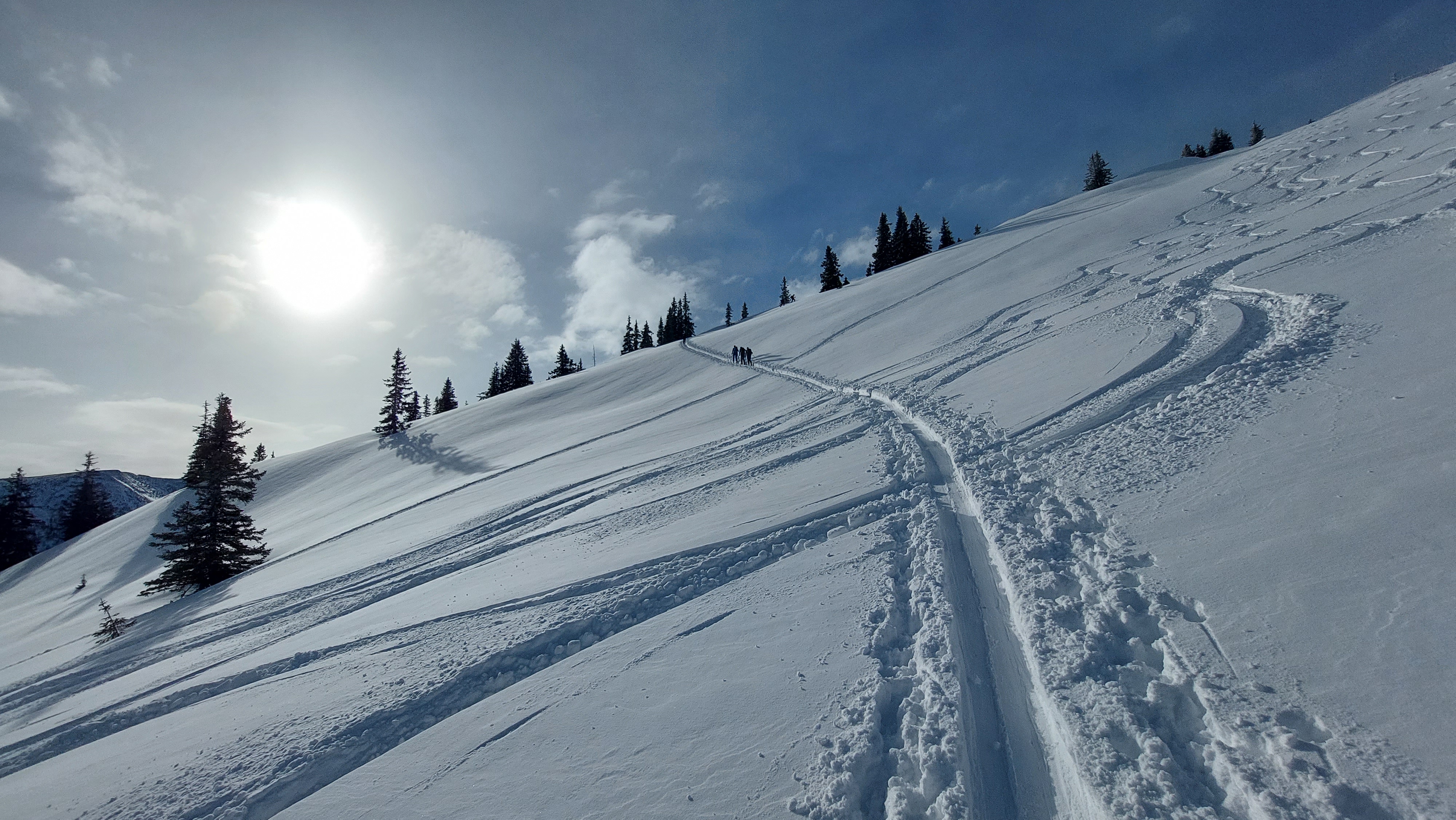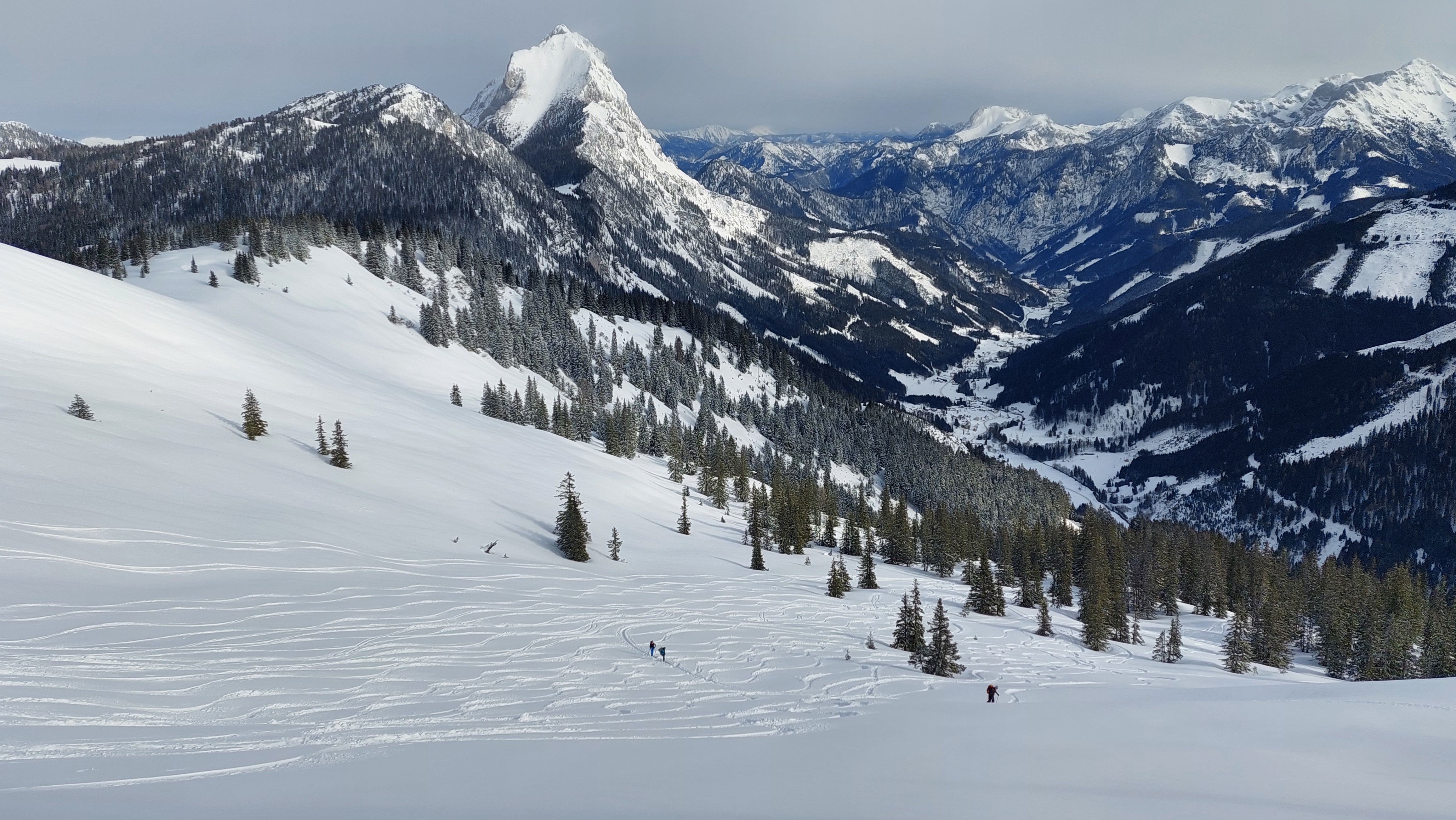 Unerwartet schönes Wetter heute und kaum windig. Aufstieg von Radmer, starke Einwehungen hinter Kämmen und Waldrändern. Wir waren beim ersten Mal relativ zeitig oben, nach uns viele Leute sowohl von Radmer als auch von Johnsbach. Abfahrt nach Westen und Wiederaufstieg, beim zweitenmal halb Wien am Gipfel versammelt. Von Westen zog über den Reichenstein bereits die Sturmfront heran, daher hielten wir uns nicht auf, wir habens gern gemütlich. So wie bei der Westabfahrt auch auf der Radmerseite guter, bereits etwas schwerer Pulver, in den oberen beiden Dritteln sehr schön zu fahren. Im unteren Drittel achtsame Fahrweise nötig, zwar ausreichend Schnee, aber stellenweise keine Unterlage. Anfänger sollten besser die Forststrasse nutzen.