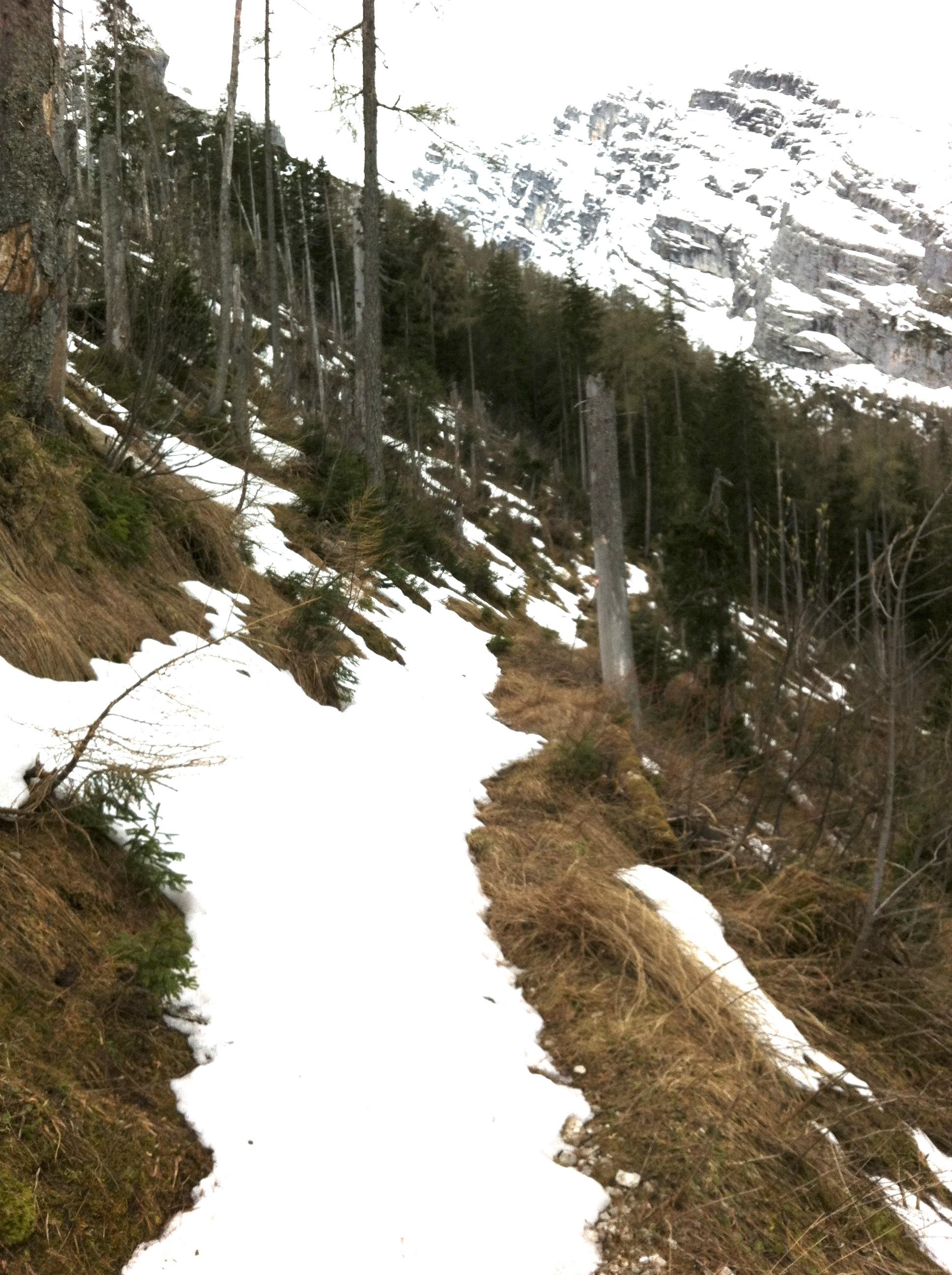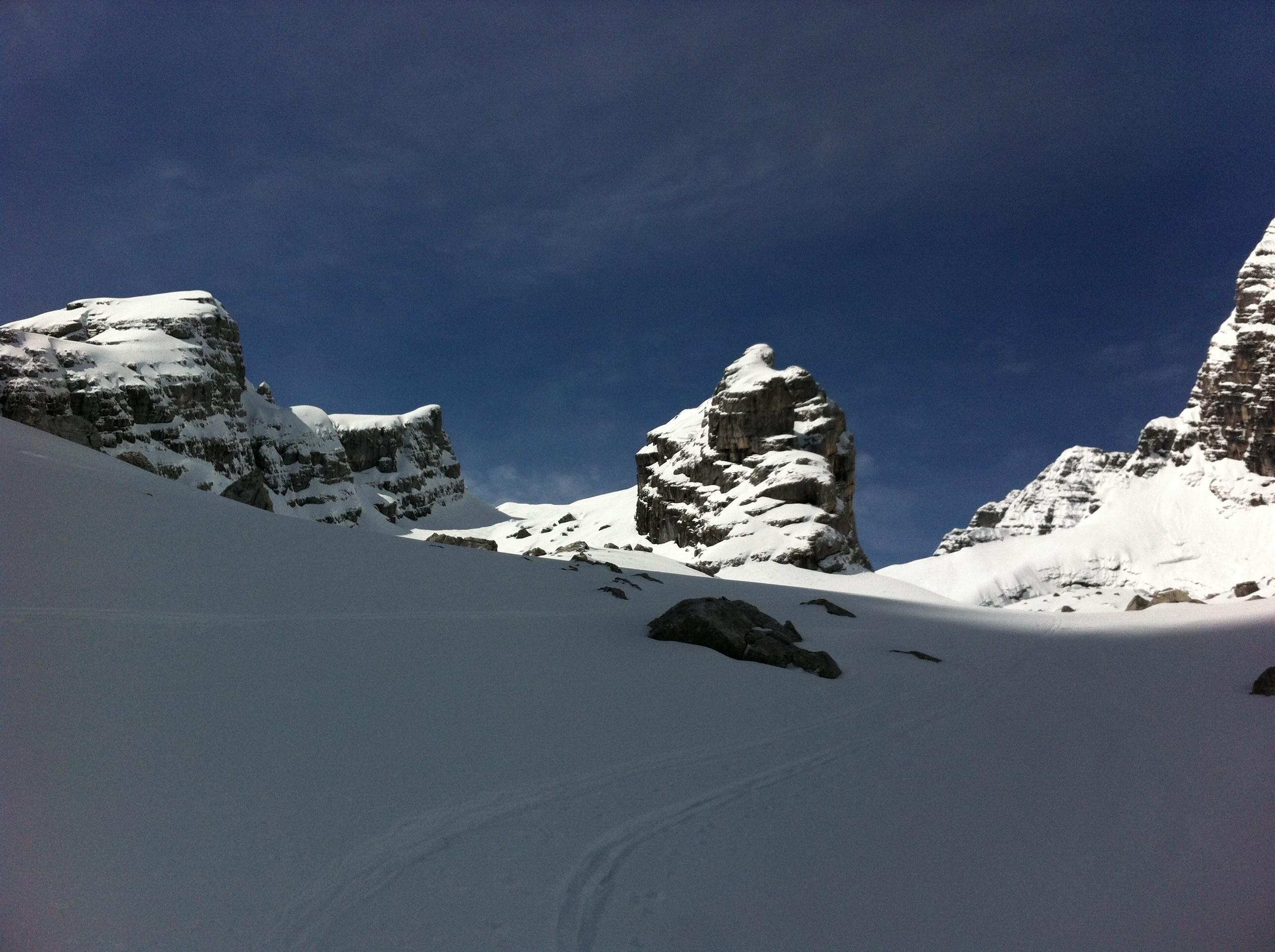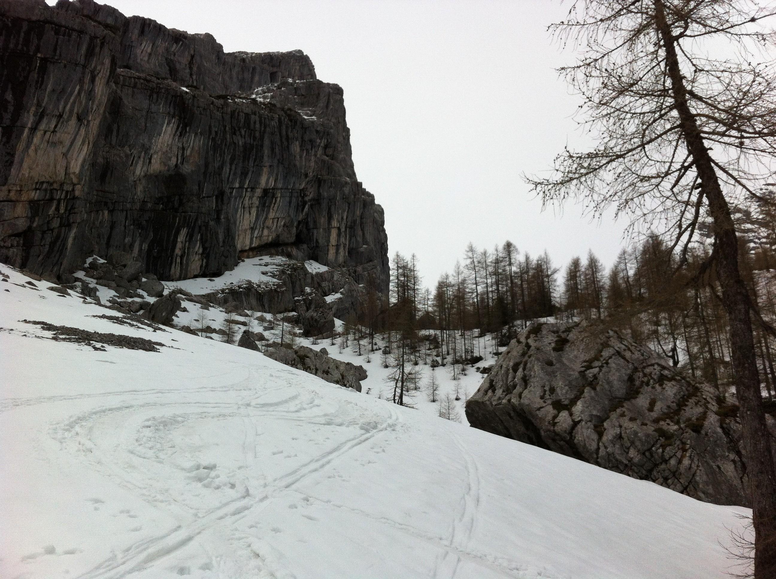 Endlich im Watzmannkar! Mit dem e-Radl auf Kührointh. Dort beginnt der Schnee. Ganz gut zu fahren, oben feuchter Pulver unten gesetzter Neuschnee und endlich schönes Wetter (für einen Tag).