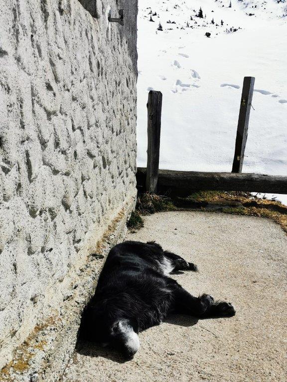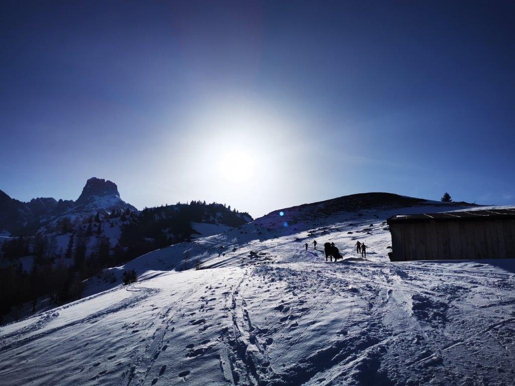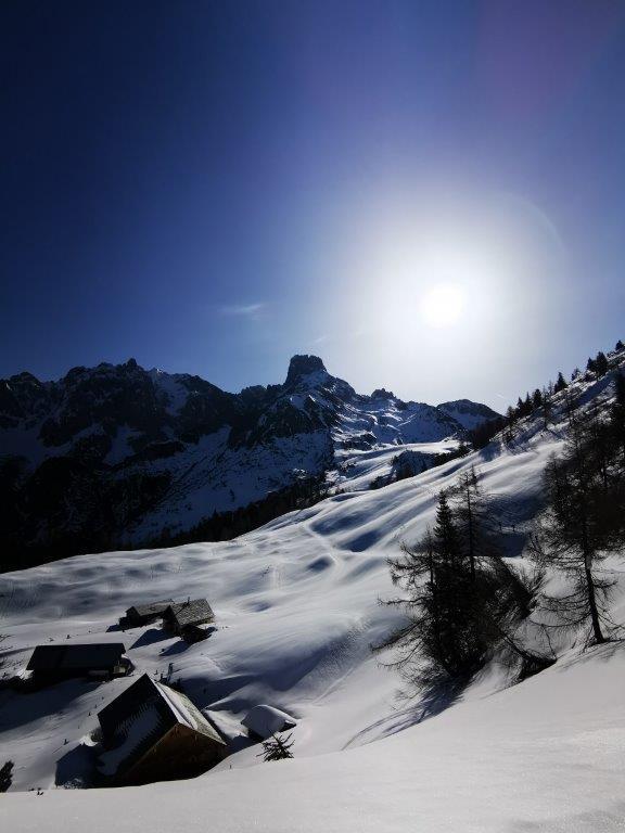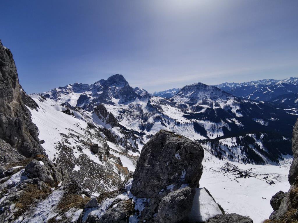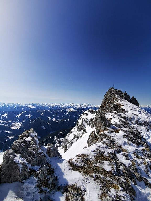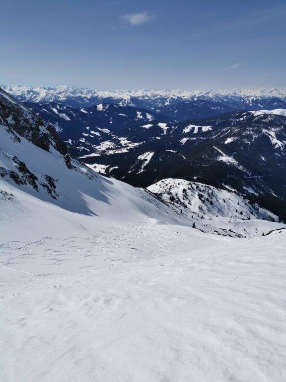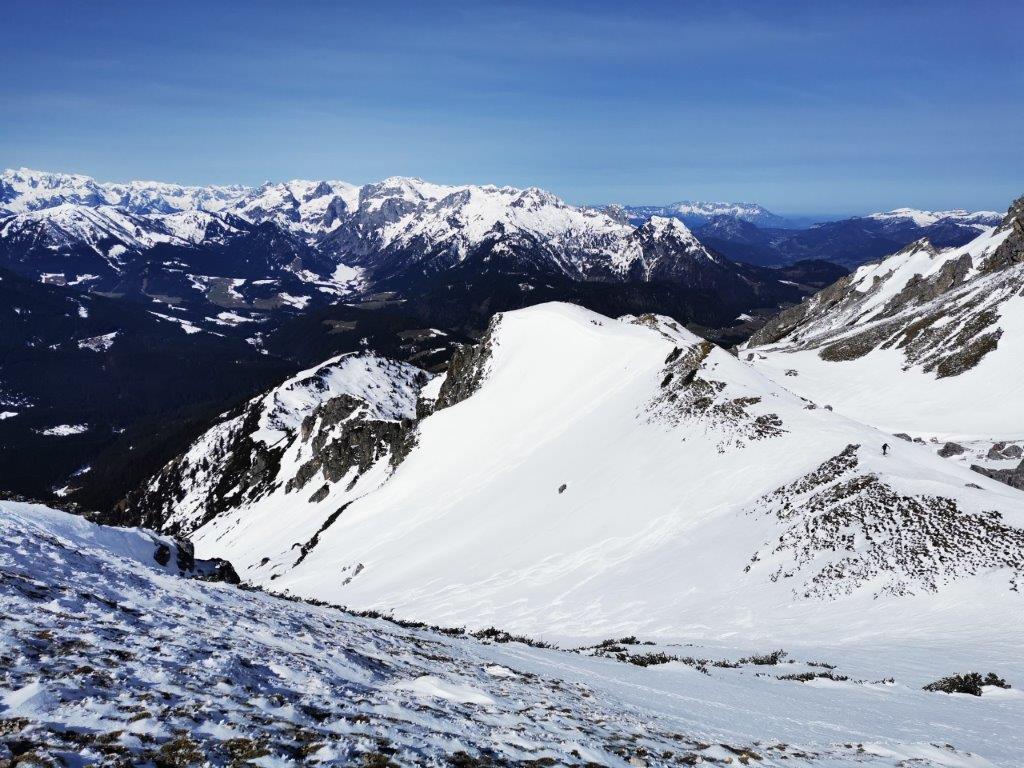 Mit zwei kurzen Unterbrechungen ging der Aufstieg noch vom Parkplatz weg. Wir nehmen die Variante über die Loseggalmen und umgehen den Mahdriedel auf der linken Seite. Der Blick auf den Gosaukamm, die schroffen Berggipfel, die verschneiten Almen und die einladenden Hänge ist einfach wunderbar. We are back in Winter !!!! Stellenweise ist es ganz schön hart zum Gehen, aber trotzdem ohne Harscheisen bis zum Gipfel möglich.