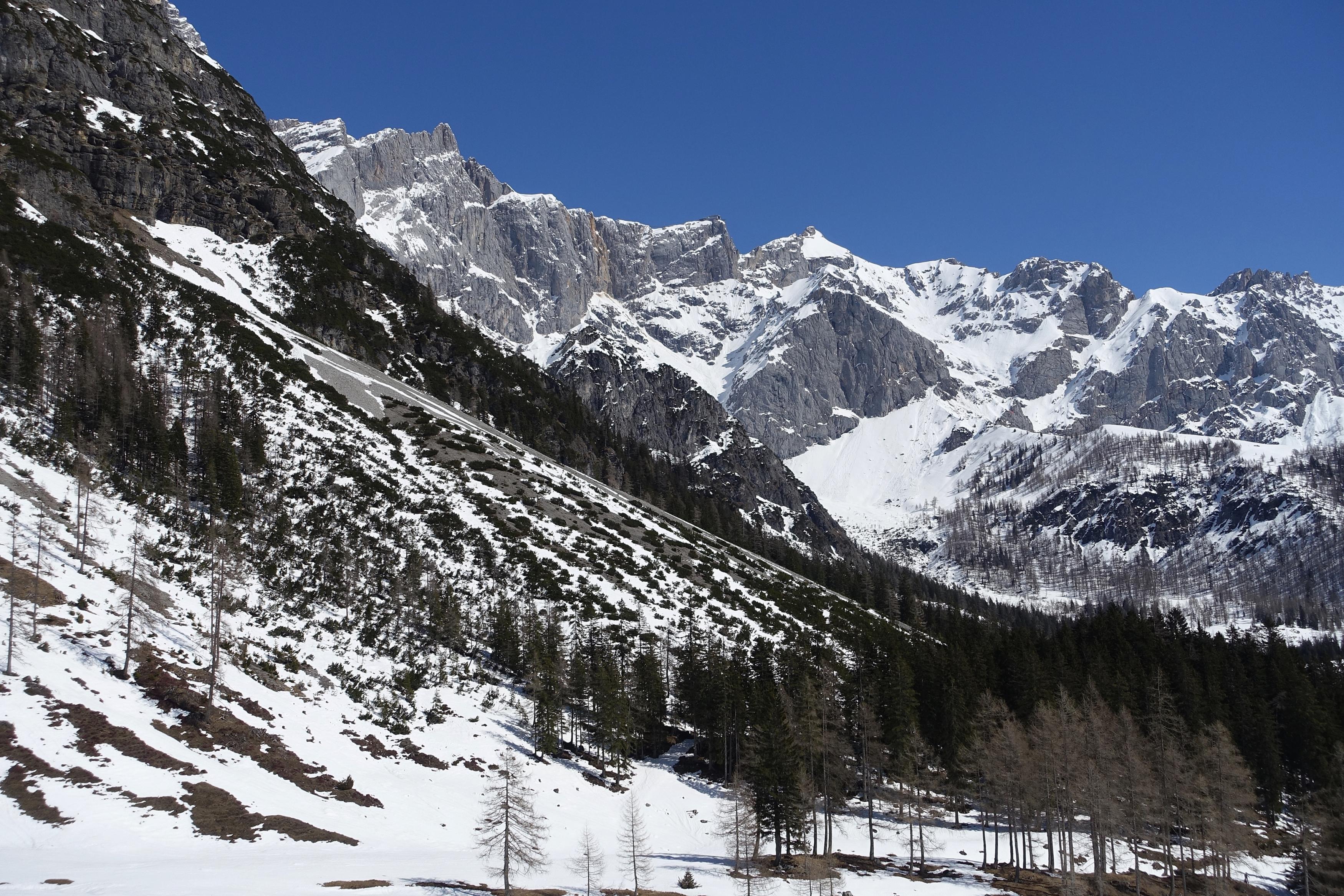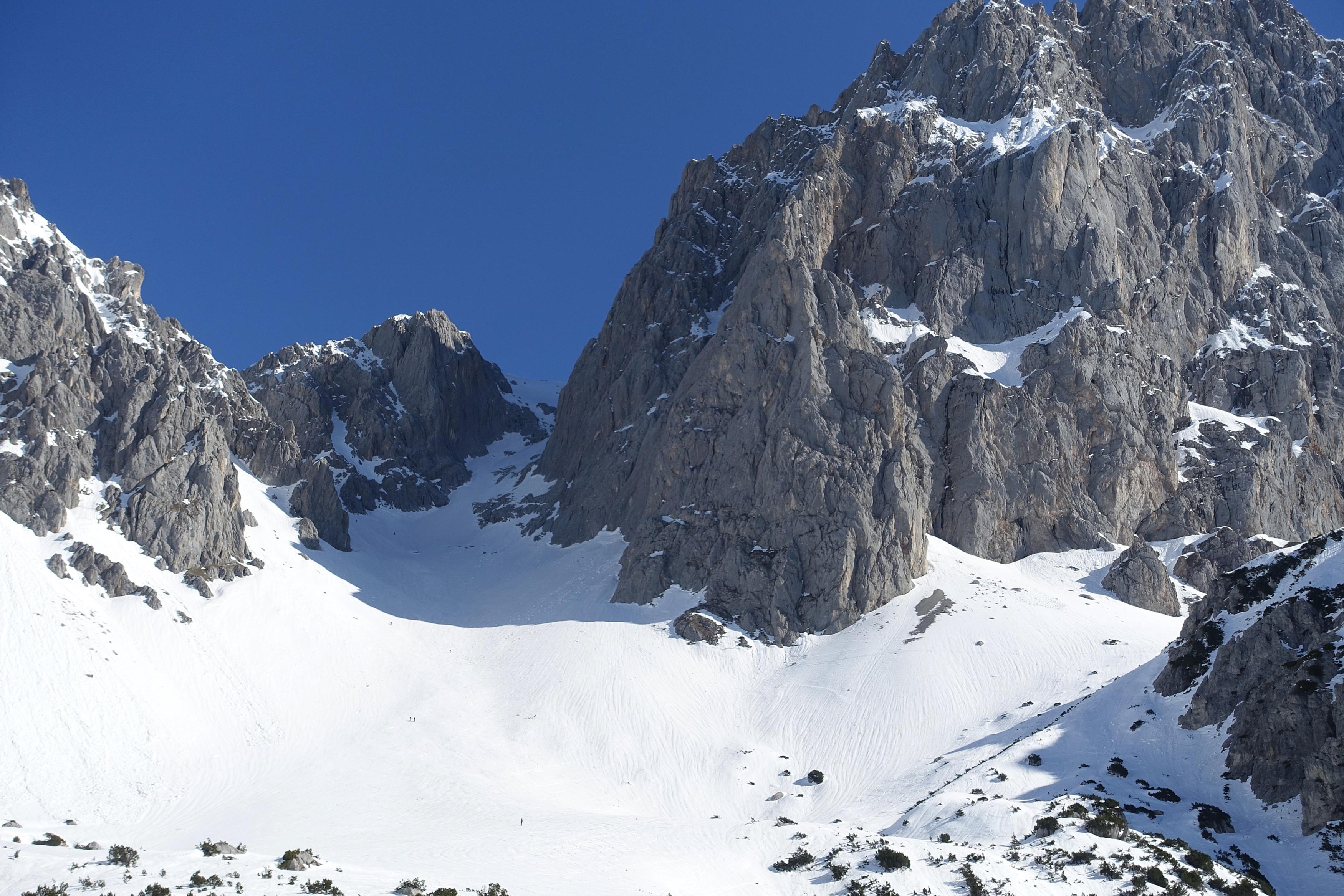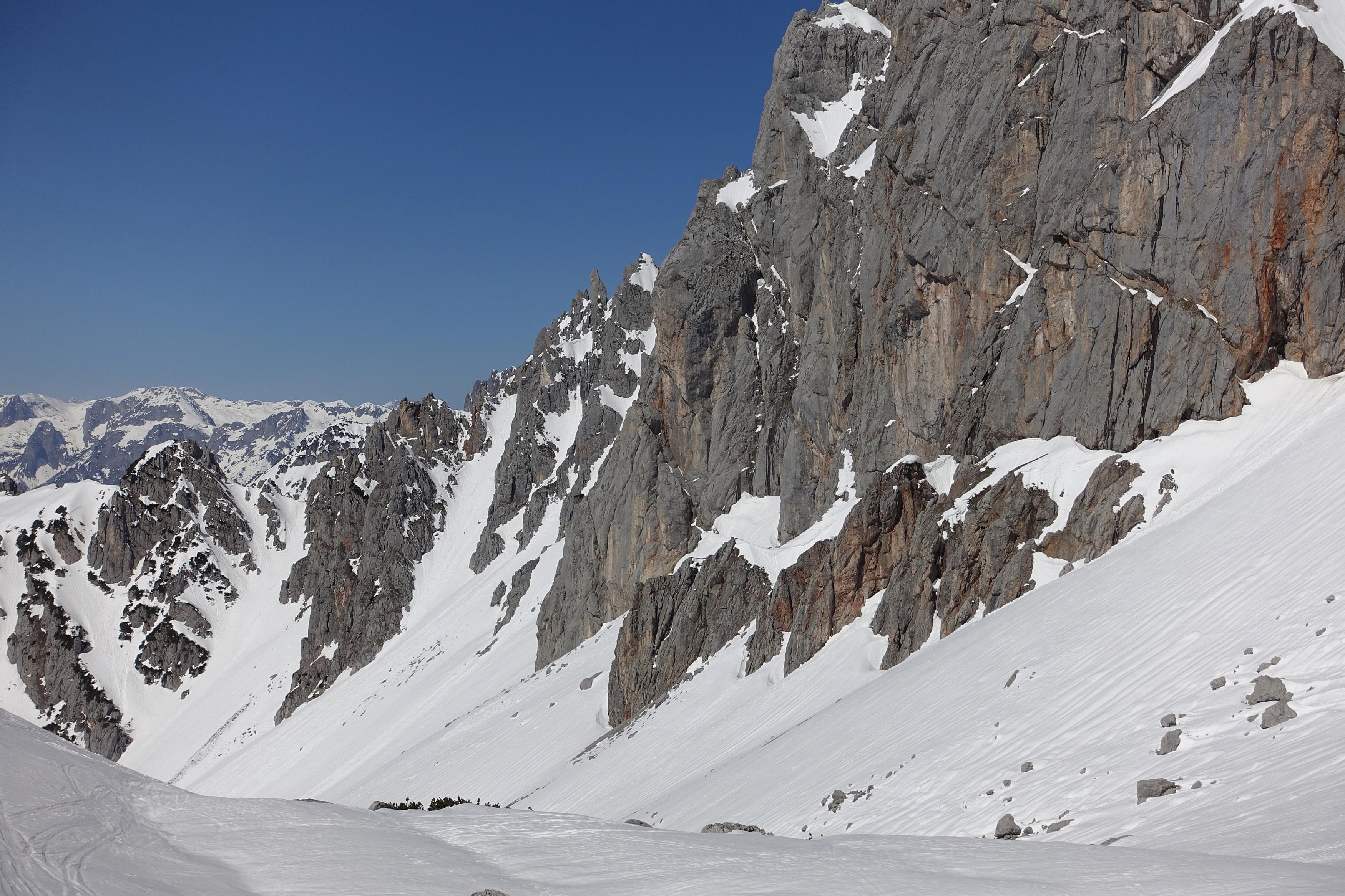 Um 7.45 Uhr der Parkplatz schon mehr als überfüllt, gerade noch gegenüber bei der Einfahrt zu einem Holzlagerplatz eine Lücke ergattert. Haben uns im Schnittlauchmoosboden aufgrund der vielen Leute im Windlegerkar (wurde auch durchstiegen) für das Tor/Rauchkar entschieden. Viel einsamer, nur einige wenige Tourengeher unterwegs.