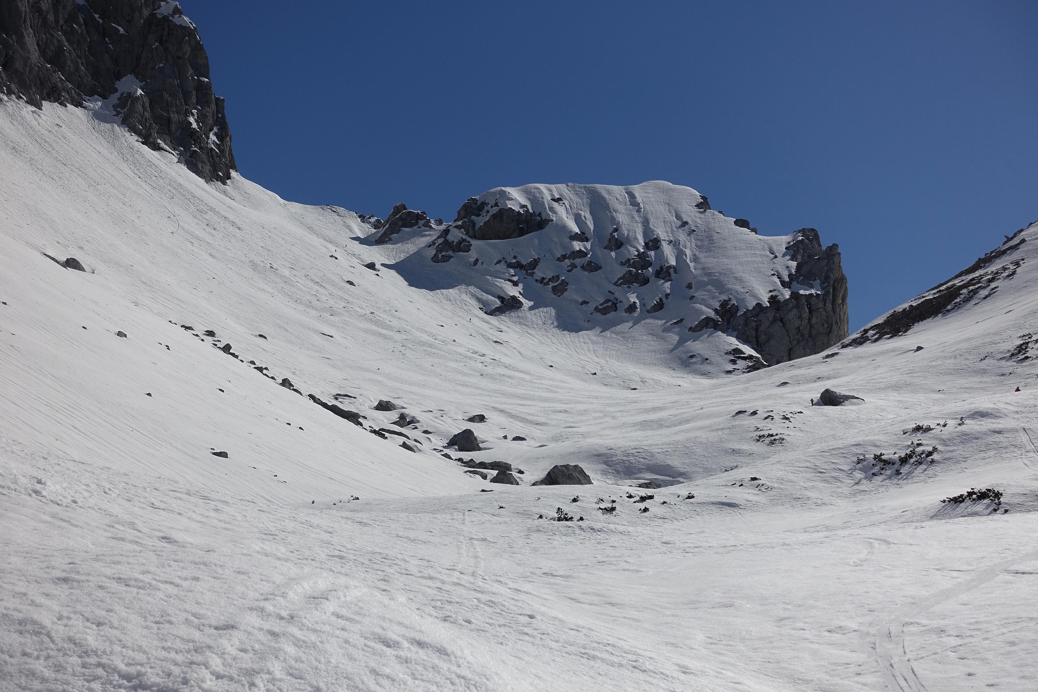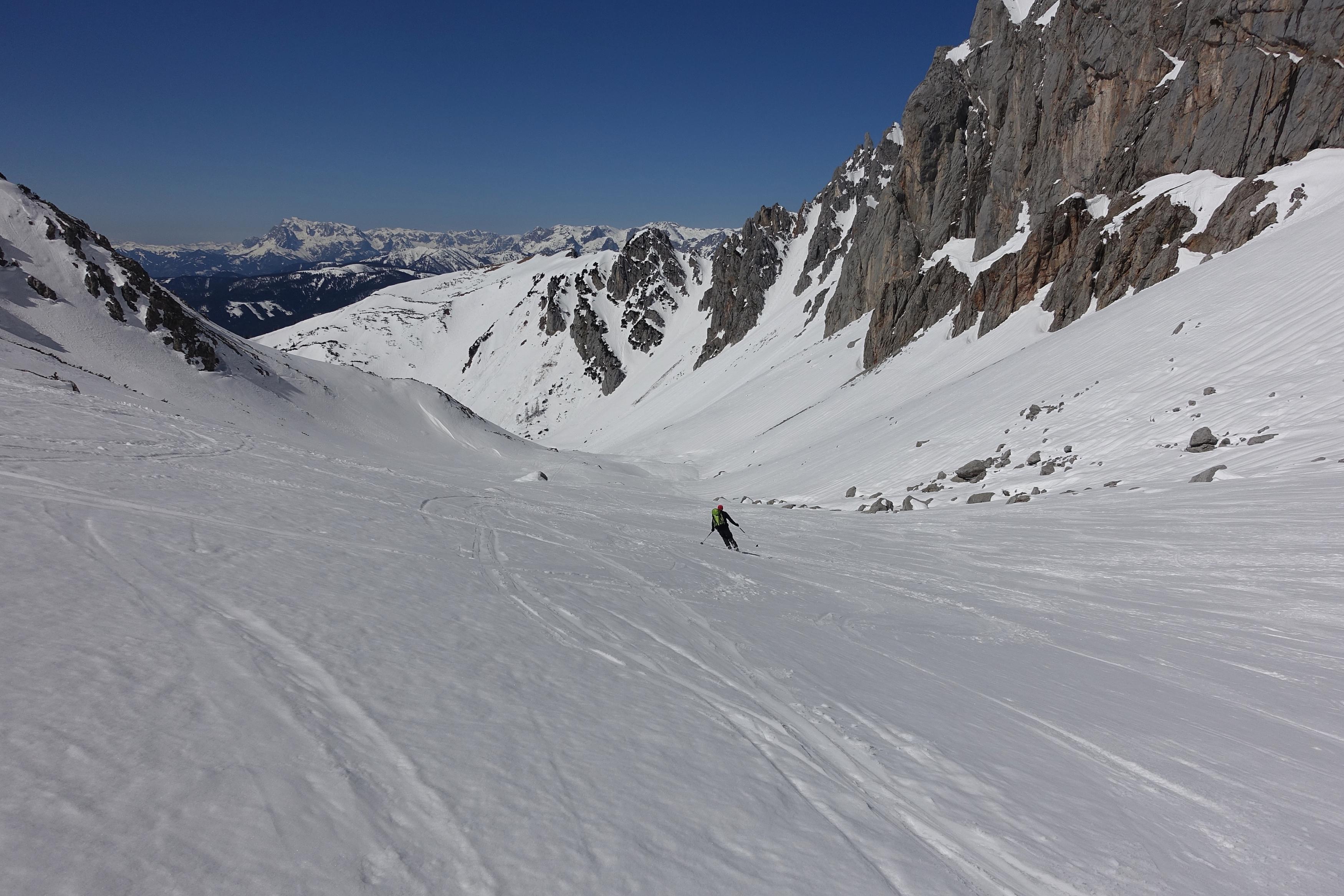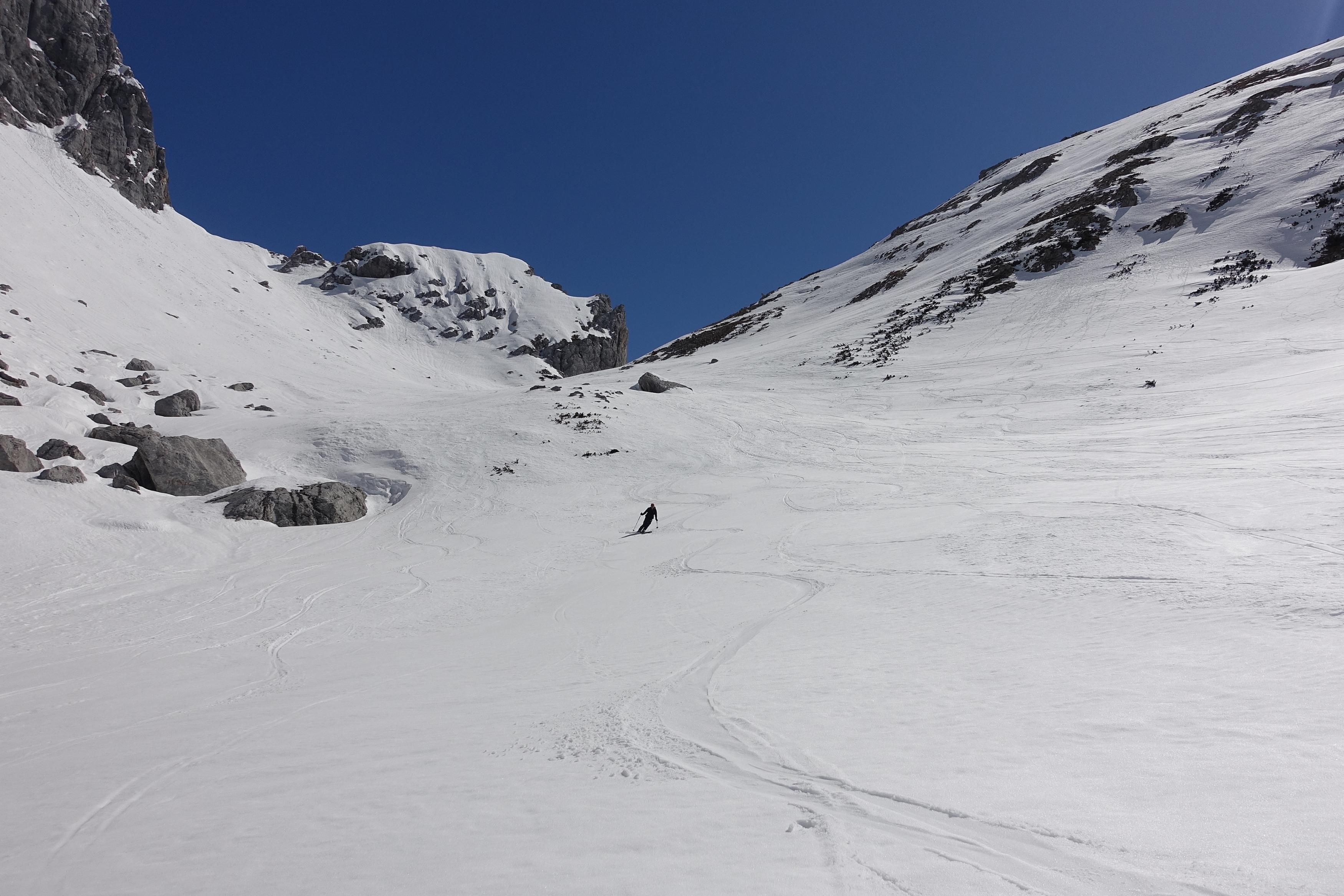 Bedingungen: Einwandfrei, aus der Torsteinsüdwand keine Entladungen, alles ohne Harscheisen machbar, Abfahrt um 11.45 Uhr bei feinstem Schmierfirn von Oben bis unterm Schnittlauchmoosboden, dann ein kurzes Stück etwas tiefer aber nicht grundlos, die Straße runter ist gut und fest eingefahren, allerdings ist schon 4 Mal zum abschnallen.