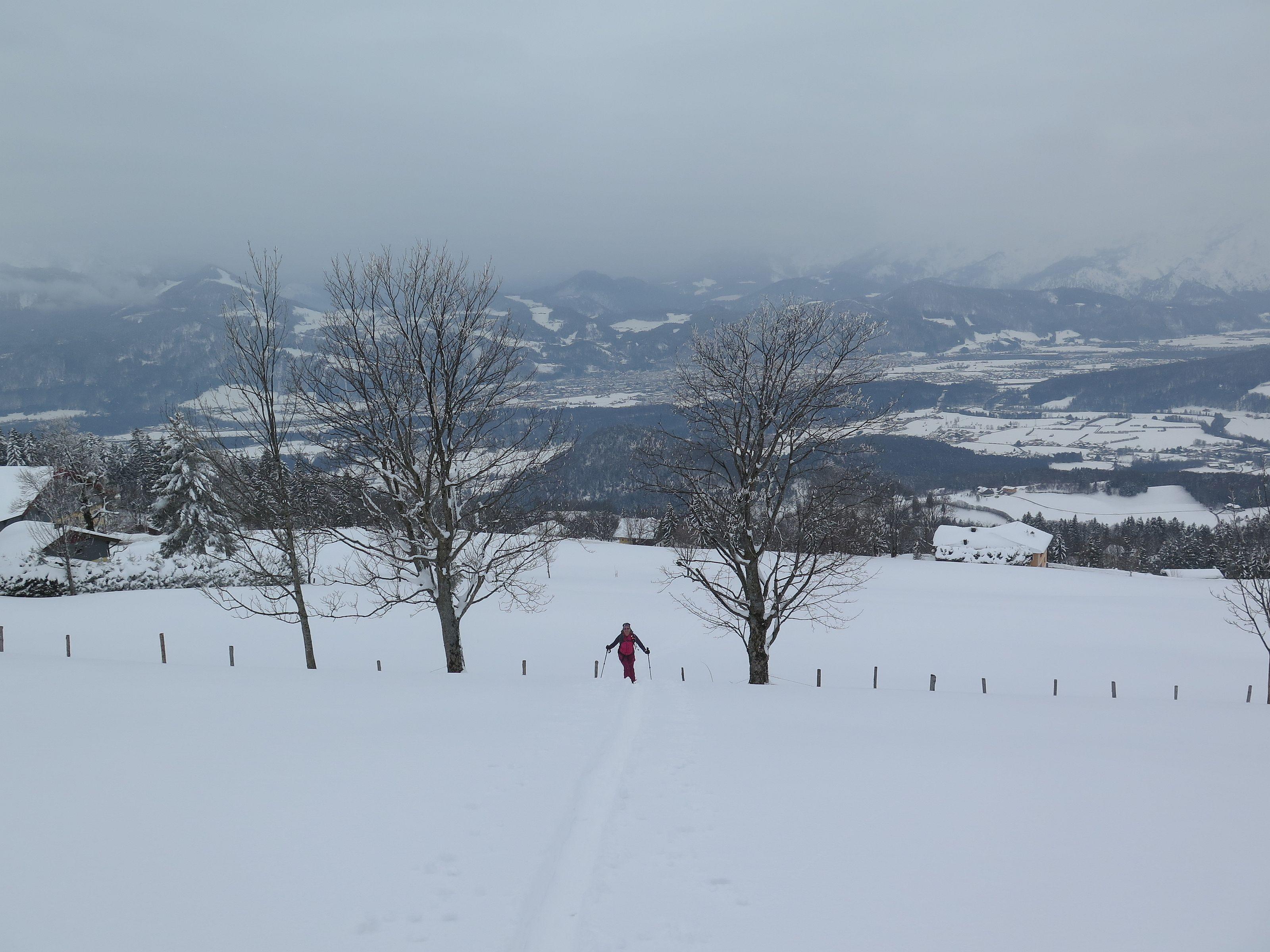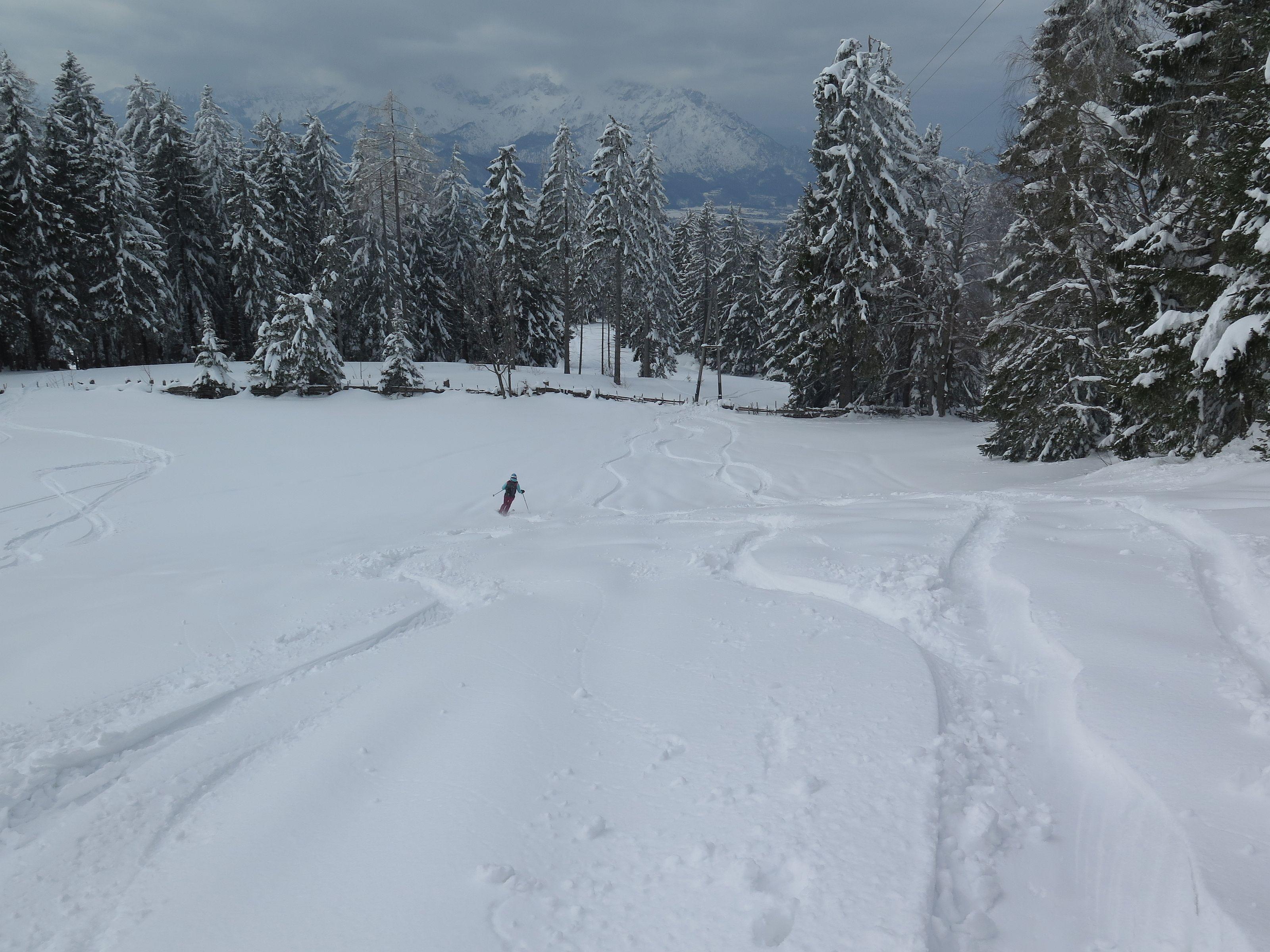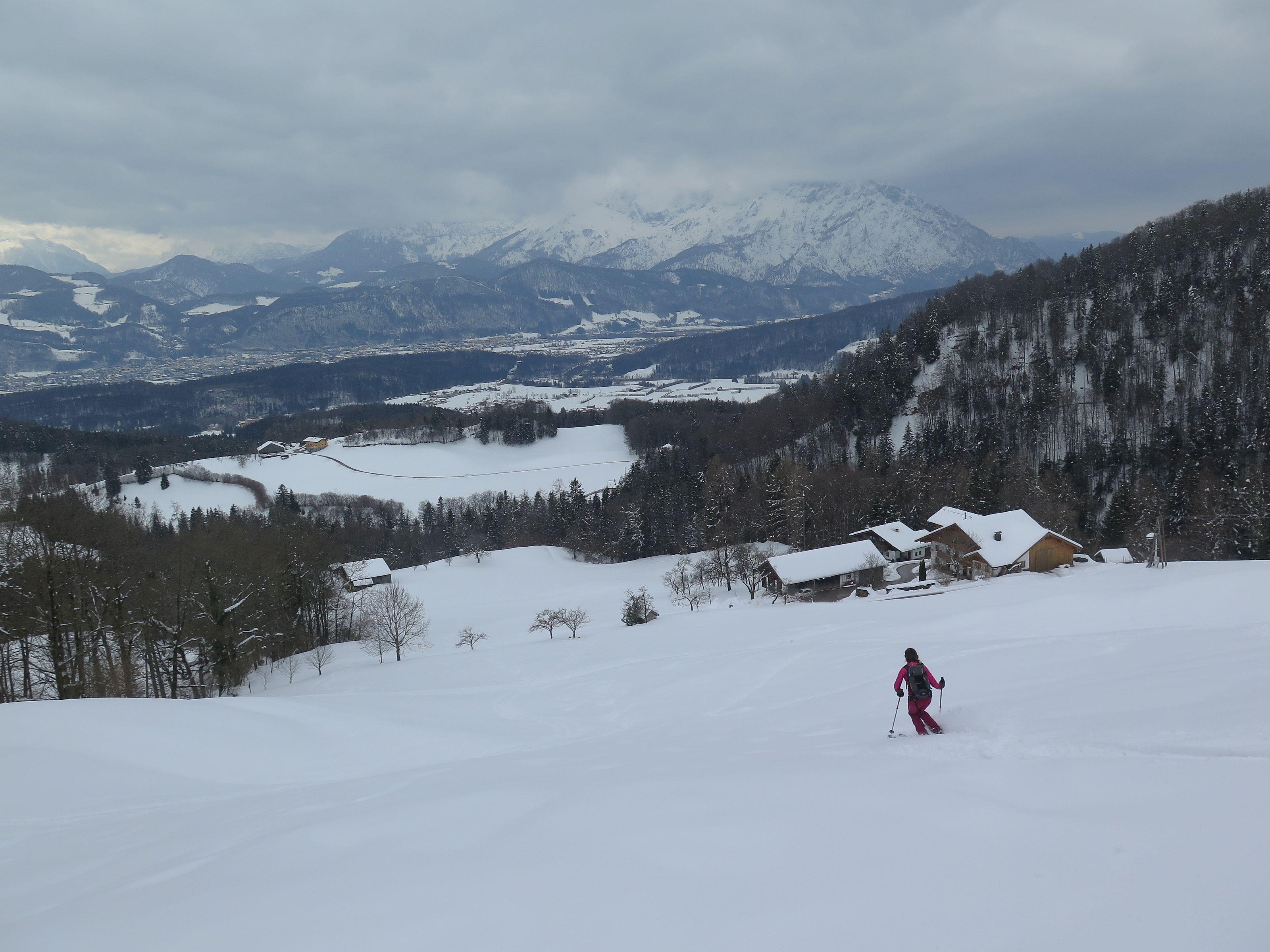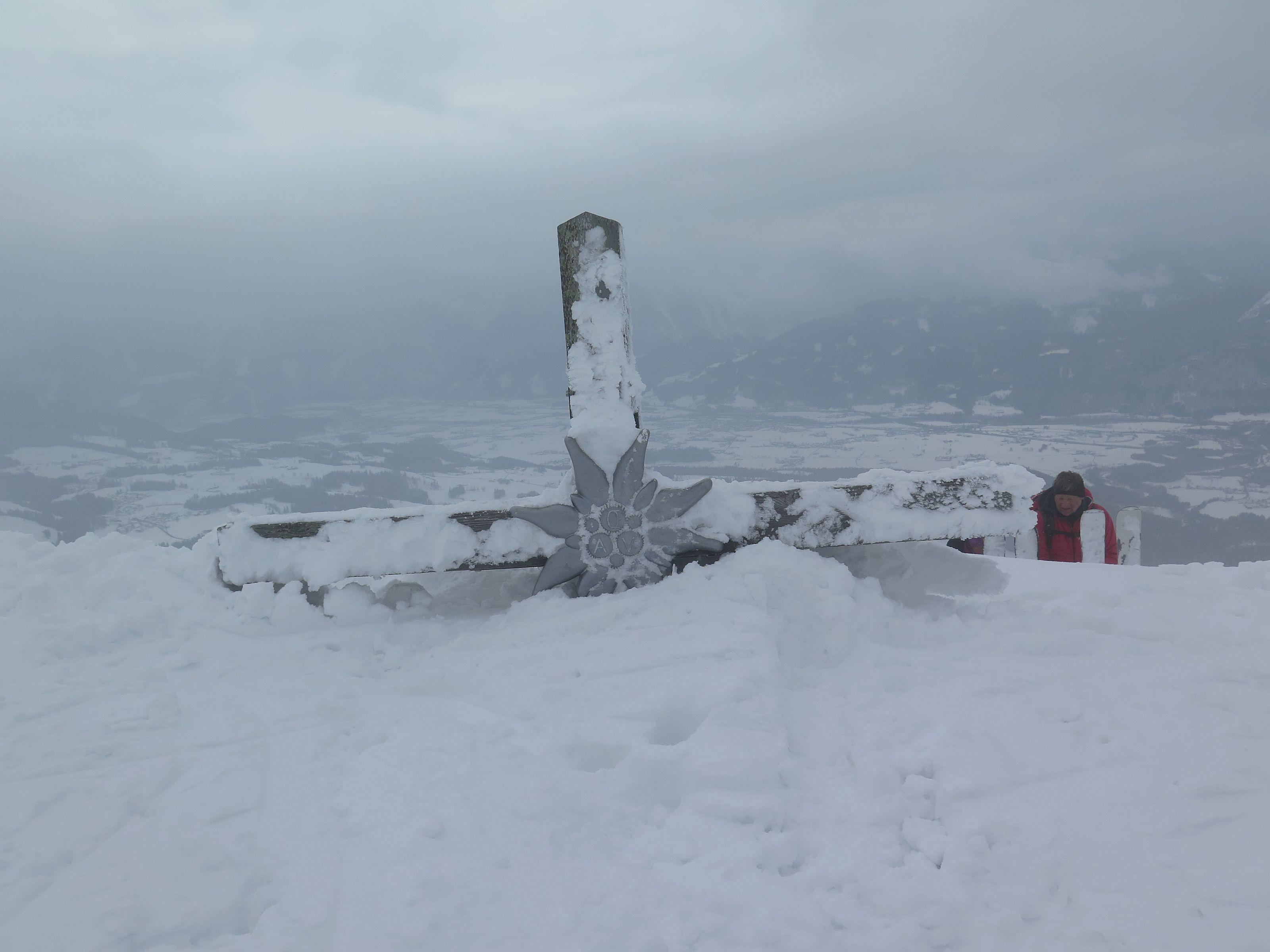 Aufstieg über den Krispler Höhenrücken. Der angekündigte Sonnenschein ist ausgeblieben, der Schneequalität hat das aber gutgetan. Heute war es meist stark bewölkt, zeitweise etwas Nebel, der Wind war kein Thema. Bis unter die Halleinerhütte schöne Pulverschneeabfahrt, danach schon leicht angefeuchtet aber immer noch gut zu fahren. Gewaltige Schneehöhen- siehe Foto vom Schlenken -Gipfelkreuz.