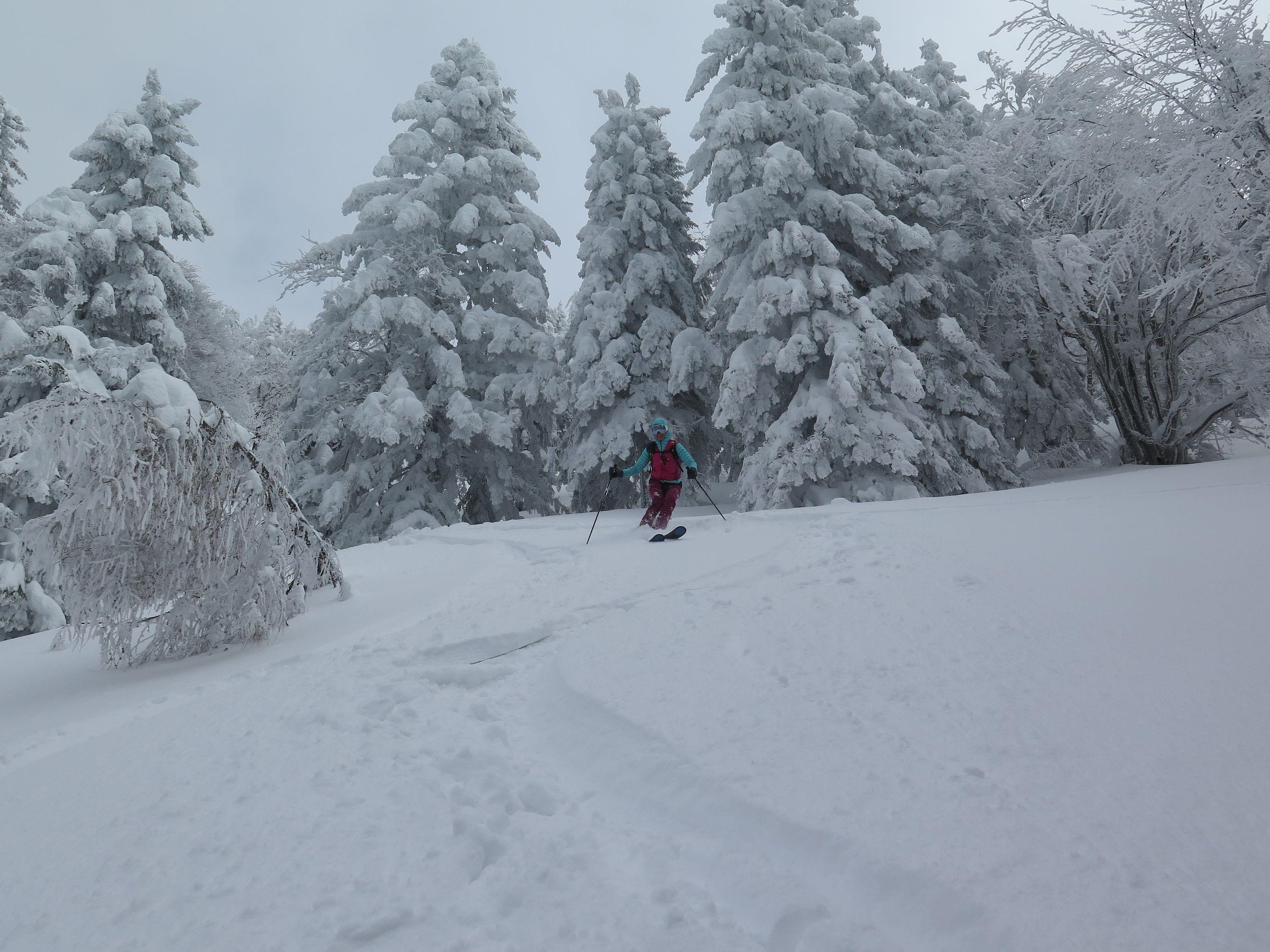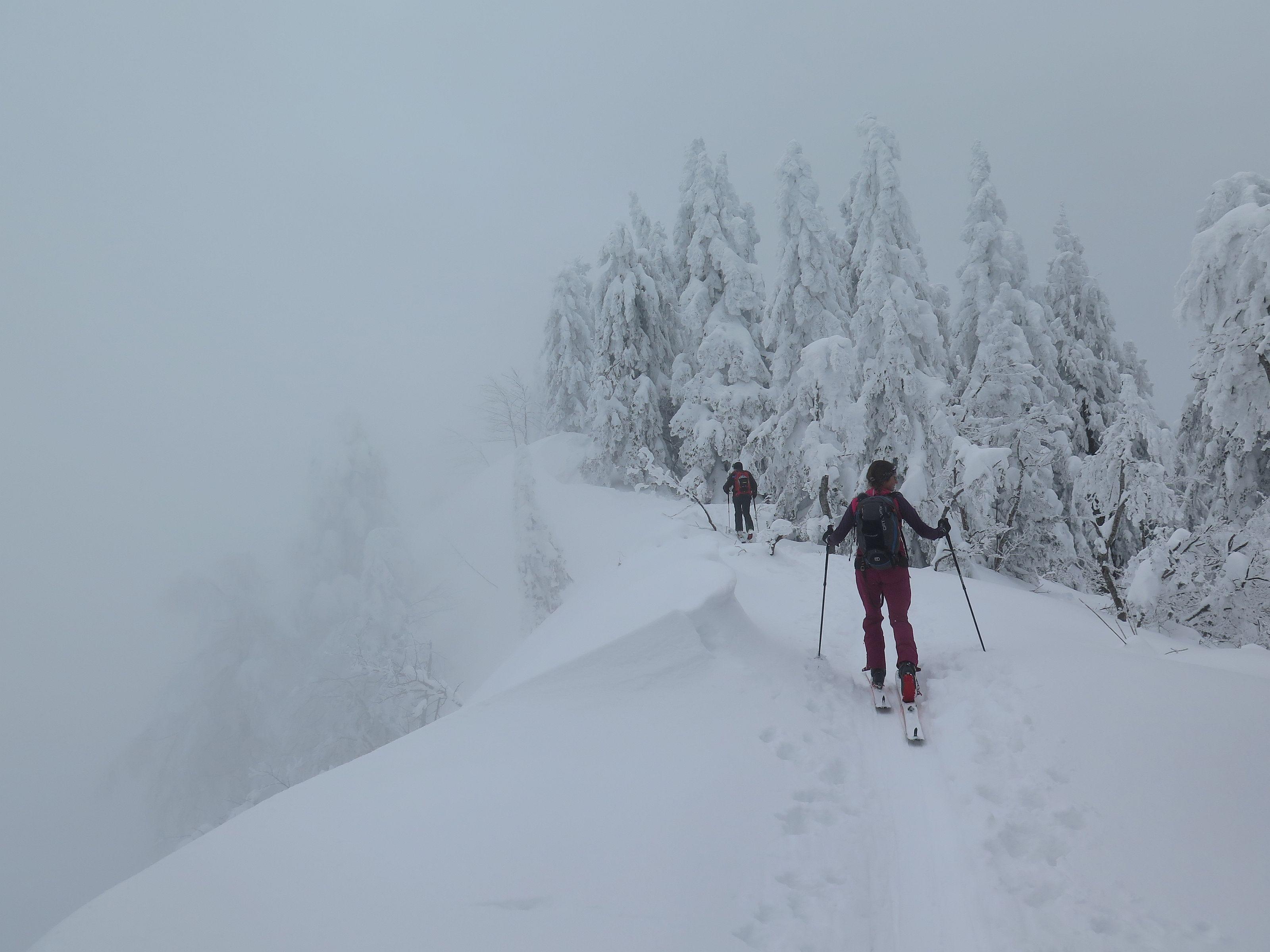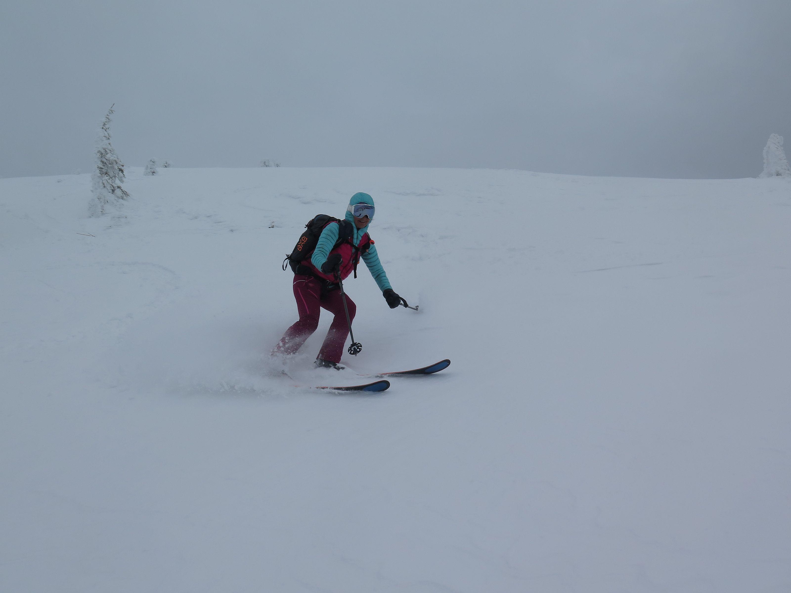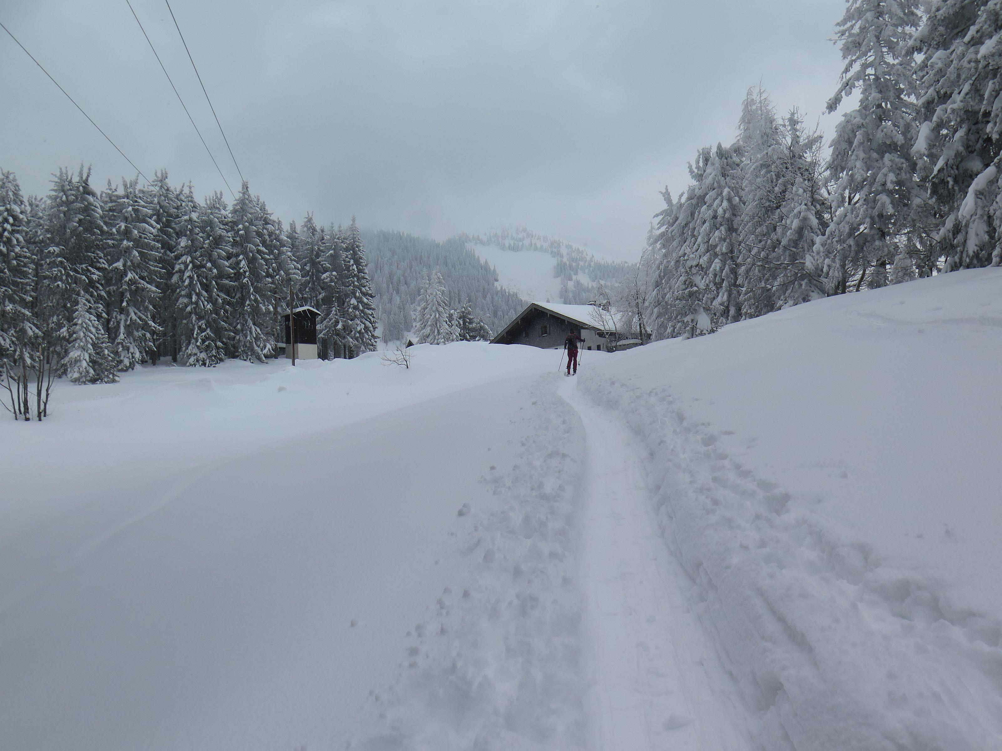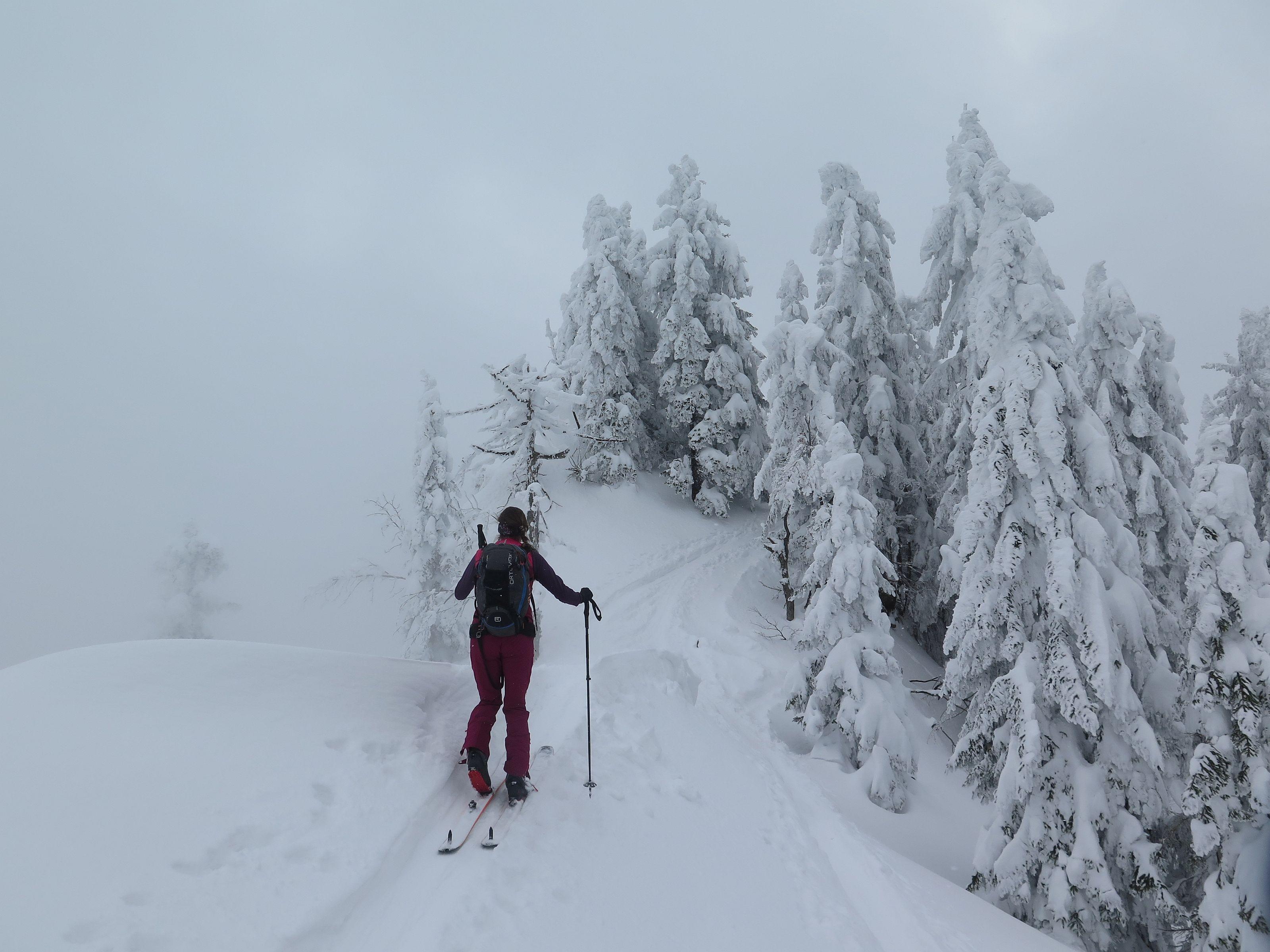 Aufstieg über den Krispler Höhenrücken. Der angekündigte Sonnenschein ist ausgeblieben, der Schneequalität hat das aber gutgetan. Heute war es meist stark bewölkt, zeitweise etwas Nebel, der Wind war kein Thema. Bis unter die Halleinerhütte schöne Pulverschneeabfahrt, danach schon leicht angefeuchtet aber immer noch gut zu fahren. Gewaltige Schneehöhen- siehe Foto vom Schlenken -Gipfelkreuz.