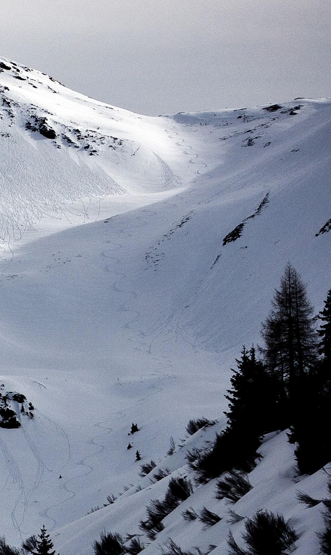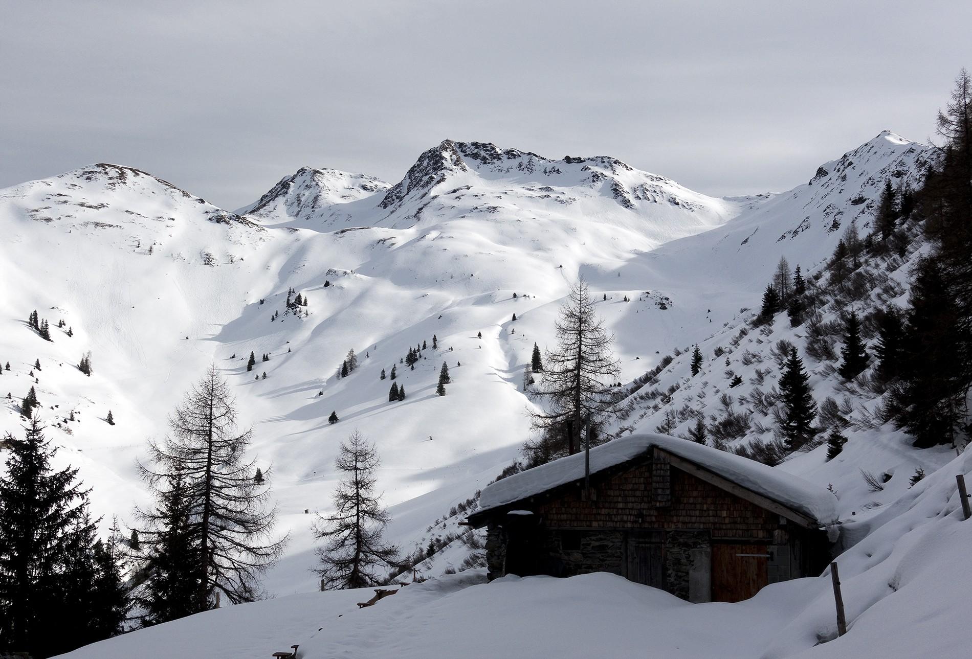 Die Abfahrt ins Polzkar ist traumhaft schön. Auf der Medalalpe ist es bald wieder aper, wenn nicht der versprochene neue Schnee kommt. Hier ist es richtig schwer und man fließt zurück ins Tal.