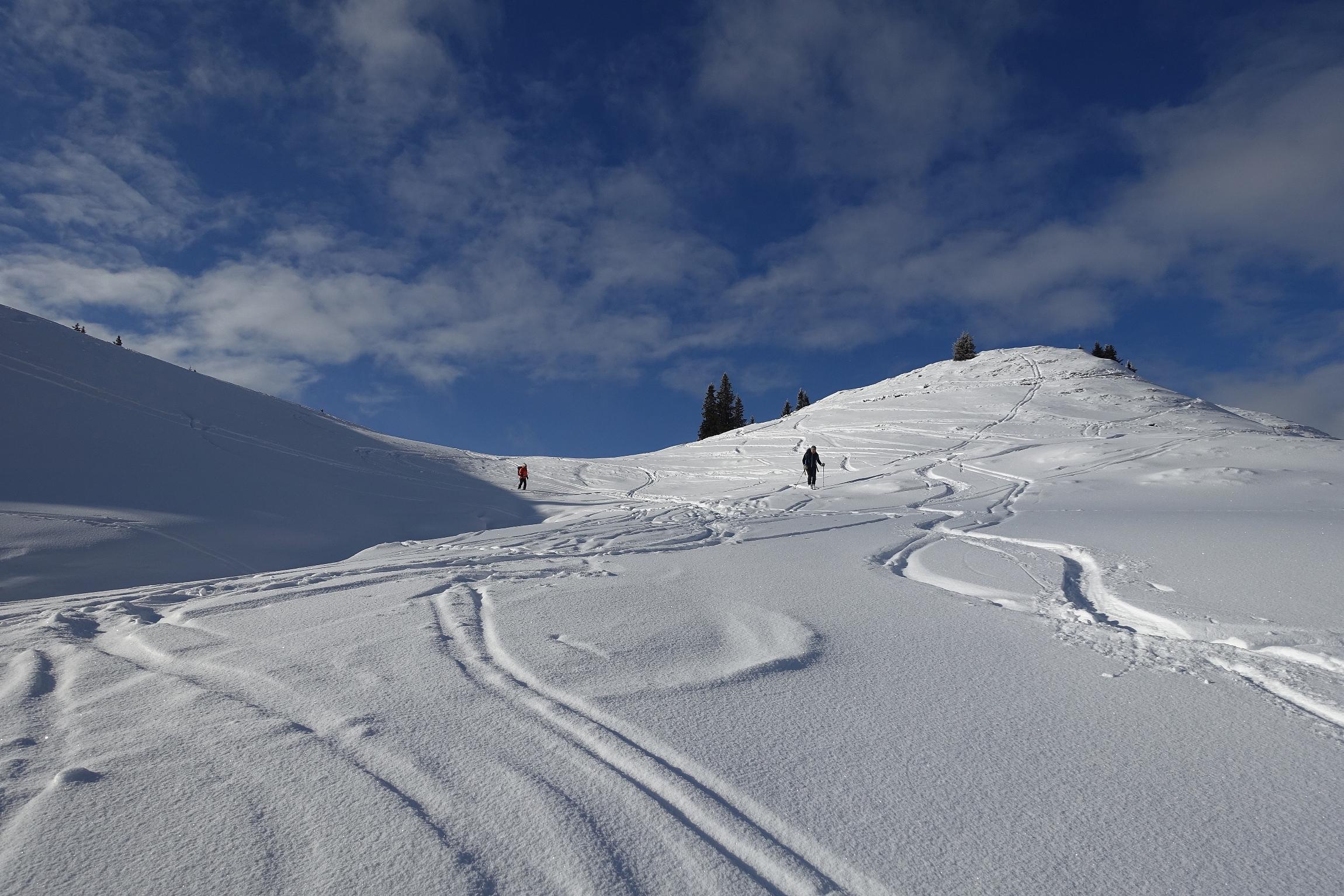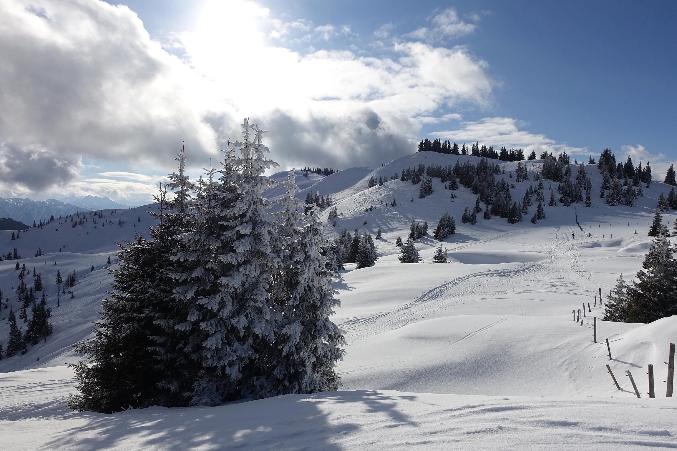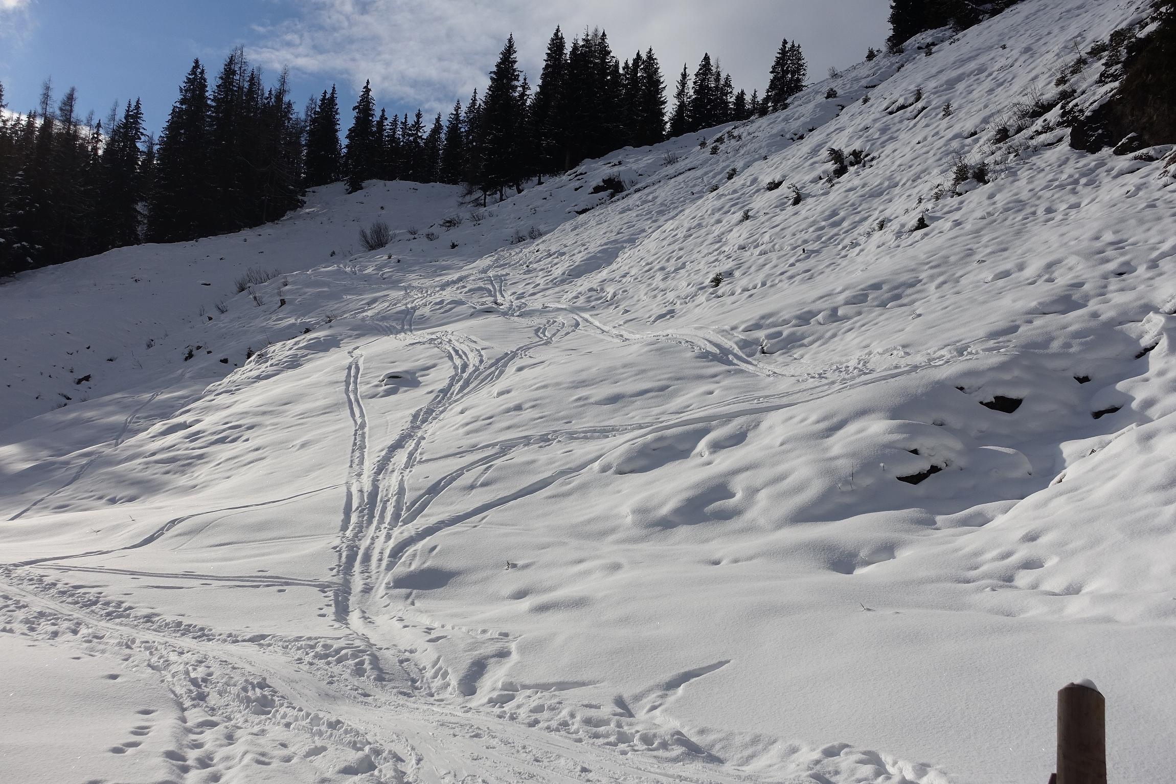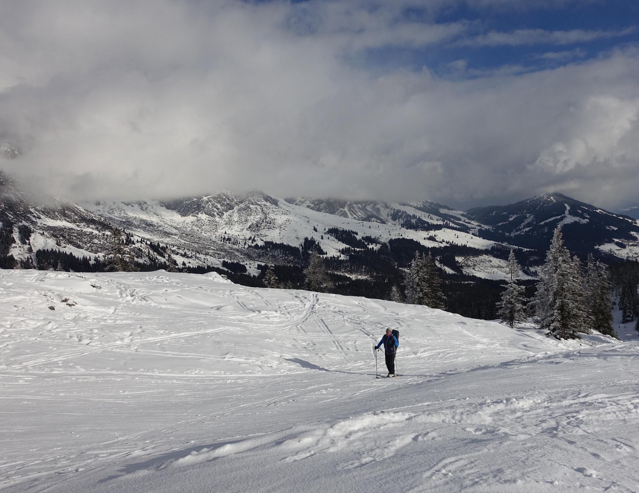 Vom Dientner Sattel über den Skitourenpfad zum Kings Cap und weiter zum Kollmannsegg. Abfahrt Richtung Klingelbergalm und über Tiergartenalm retour zum Auto. Sehr bescheidene Verhältnisse, immer wieder Stein- und Strauch- und sonstiger Untergrundkontakt, der kurze Hang zur Klingelbergalm eher ein runtersteigen als fahren. Auch der Ziehweg nach der Piste hat einige längere Steinstrecken. Ingesamt eigentlich nicht empfehlenswert, der Genuss war heute der Anstieg - nicht die Abfahrt.
