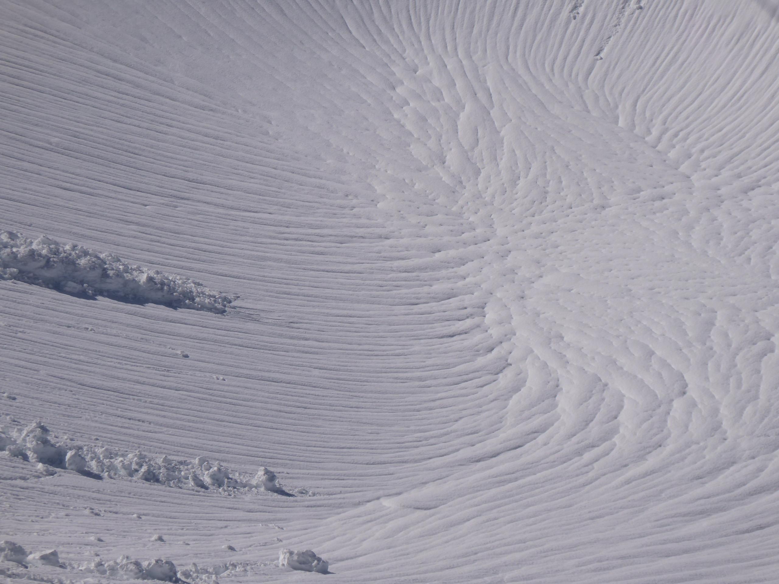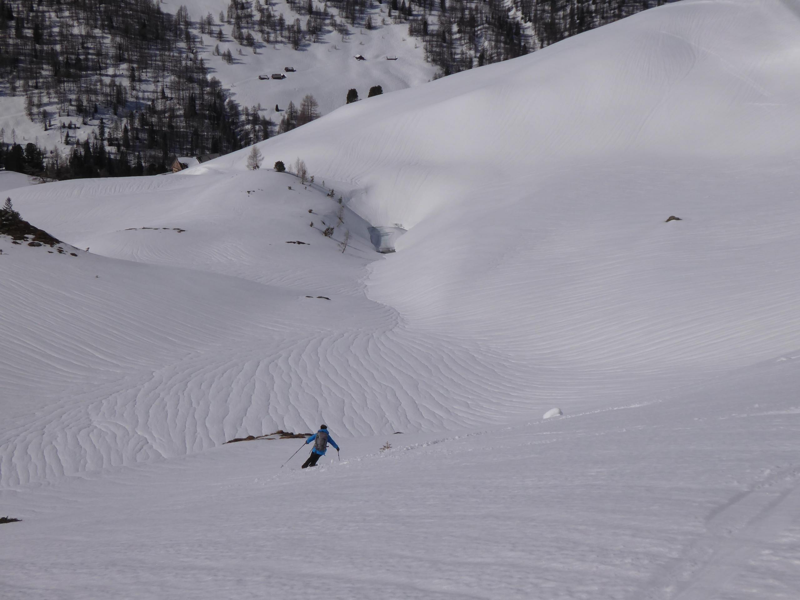 Lawinen: Es sind einige (auch größere) Feuchtschneelawinen von gestern herunten gelegen, an denen gut abgelesen werden konnte, wie tief die Decke gestern schon stark durchfeuchtet bis triefnass auf dem kompakten Grund gewesen sein muss (30-50cm!!). War heute nachmittag wahrscheinlich nicht viel anders, aber da sind wir schon beim Wirtn gesessen.