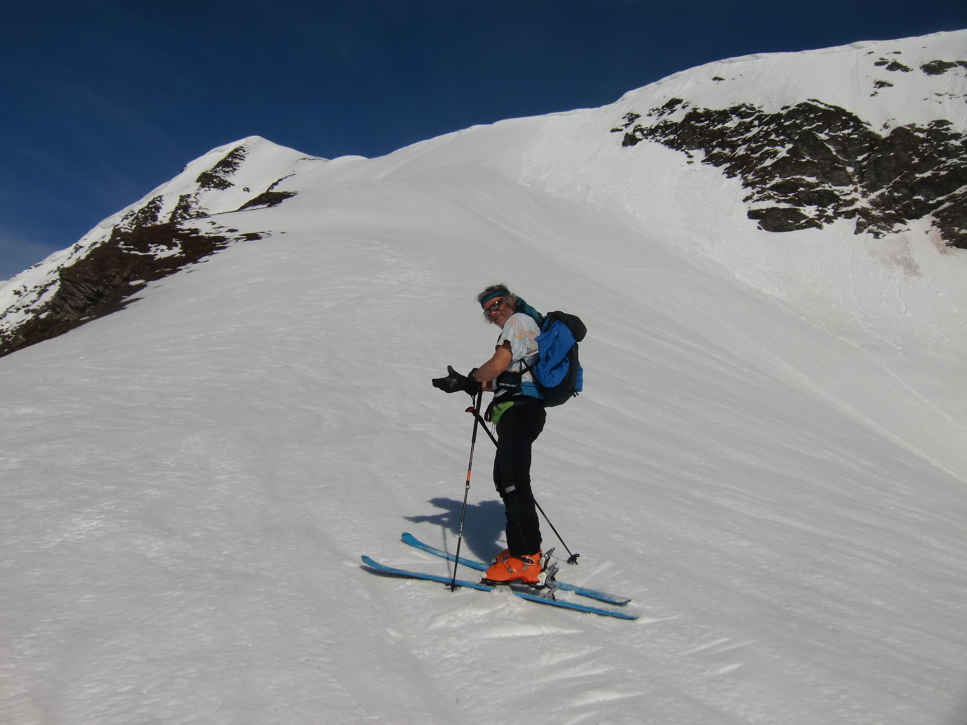 Von Obertauern/Jugendheim Schaidberg über Ernsthütte und Twenger Almsee. Selten gemachte Tour (Andrang: außer uns 1 Gämse). Die Option, vom Gipfel ein paar hundert Hm nach Osten ins schöne Schönalmkar (nomen est omen) abzufahren und wieder aufzusteigen, konnten wir nicht ziehen. Das wäre nur bei frühem Aufbruch noch in der Dunkelheit sinnvoll möglich (und von der Sicherheit vertretbar) gewesen. Temperatur (und Luftfeuchtigkeit!) waren heute einfach zu hoch. Die Sonne hat von der Früh weg gleich mächtig Gas gegeben und so wars nicht das Schlechteste, dass wir uns für eine Westflanke entschieden hatten.