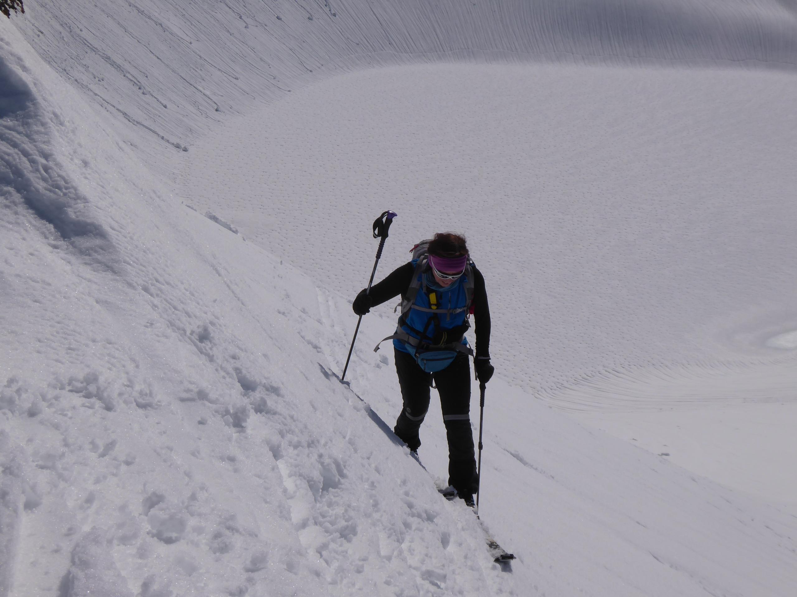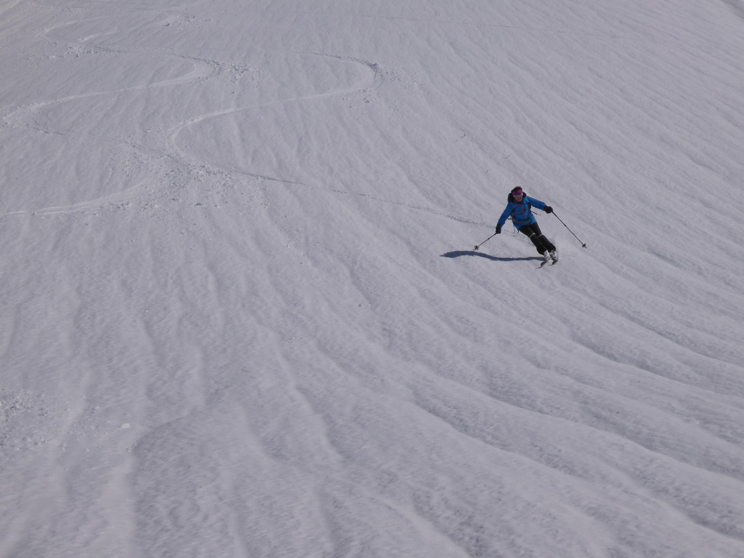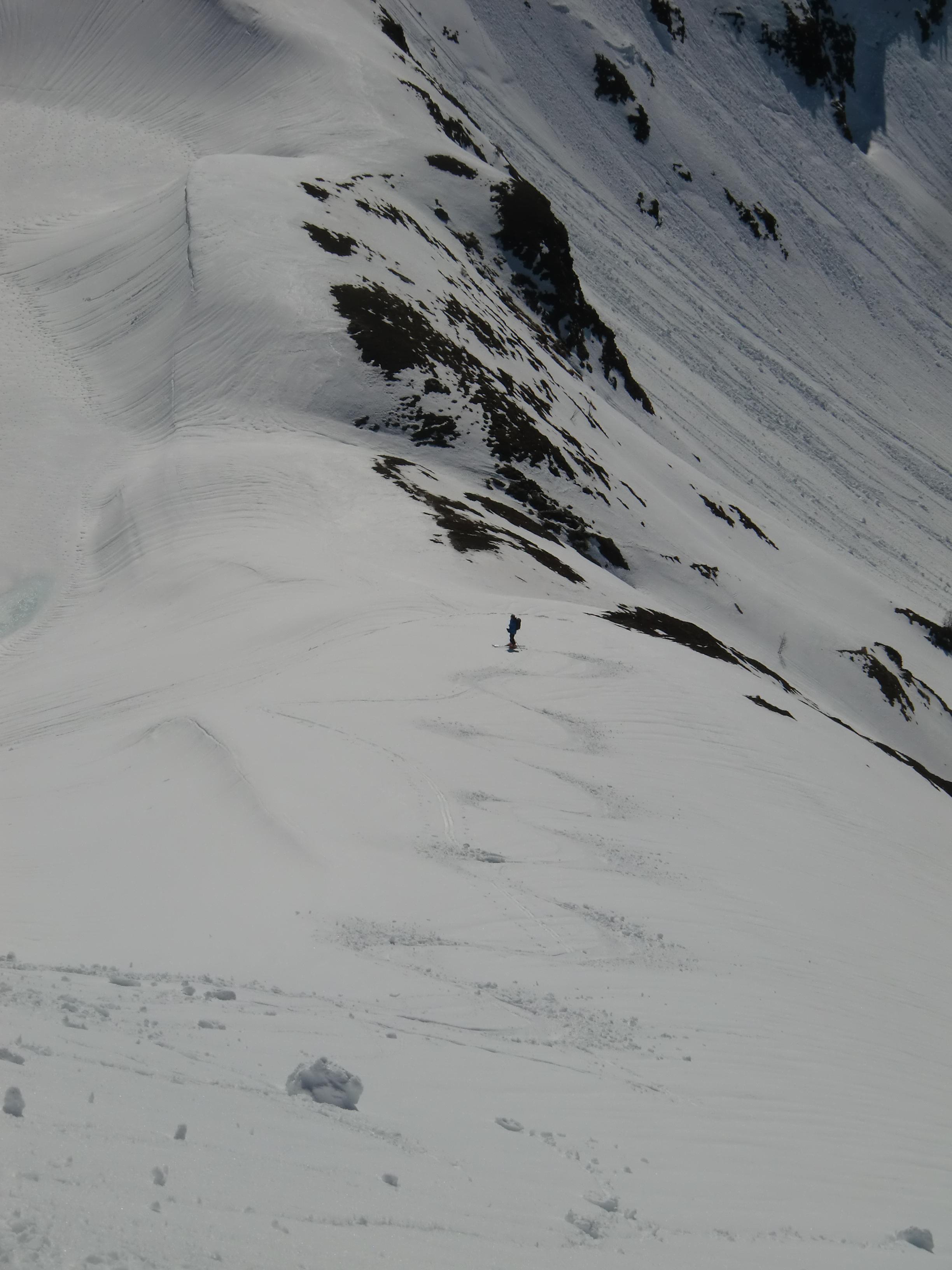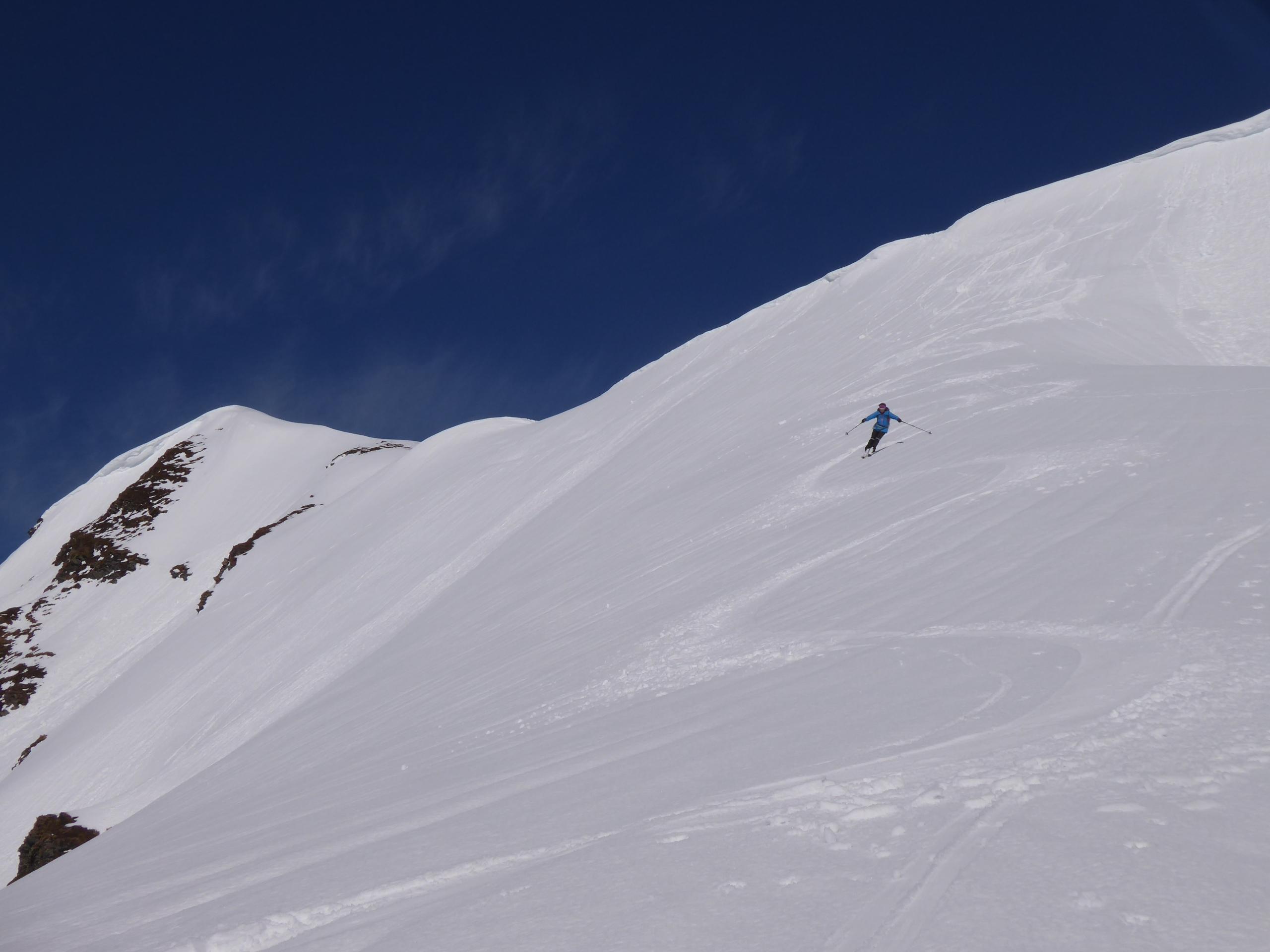 Schnee: Fast ein bisschen überraschend sehr schön firnig, trotz des gestrigen Regeneintrags und der darauf folgenden Hitze. Es hatte in der Nacht auch schon ab 22:00h aufgeklart und das hat der Schneedecke recht gut getan. Beim Ausstieg über die Wechte war's dann doch schon recht weich und zu spüren, dass sich das Zeitfenster zu schließen beginnt, also Gipfelaufenthalt stark verkürzt, aber außer besagter Wechte war die Abfahrt wunderschön zu fahren.