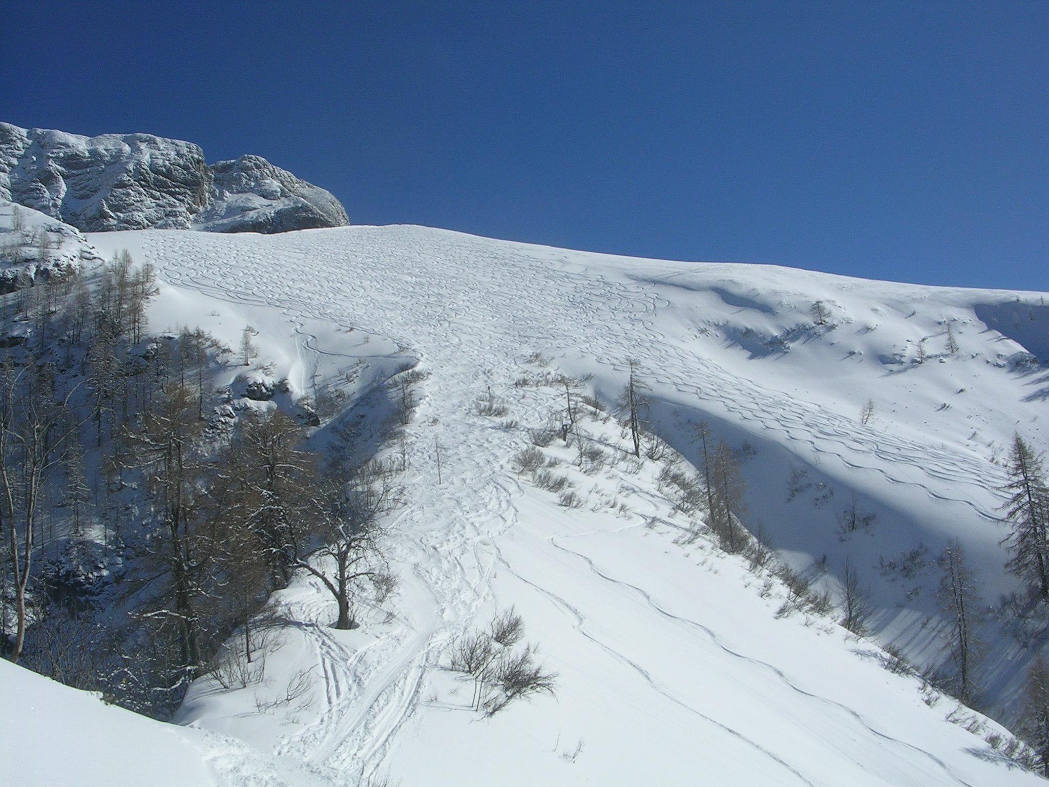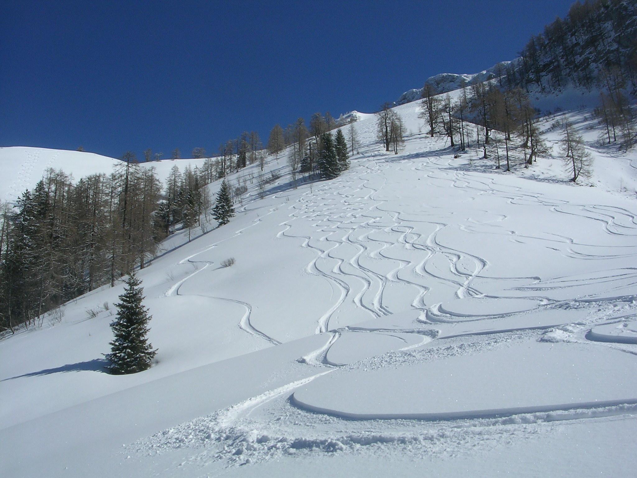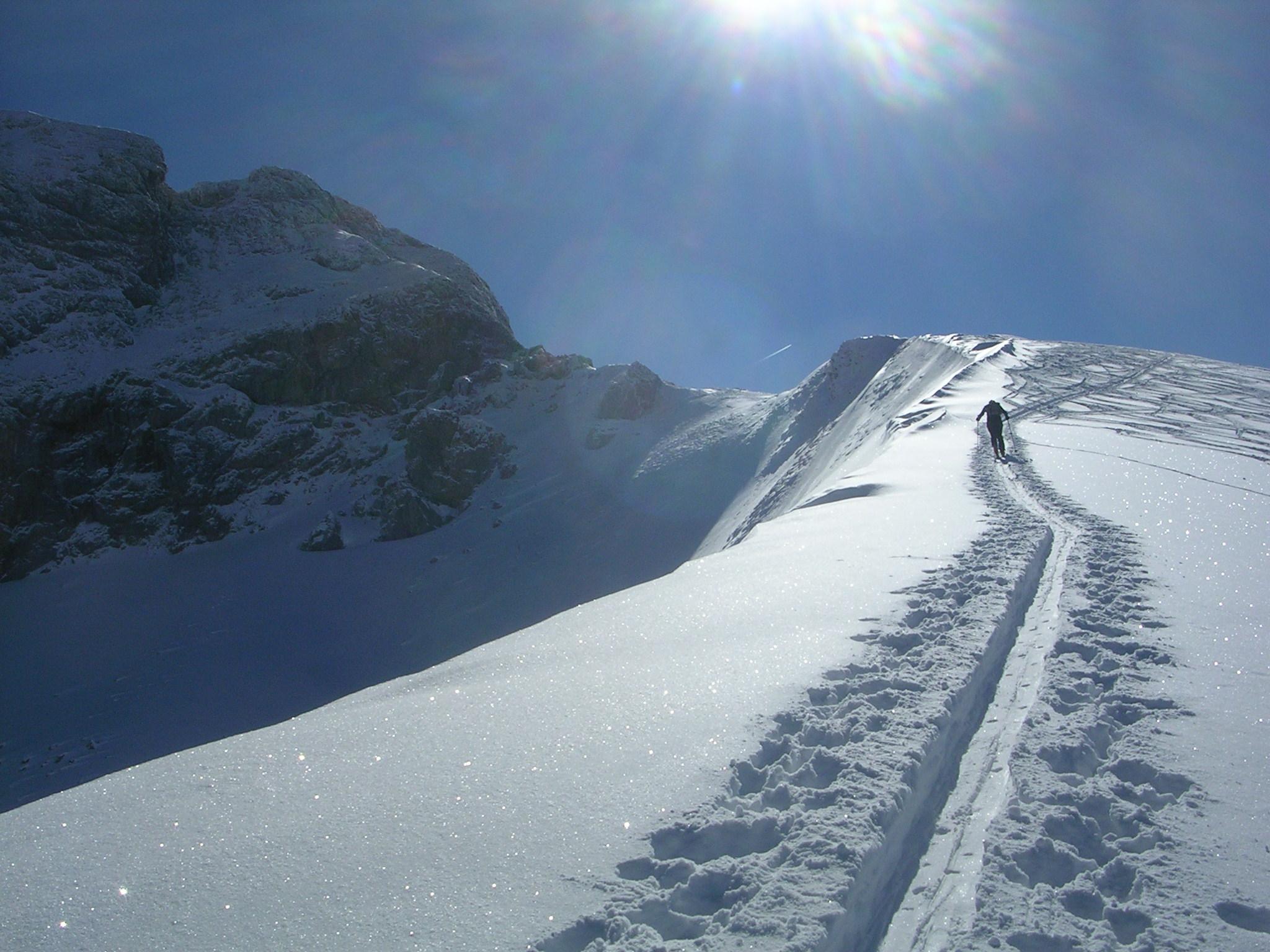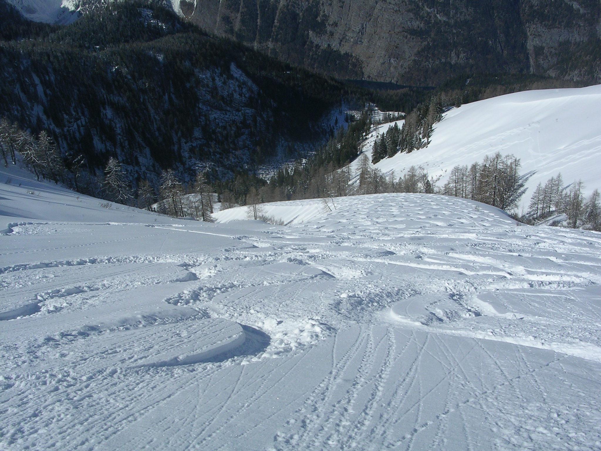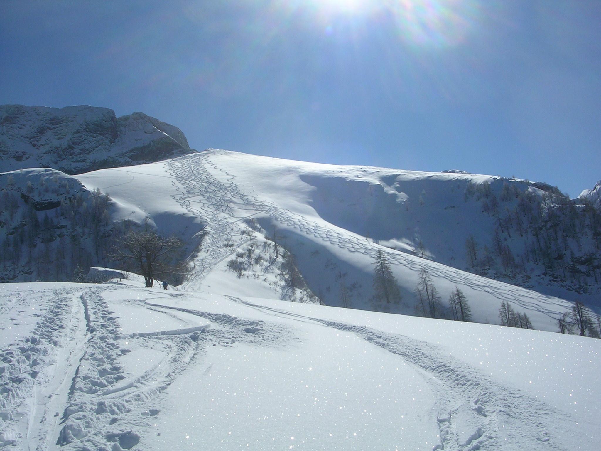 Am Hochbahnweg mussten die Schi 250 Hm getragen werden, dann war man wieder im Winter angekommen. Bis unter den Fagstein war lockerer Pulverschnee geboten, der nach der ersten Abfahrt (links) zu einer Wiederholung einlud. Danach ging's noch vom Priesberger Moos zum Stahlhaus und nach einer Stärkung zur Schipiste und runter zum Parkplatz.