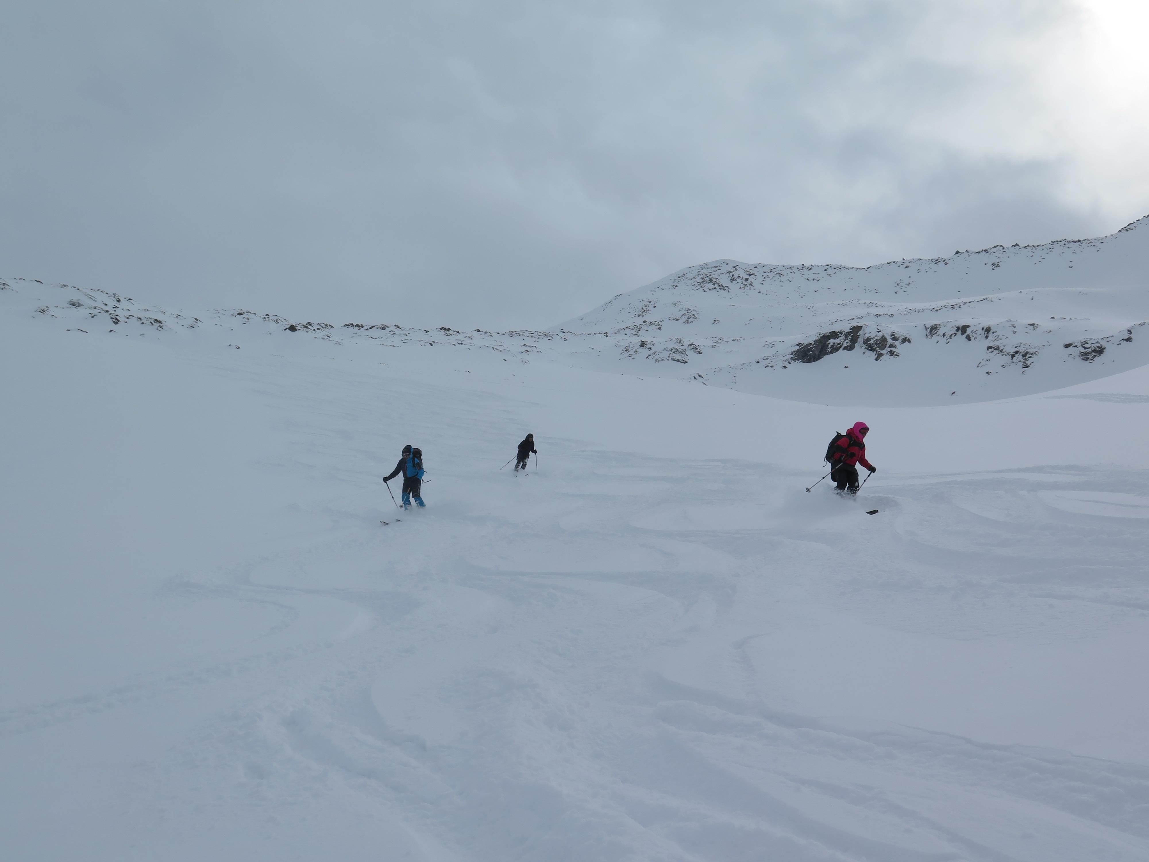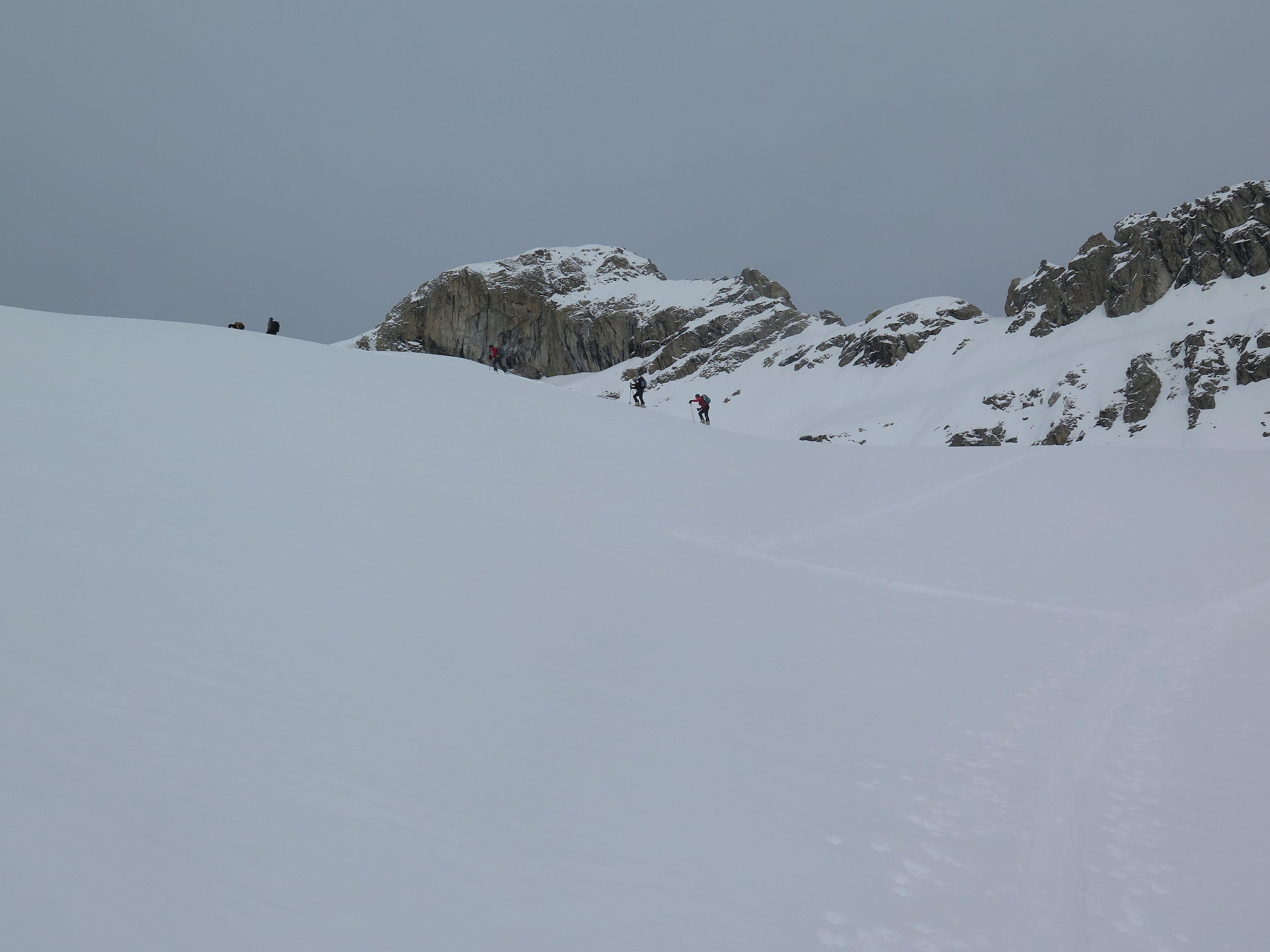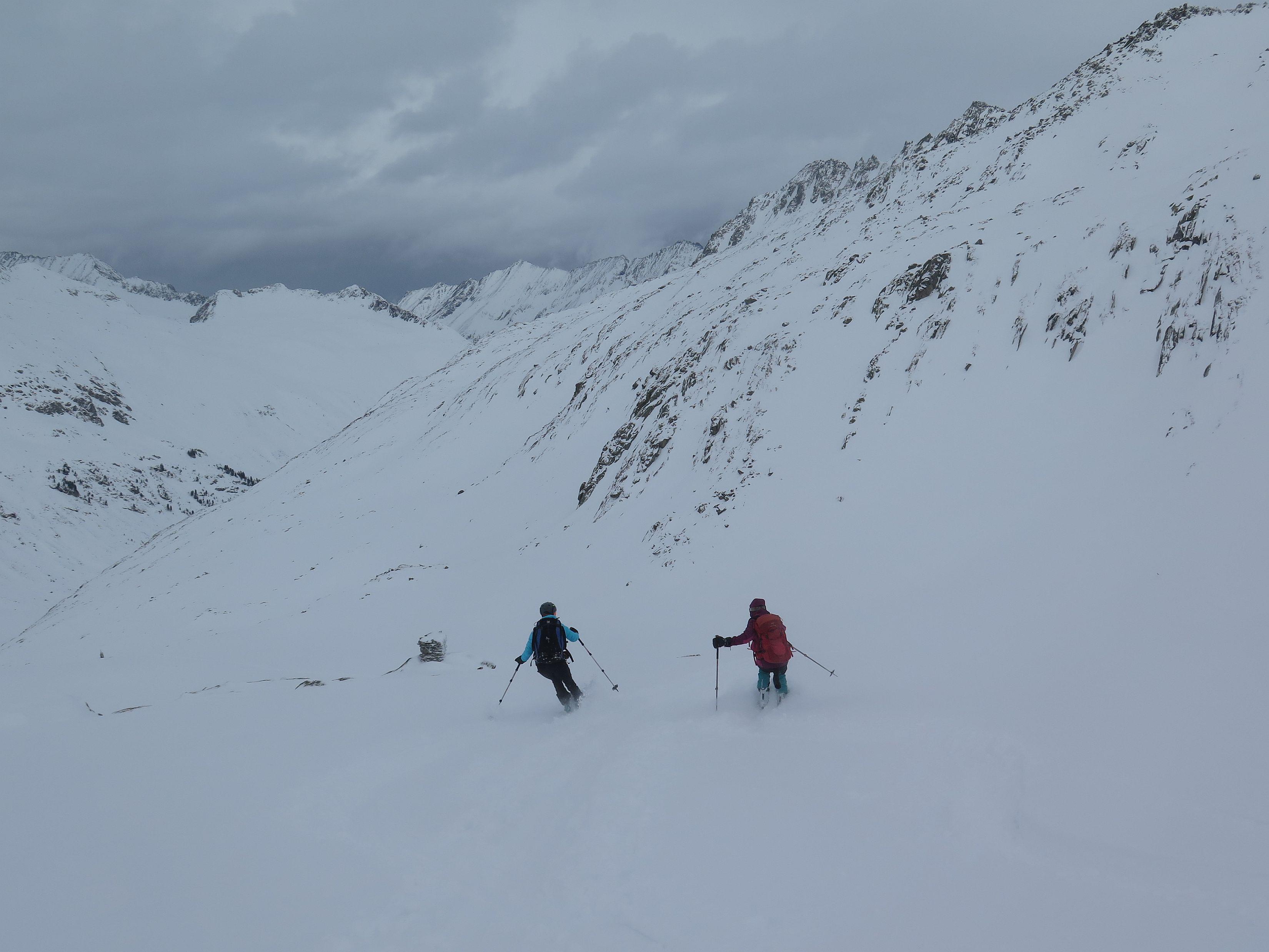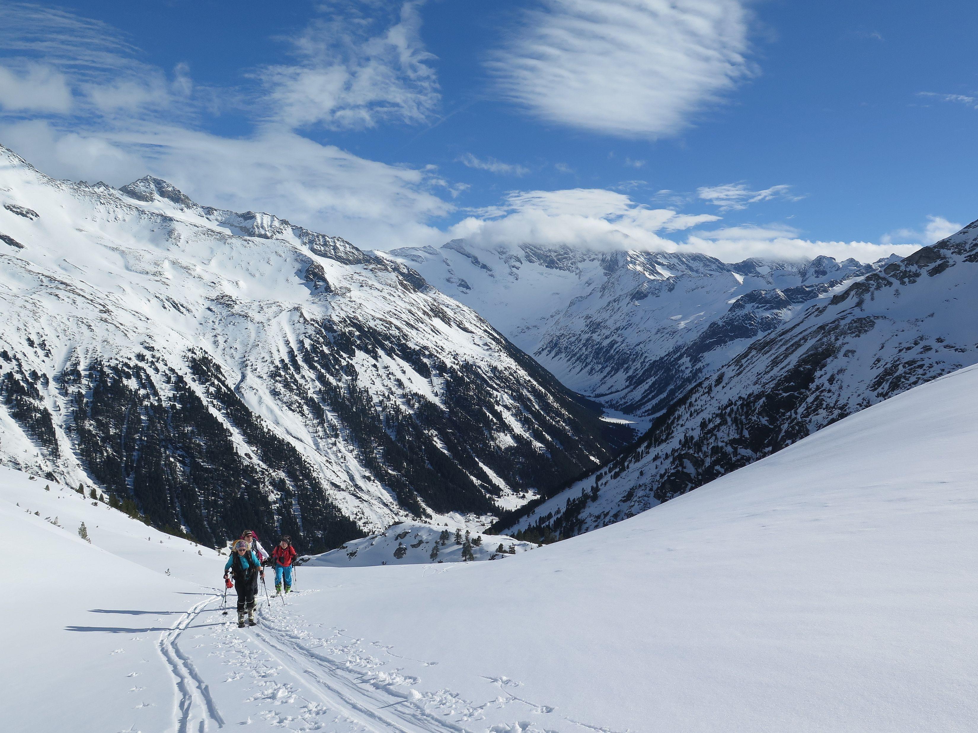 26.2 Durch das lange Windbachtal auf den Schientalkopf. Eine Kaltfront in der Nacht bringt ca 10-15cm Neuschnee. Beim Start in der Früh noch leichter Schneefall, im Windbachtal Auflockerung, kurz sogar Sonnenschein, leichter Schneefall und stürmischer Wind begleiten uns wieder zum Tauernhaus.