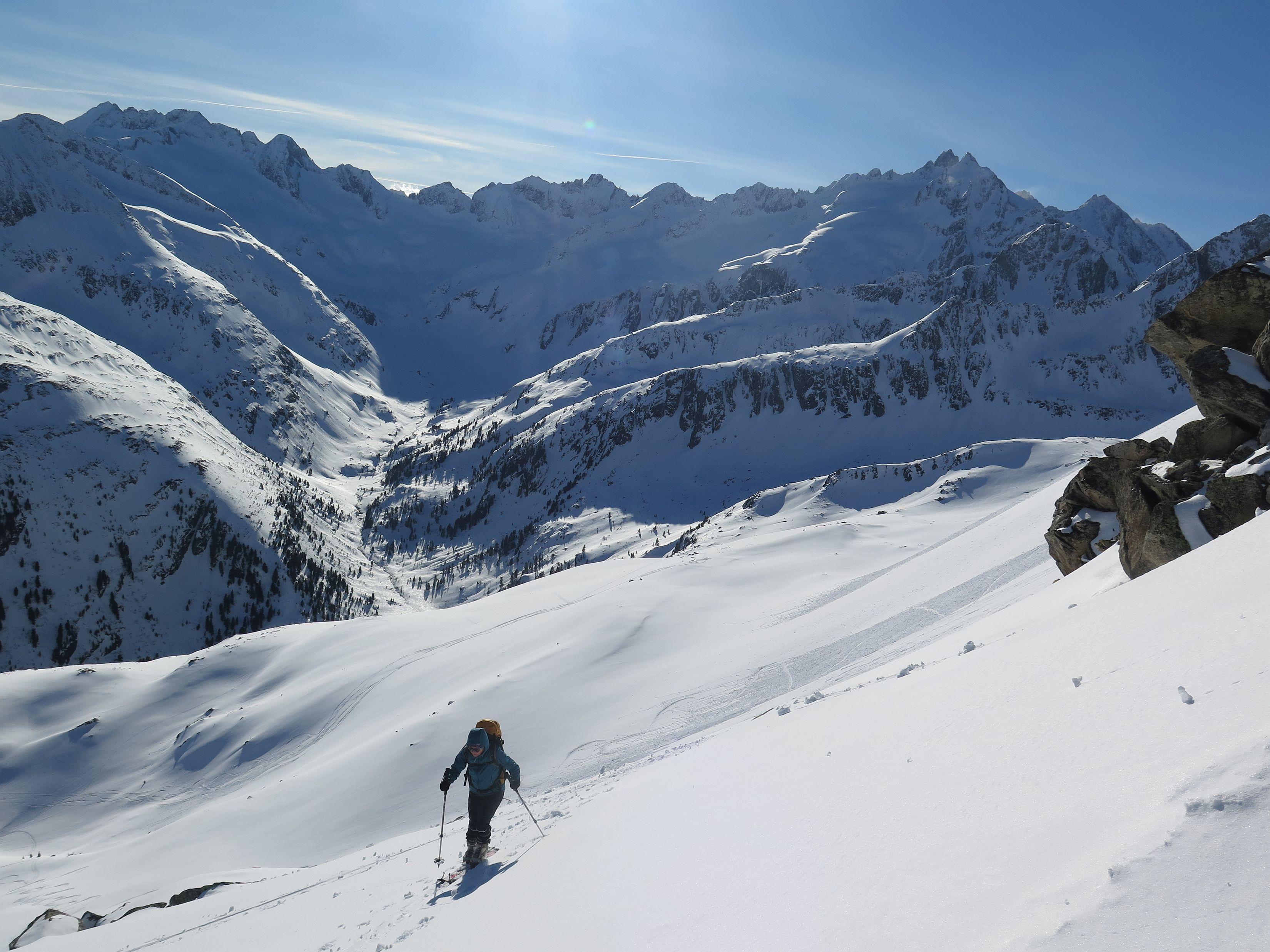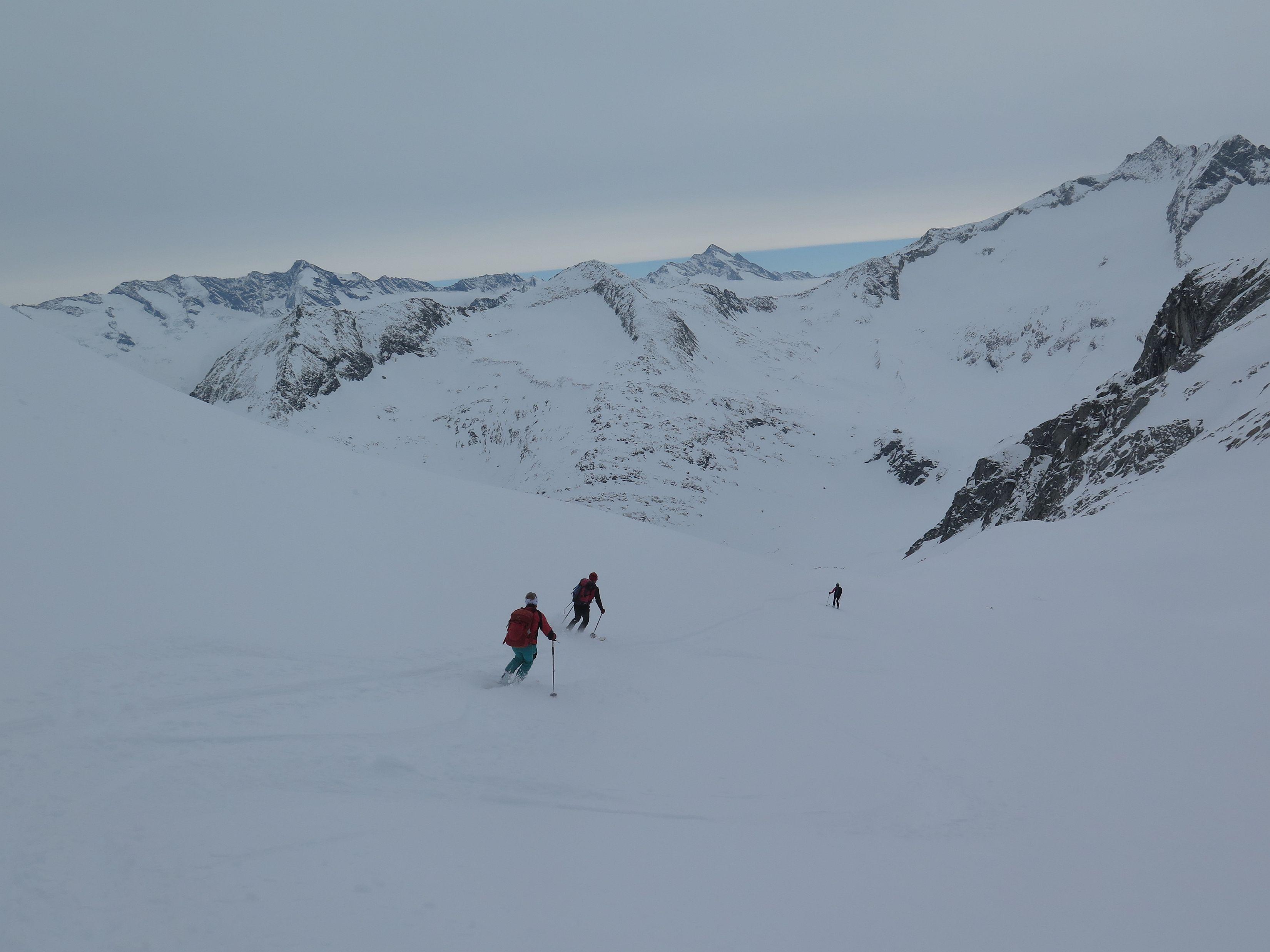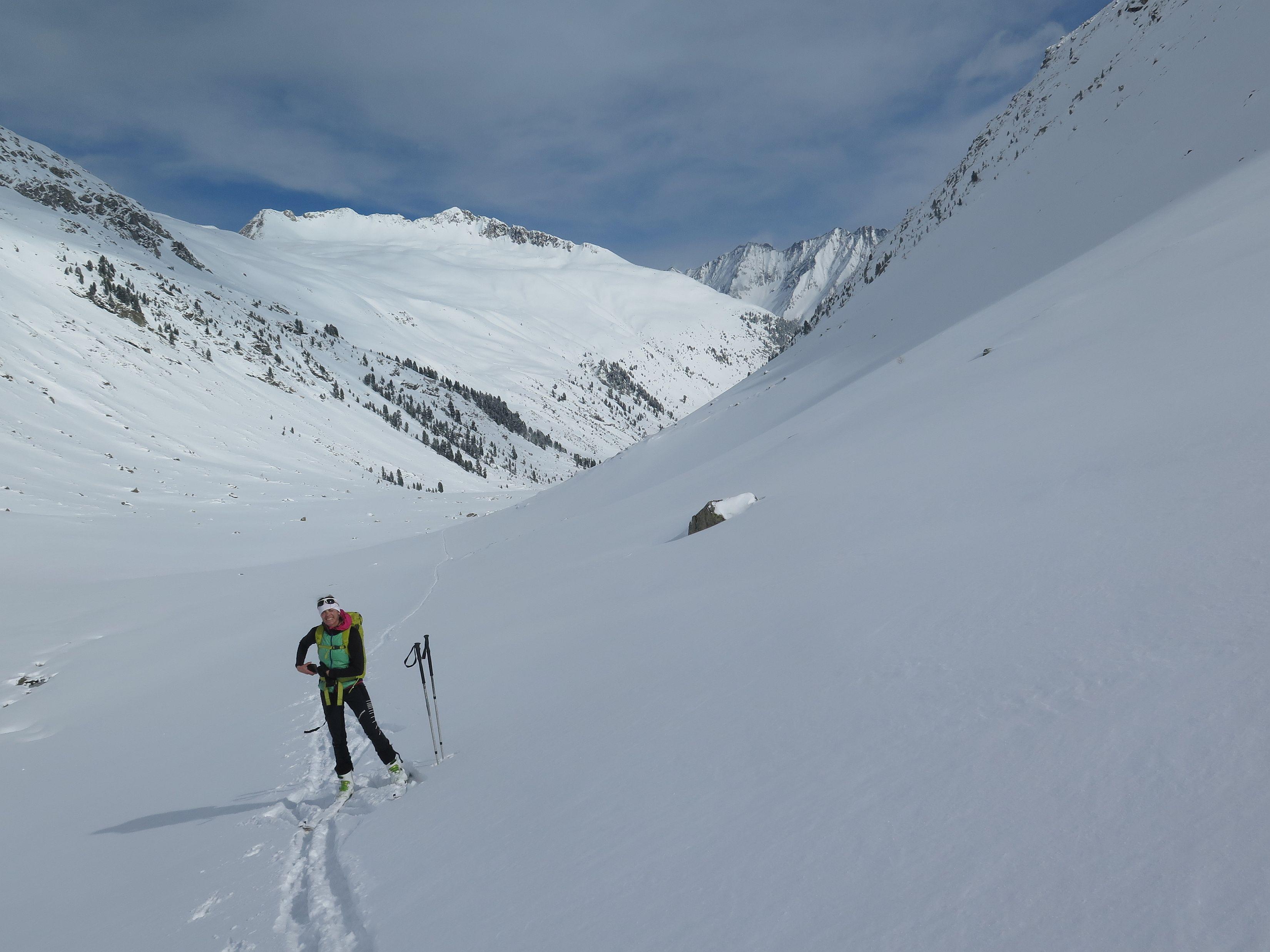 25.2 Aufstieg über das Rainbachtal auf den Mannlkarkopf. Entgegen dem Wetterberichts keine Sonne , dafür viele Woken und diffuse Sichtverhältnisse. Im oberen Abfahrtsbereich ca 10 cm Pulver auf Harschdeckel, der Rest tragender Harschdeckel.