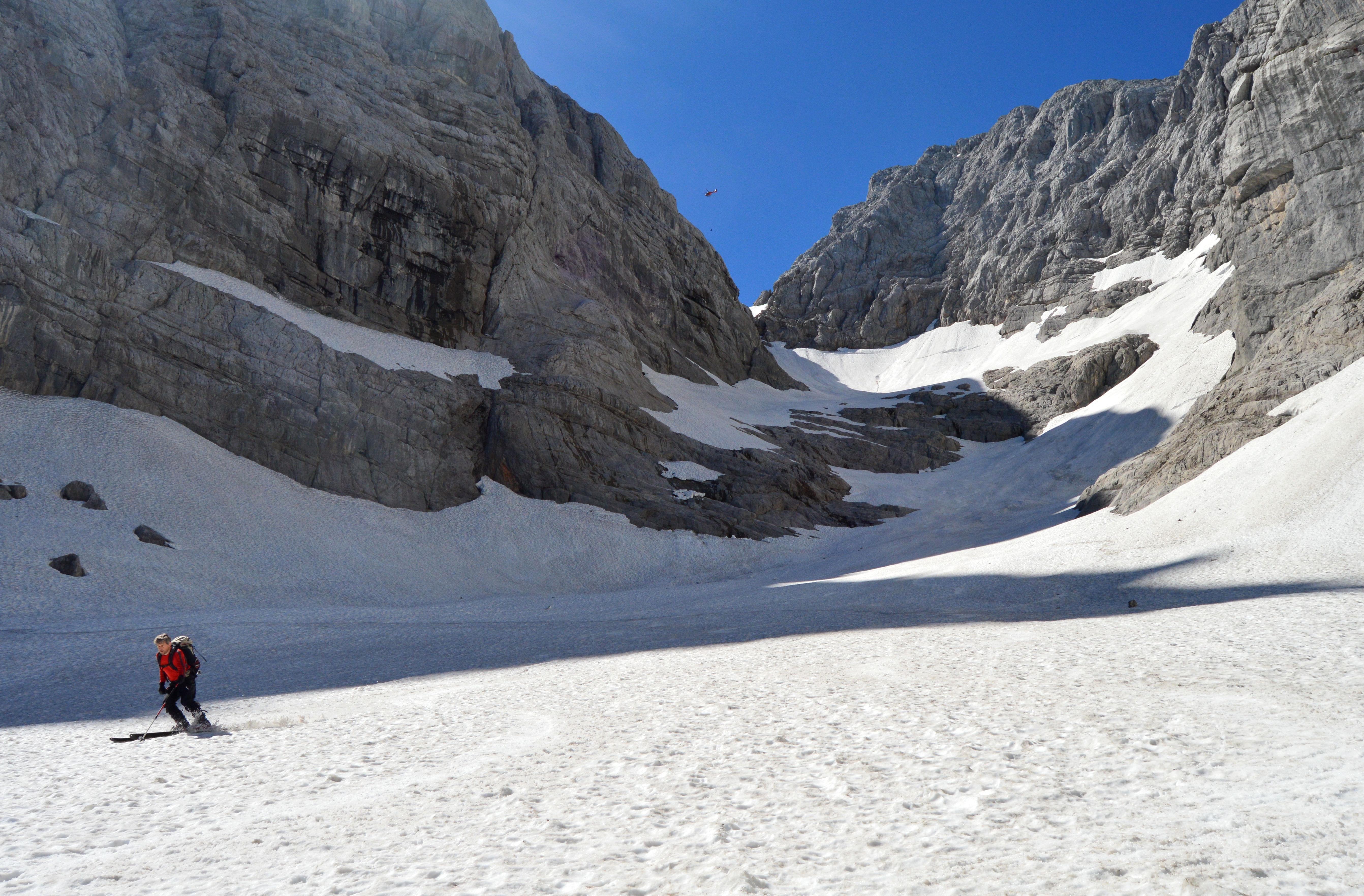 Leider war der endgültige Skitourenabschluss nicht ganz ungetrübt. Mit uns waren zwei Bergsteiger auf der Blaueisspitze. Einer davon hat sich mit einer Felsplatte Richtung Blaueis verabschiedet, und fiell in die Randkluft. Das Sprunggelenkt dürfte den Absturz nicht ganz so gut verkraftet haben, weshalb ein Hubschraubereinsatz nötig wurde.