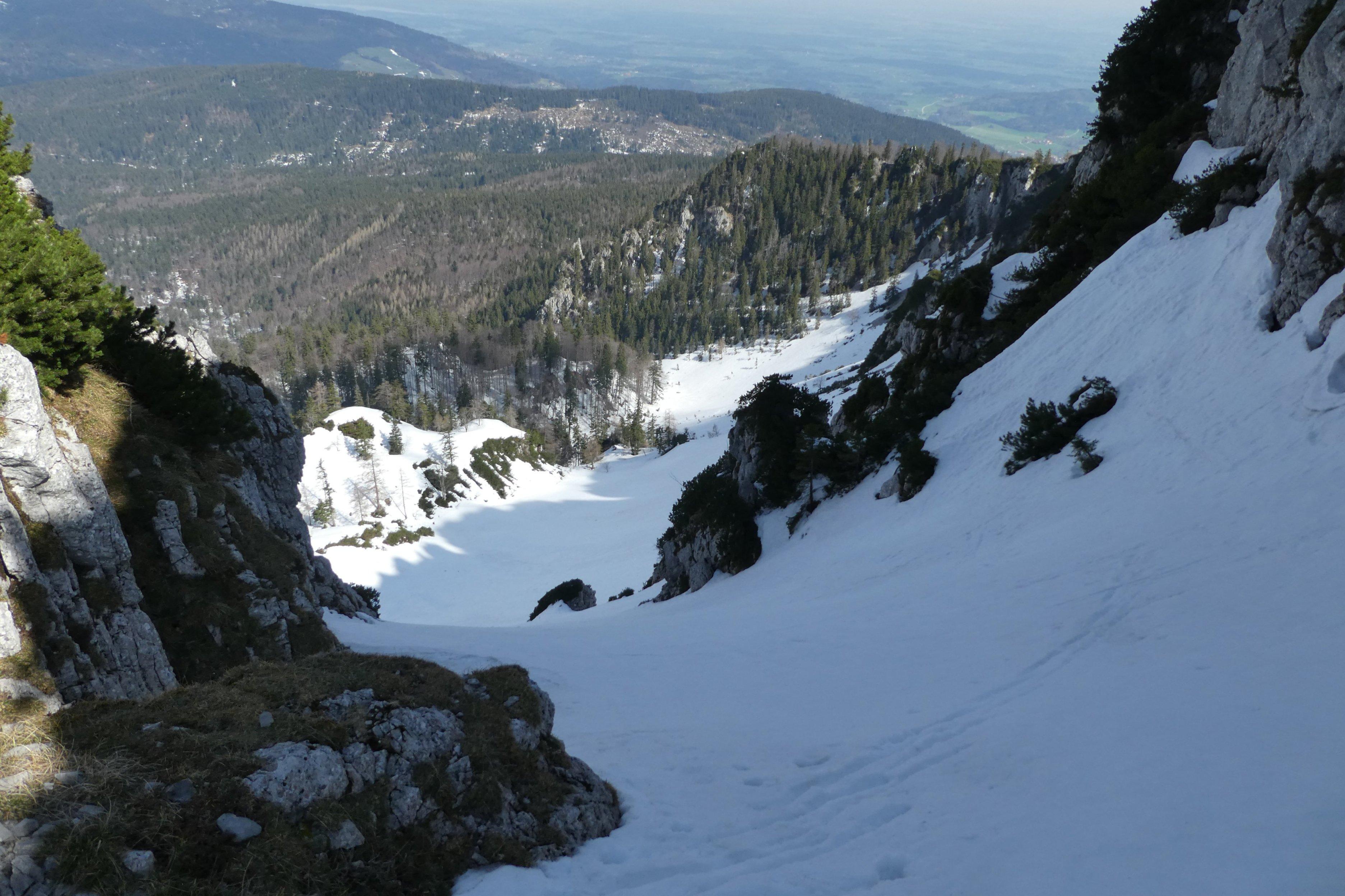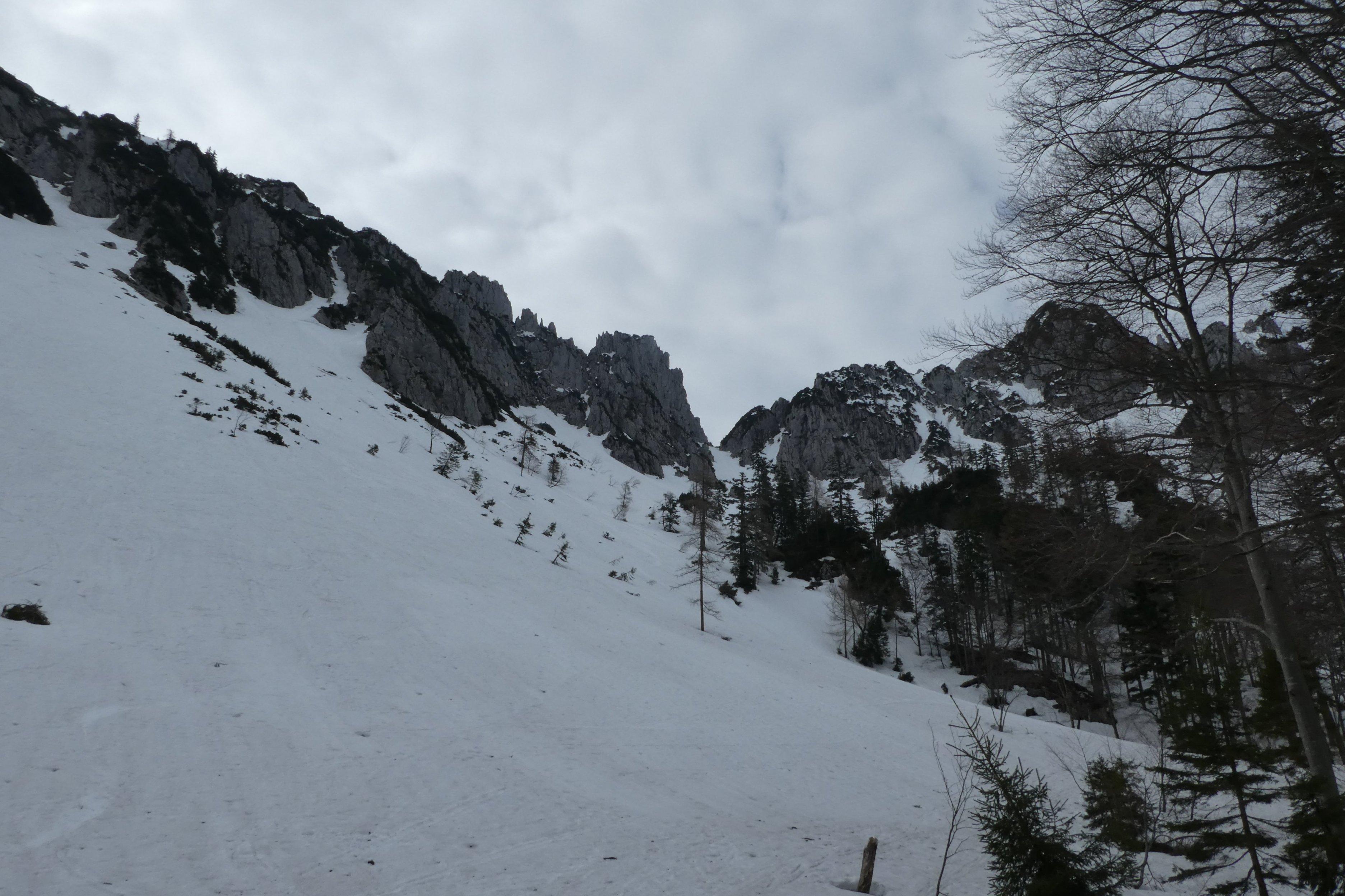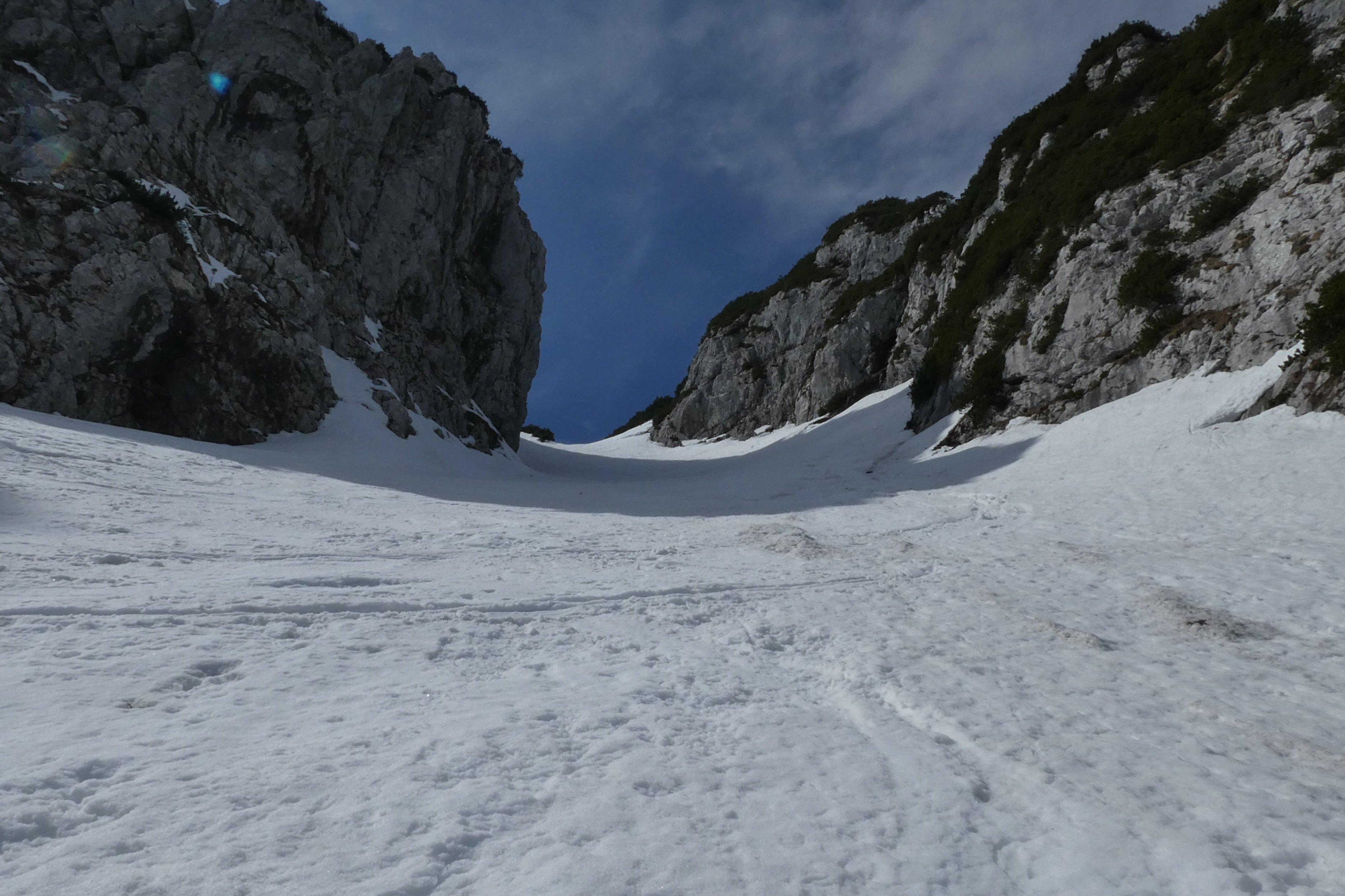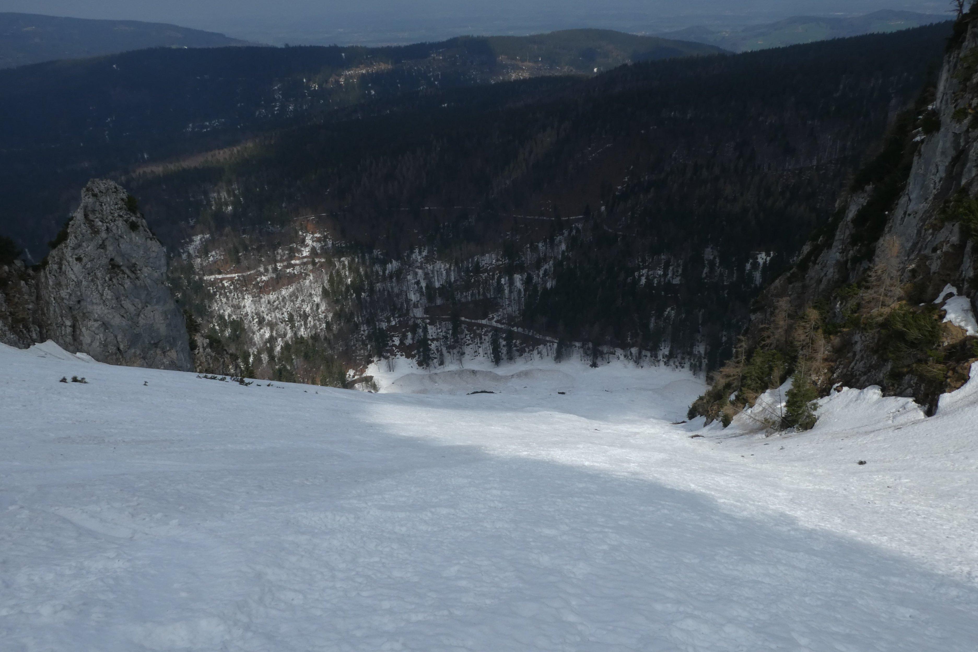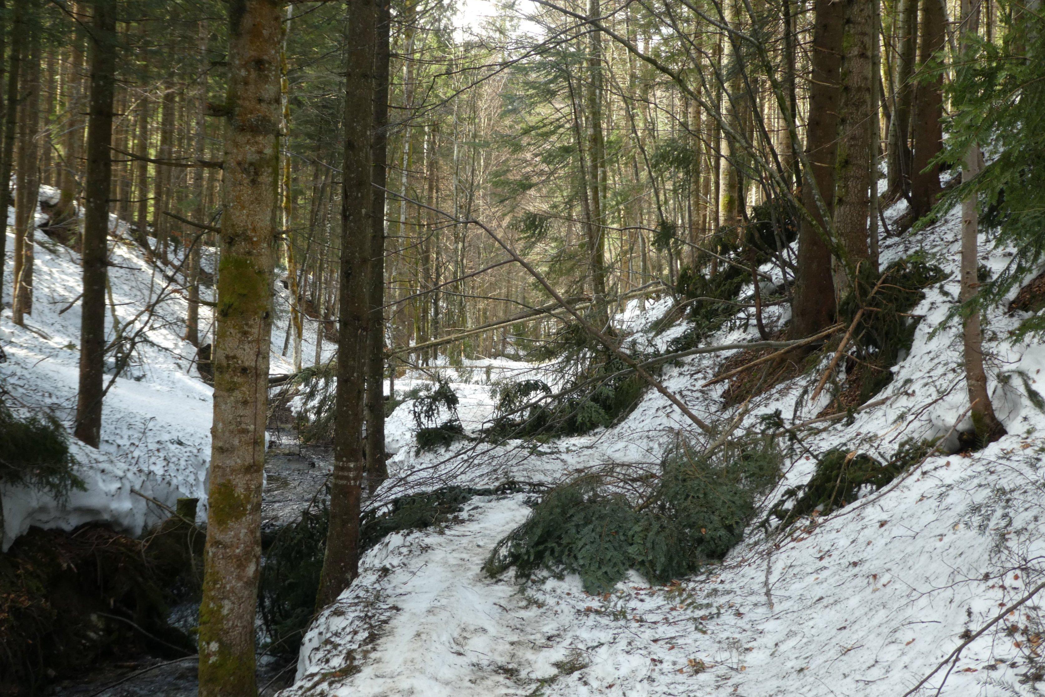 Nordseitig einigermaßen passable Bedingungen, viele alte Schneerutsche und schon einiges an Steinen in der Mur. Ein großer Steinschlag linkerhand im unteren Bereich des Murkars. Der Forstweg war ein Baummikado, mit wenigen Unterbrechungen ging es kurz oberhalb des Parkplatzes los, die Abfahrt gelang trickreich sogar bis zum Auto.
