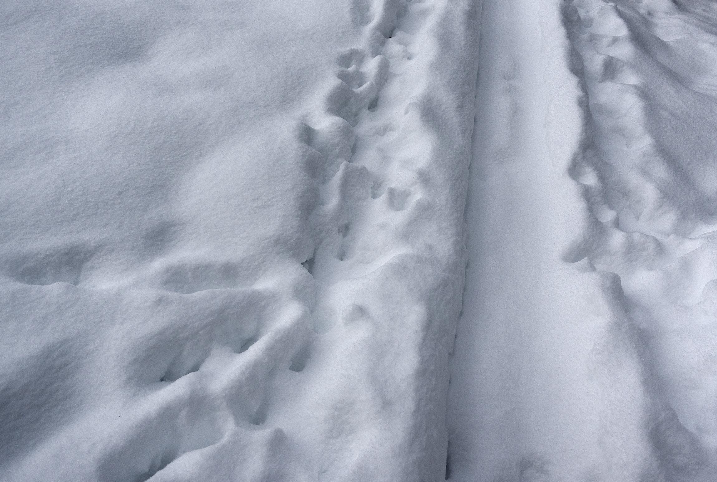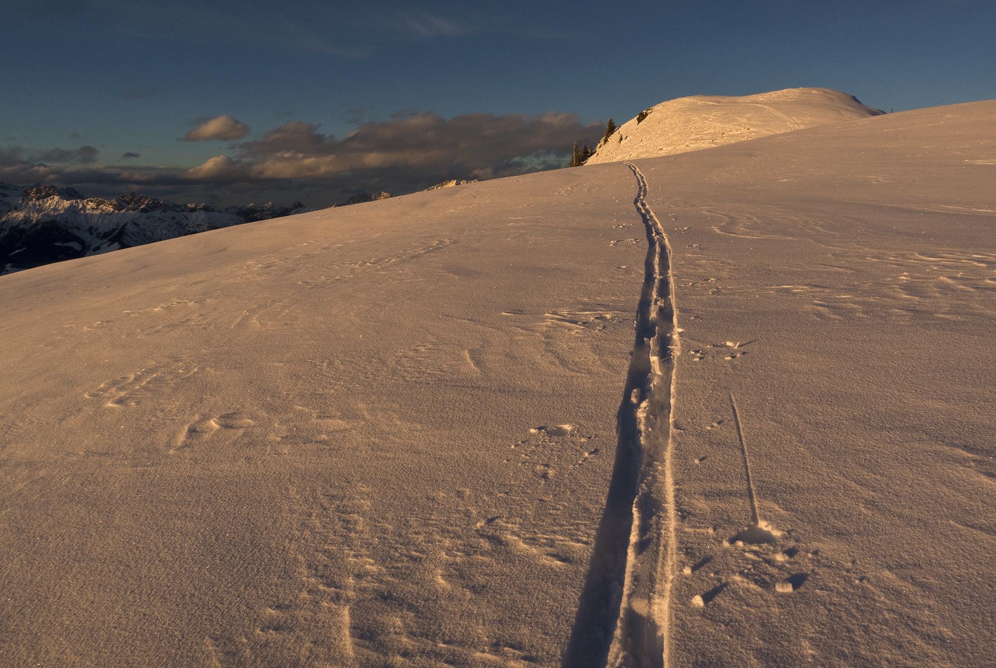 Der Schnee ist noch nicht zusammengefallen, 2cm neues Weiß liegt auf lockerem Pulverschnee. Schon nicht mehr so trocken wie in den ganz kalten Tagen, aber ein Traum zum Fahren. Trotzdem hatte ich ab und zu leichten Steinkontakt bei der Abfahrt, was wohl mehr meinem der dämmrigen Stunde unangepassten Fahrstil geschuldet war. Wenns nicht zu sehr draufregnet oder warm wird, ist die Tour noch gut fahrbar!
