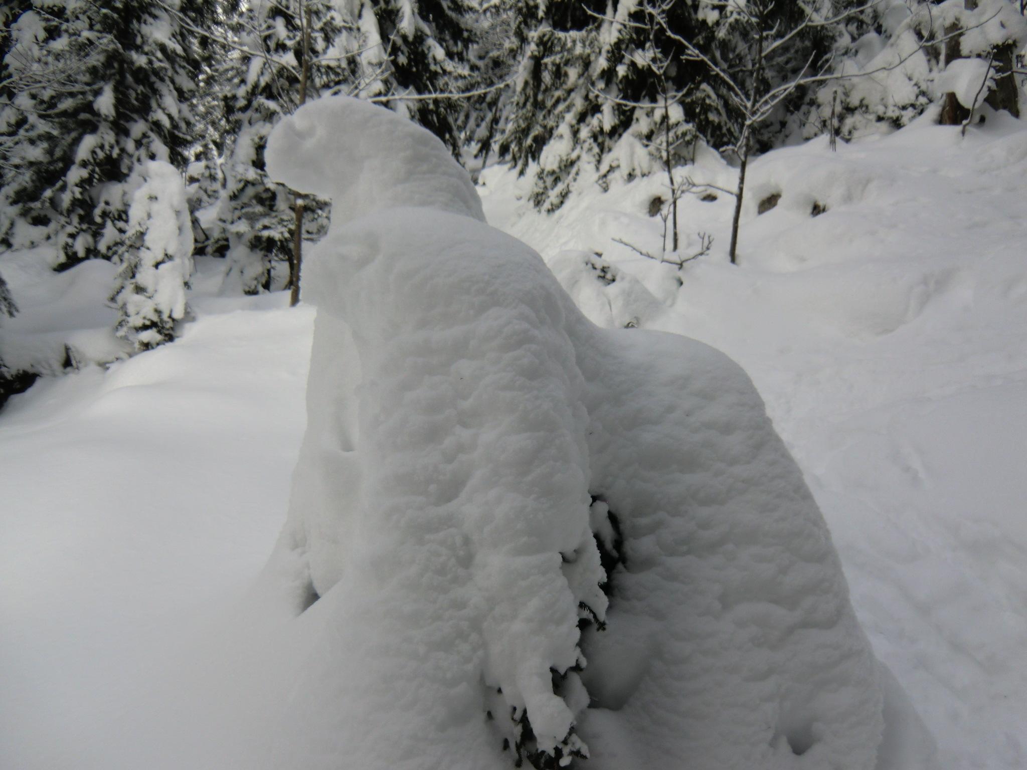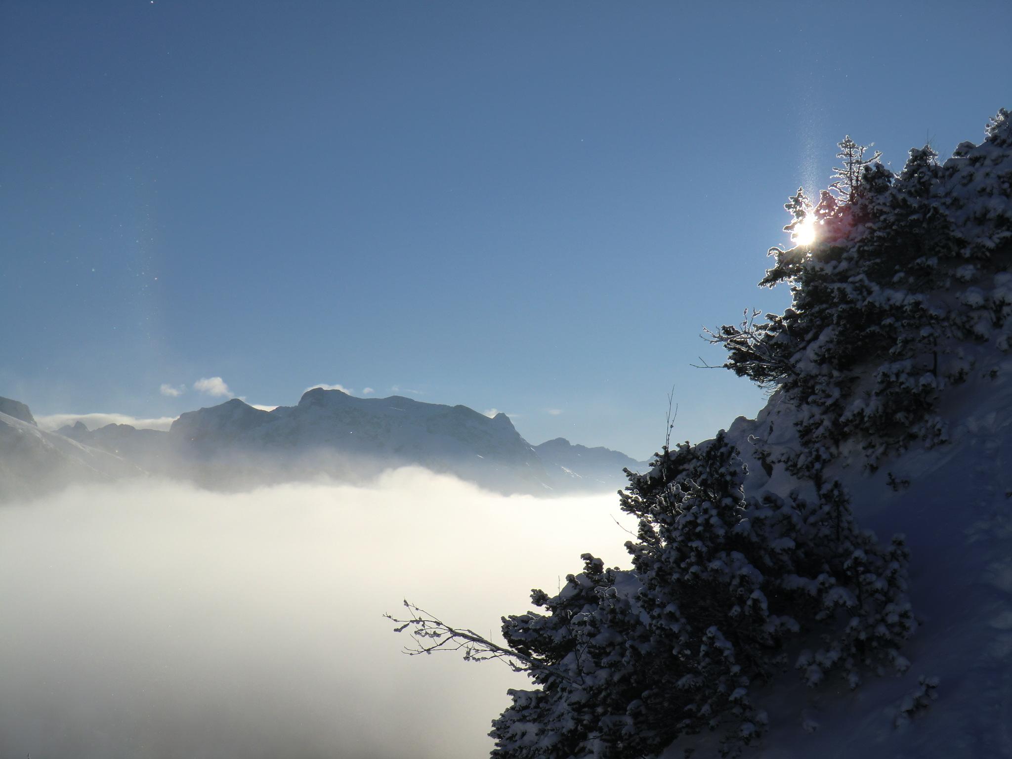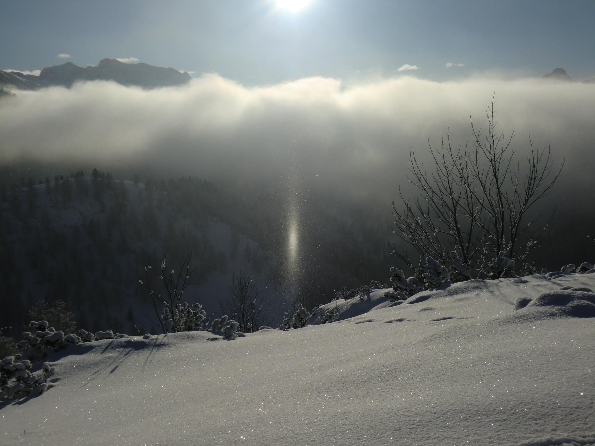 Zauberhaftes Wintermärchen mit Eiskristallen in der Luft und verschiedenen Lichterscheinungen. Wir sahen eine Lichtsäule und einen Bogen in den Spektralfarben,ähnlich einem Regenbogen. Am späten Vormittag noch Schneeflockentreiben aus der Hochnebelbewölkung bzw. den hohen Wolken, das ab Mittag aufhörte. Der Nebel wabberte ganztägig auf einer Grenze von 1500-1800m.