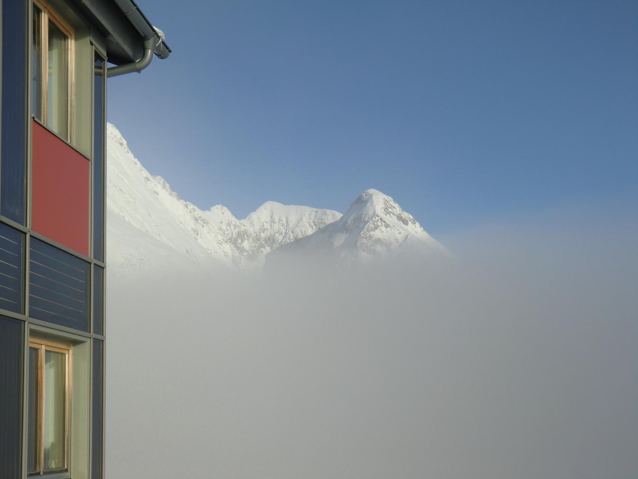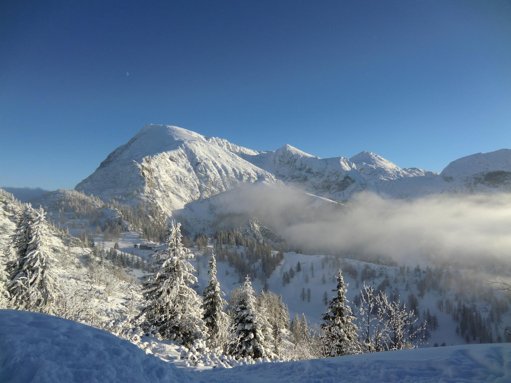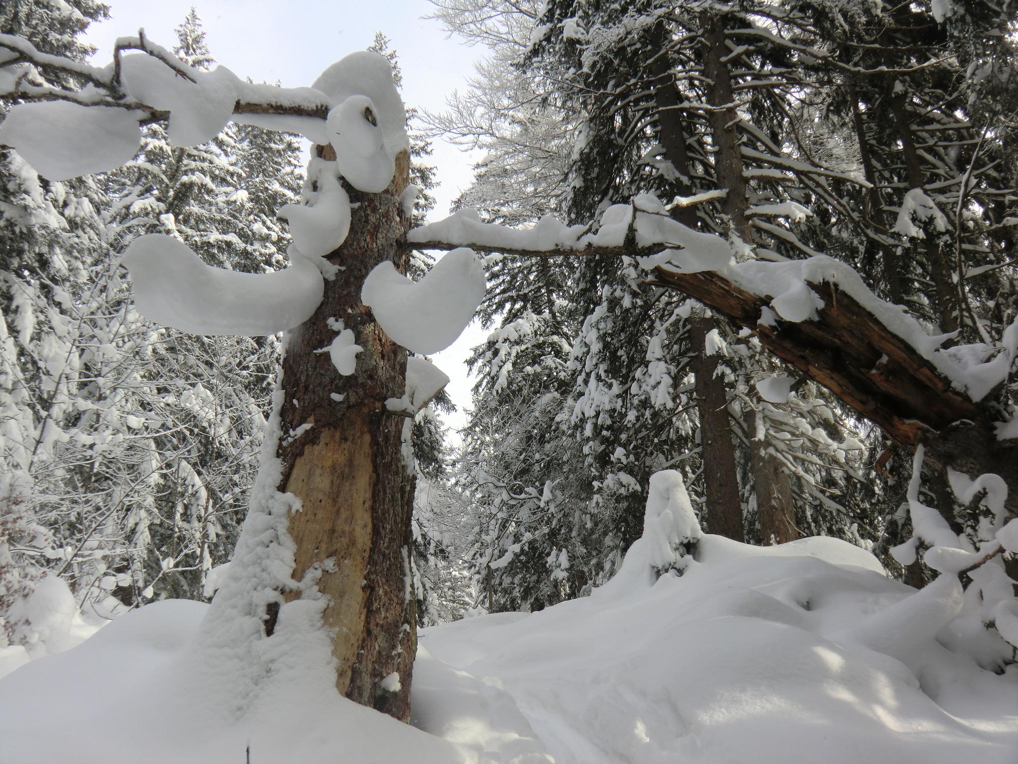Zauberhaftes Wintermärchen mit Eiskristallen in der Luft und verschiedenen Lichterscheinungen. Wir sahen eine Lichtsäule und einen Bogen in den Spektralfarben,ähnlich einem Regenbogen. Am späten Vormittag noch Schneeflockentreiben aus der Hochnebelbewölkung bzw. den hohen Wolken, das ab Mittag aufhörte. Der Nebel wabberte ganztägig auf einer Grenze von 1500-1800m.