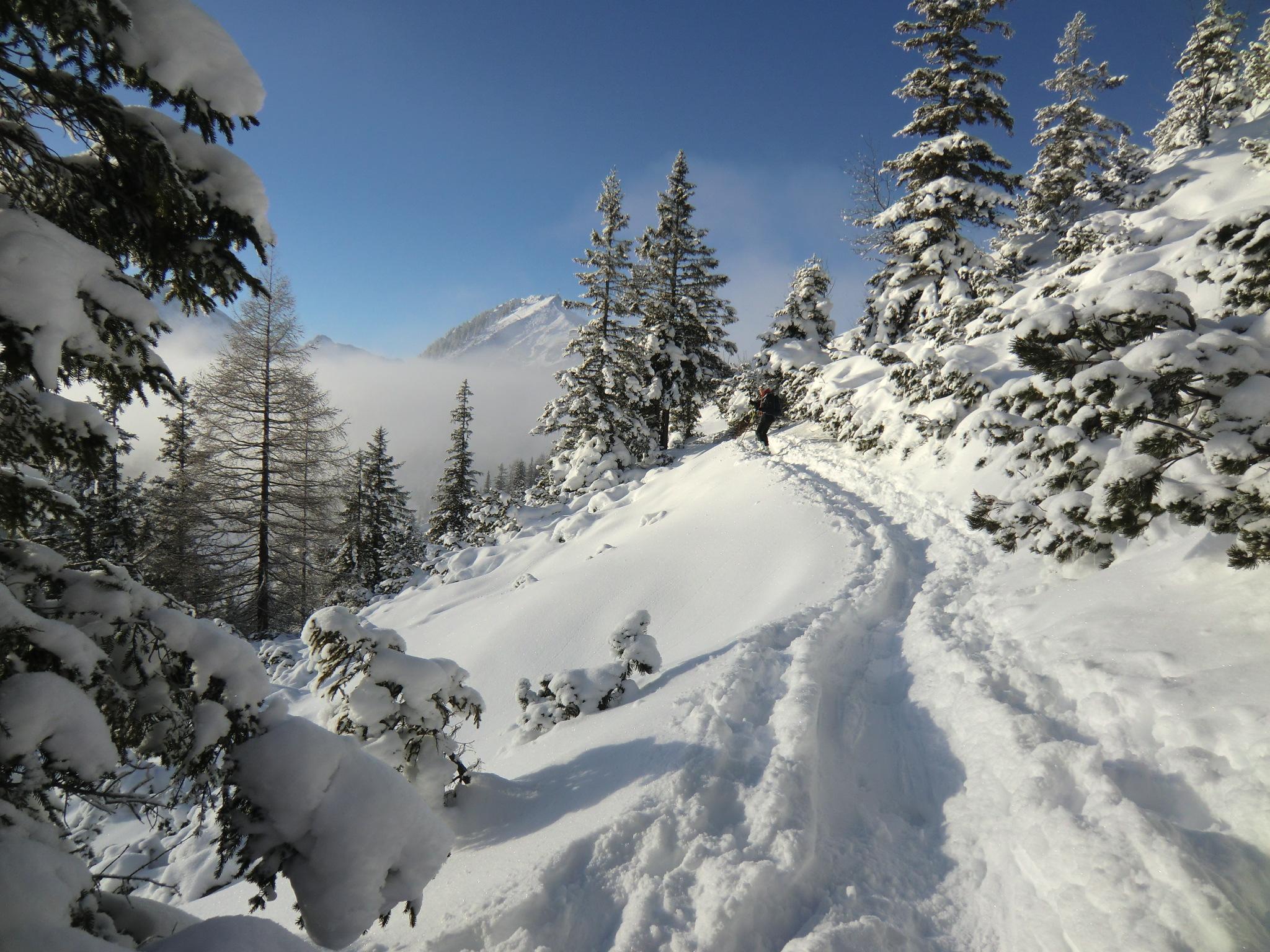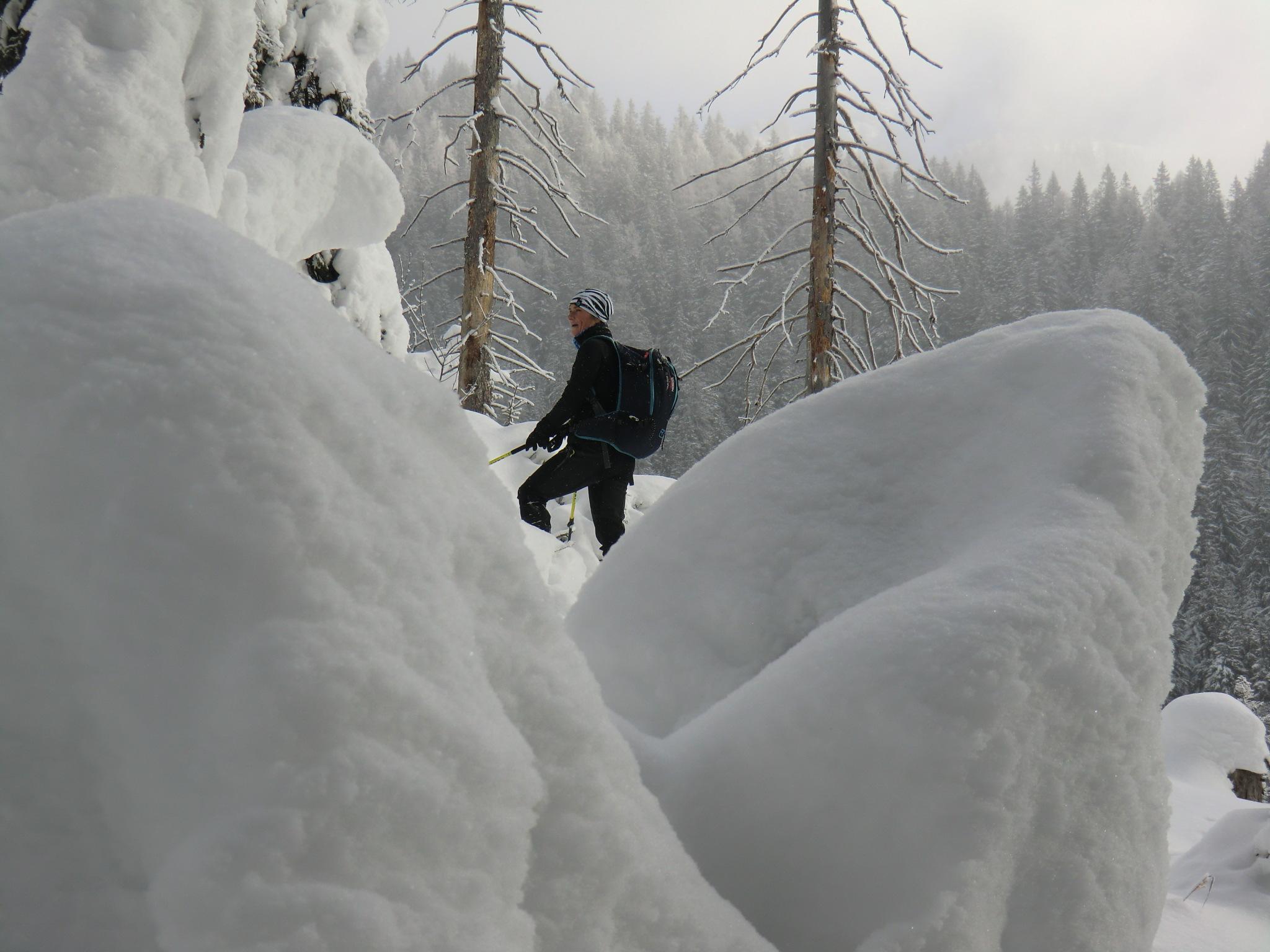 < 50 cm ungebundener Pulver; windunbehandelt; windstill; menschenstill; gute Abfahrtsbedingungen bis Mitterkaser, danach den Kunstschneebergen ausweichen.