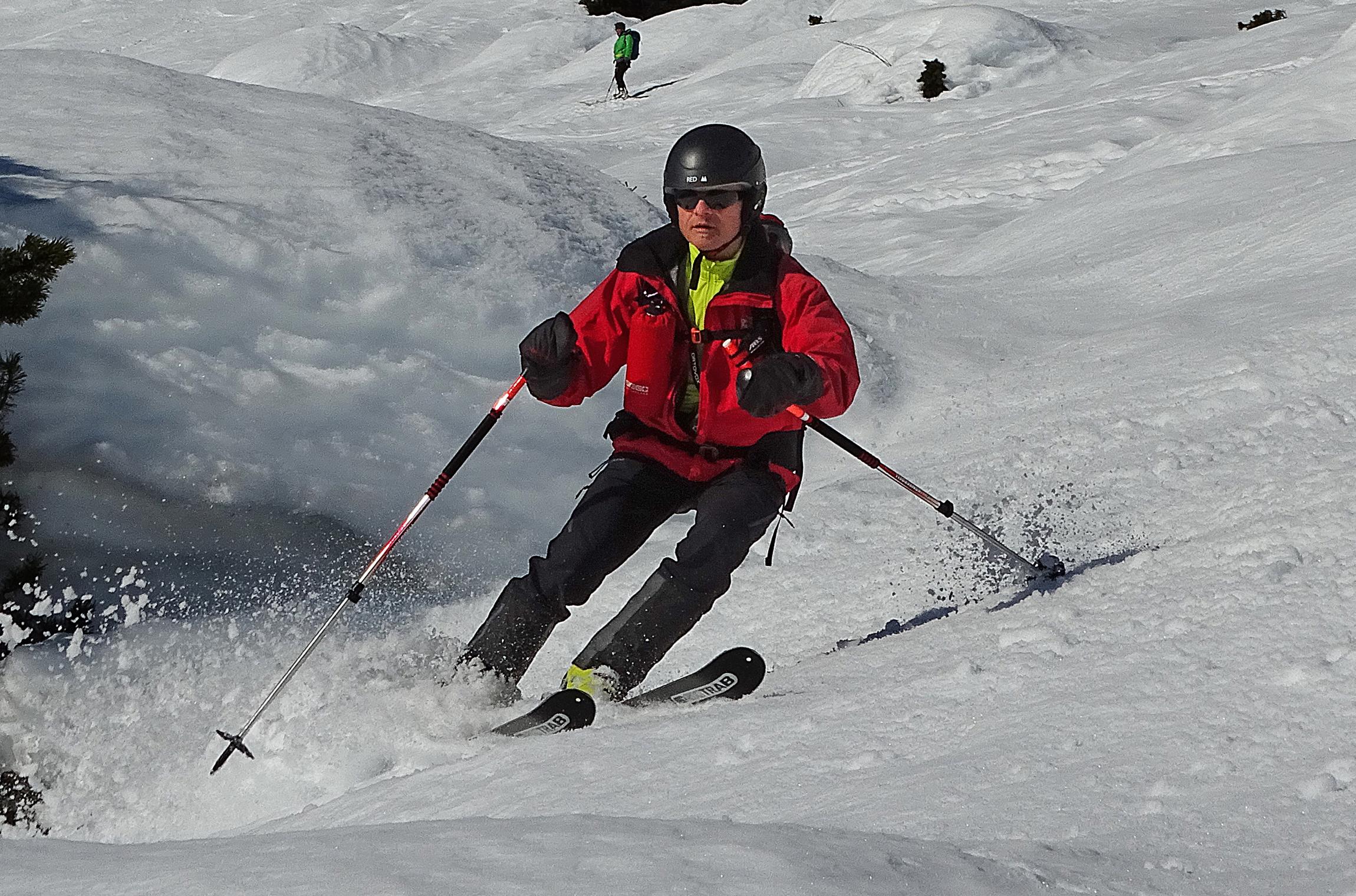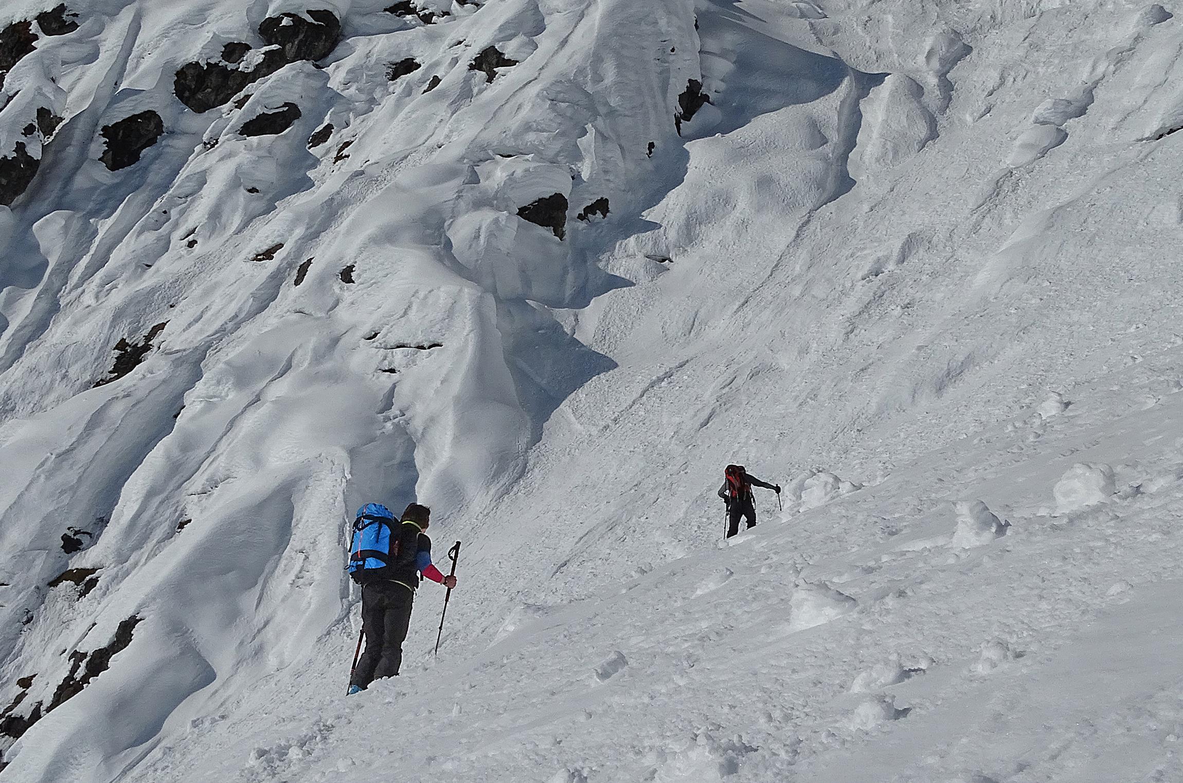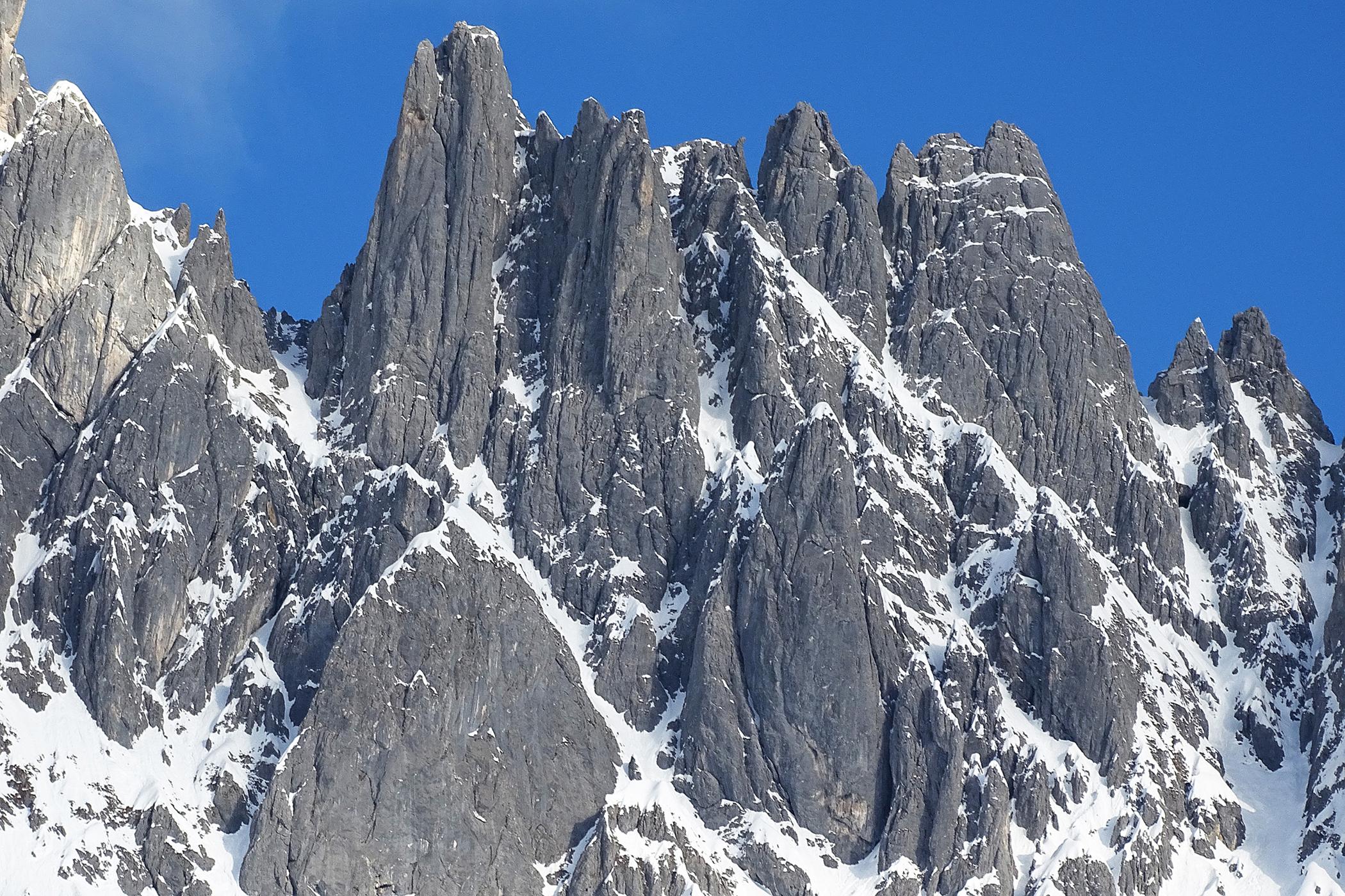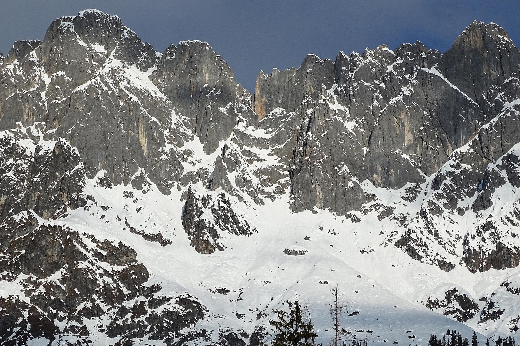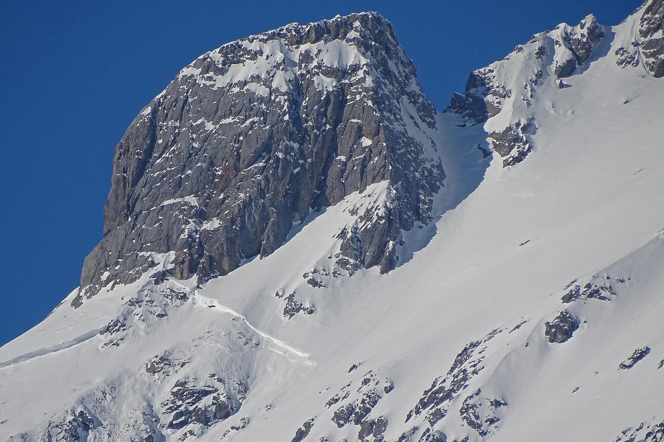 Die nasse Schneedecke gut durchgefroren, heute bei Sonnenschein feinen Firn erlebt. Der Brandholzriedl selten mit Lawinenkegel zerackert, die Schneemassen entladen sich meist über die beiden eingrenzenden Steilgräben, es geht bequem auf planer Fläche auf-und abwärts. Das Umfeld prächtig, die Spitzen der Mandlwände lassen so manches Klettererlebniss aus früheren Tagen hochkommen .