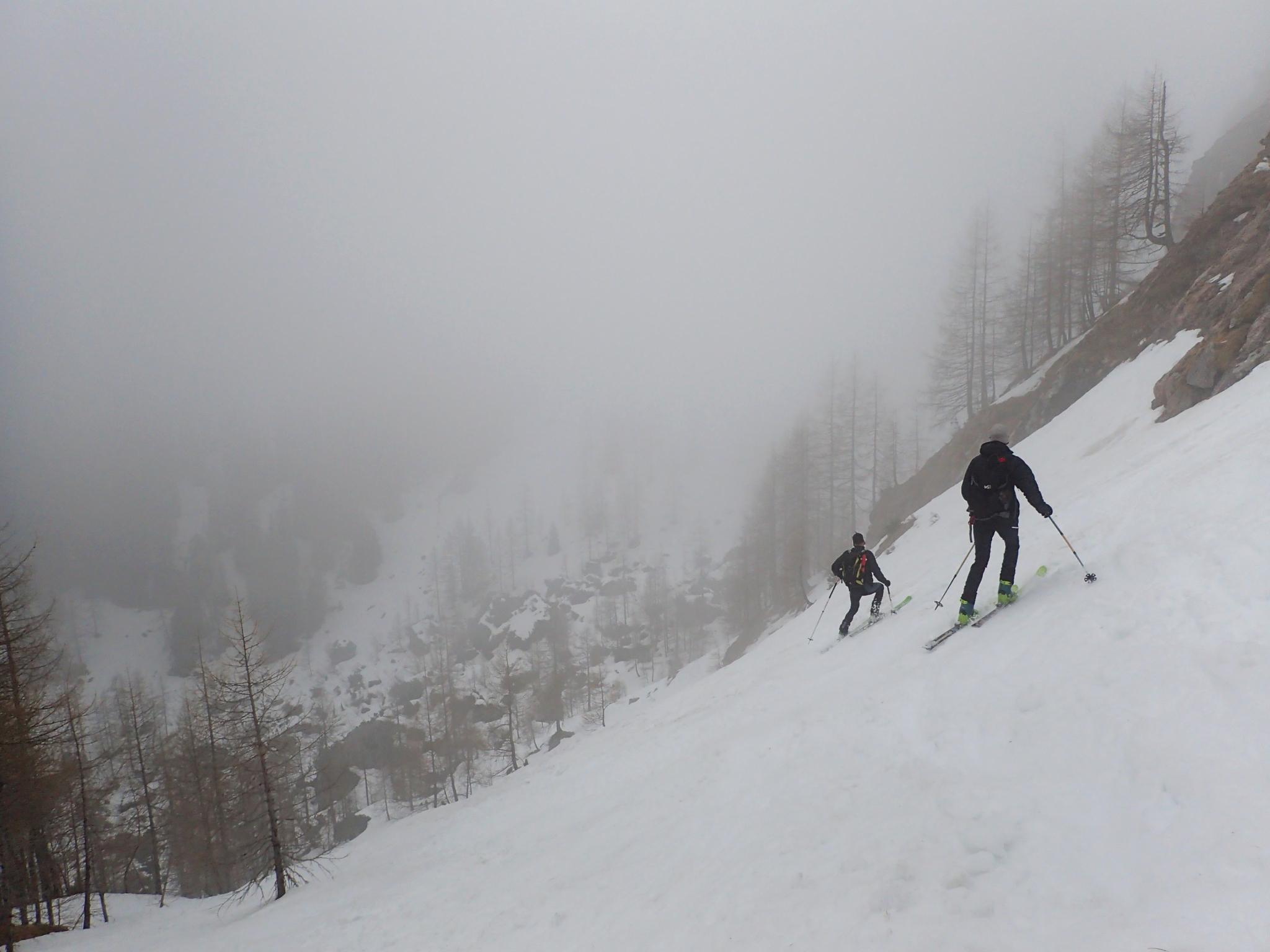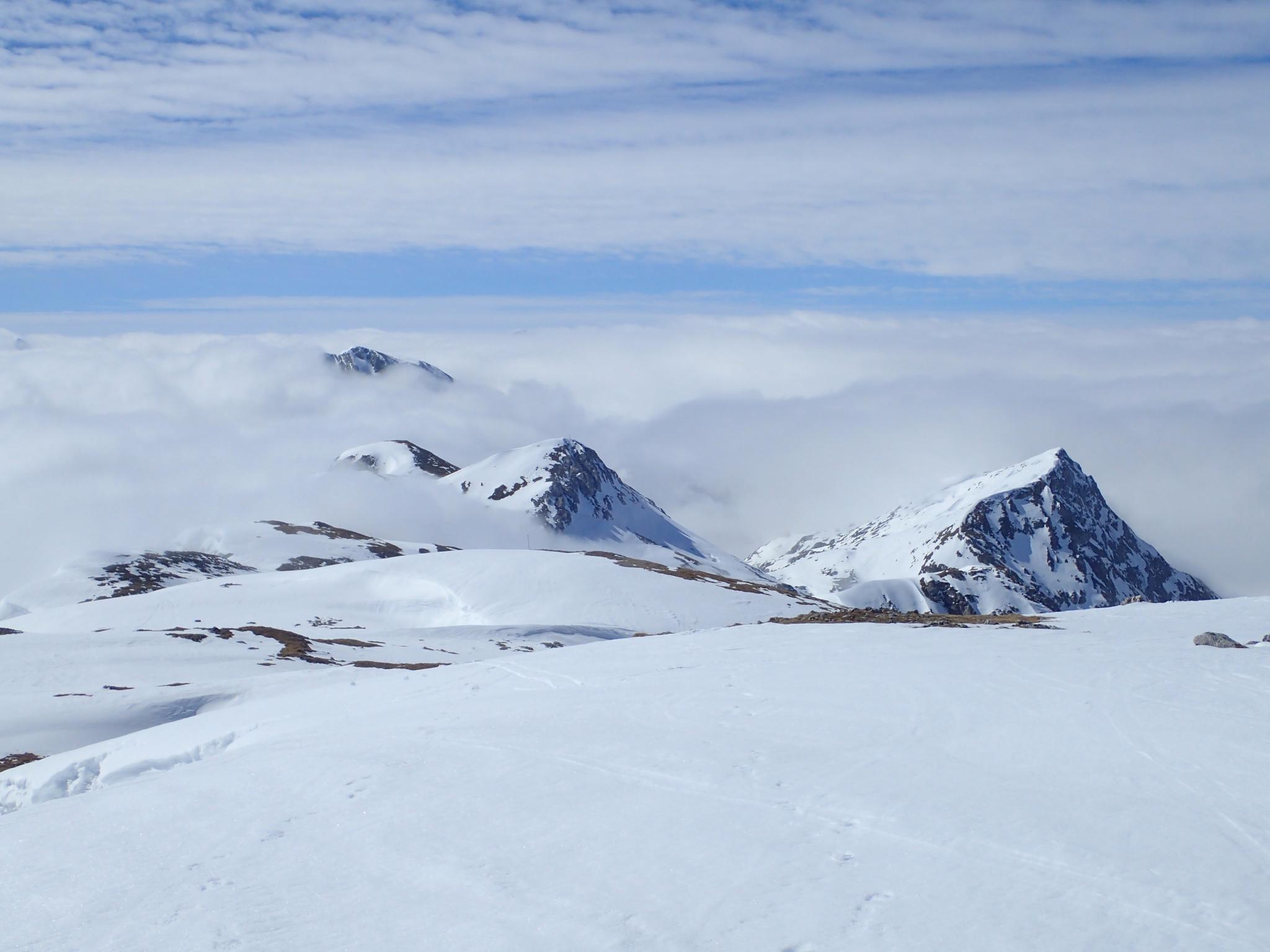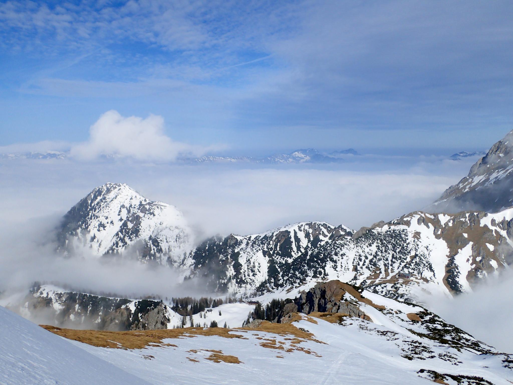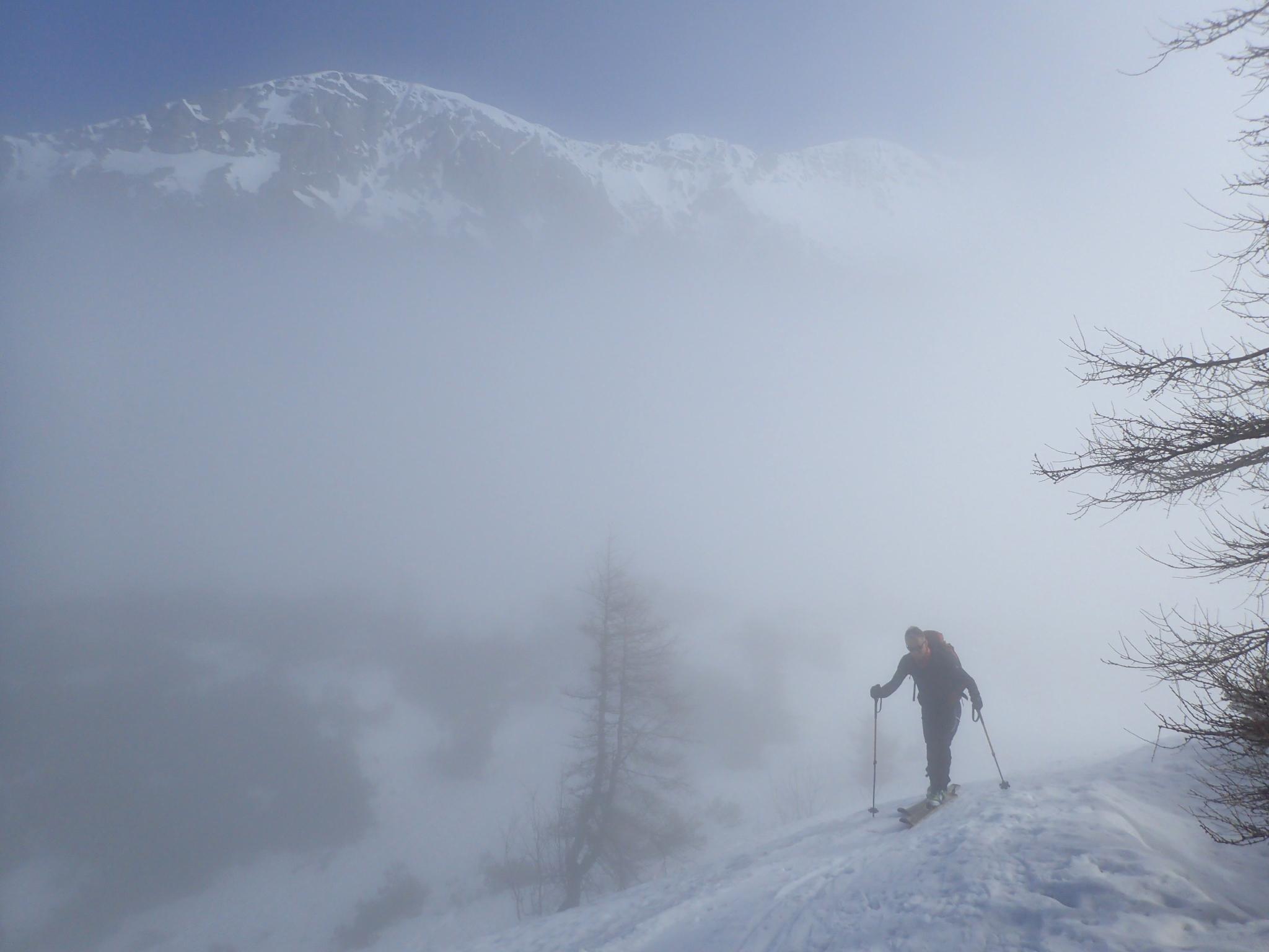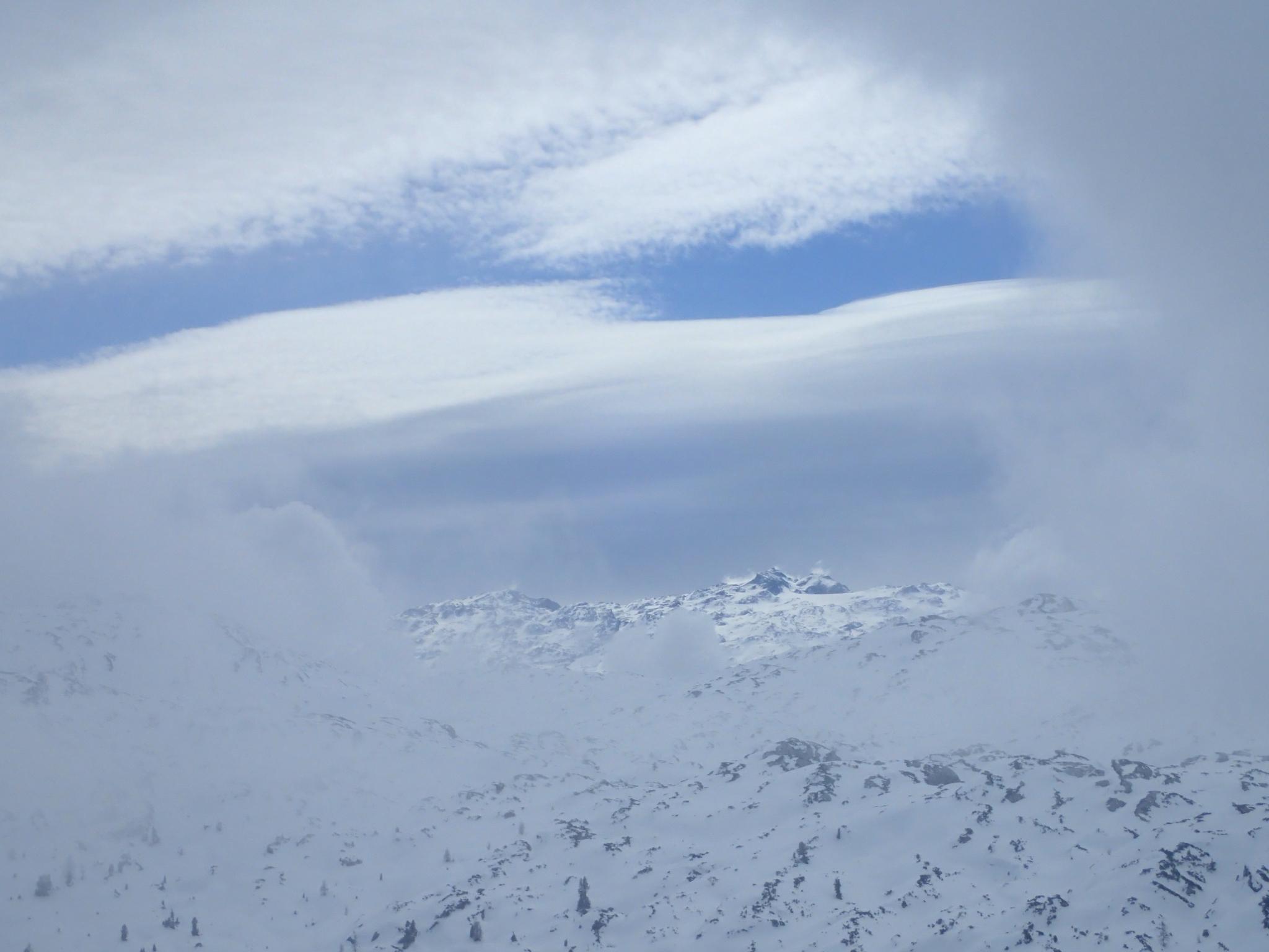 Wetter: Hochnebel bis ca. 1600 m – mit uns ansteigend. Wir warten am Schneibstein ungefähr 1 Stunde, dann reißt es auf und wir können in die Schlum abfahren. Beim Wiederaufstieg neuerlicher Nebeleinfall und im dichten Gebräu auf den Windschartenkopf. Dort warten wir wieder und nützen ein kurzes Aufreißen für die Abfahrt. Nach gut 150 HM tauchen wir in die Suppe ein und suchen entlang von Spuren der Vortage im grauen Nichts die Einfahrt zum Reinersbergbrückerl. Nebeluntergrenze bei 1800 m. Als wir die Ski abschnallen, scheint wieder die Sonne und der Nebel löst sich langsam auf.