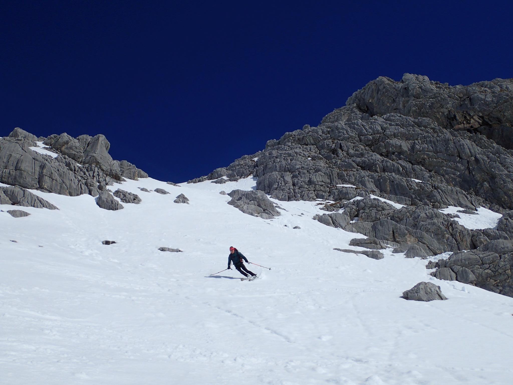 Wie überall sehr wenig von der weißen Pracht, am Schneibstein mit kurzem Abschnallen über die Latschenstufe. Ansonsten ausreichend. Aufstieg griffig hart, aber gut ohne Harscheisen machbar. Abfahrt Schlum bester Firn, Abfahrt Windschartenkopf firnig, im Nebel tragfähiger Harsch, rippelig von alten Spuren. Jennerpiste patzig, der unterste Hang wegen eines am Vormittag ausgetragenen Skirennens sehr gut präpariert und künstlich vereist – am Nachmittag herrlicher Firn.