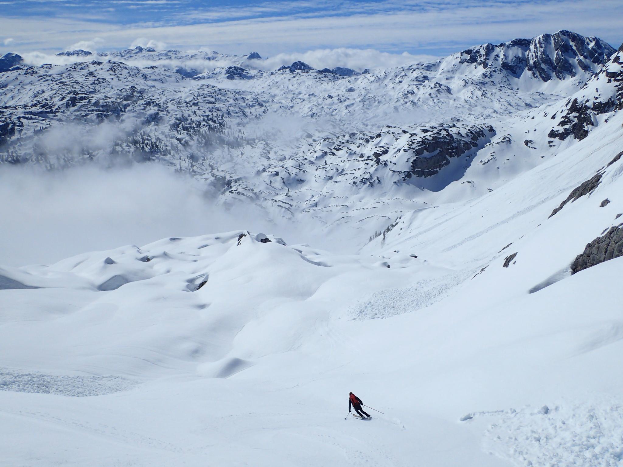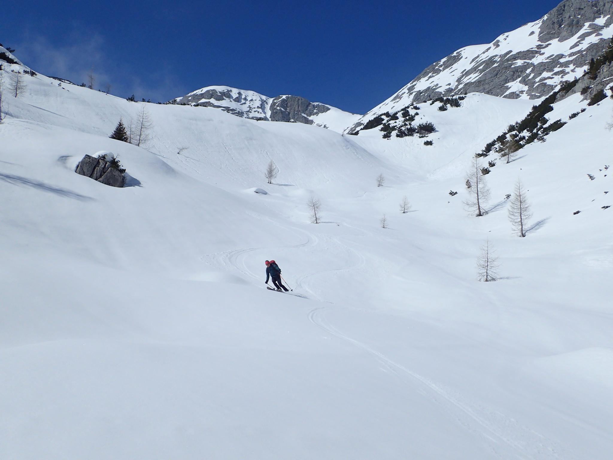 Aufstieg Hinterbrand – Jennerpiste – Stahlhaus – Schneibstein – Abfahrt Schlum bis auf Höhe Jagdhütte – Gegenanstieg über Schlumkopf auf den Windschartenkopf – Abfahrt Reinersbergbrückerl – Gegenanstieg Schneibsteinhaus – Jennerpiste – Abfahrt Hinterbrand