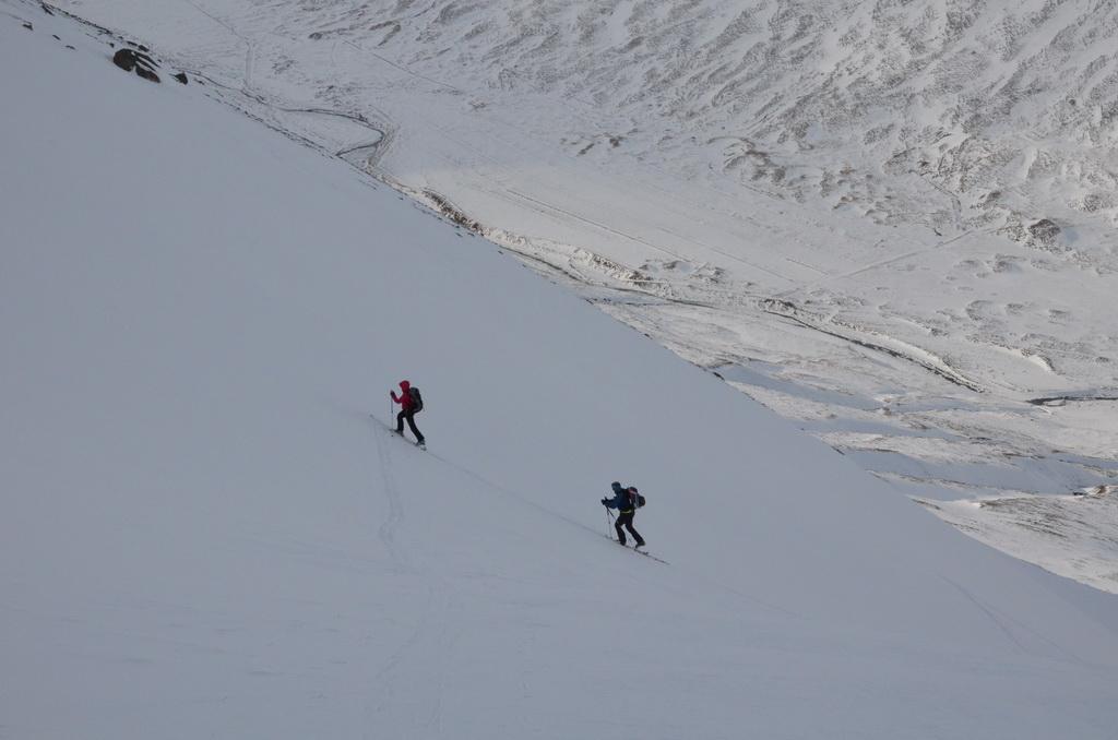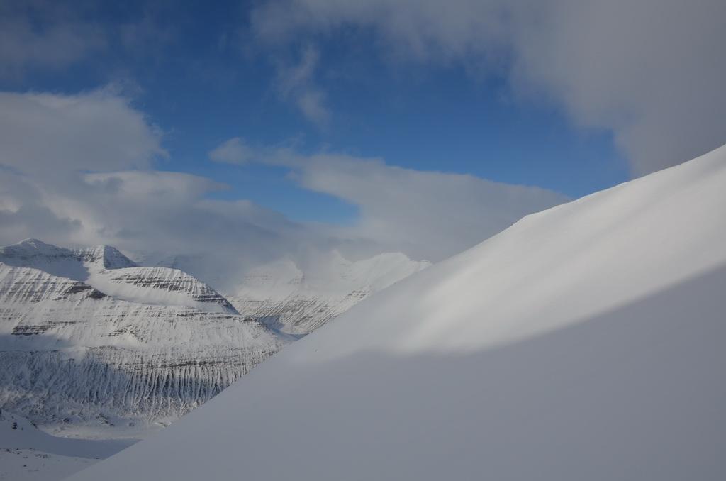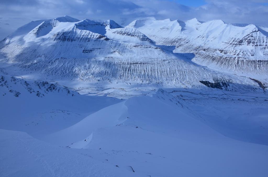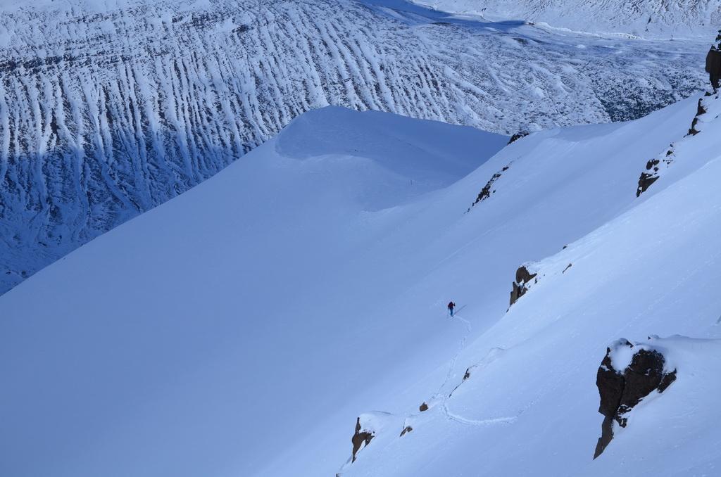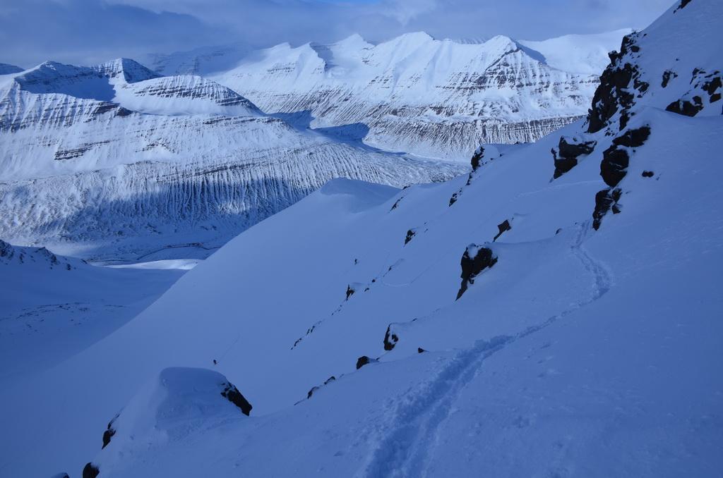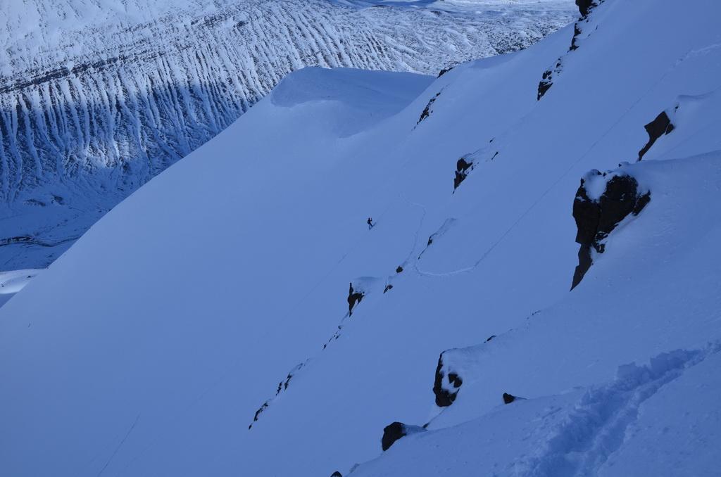 Heute hatten wir eine super schöne Schitour im Skíðadalur Valley über durchaus anspruchsvolles Schigelände auf einen grossartigen Aussichtsgipfel. Im unteren Abschnitt fanden wir auch hier eine relativ geringe Schneeauflage vor, allerdings konnten wir über die vielen Mulden perfekt bis zum Auto abfahren. Lawinenaktivitäten konnten wir keine beobachten. Im oberen steilen Bereich fanden wir eine bereits gut gesetzte Schneedecke vor die perfekt zum Fahren war. Weiter unten dann Firn Verhältnisse.