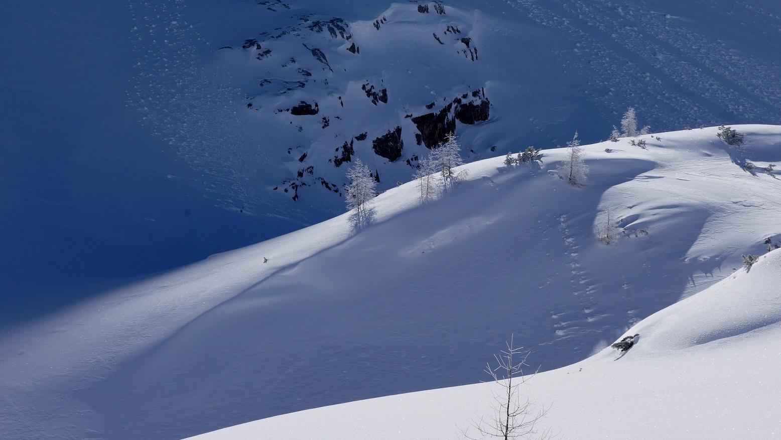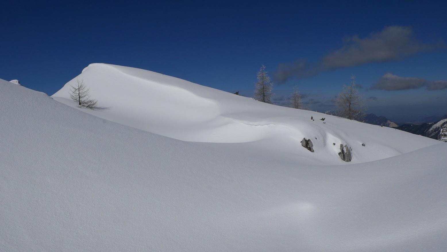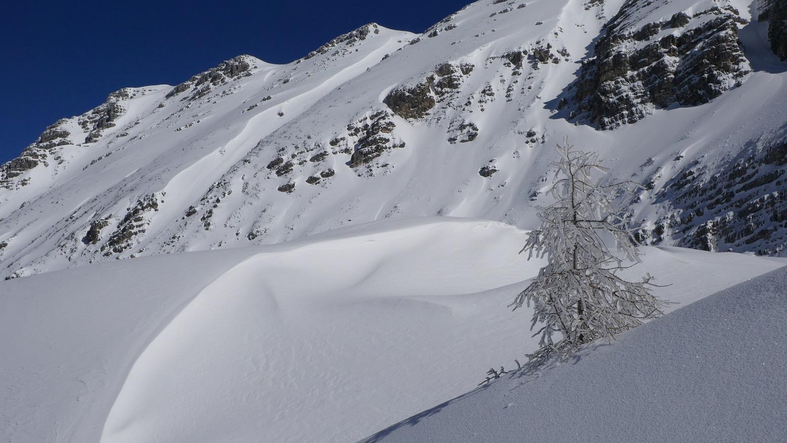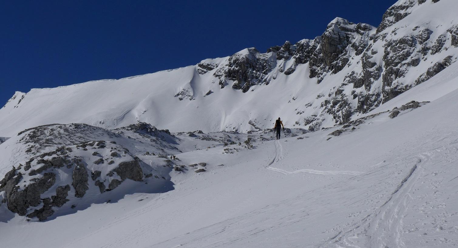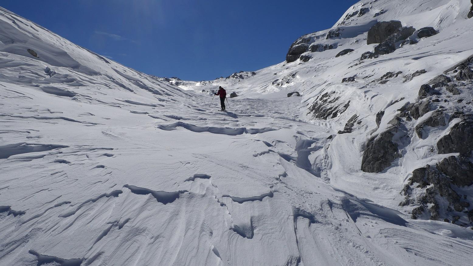 Tour nordseitig, nur die Verbindung zwischen den beiden Scharten südseitig. Keine Lawinenbeabachtungen, da ist auch auf 2.000m recht wenig Neuschnee, aber zahlreiche Windspuren sind erkennbar. Den wenigen Neuschnee hat´s natürlich irgendwohin verblasen, wir finden bei Anstieg und Abfahrt aber kaum nennenswerte Triebschneeansammlungen, die man nicht sofort erkennen würde.