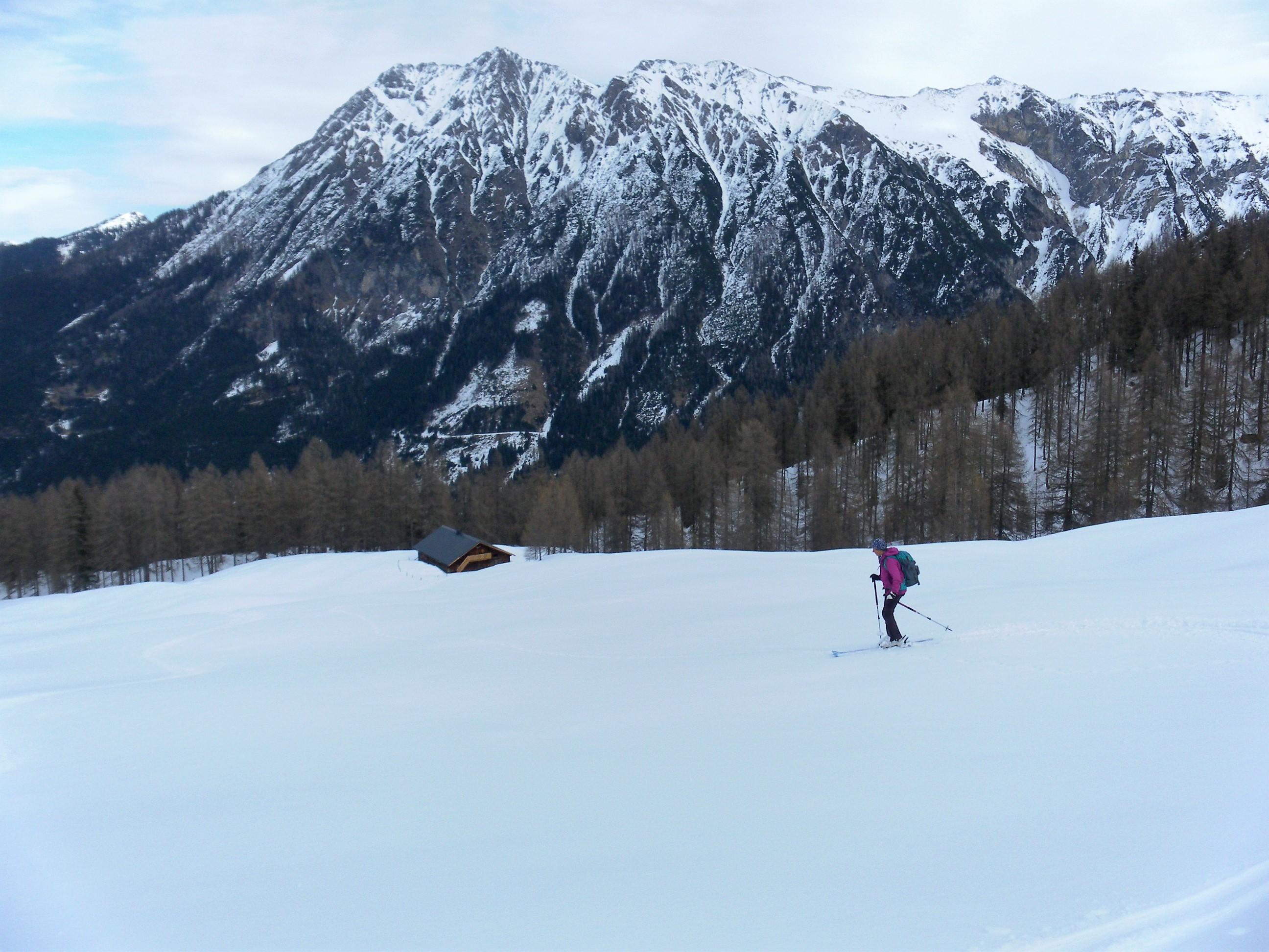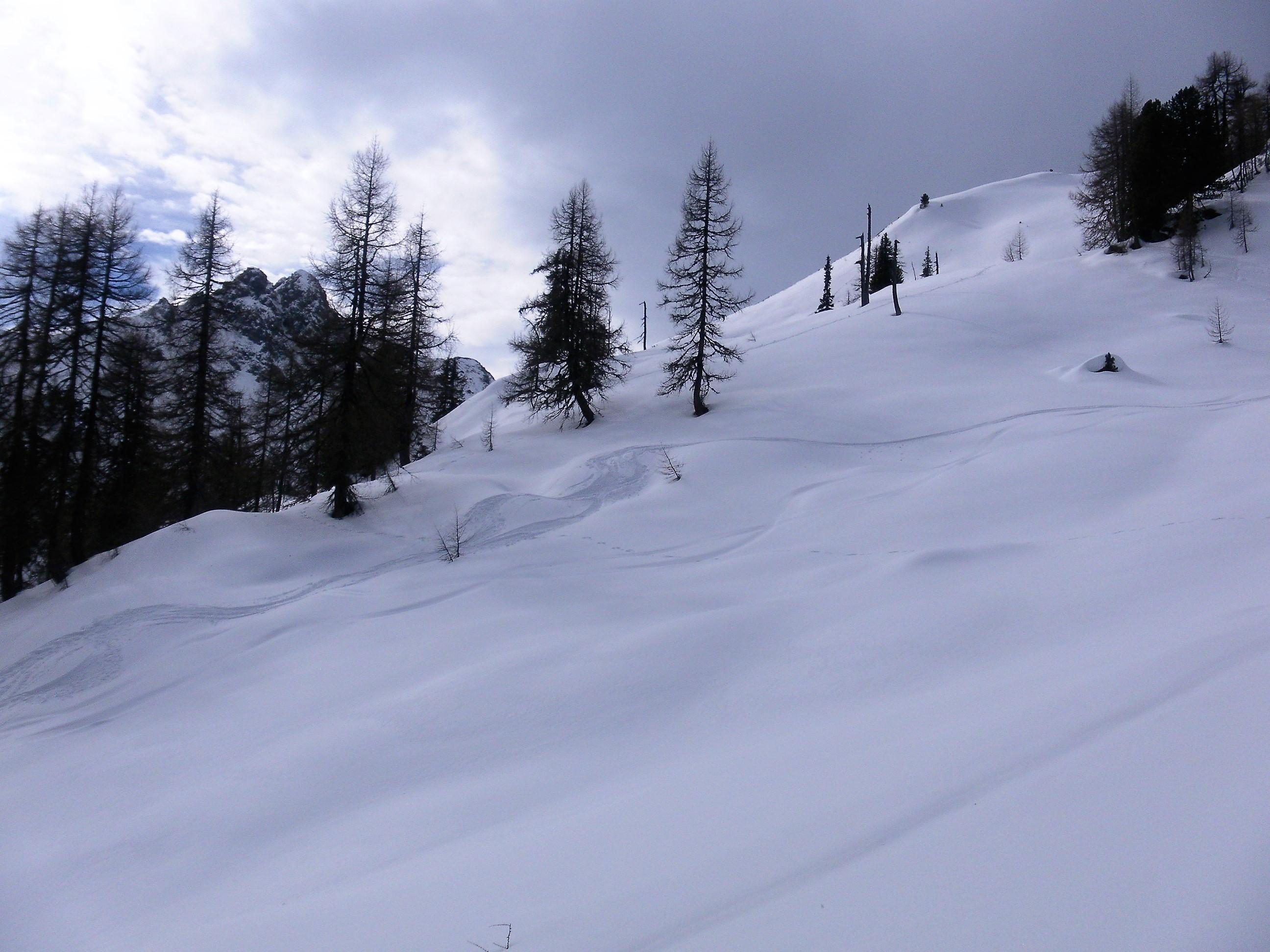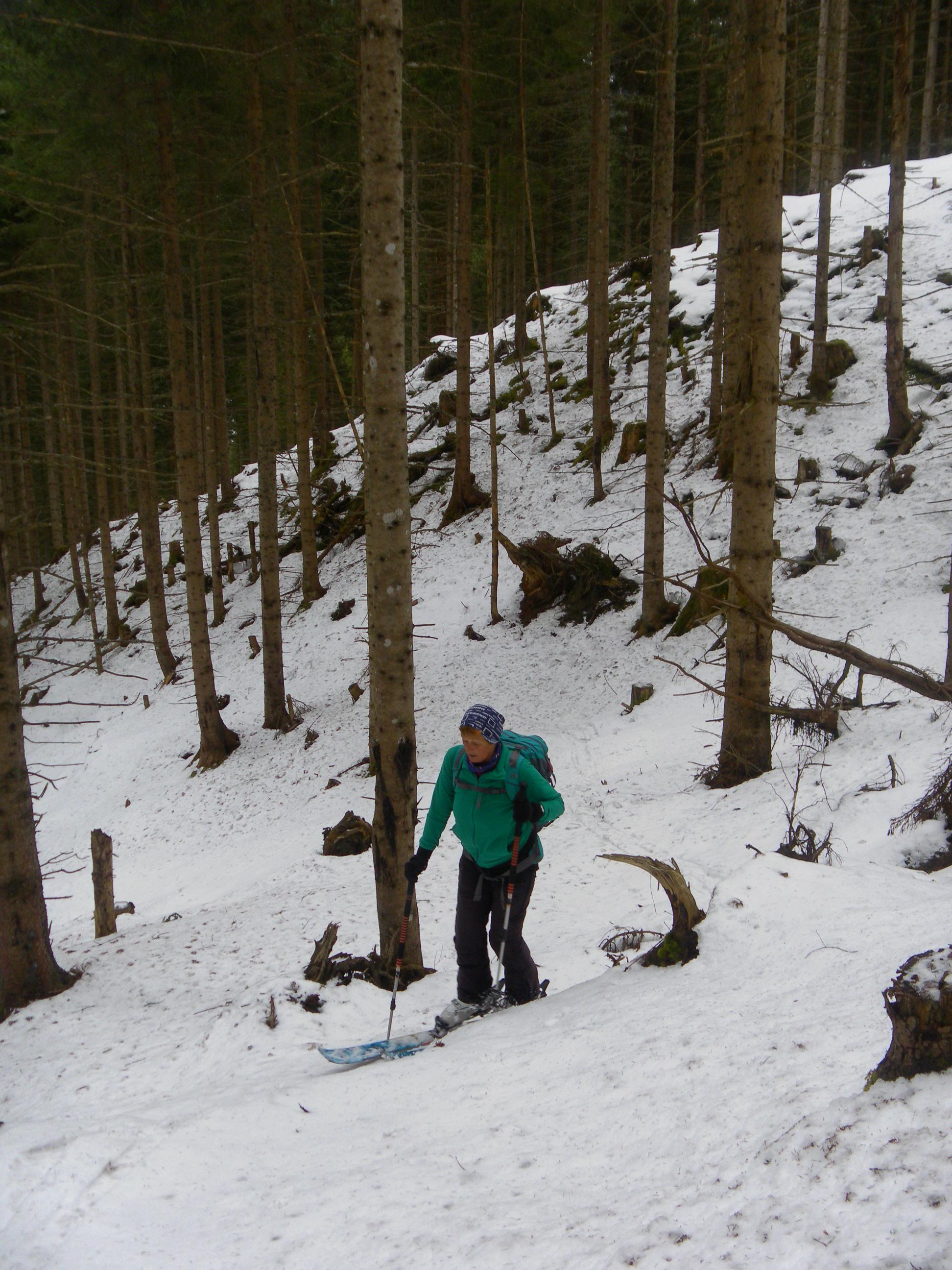 Der Direktanstieg vom Jägersee über den steilen Bergwald ist gerade möglich, aber nicht für die Abfahrt geeignet (wenig Faulschnee). Die schütter bewaldete Maureckalm und die Südhänge zum Herrenköpfl haben genügend Schnee. Der ist schon morgens durchfeuchtet. Vom Loosbichl fahren wir den Maureckgraben auf recht erfreulichem leichten Sulz mit tragendem Untergrund bis zur Forststraße ab. In den oberen Serpentinen Bremsschnee, der dann in der unteren langen Traverse komplett weggeschert wurde (Fußmarsch).