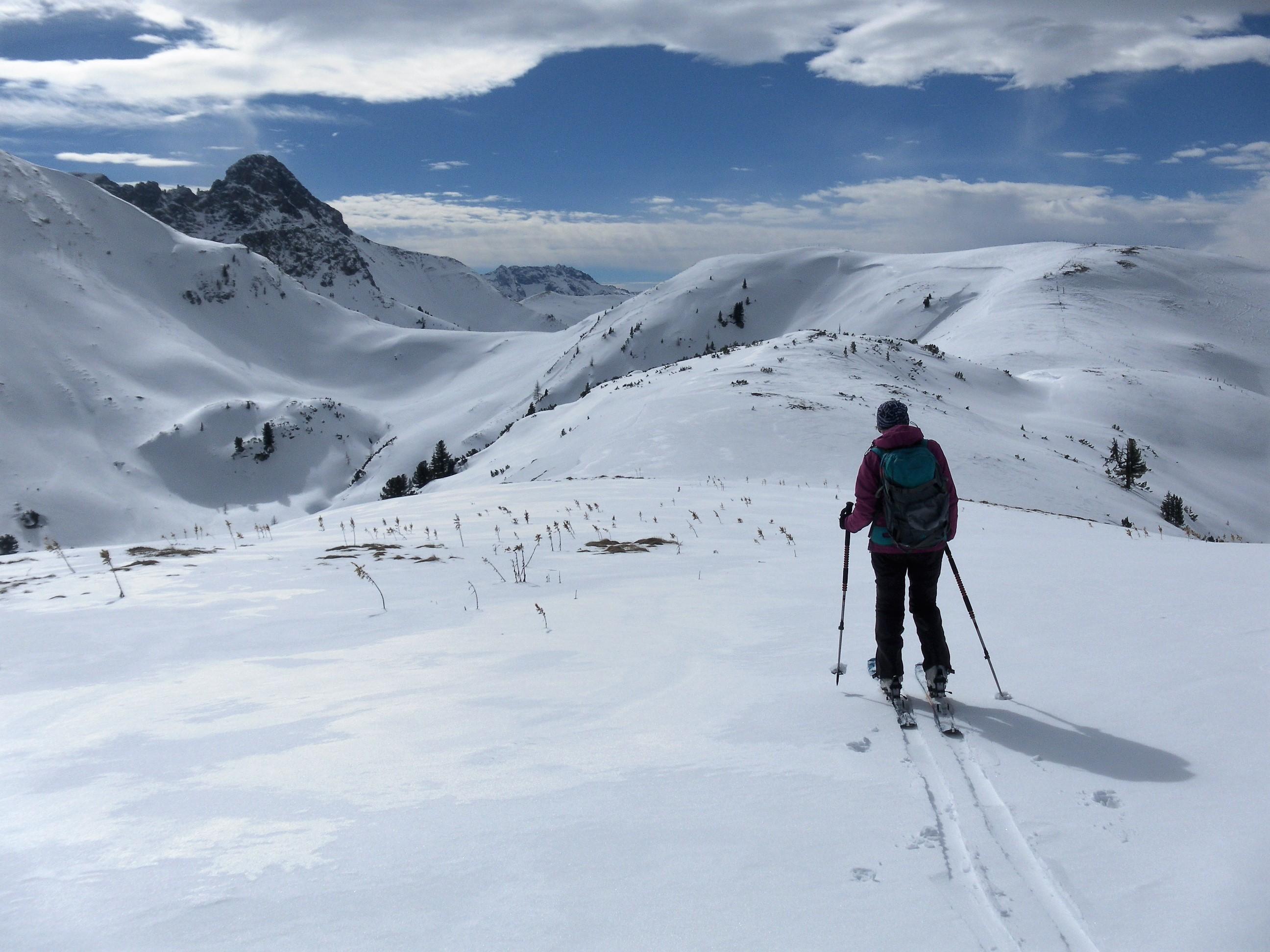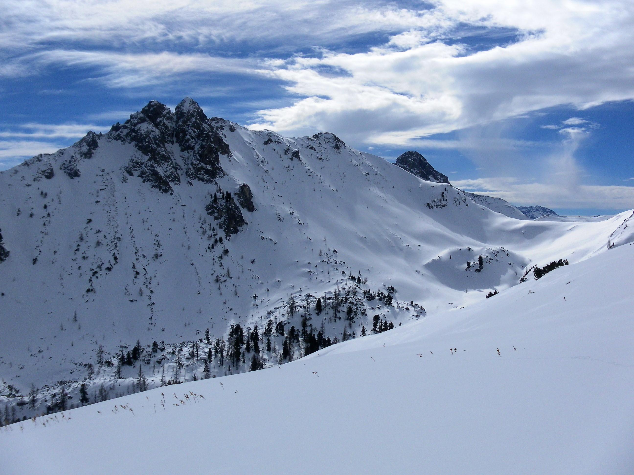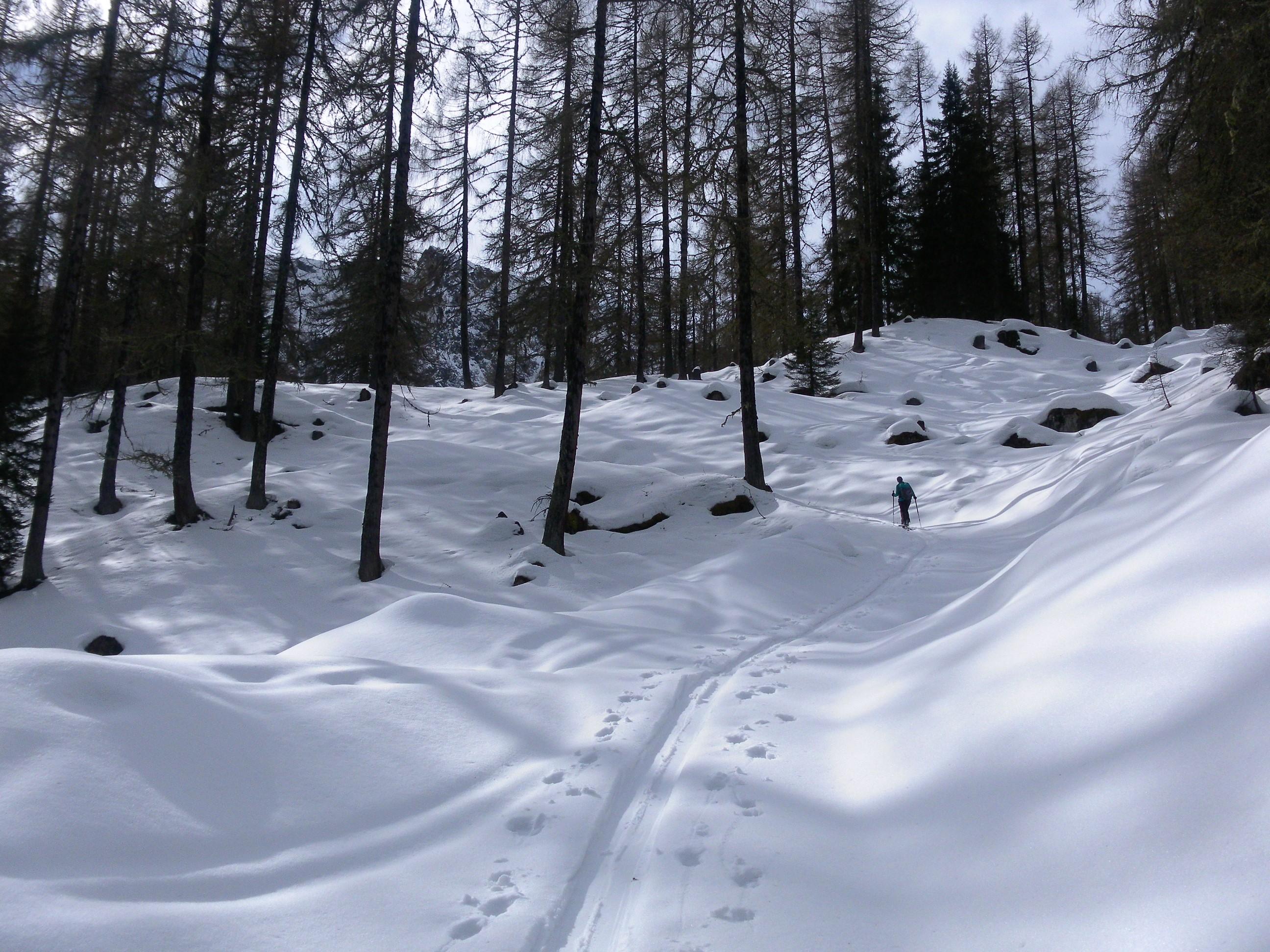 Der Direktanstieg vom Jägersee über den steilen Bergwald ist gerade möglich, aber nicht für die Abfahrt geeignet (wenig Faulschnee). Die schütter bewaldete Maureckalm und die Südhänge zum Herrenköpfl haben genügend Schnee. Der ist schon morgens durchfeuchtet. Vom Loosbichl fahren wir den Maureckgraben auf recht erfreulichem leichten Sulz mit tragendem Untergrund bis zur Forststraße ab. In den oberen Serpentinen Bremsschnee, der dann in der unteren langen Traverse komplett weggeschert wurde (Fußmarsch).