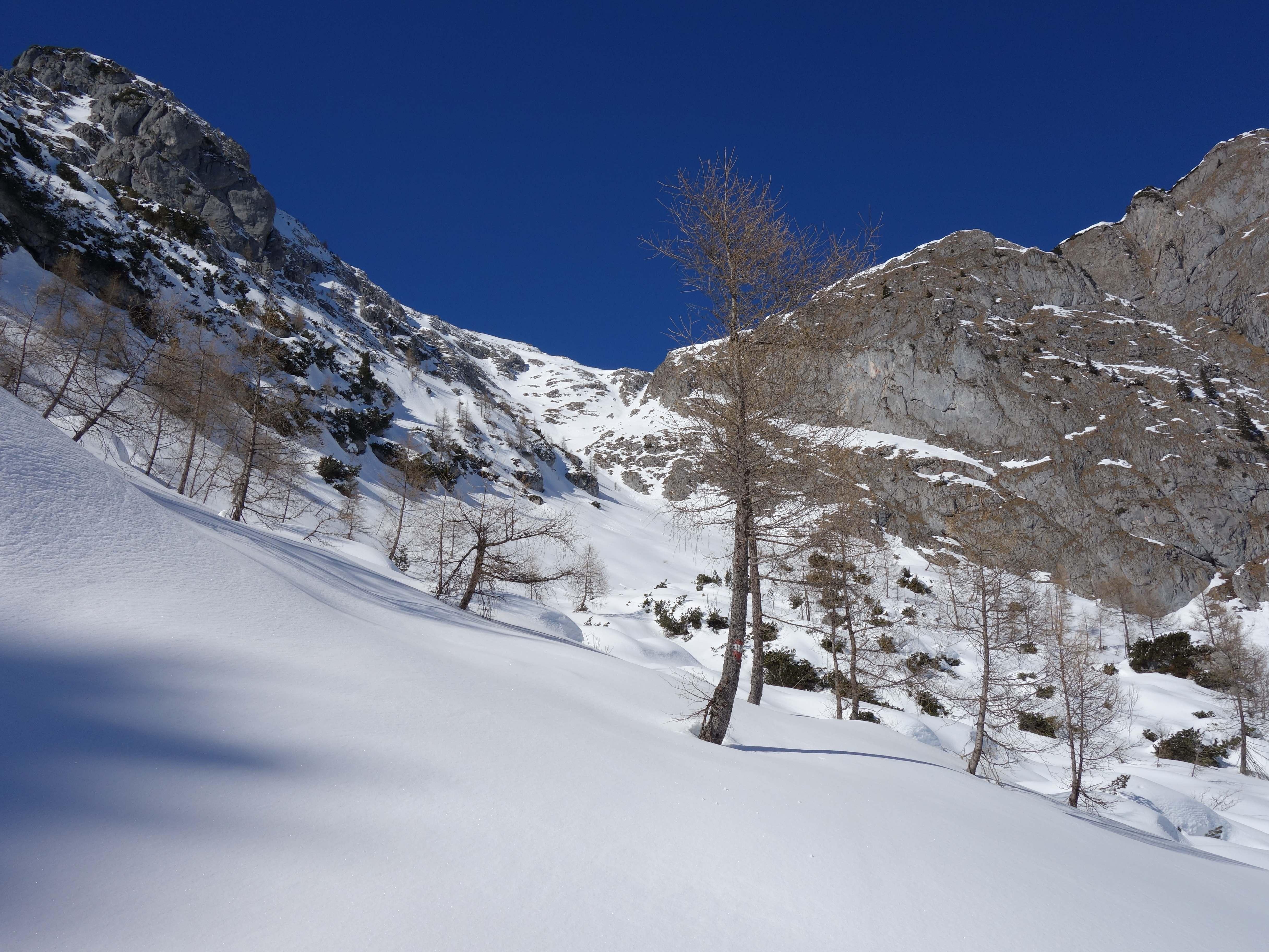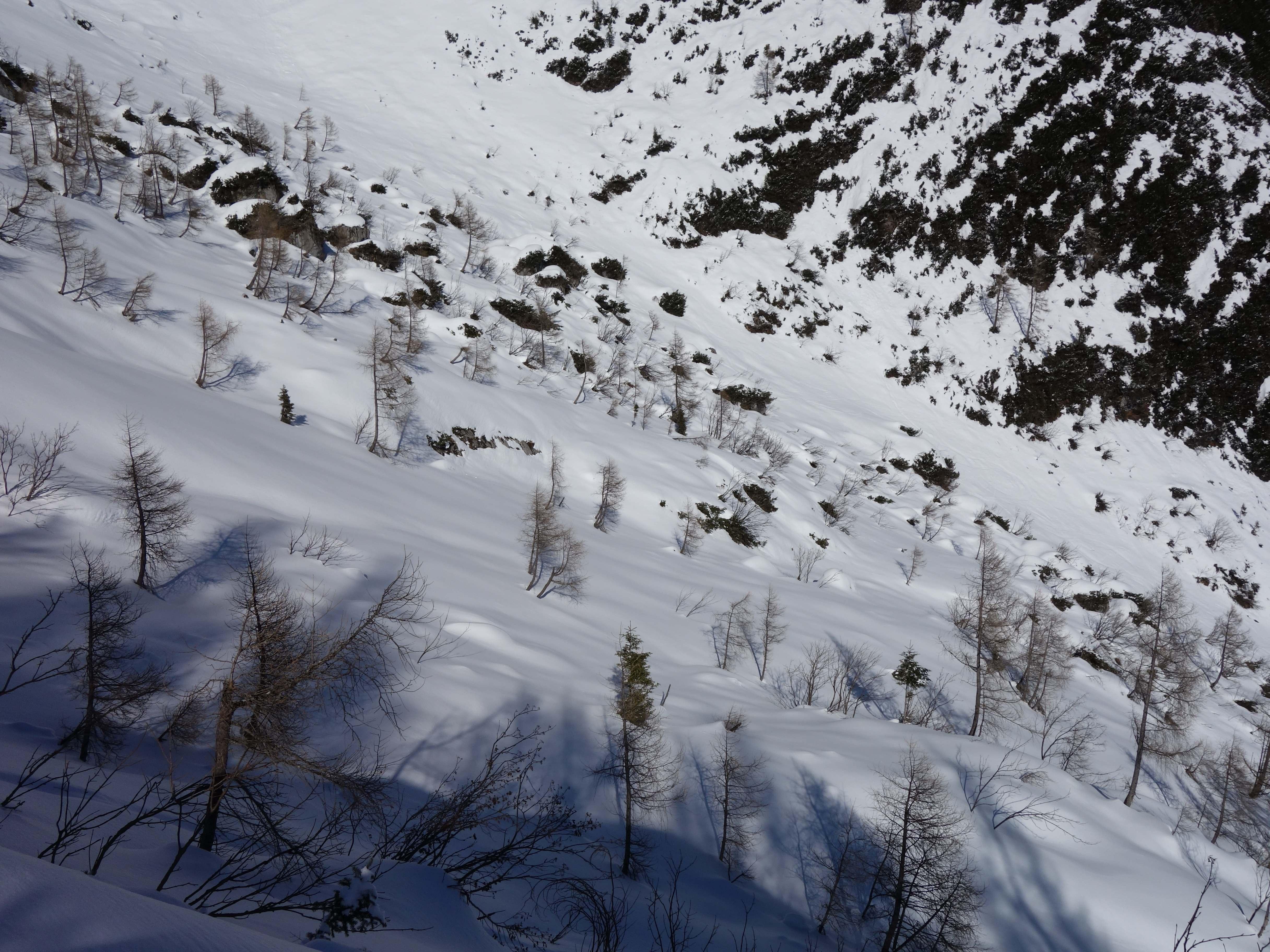 Der angefeuchtete Pulver bei der Abfahrt leider schon wieder mit Kruste, die unteren Kare ganz gut.