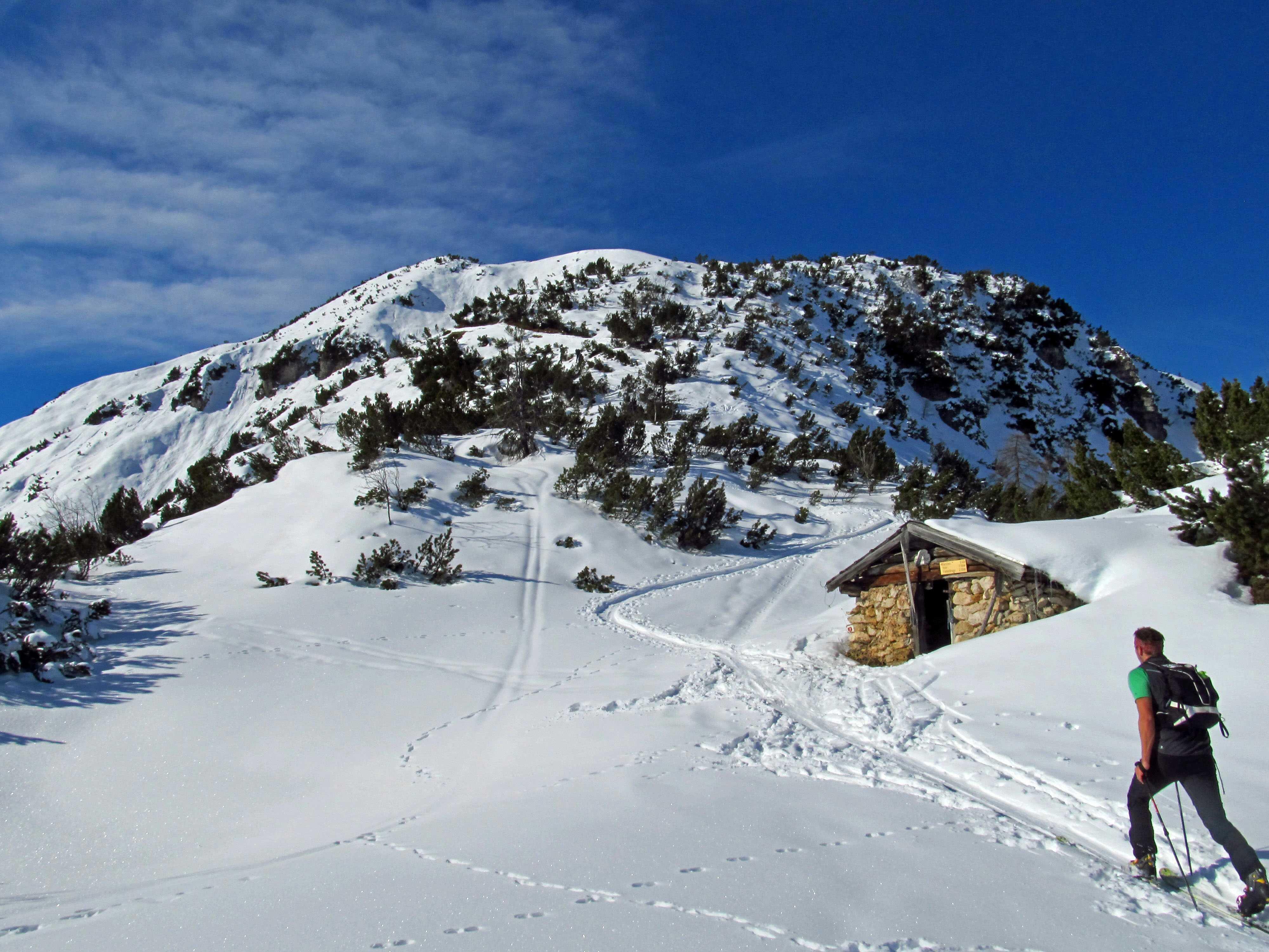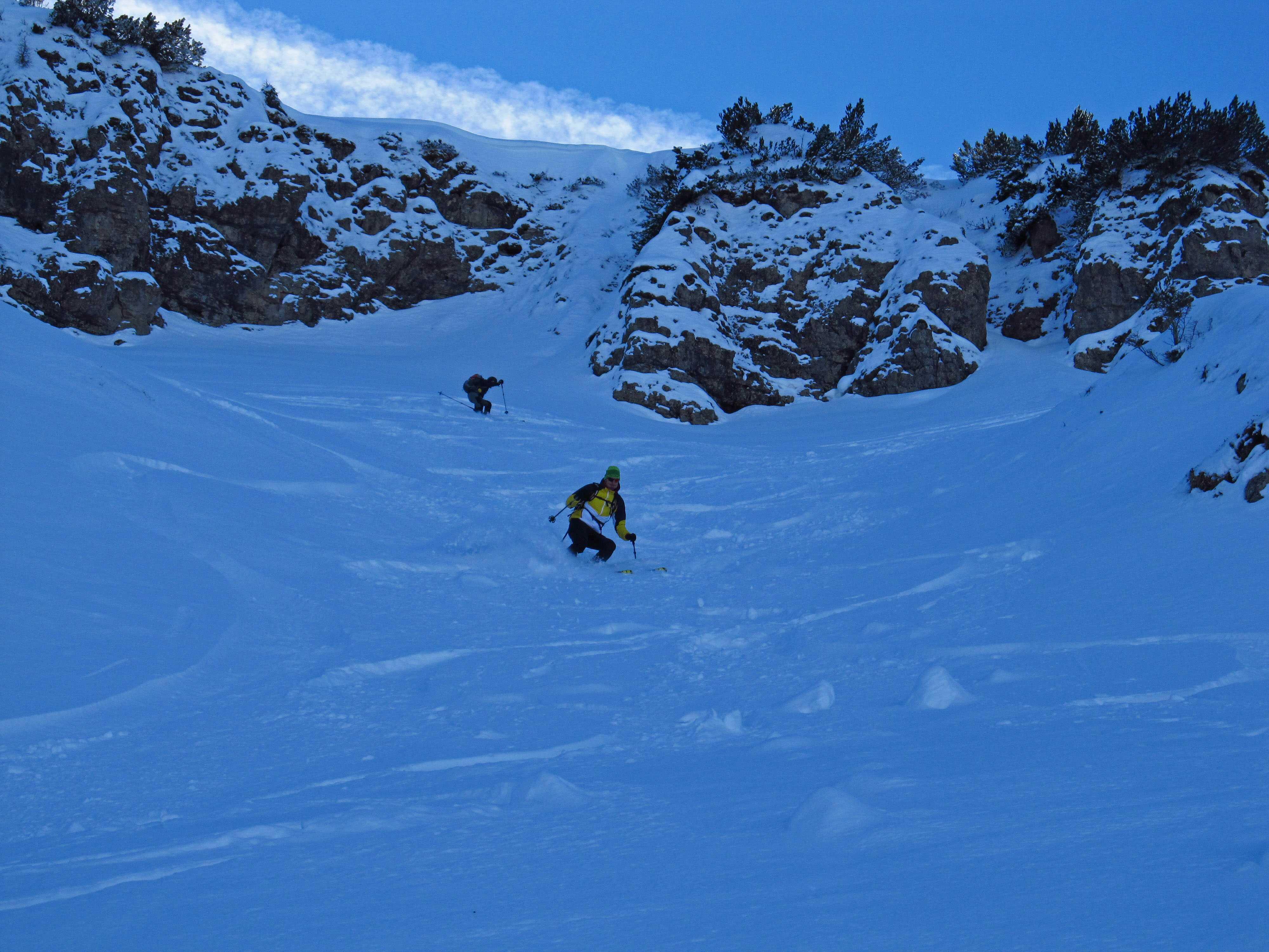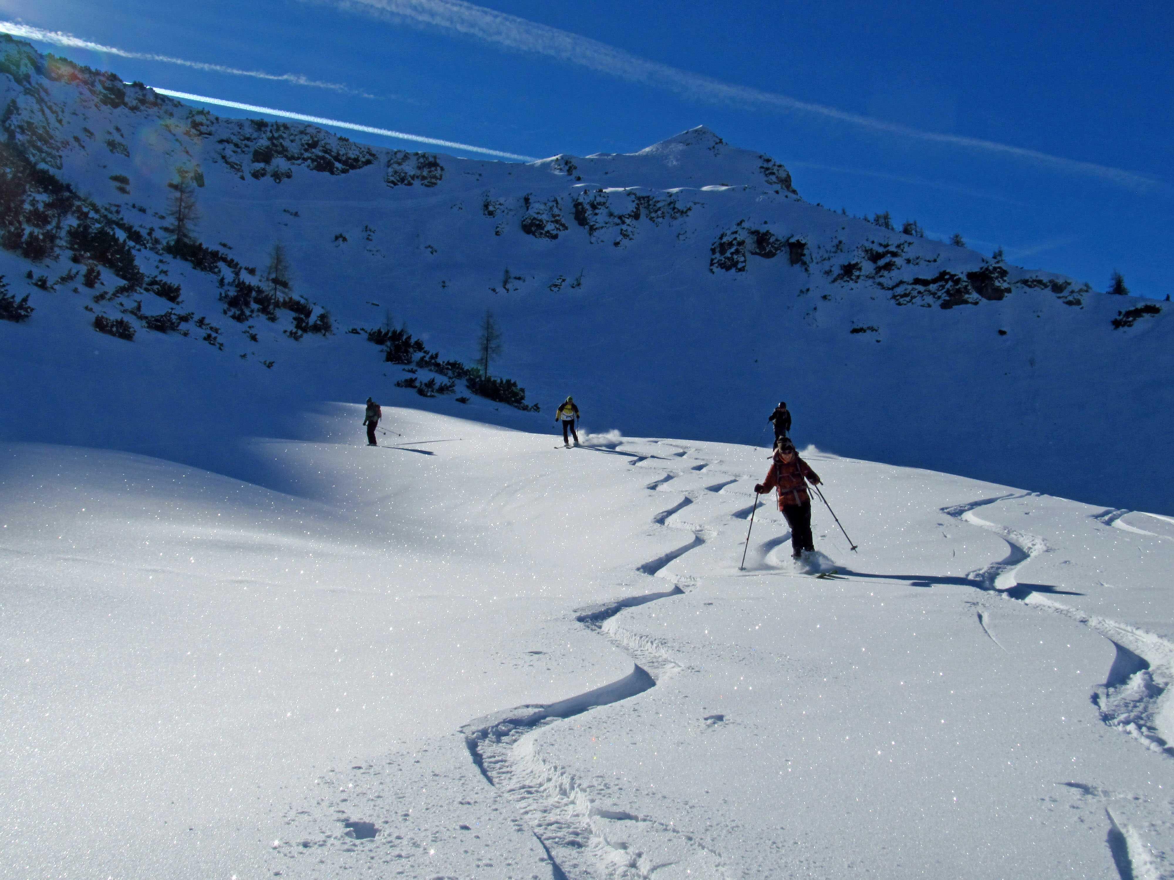 Schneelage: Beim Aufstieg in besonnten Breichen noch harschige Schneeoberfläche, im Schatten pulvrig. Im Tagesverlauf weichte die Harschschicht auf und war bei geringer Einsinktiefe gut fahrbar. Im N-Hang durchgehender Pulverschnee.